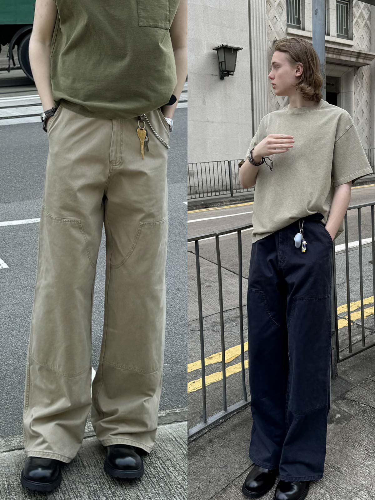 このストレートワークパンツは、クラシックなアメリカンワークデザインを採用し、ヴィンテージカーキカラーで独特のタフなスタイルを表現します。強化された膝部デザインで耐久性が向上し、様々なアウトドア活動に適しています。100%コットン素材が快適な着心地を提供し、通気性も優れています。シンプルなストレートシルエットは実用性とスタイルを兼ね備え、日常から作業まで様々なシーンで活躍します。