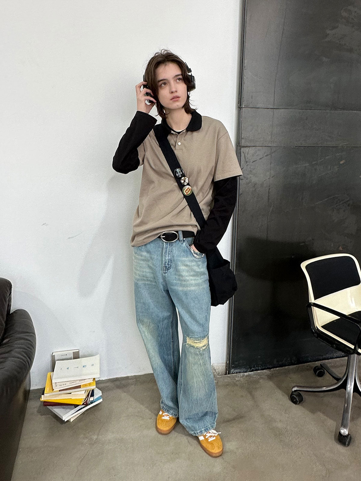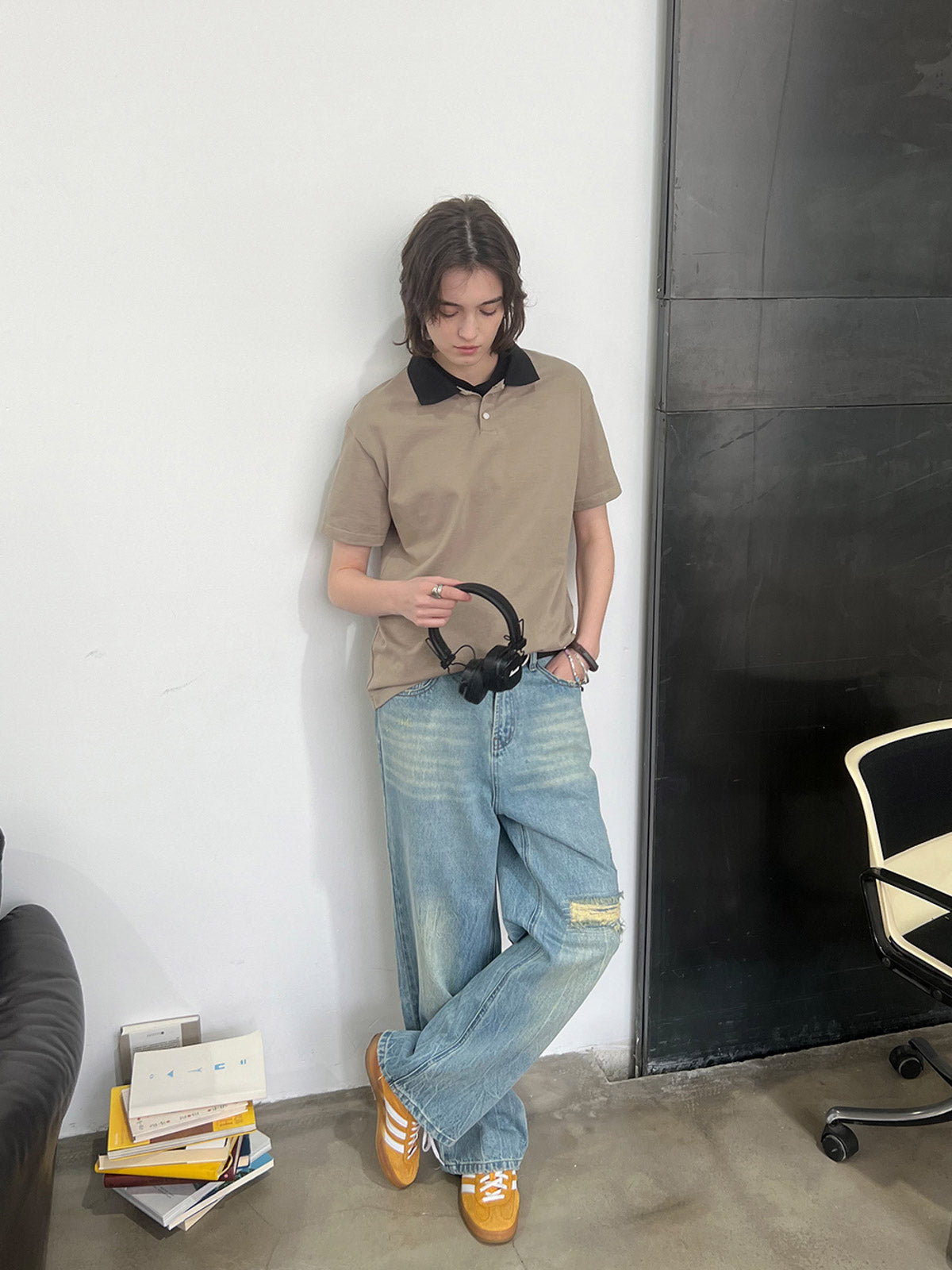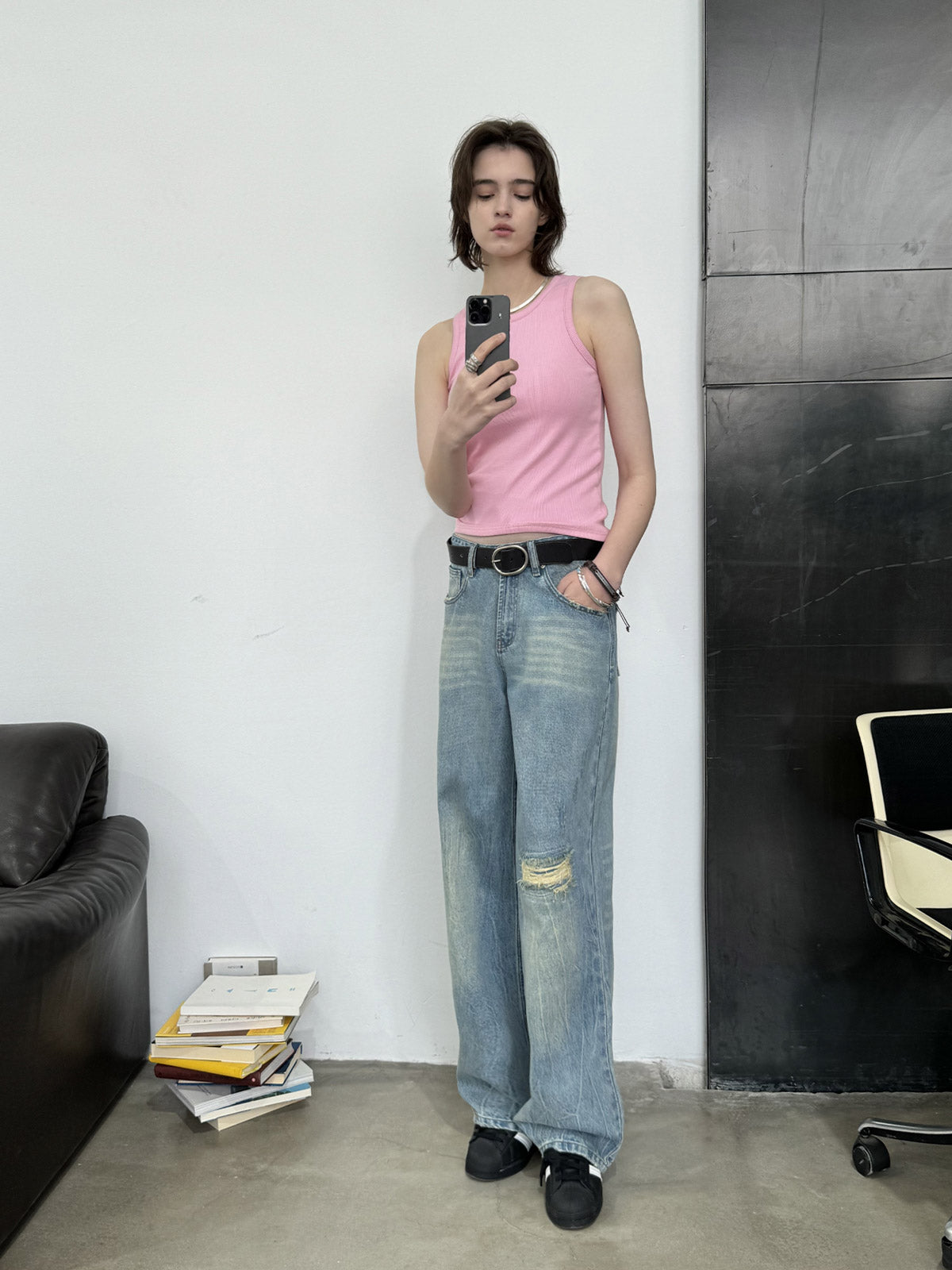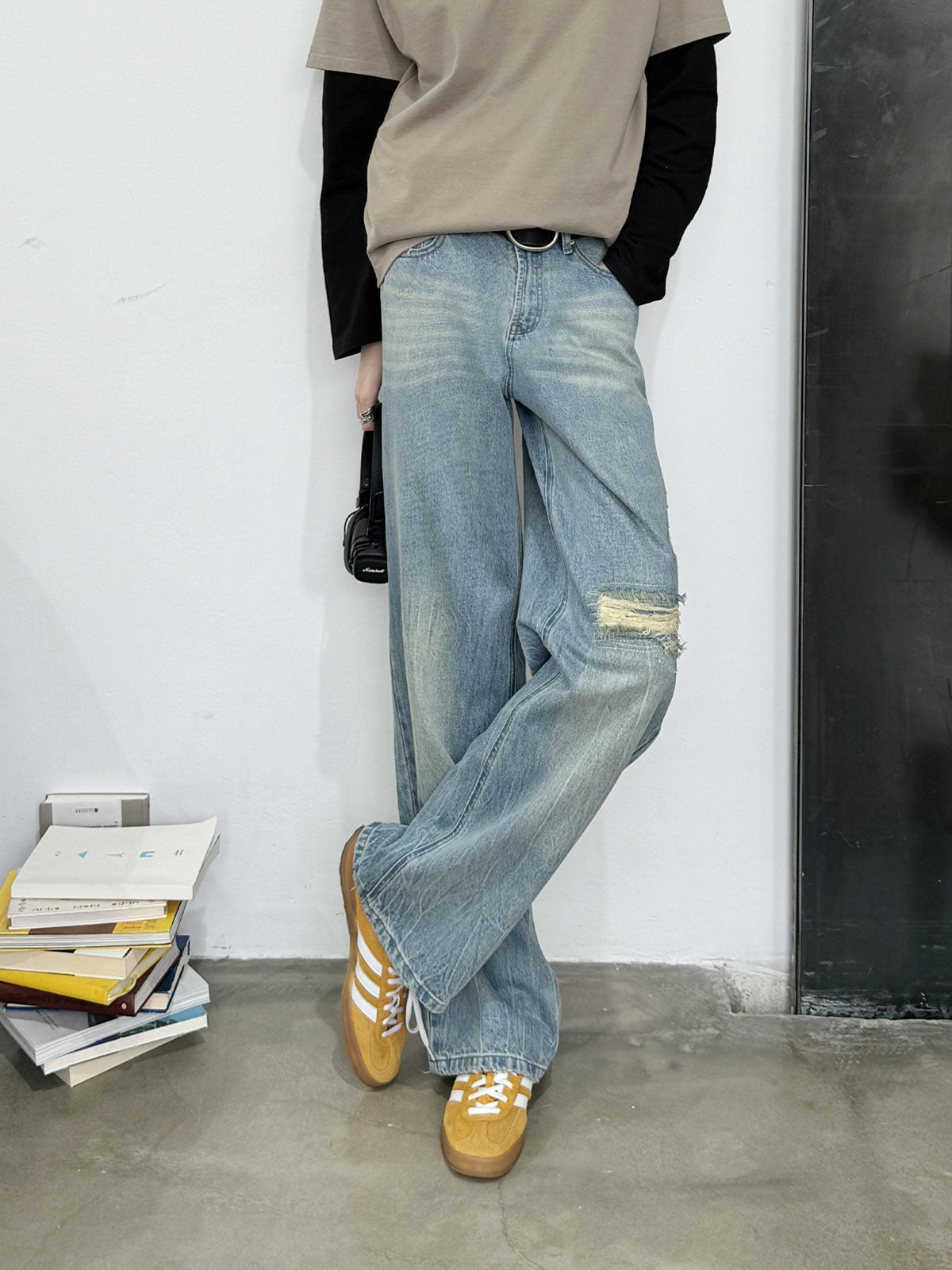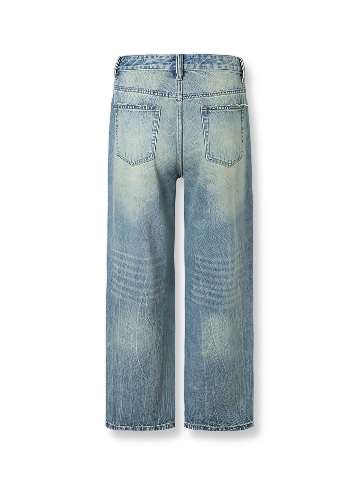 このアメリカンヴィンテージ風の破れストレートジーンズは、猫ひげ模様と洗い加工が施され、100%コットン素材で快適な着心地。クラシックなストレートシルエットがカジュアルで自由なスタイルを演出し、日常からストリートファッションまで幅広く活躍します。