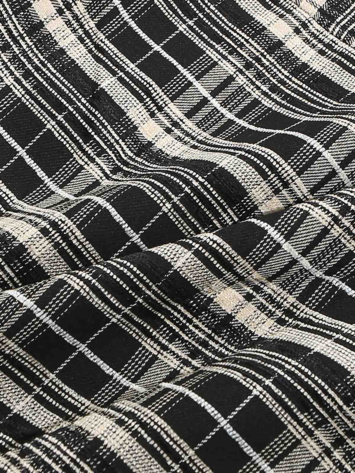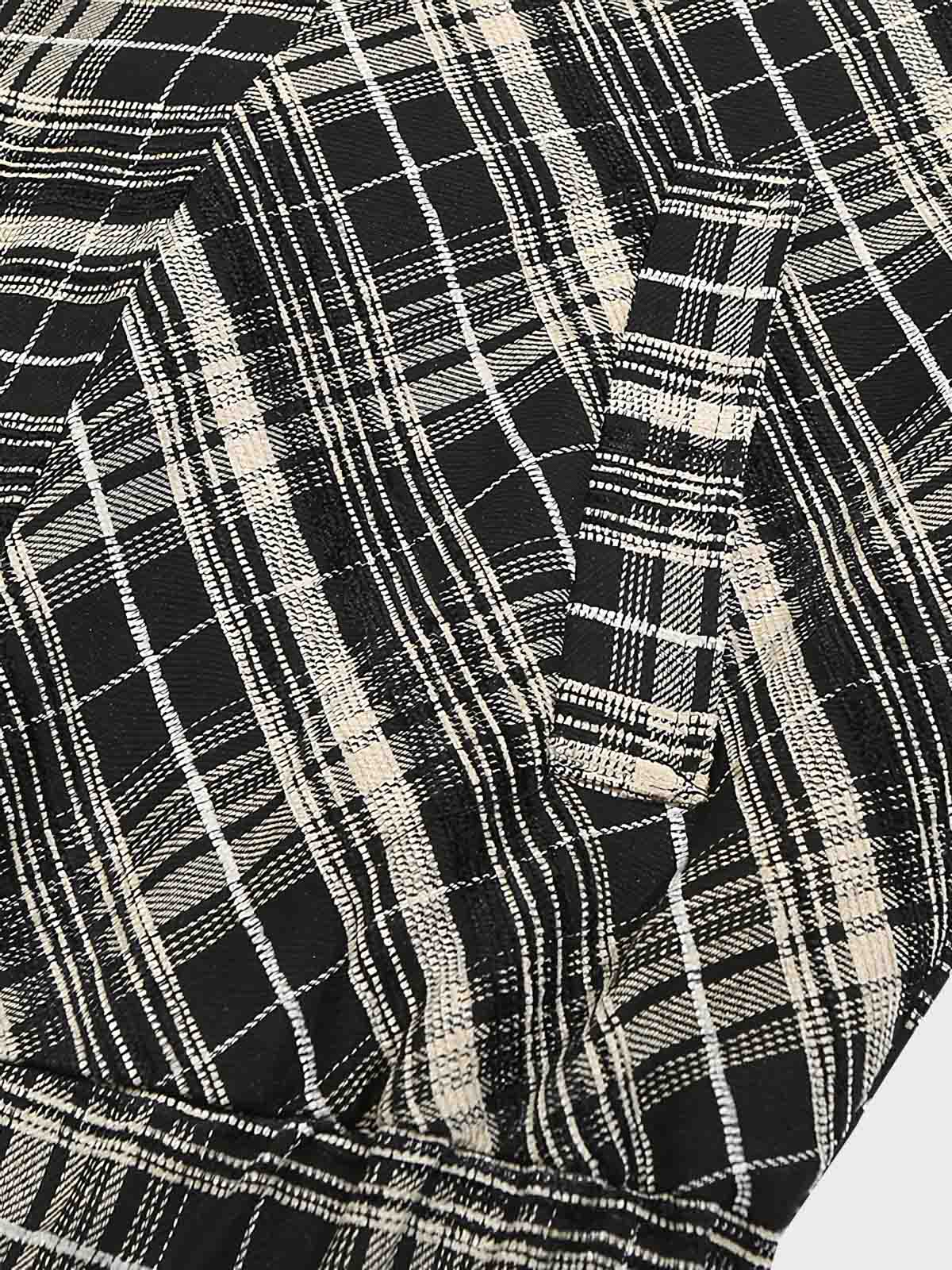 伝統的なチェック柄のデザインは、男性ファッションの定番であるタータンスタイルに敬意を表しています。対照的な質感の襟折り返しは視覚的な興味を加え、追加の暖かさを提供します。フロントのファスナーは実用性と着脱の容易さを確保し、チェック柄のラインの配置は、ジャケットの全体的な美観を高める、細部への注意とアライメントを示しています。