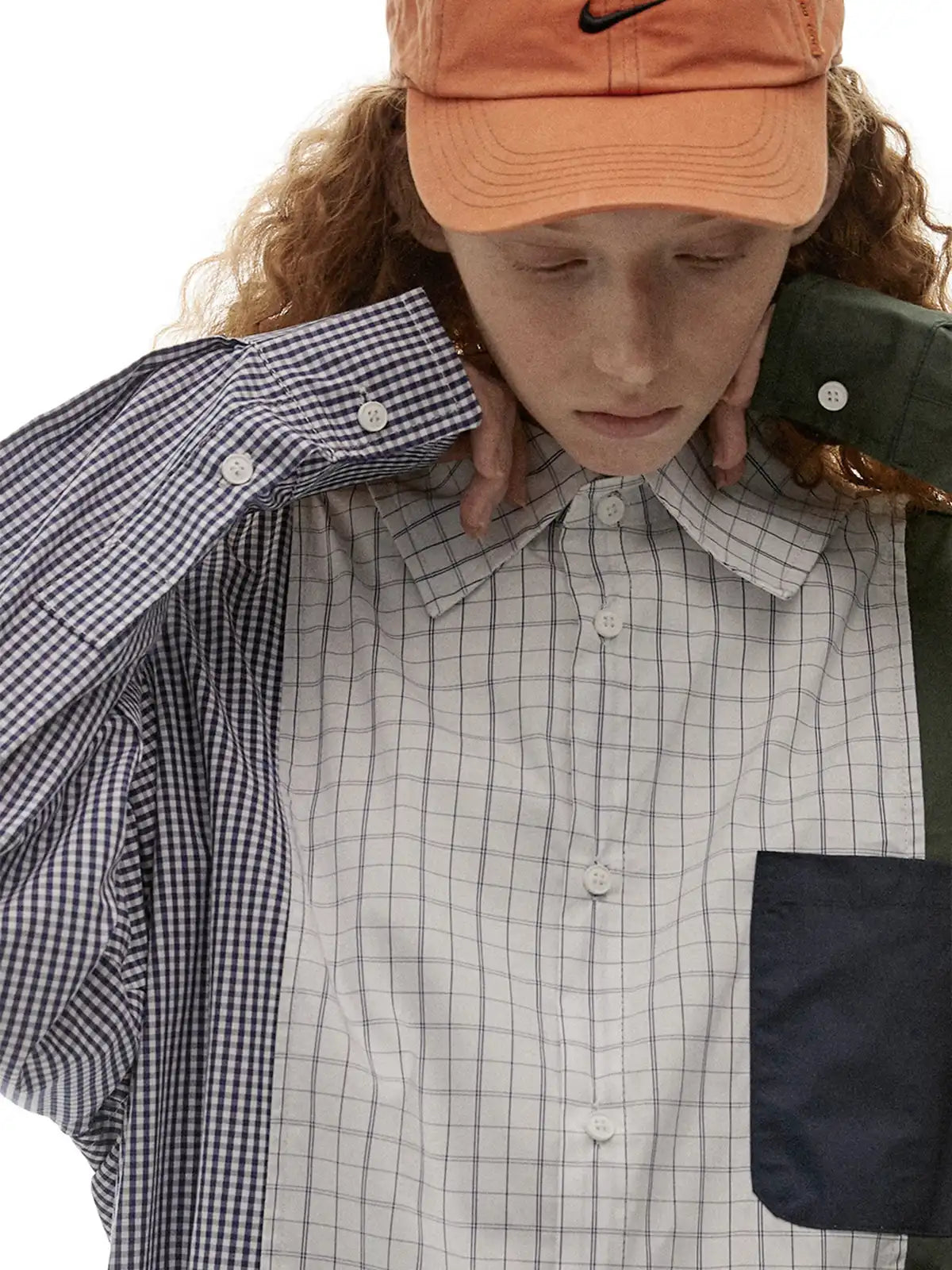 異なるチェック柄と無地生地を組み合わせたパッチワークデザインが特徴的な、長袖シャツ。