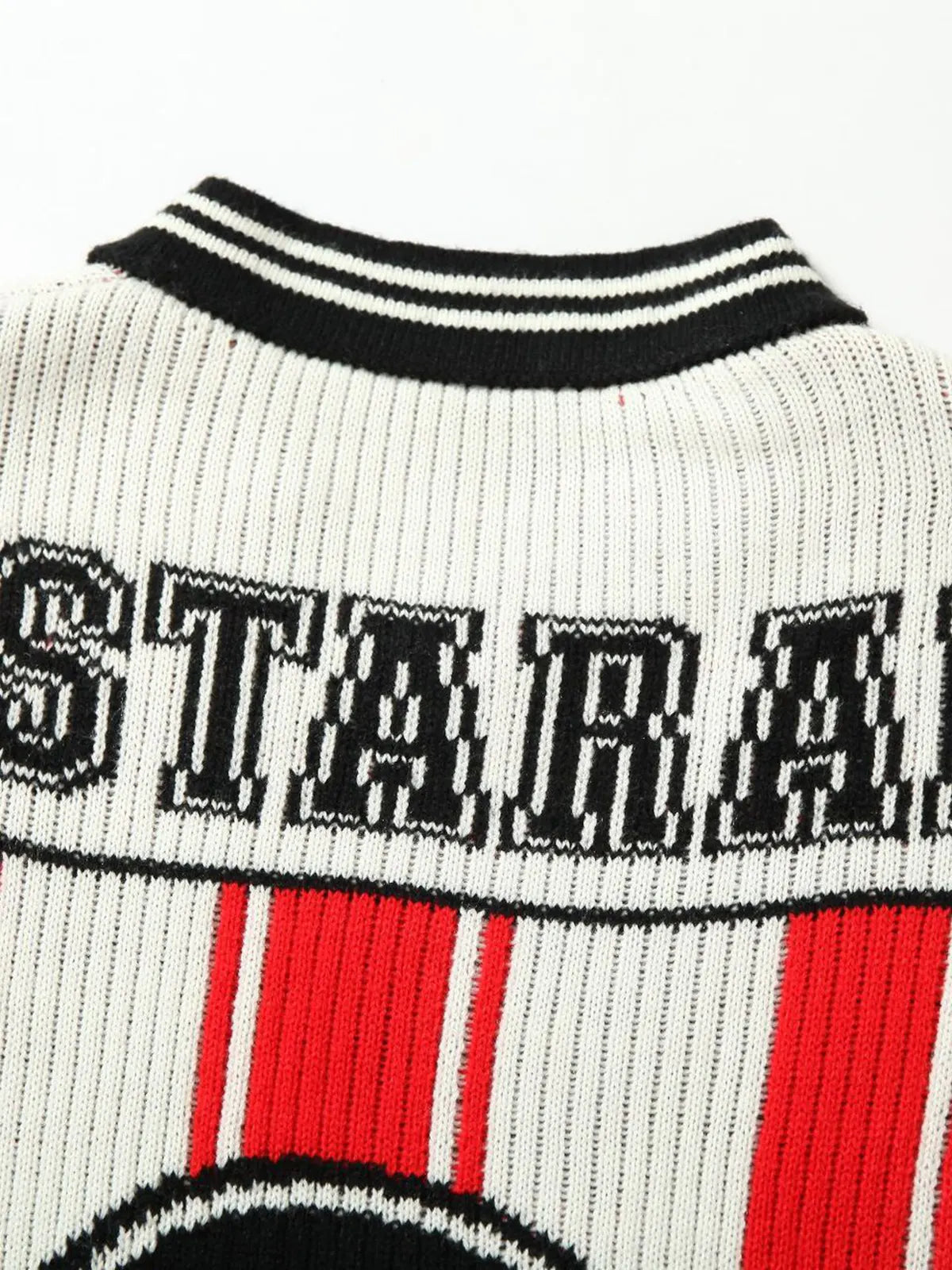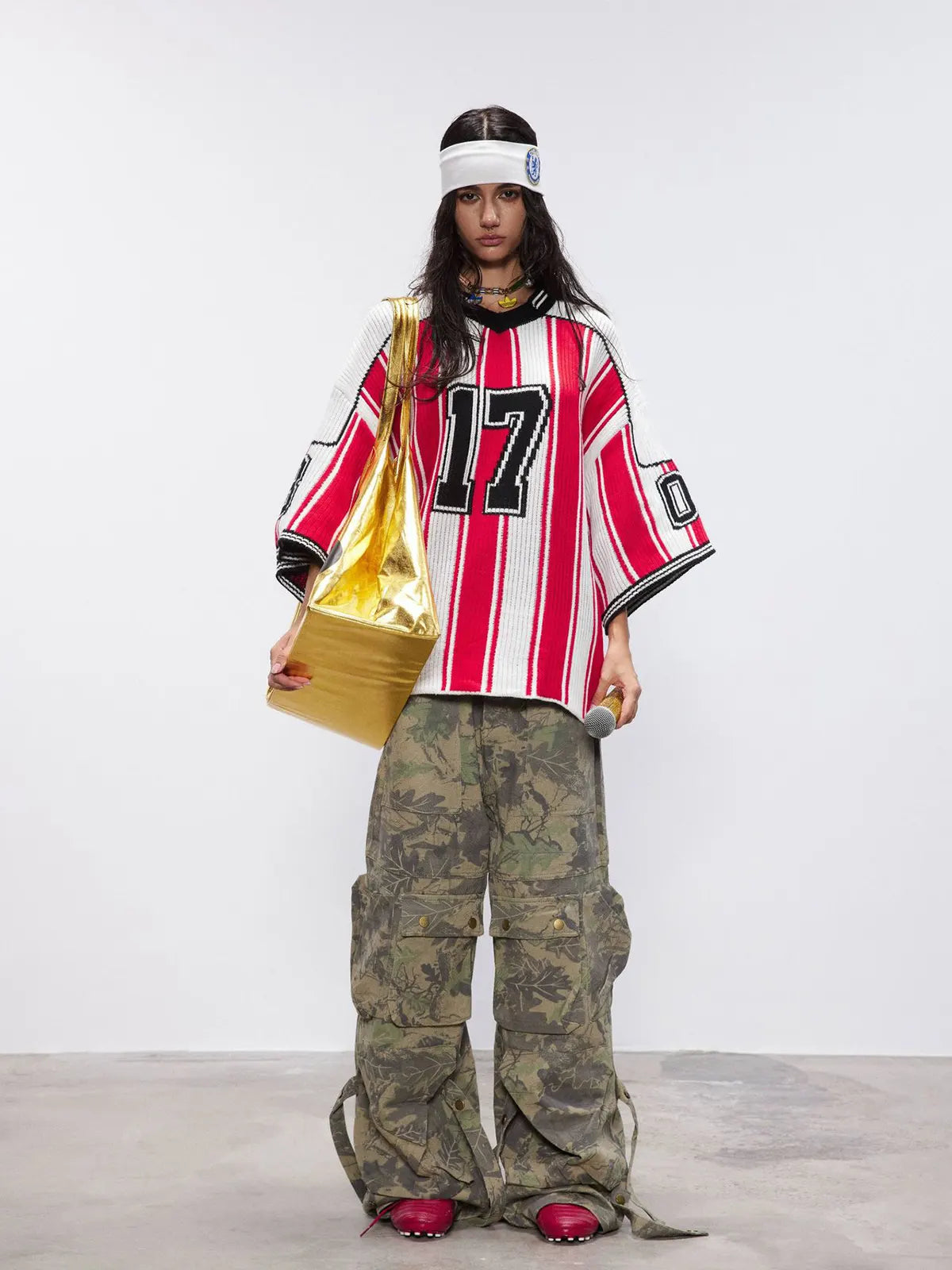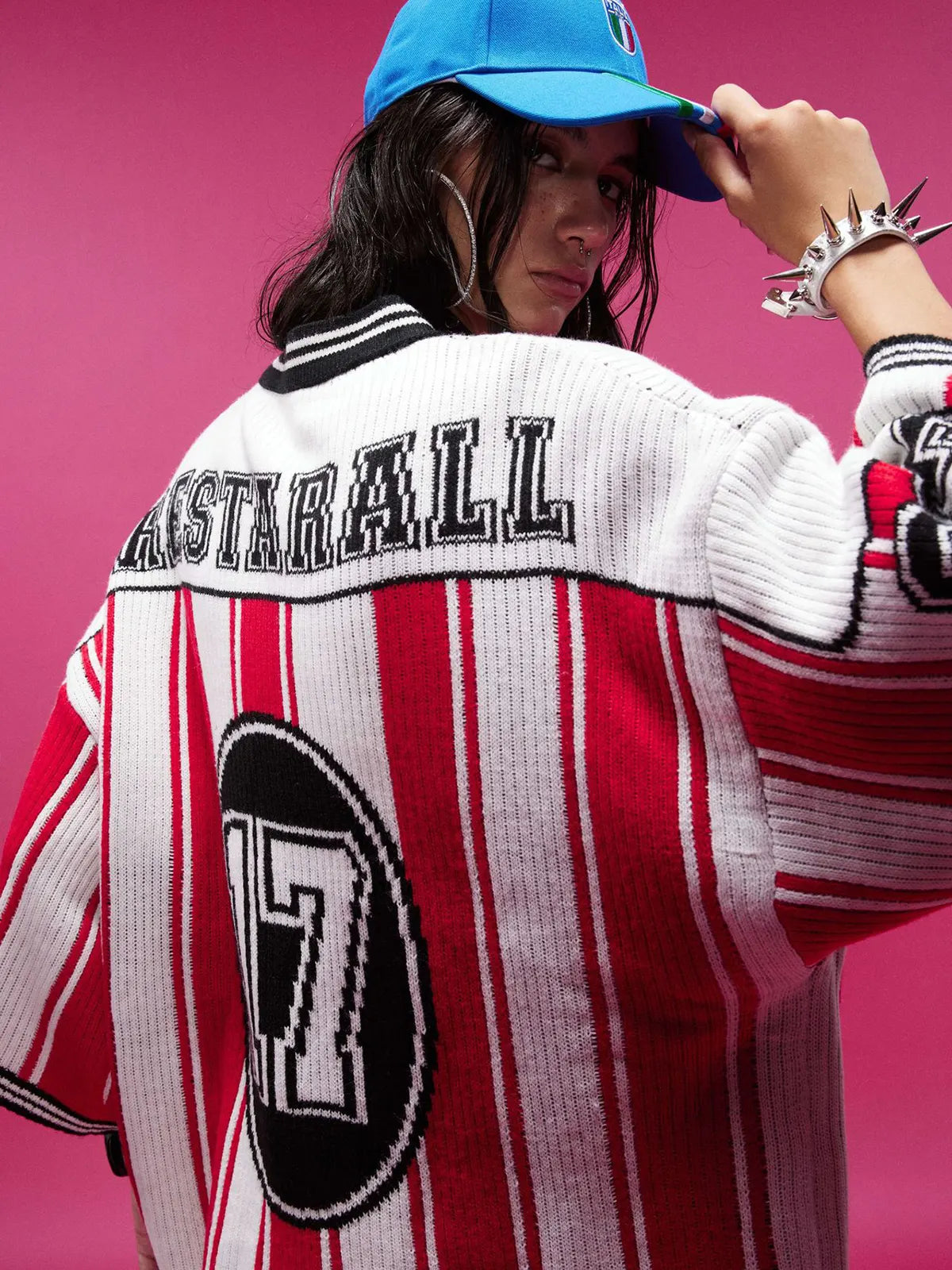 このベースボールニットは、高克重のコットン素材を用いた立体的な編み込み工芸が特徴で、ストライプと配色ラインが躍動的な動きを演出します。Vネックとドロップショルダーのリラックスシルエットにより、着るだけでスポーティなストリート感をプラス。背面の“ESTARALL”ロゴと17番ワッペンがヴィンテージ風の物語性を強調し、デニムやカーゴパンツとの相性も抜群です。