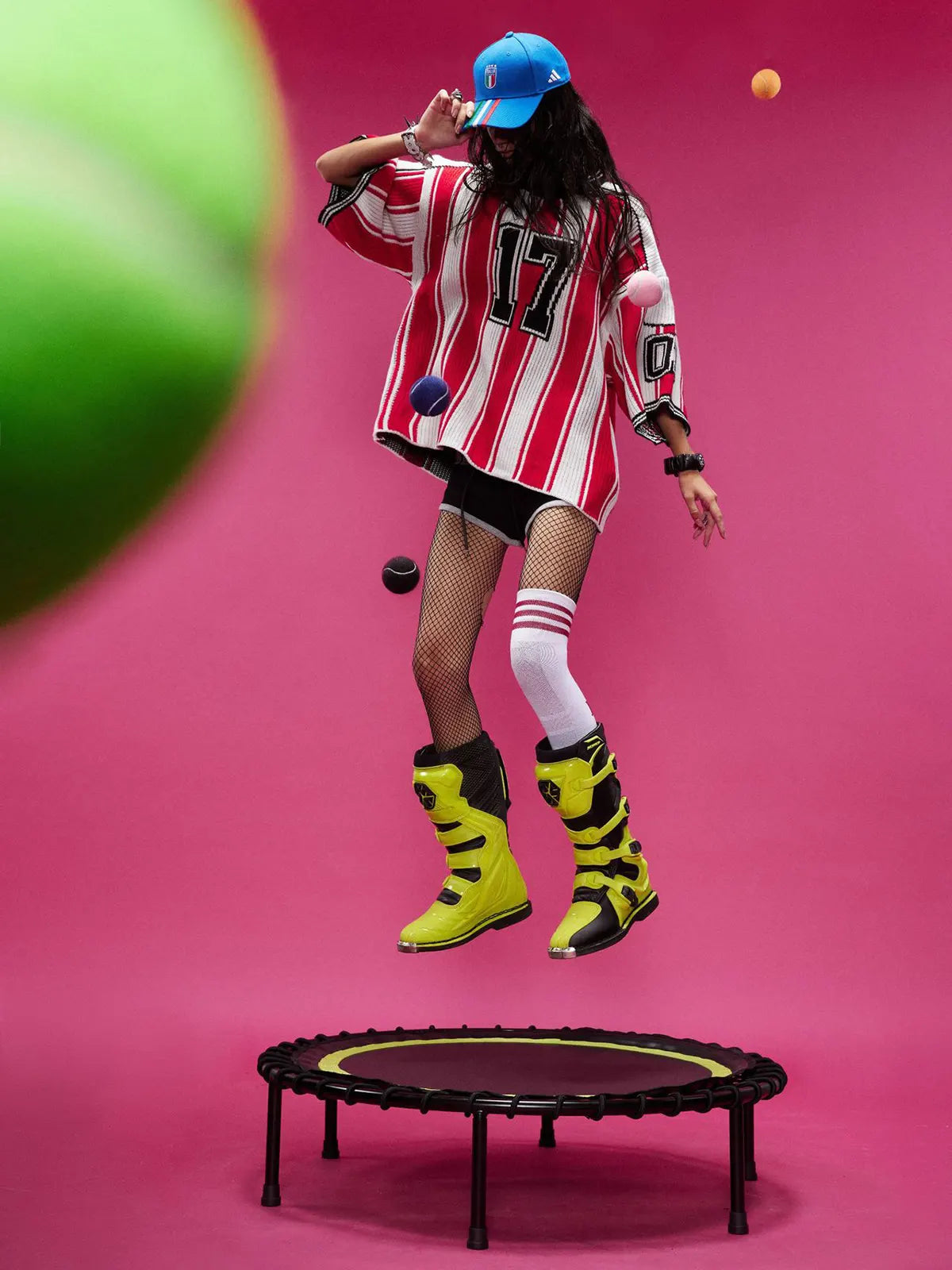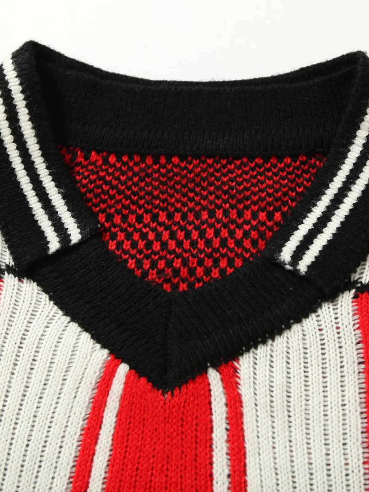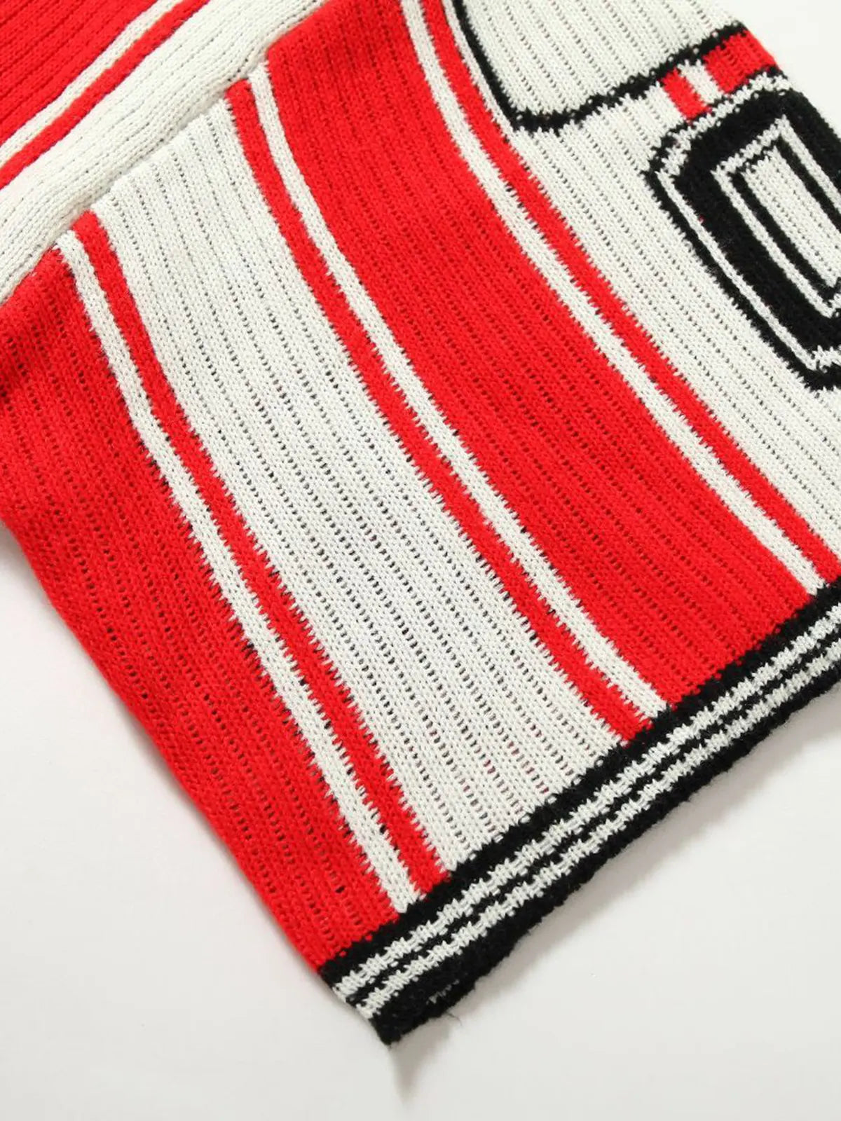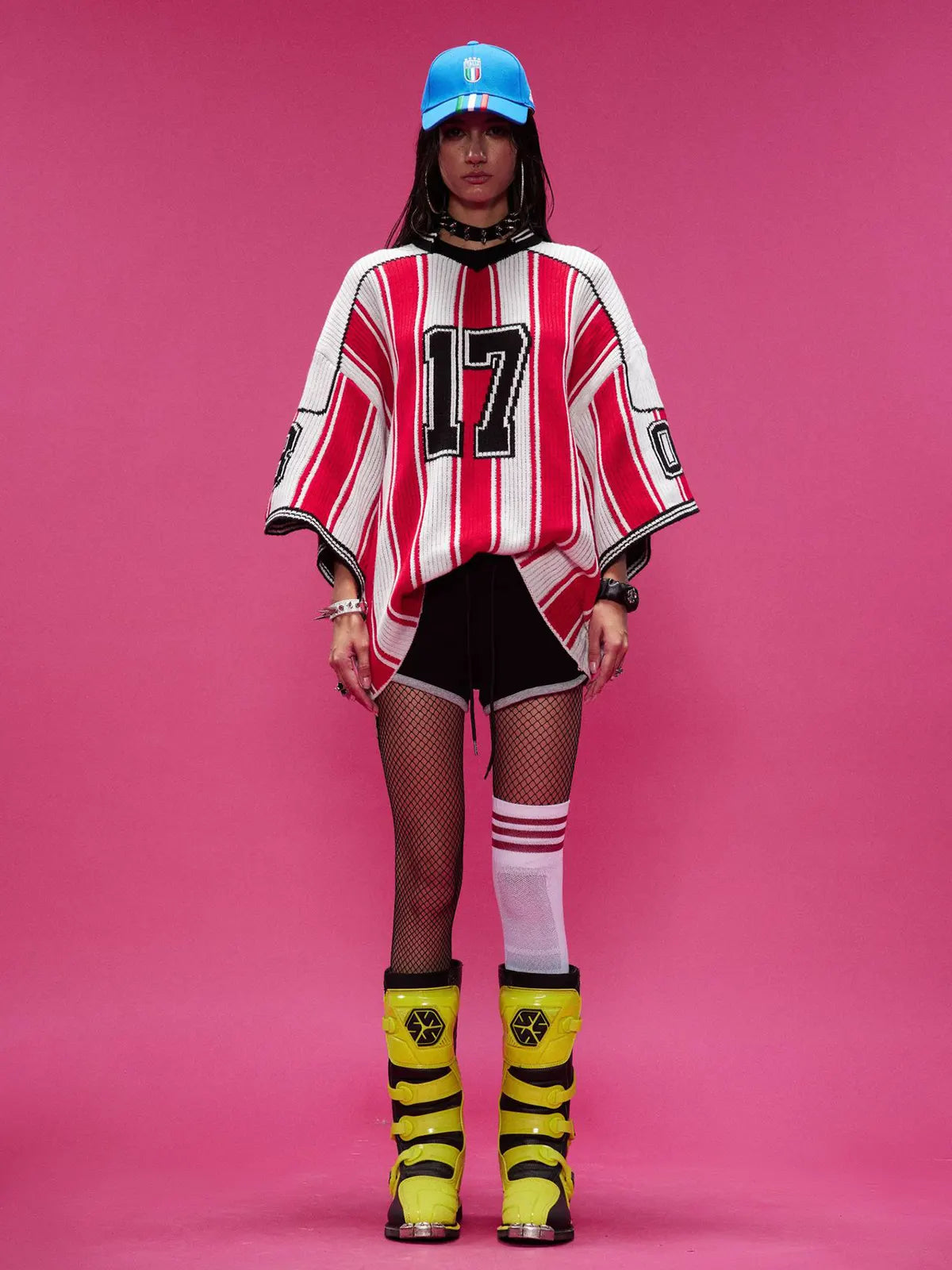 このベースボールニットは、高克重のコットン素材を用いた立体的な編み込み工芸が特徴で、ストライプと配色ラインが躍動的な動きを演出します。Vネックとドロップショルダーのリラックスシルエットにより、着るだけでスポーティなストリート感をプラス。背面の“ESTARALL”ロゴと17番ワッペンがヴィンテージ風の物語性を強調し、デニムやカーゴパンツとの相性も抜群です。