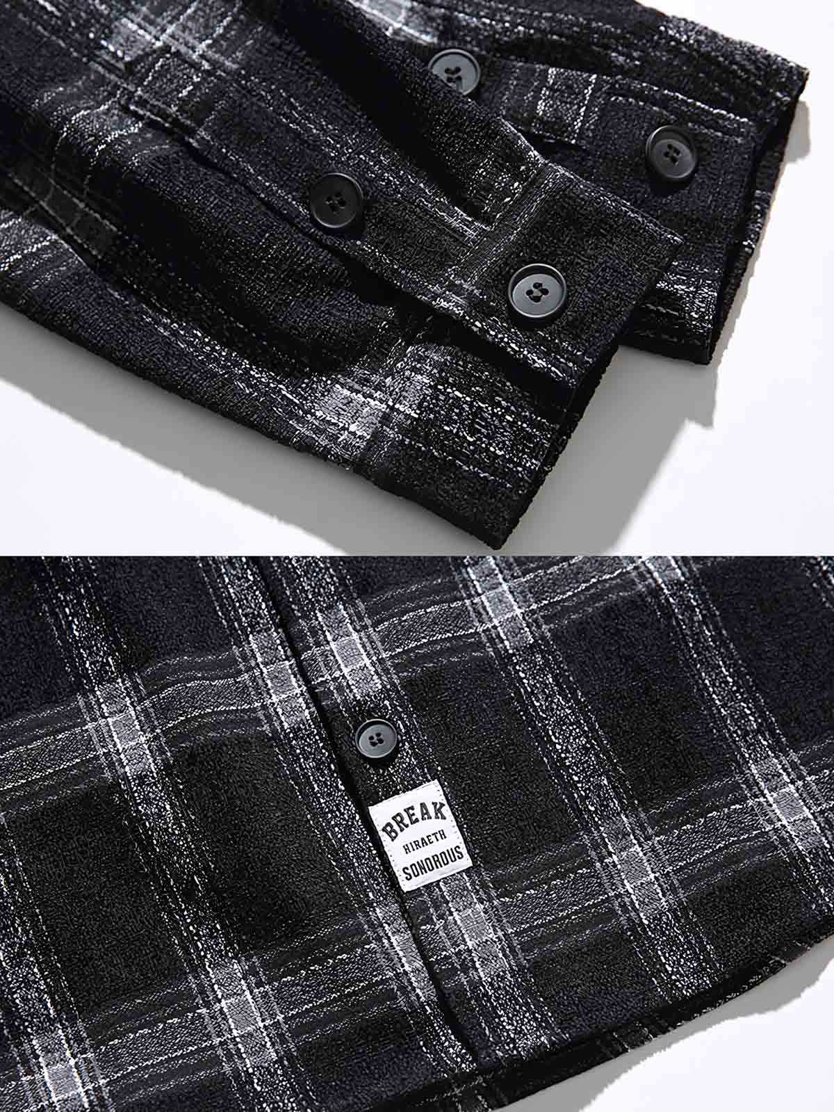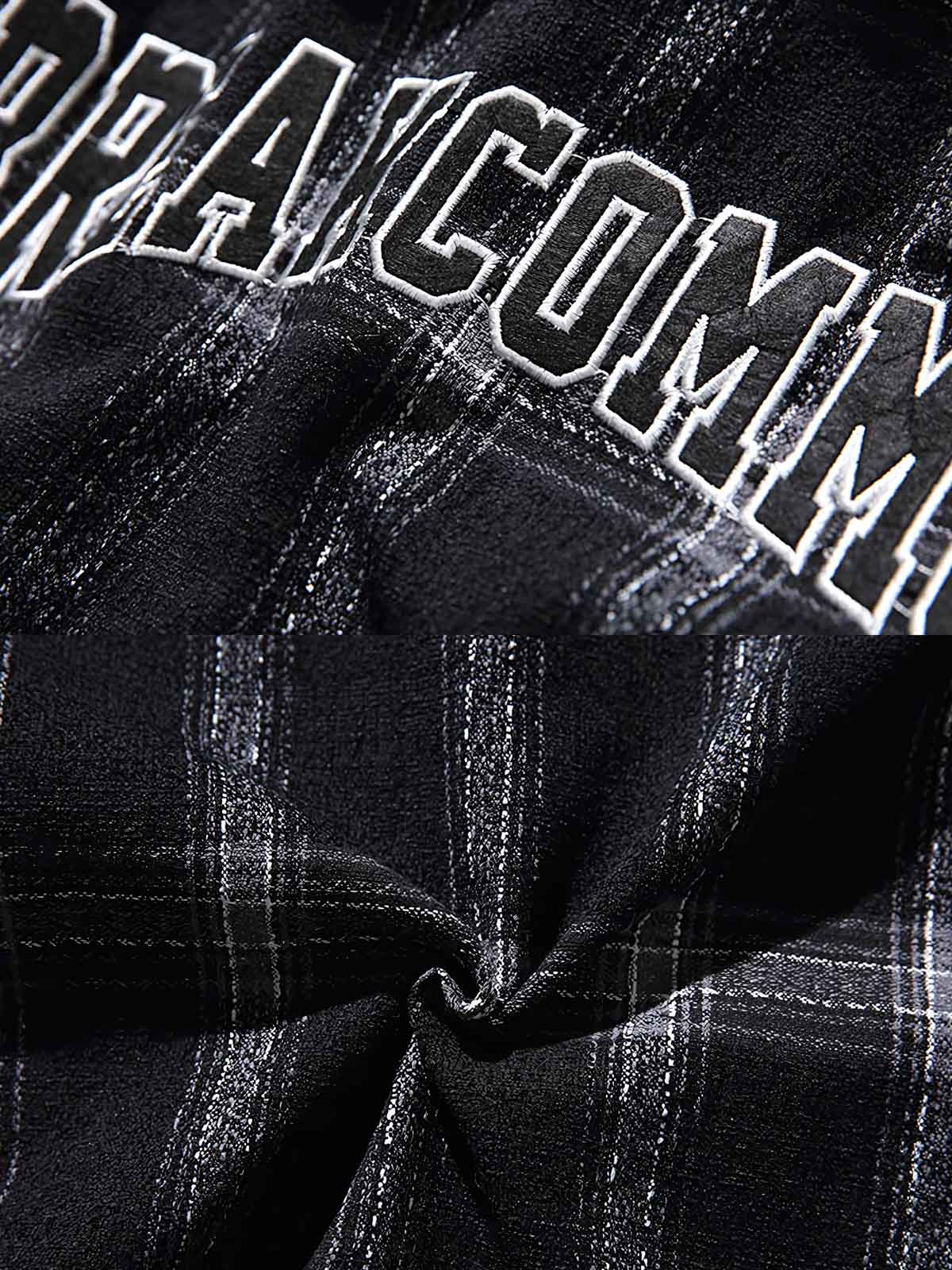 厳選されたチェック柄生地は、パターンの整合性と緻密な製作工程を示しています。袖口と襟元には精巧な縫製技術が施され、耐久性に優れた着用を保証します。背面の大きな刺繍は、伝統的なチェック柄にモダンな視覚的インパクトを加えています。