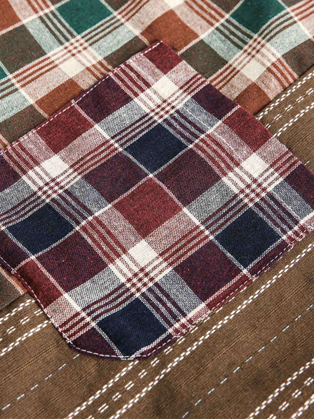 独特なパッチワークデザインが魅力的なヴィンテージ風の長袖シャツ。