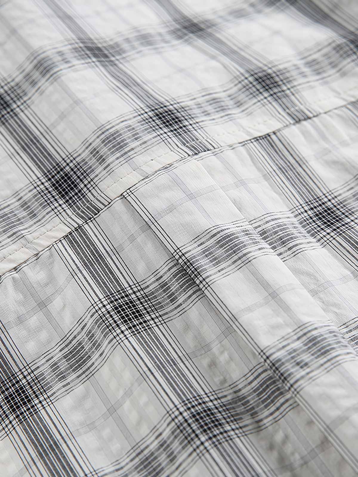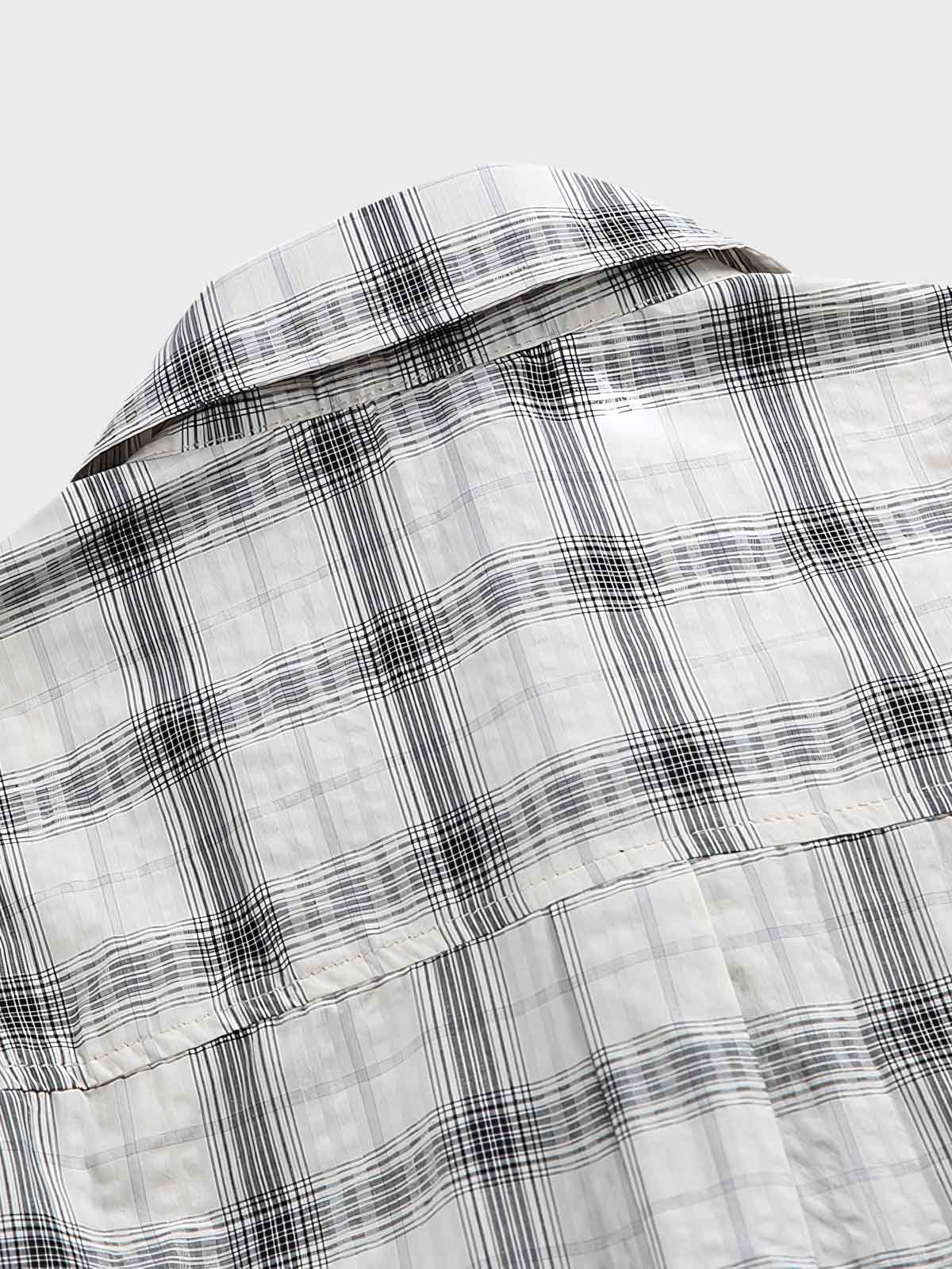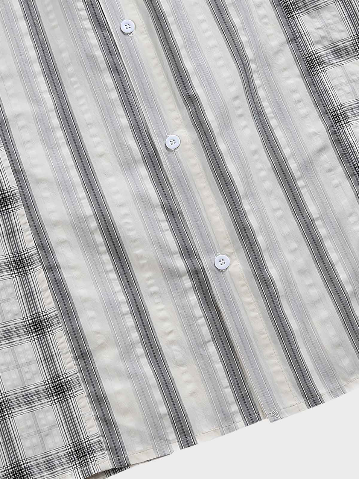 この半袖シャツは、クラシックなストライプとチェックを組み合わせたパッチワークデザインを特徴としています。古典的な美学の原則に基づいて異なるパターンを巧みに組み合わせることで、秩序と革新を融合したユニークな視覚効果を創出しています。
