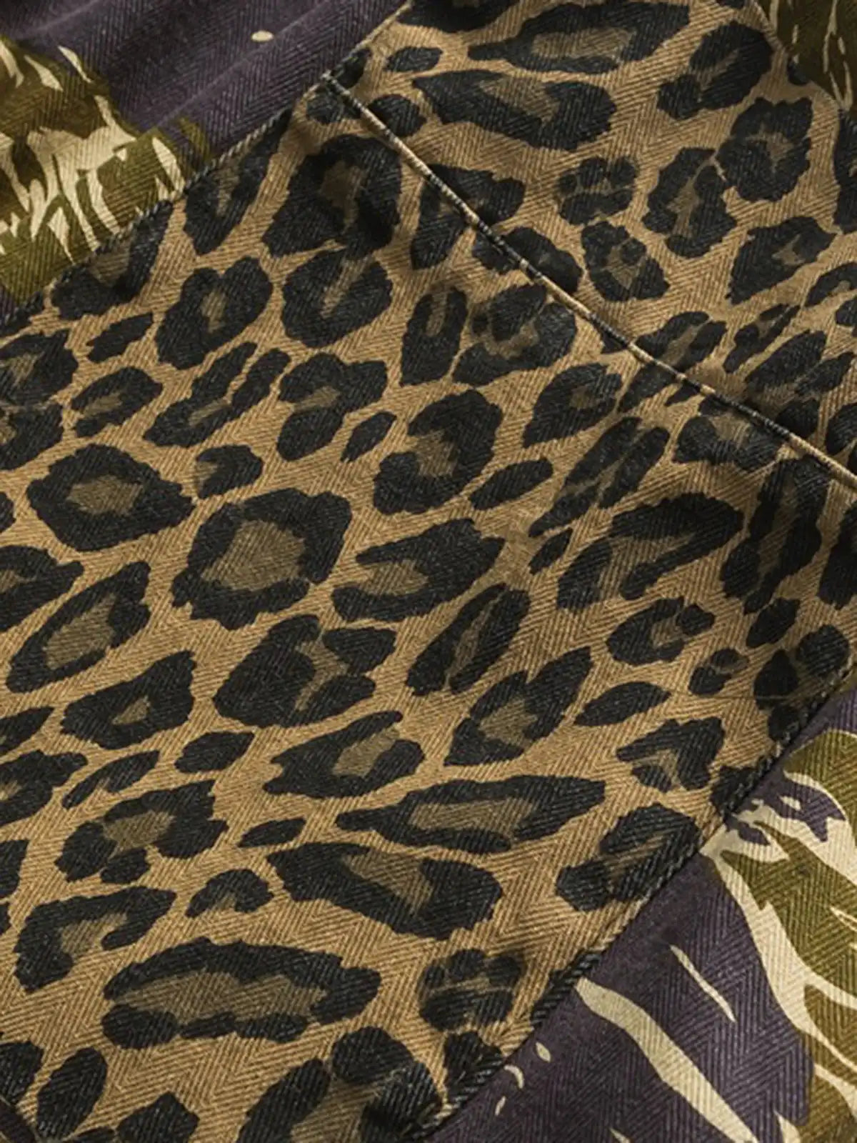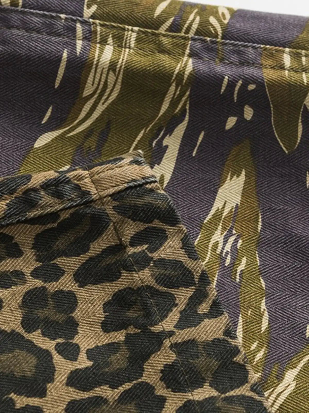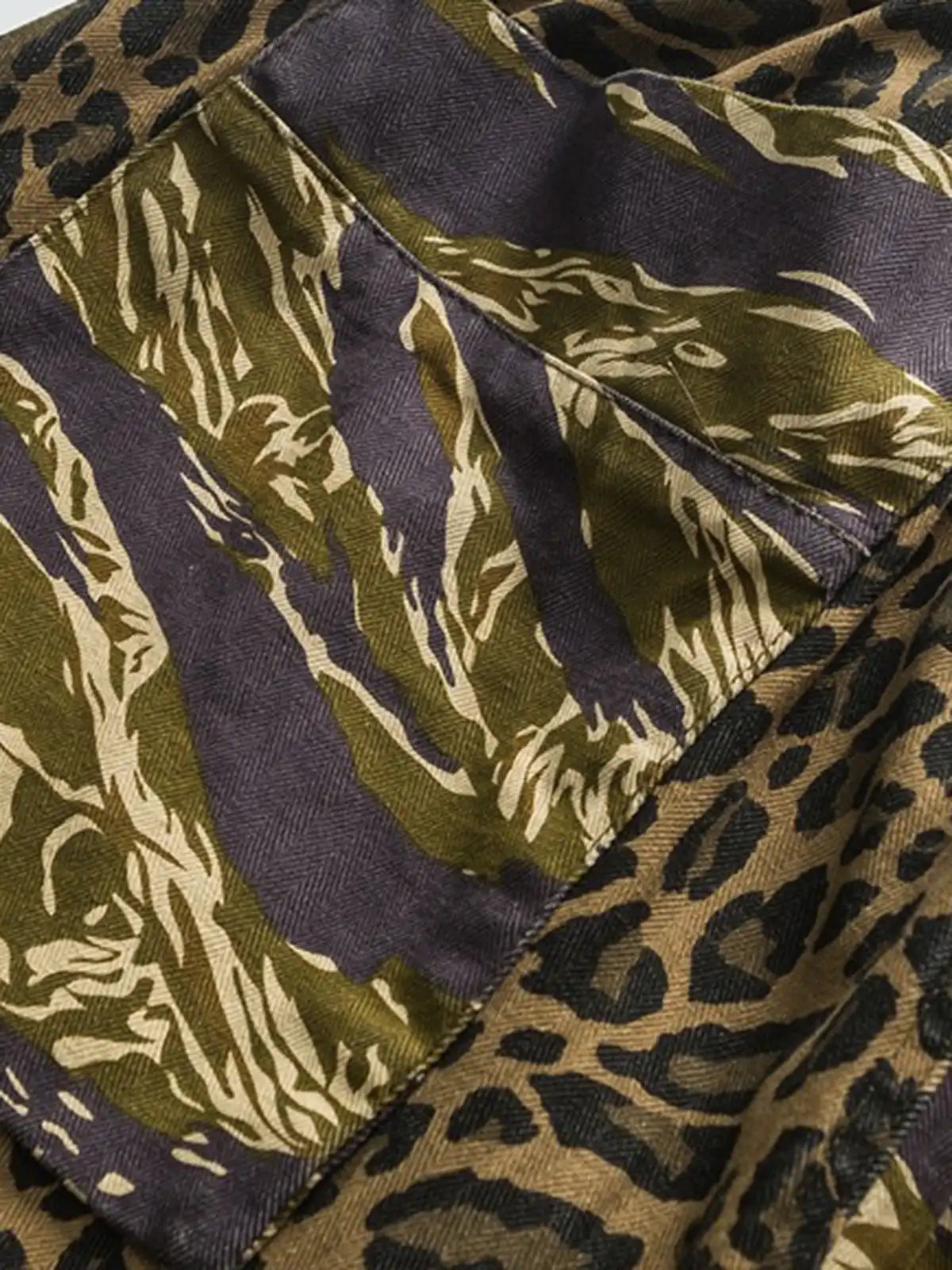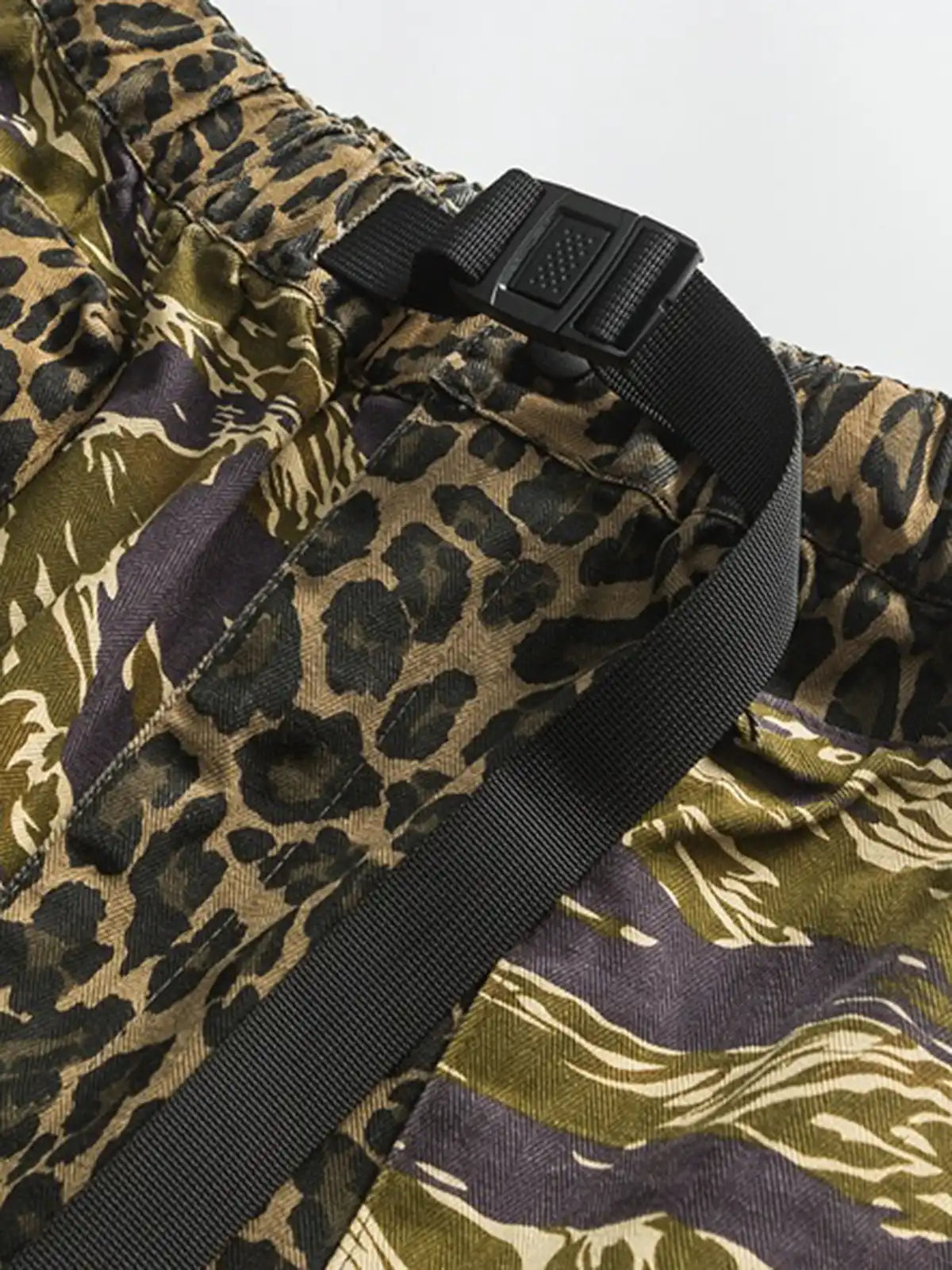 迷彩とヒョウ柄を組み合わせたパッチワークが目を引く、コットン100%のユニセックスカーゴショーツ。