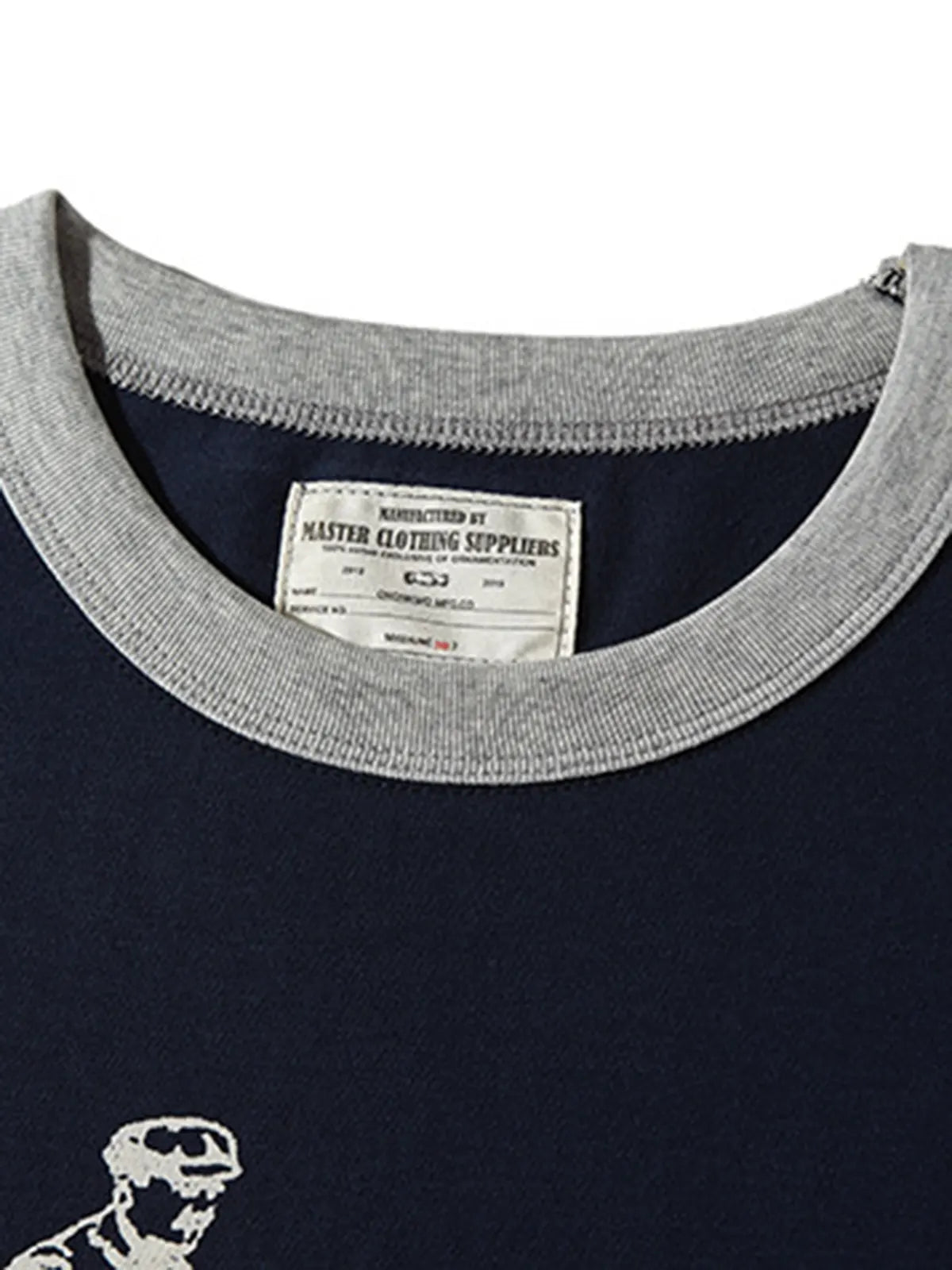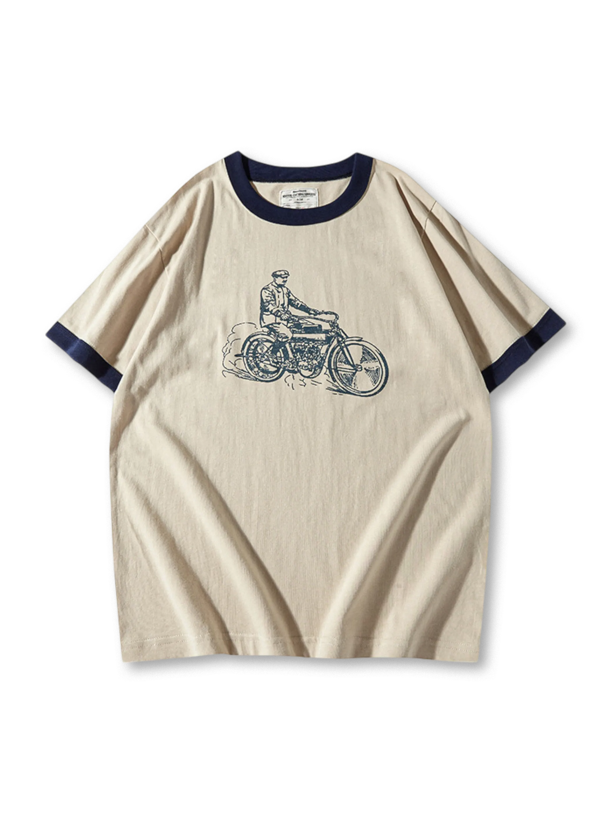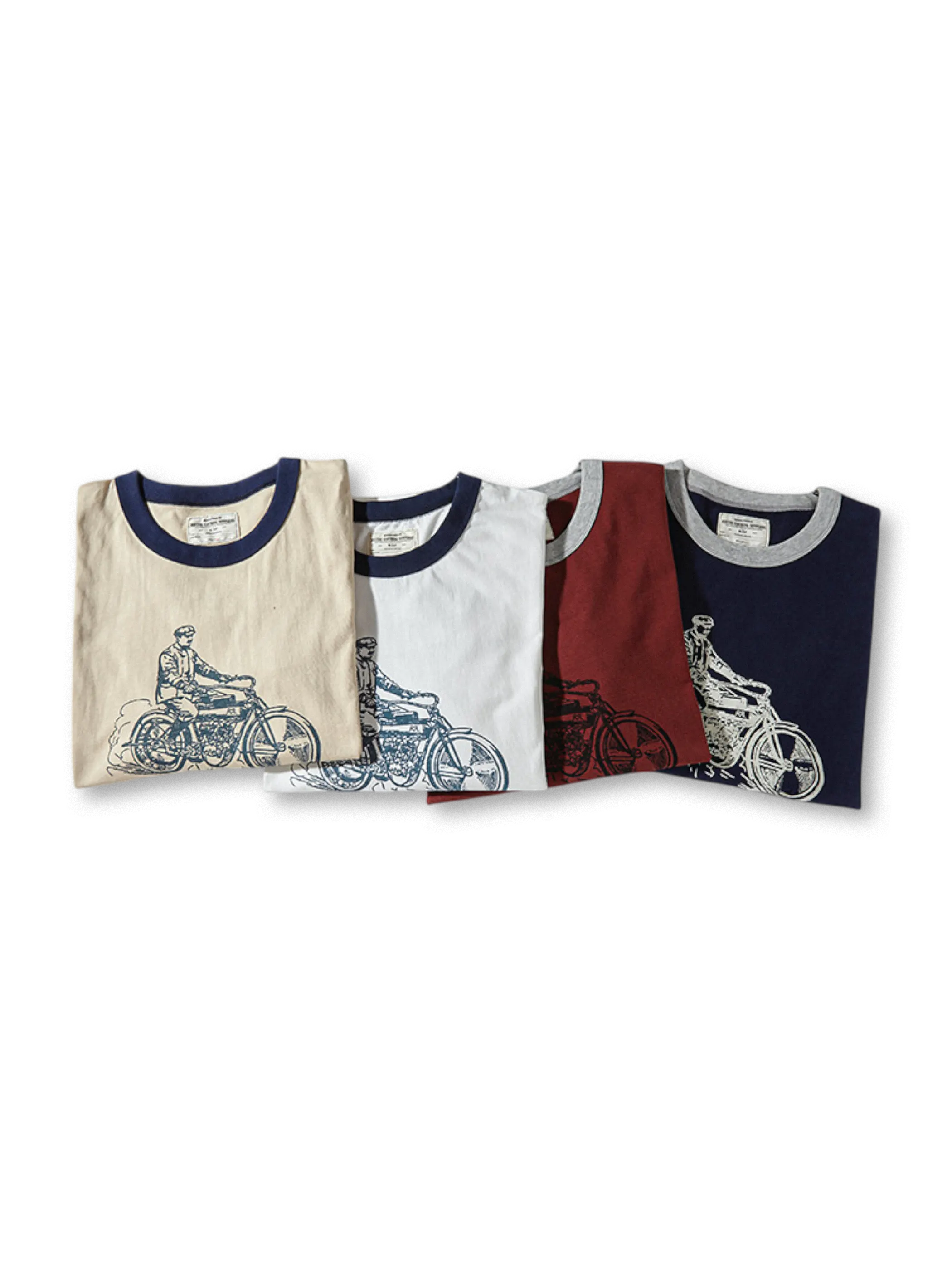 旧式バイクの精緻な刻印プリントが映える、210g中厚生地のレトロリンガーTシャツ。