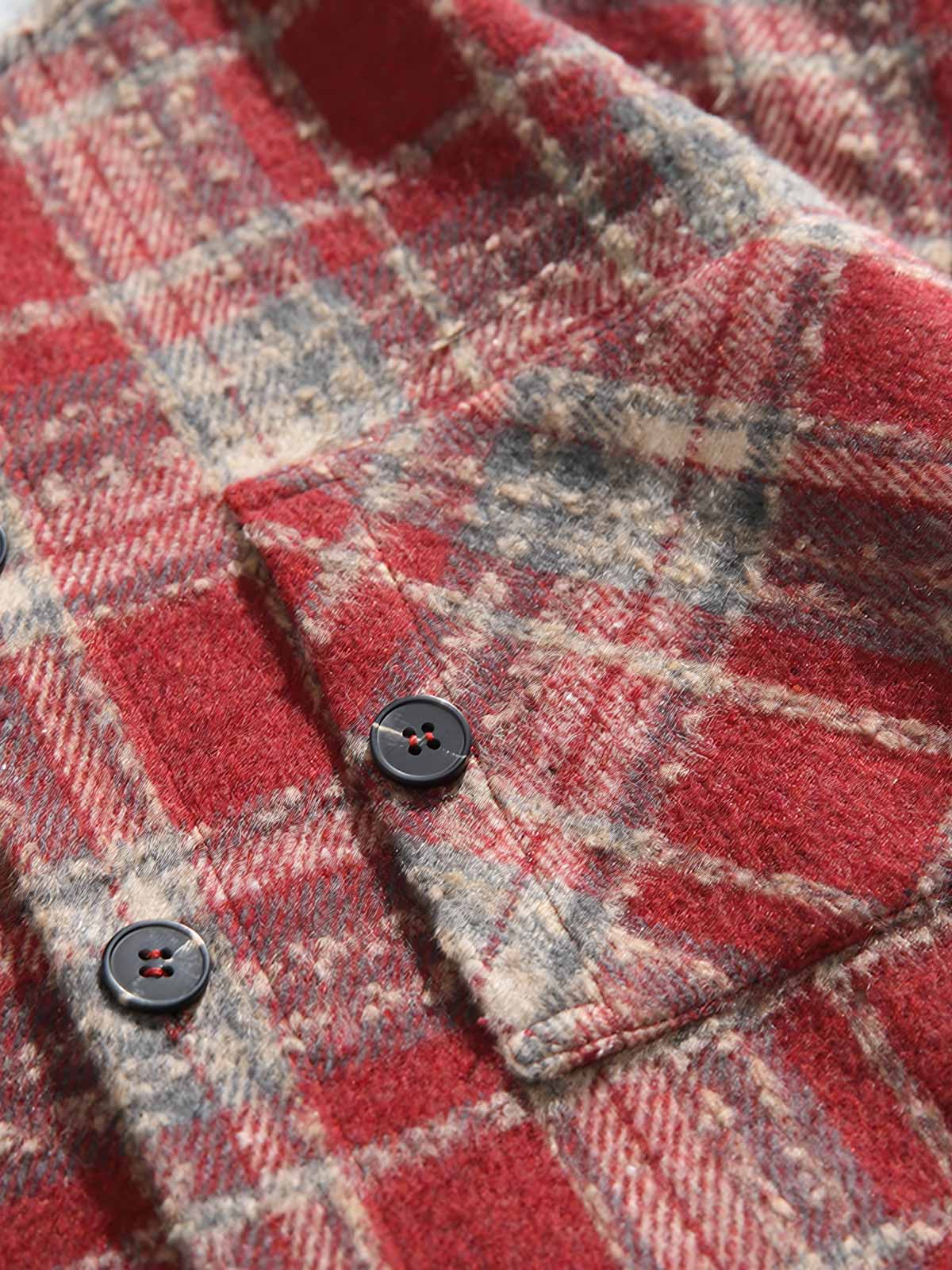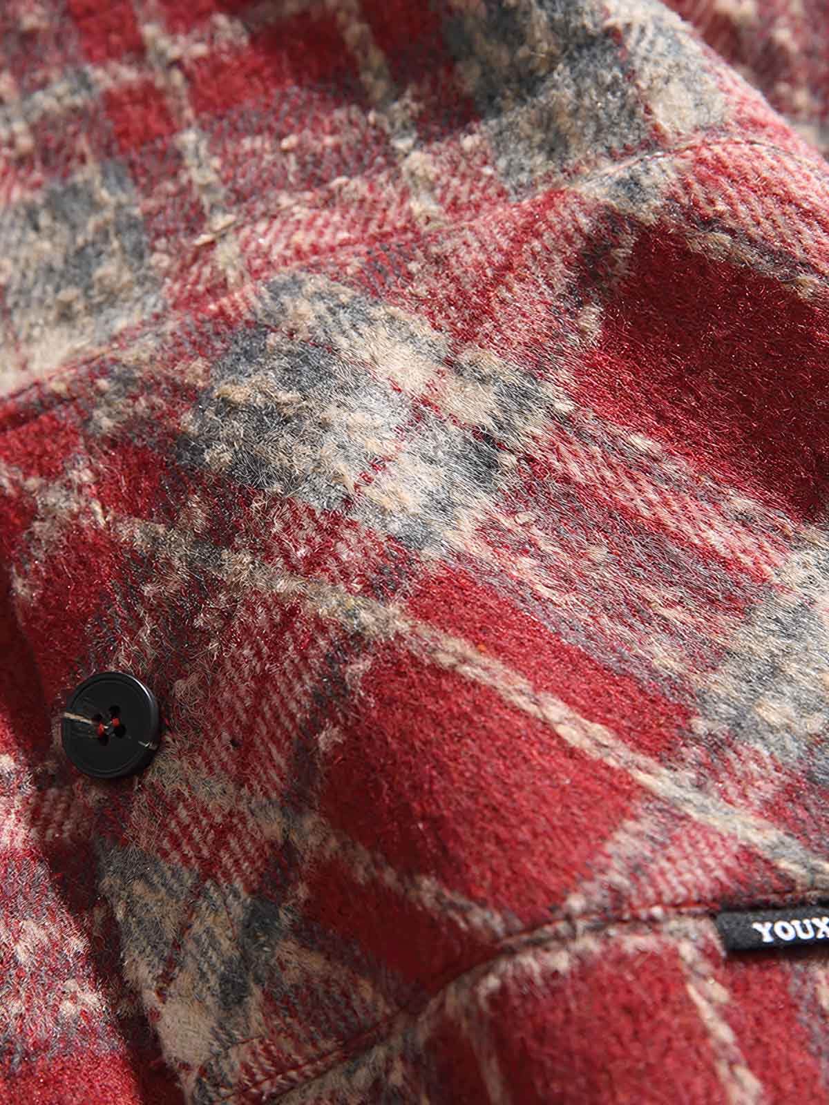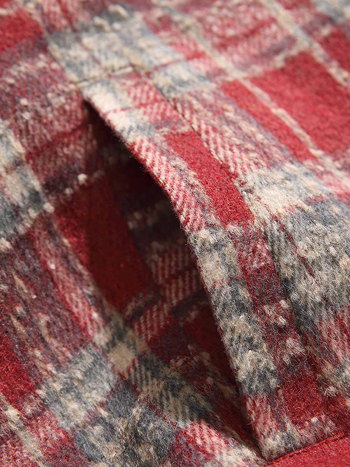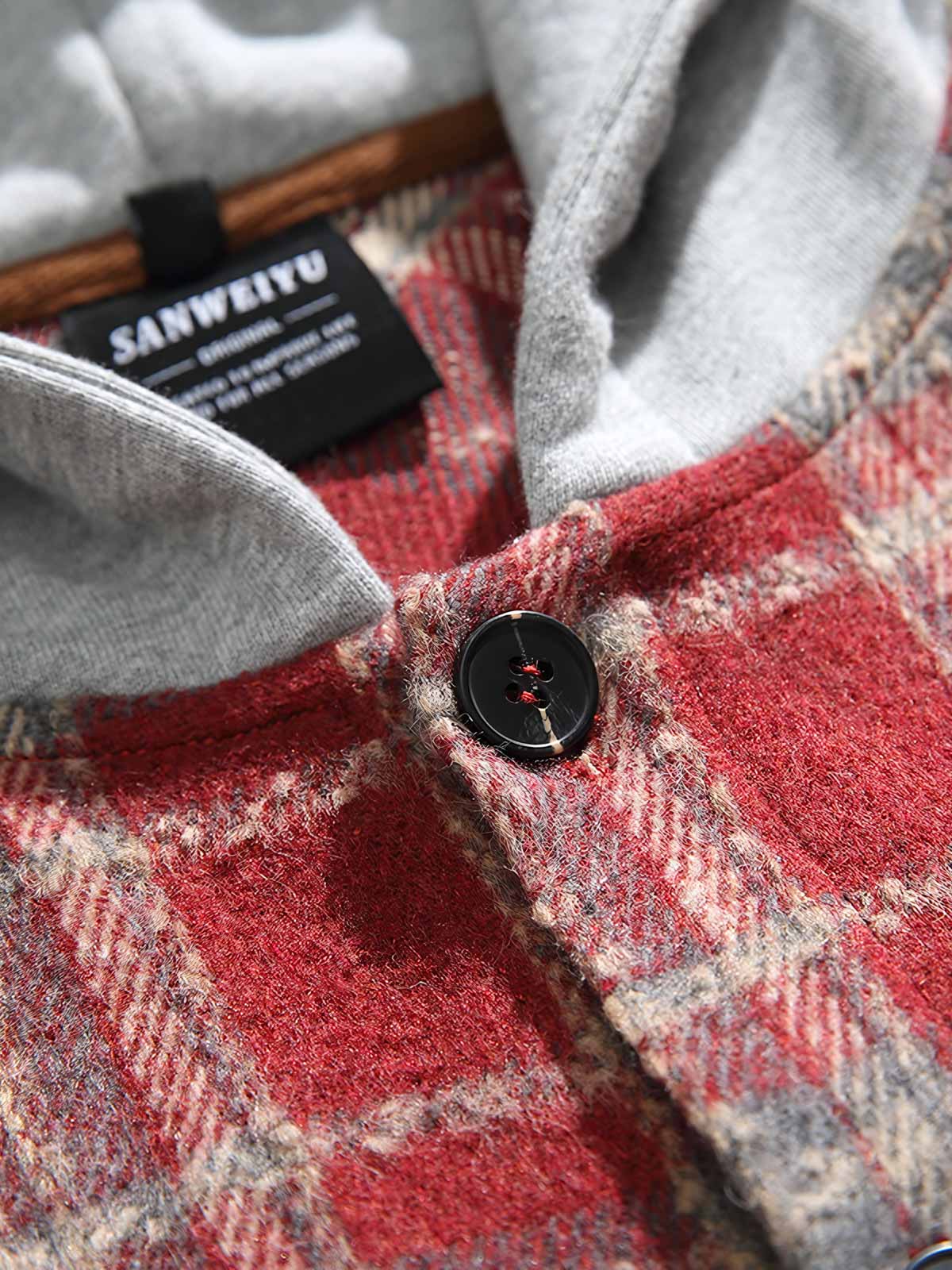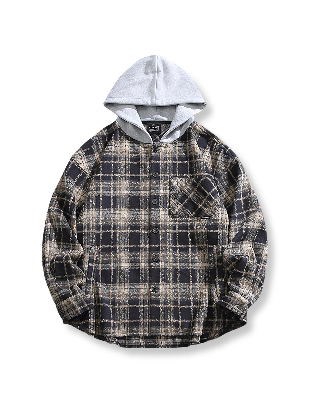 このジャケットはクラシックなチェック柄にモダンなフードを組み合わせたデザインで、伝統的なタータンチェックの歴史を反映しつつも、現代的なカジュアルスタイルに適応しています。繊細なニットパターンがチェック柄の美しさを際立たせています。
