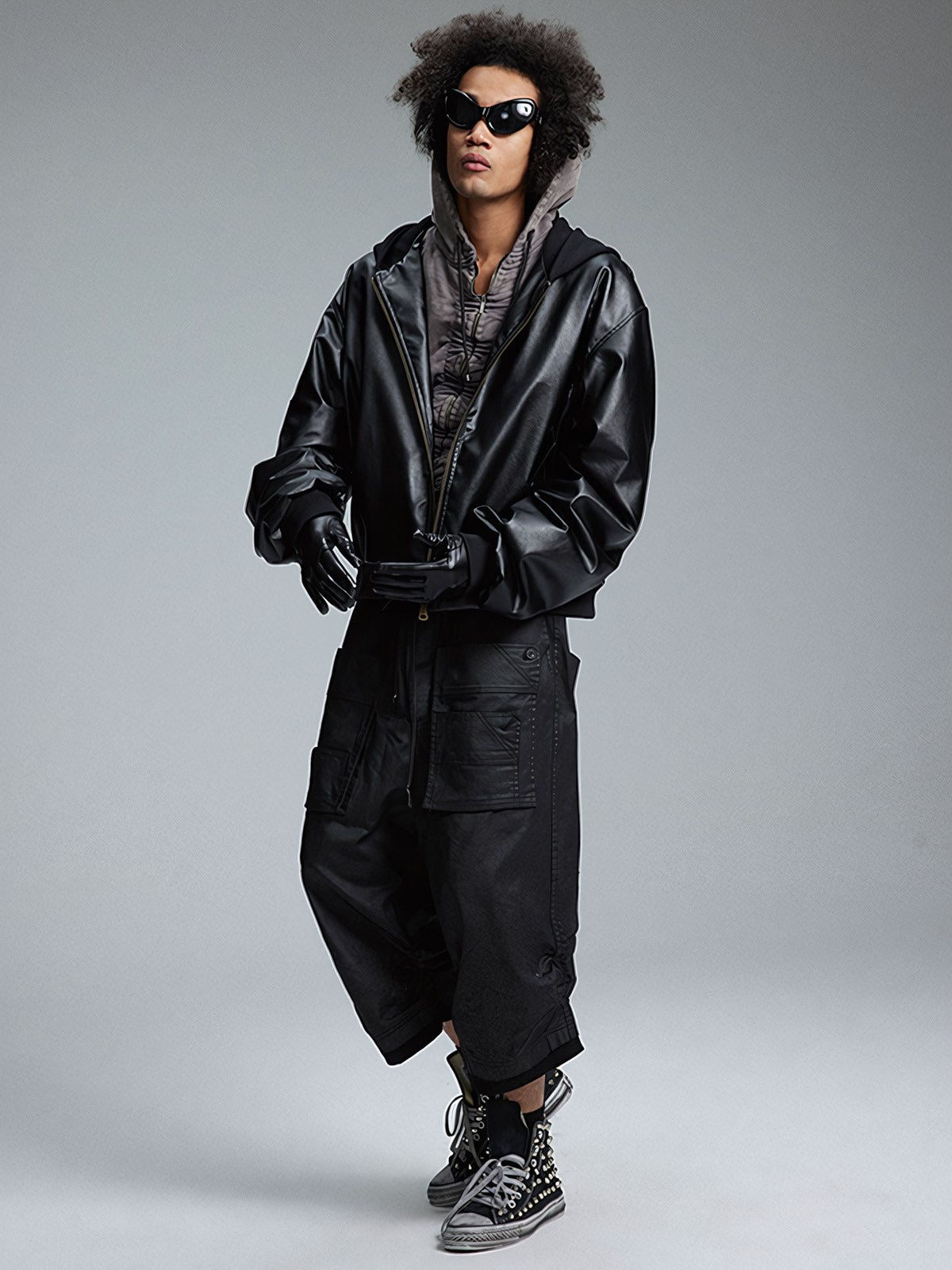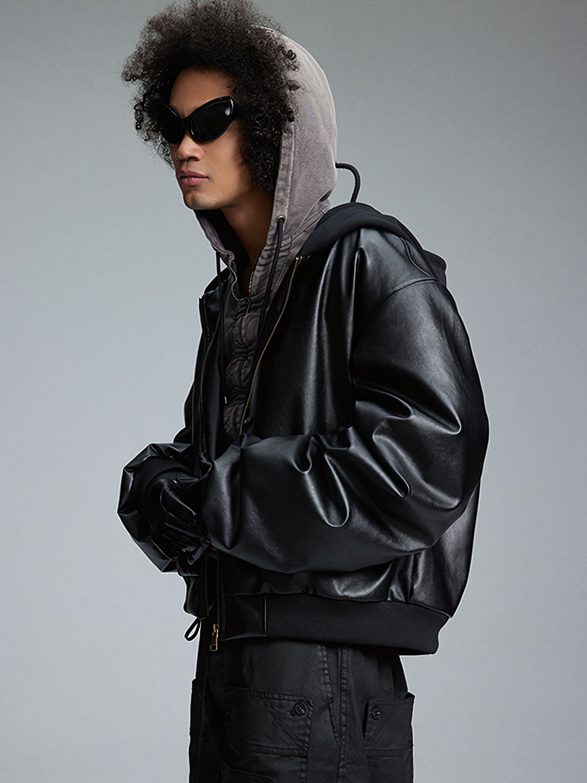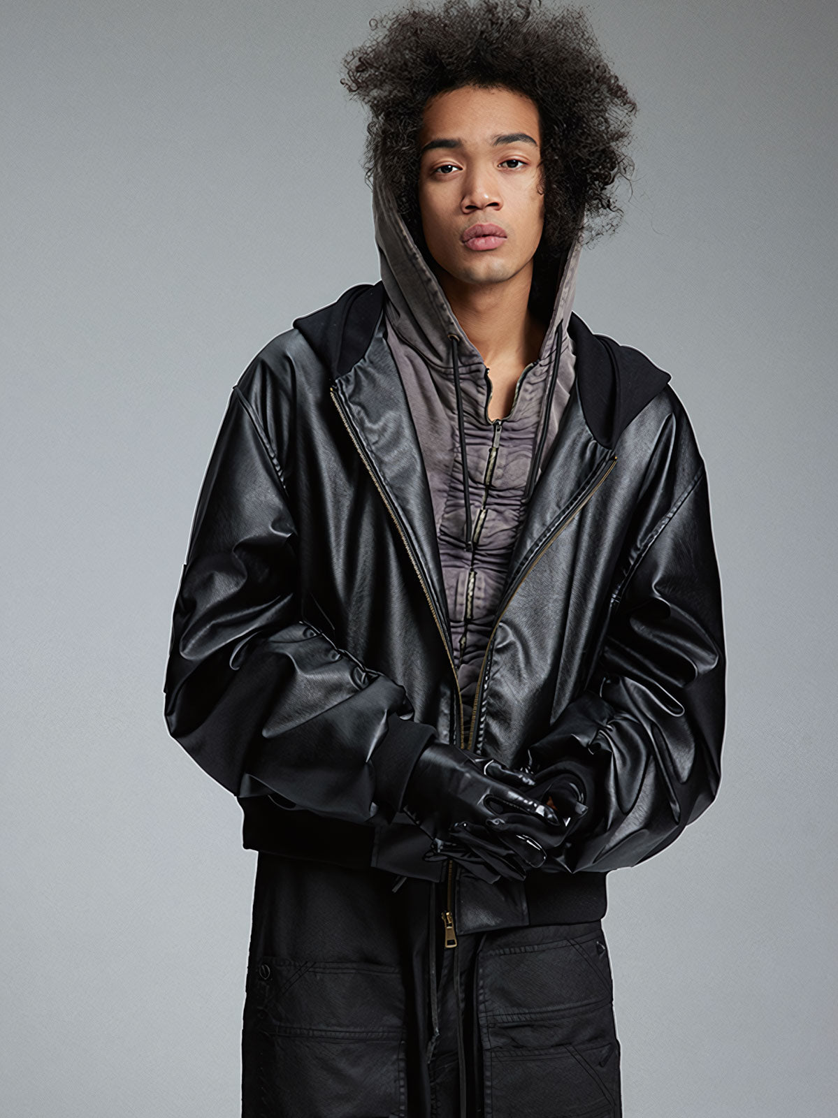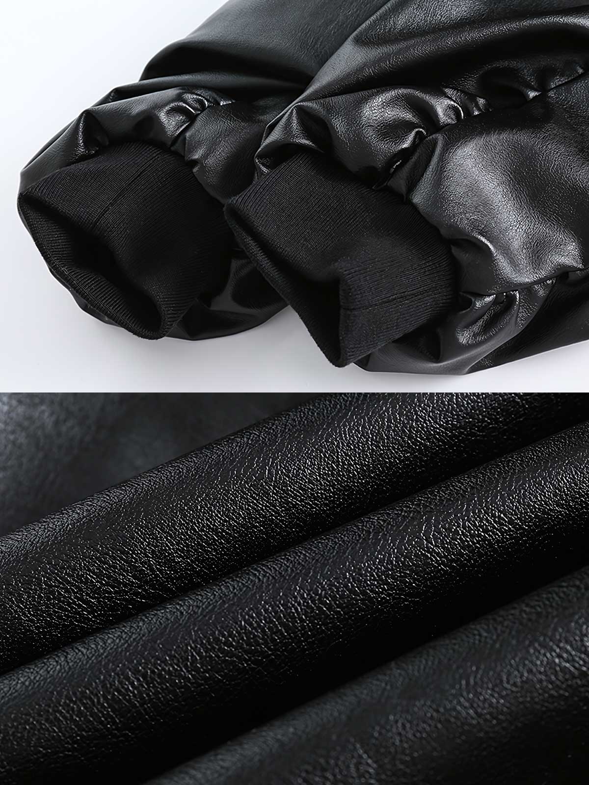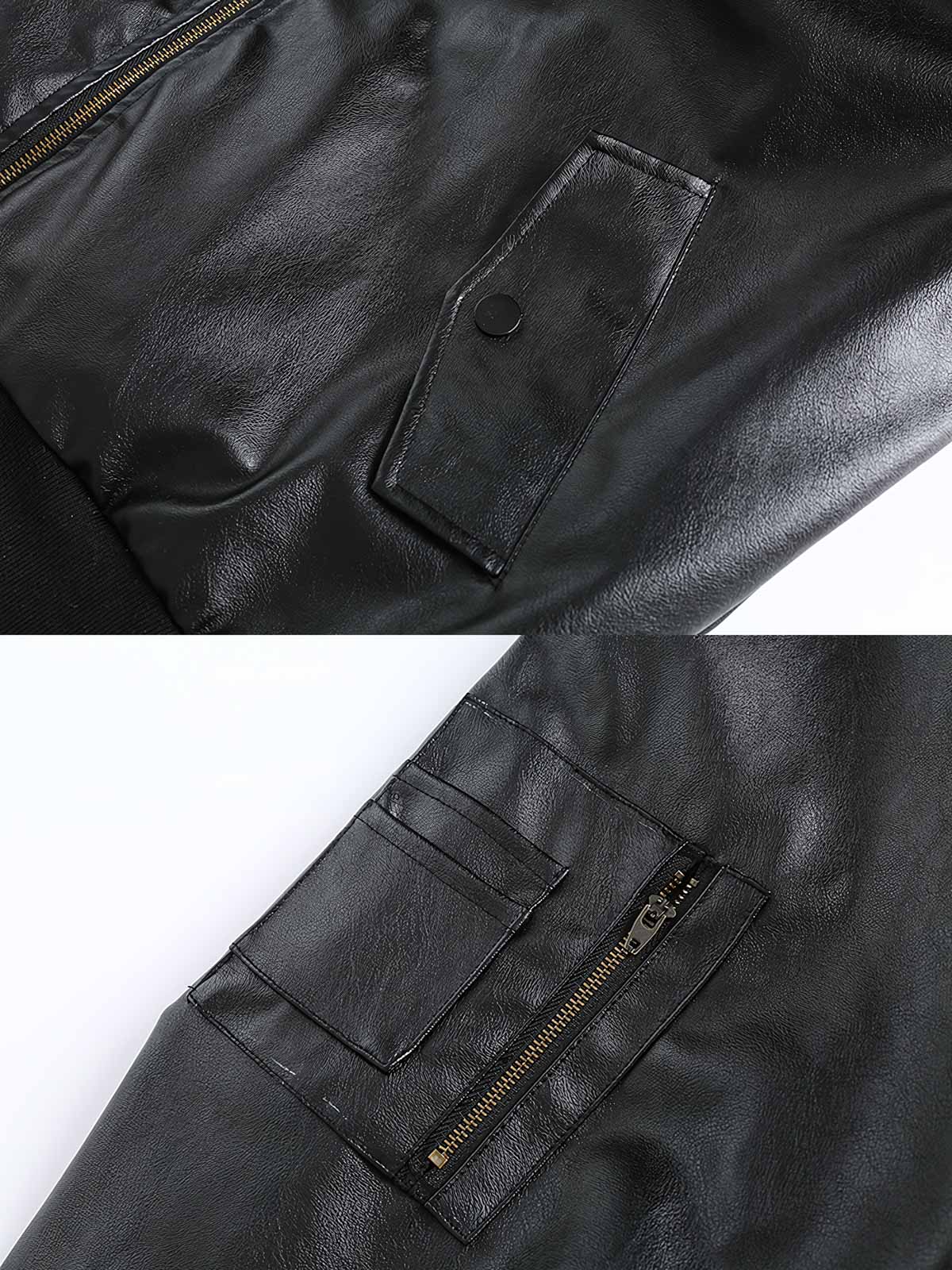 80%のPUと20%のポリエステルを混合した素材は、レザージャケットの立体感と柔らかさを保ちながら、耐久性とメンテナンスのしやすさも加えています。ジャケットの袖と胸部の装飾的なジッパーはワークウェア風の雰囲気を加え、リブ編みの裾と袖口はベースボールジャケットの伝統的な要素を保持しています。