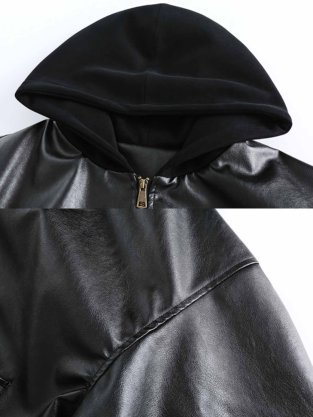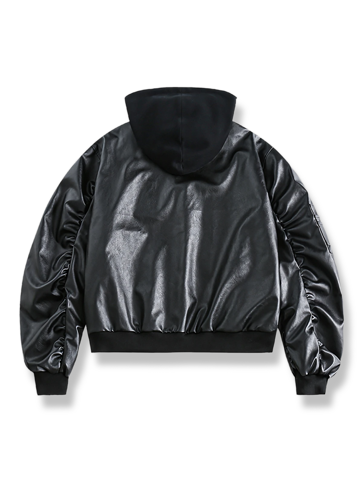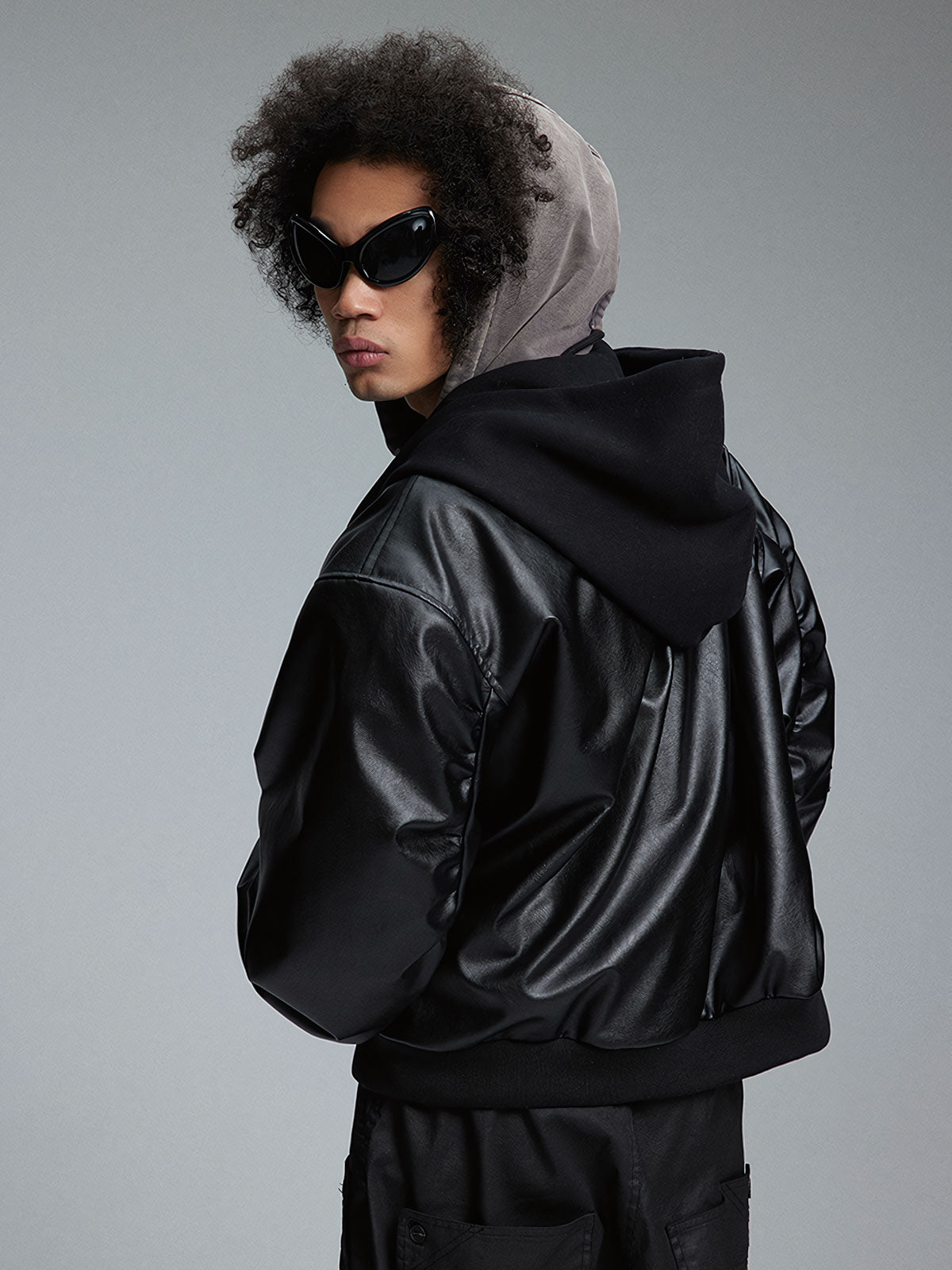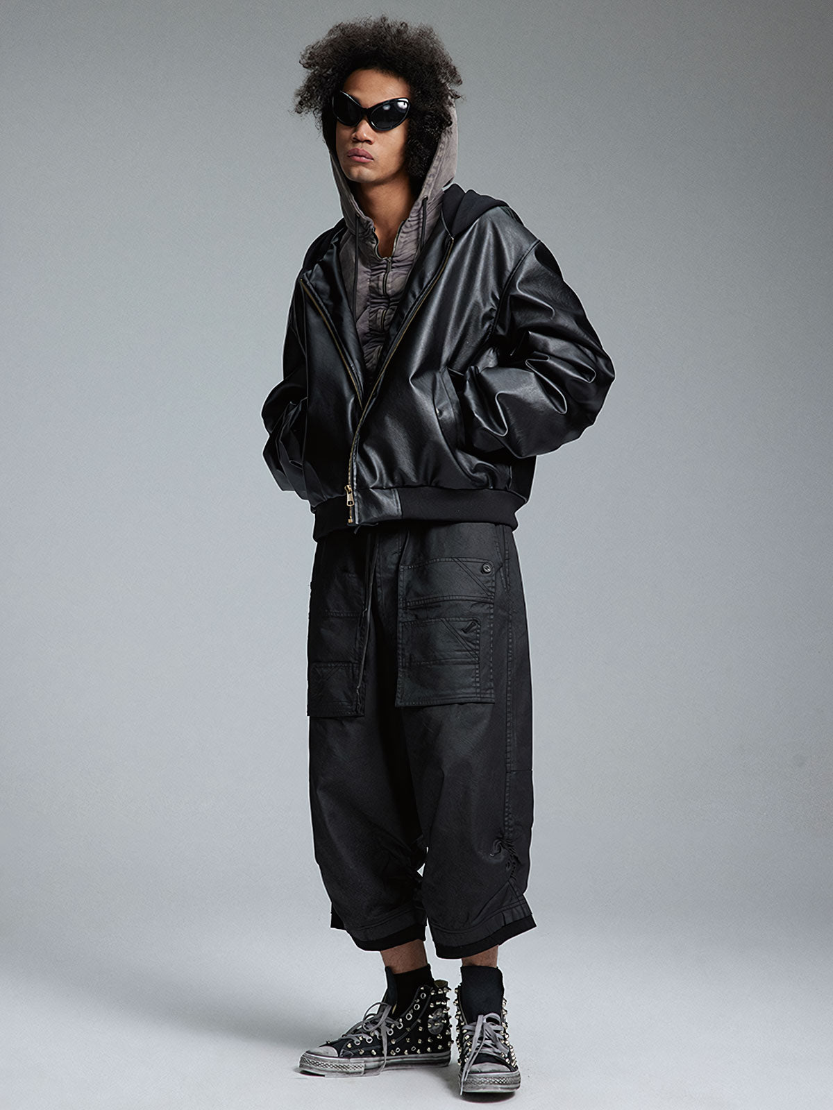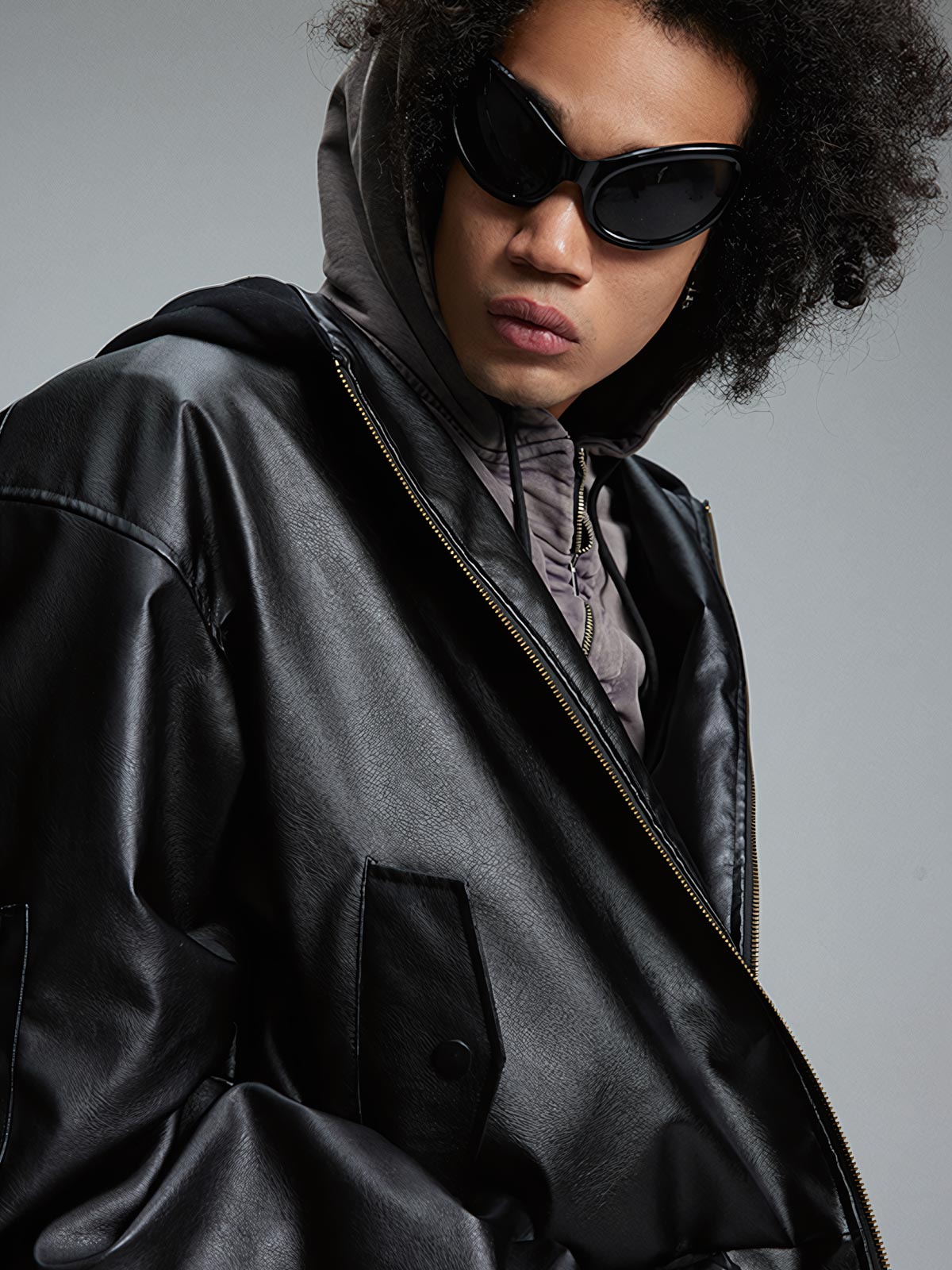 80%のPUと20%のポリエステルを混合した素材は、レザージャケットの立体感と柔らかさを保ちながら、耐久性とメンテナンスのしやすさも加えています。ジャケットの袖と胸部の装飾的なジッパーはワークウェア風の雰囲気を加え、リブ編みの裾と袖口はベースボールジャケットの伝統的な要素を保持しています。