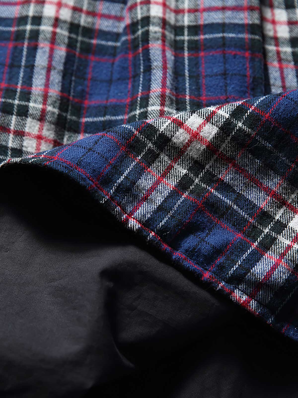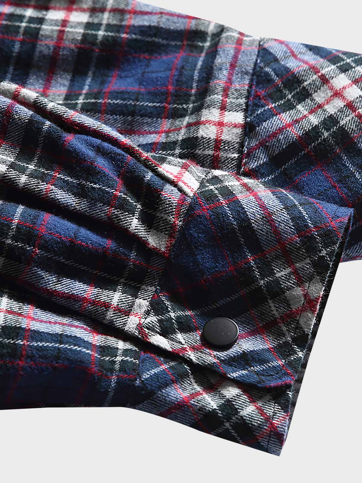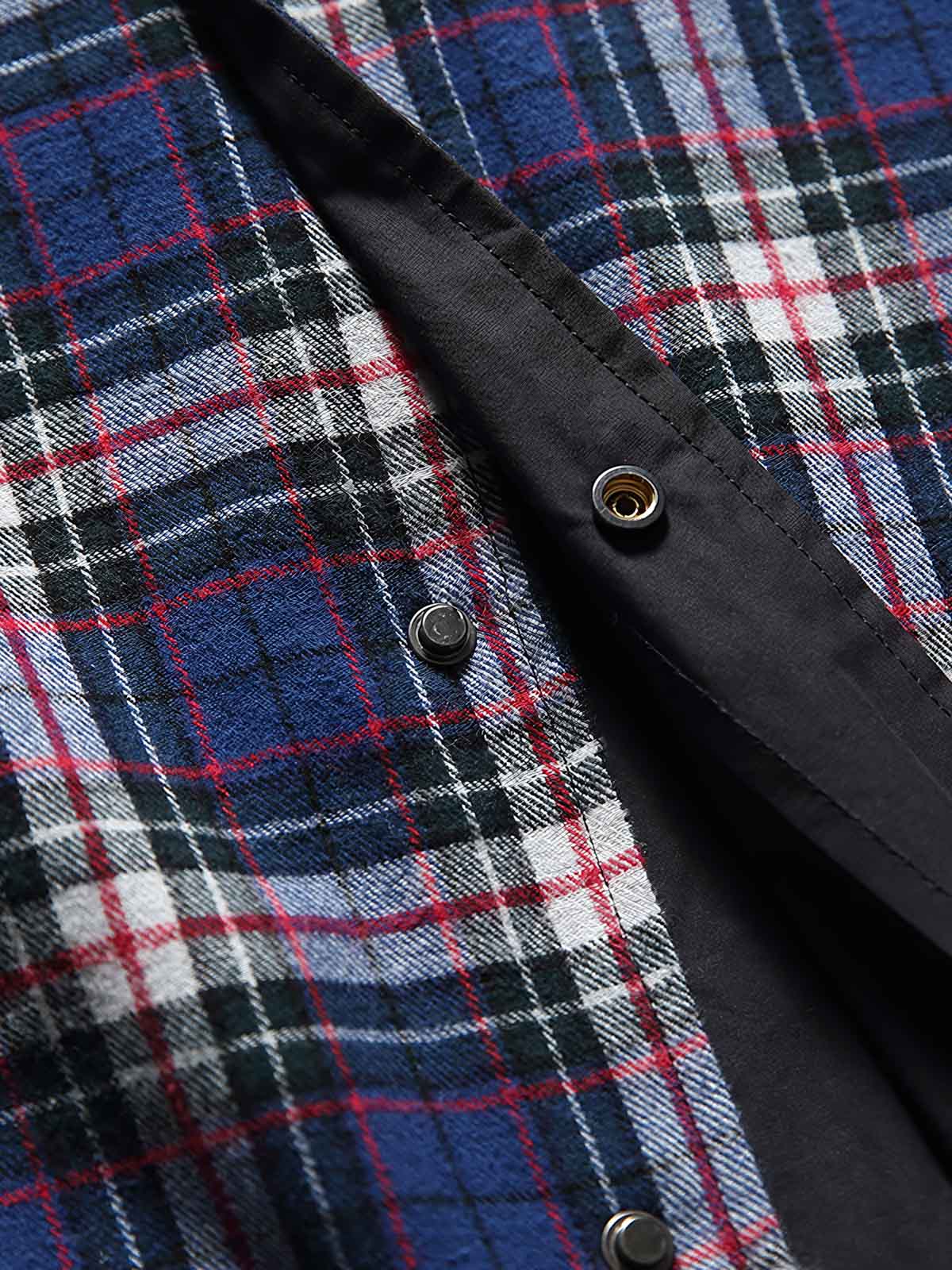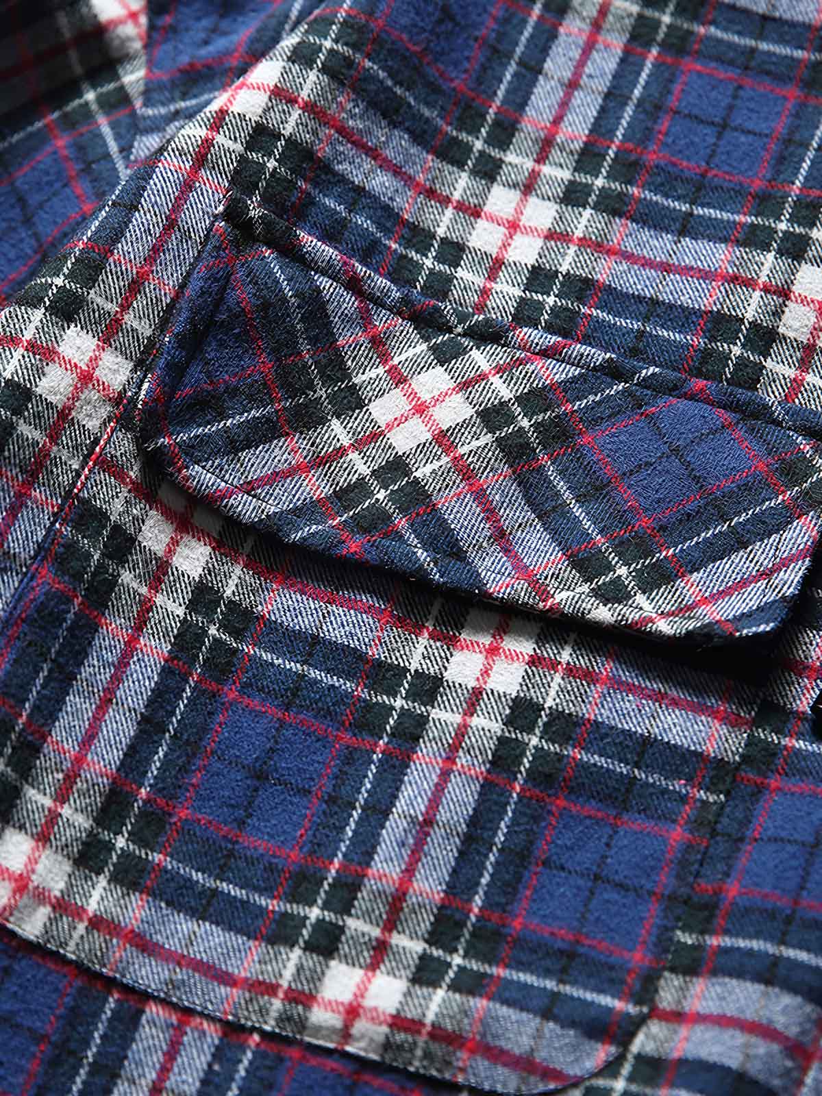 選ばれたコットン素材は、現代的な服装の快適性と耐久性の要求を満たしています。精密に合わせられたチェック柄のラインは、服作りの精密さを示し、ボタンやステッチの処理などのディテールは、レトロな工芸への敬意と品質への追求を体現しています。