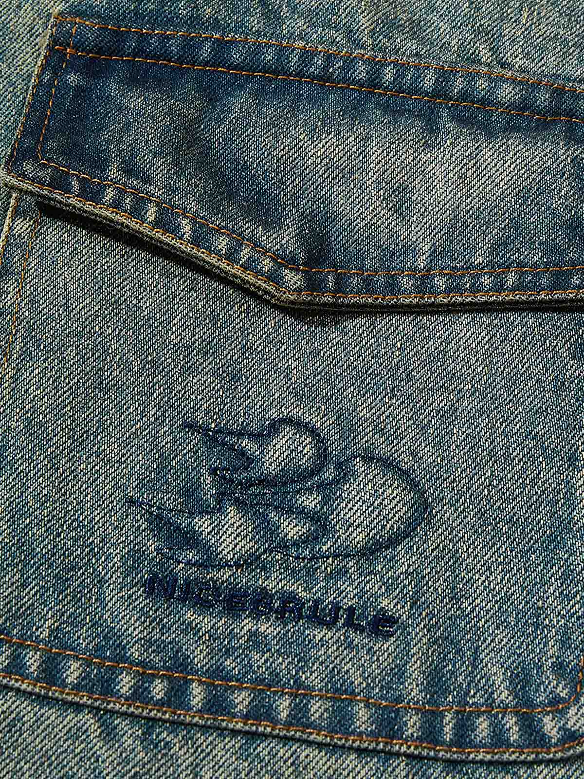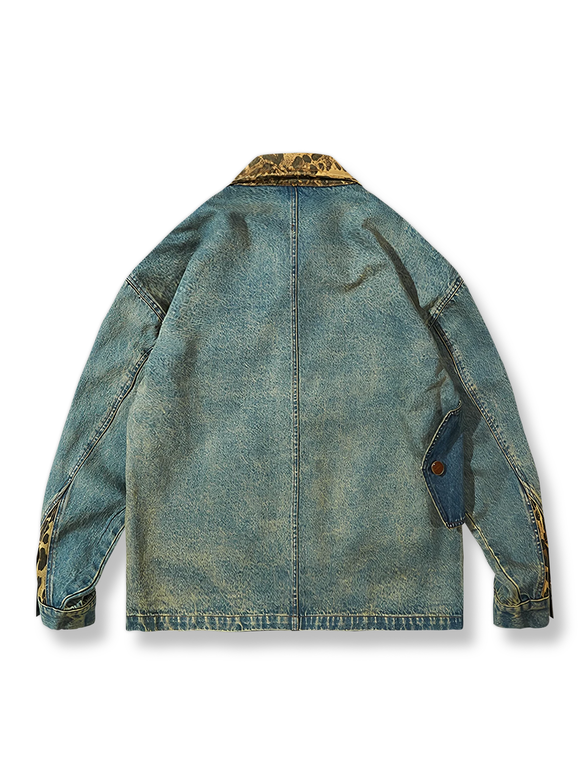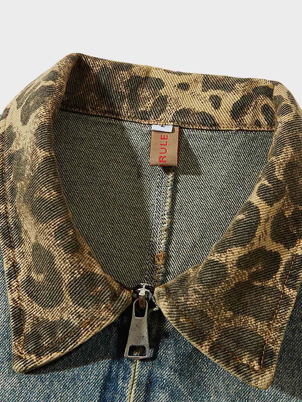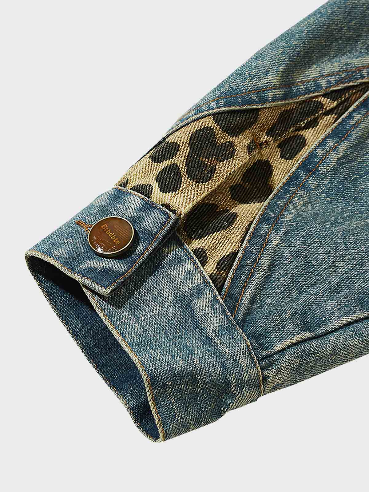 耐摩耗性のあるデニム生地を選択し、ウォッシュ加工によってユニークなレトロな質感を演出しています。レオパードカラーのデザインは視覚的にインパクトを与え、デニムの粗野な質感と対照的な触感を生み出し、ミックススタイルのユニークな魅力を表現しています。