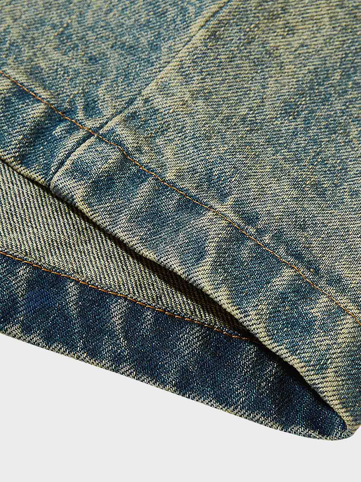 このデニムジャケットは、1950年代アメリカのロックカルチャーに触発されたデザインです。クラシックなエイジング加工でレトロな雰囲気を醸し出し、一方でレオパード柄のデザインが現代的なファッション感覚を加えています。伝統と革新が融合したこのジャケットは、反逆精神を象徴するアイテムです。