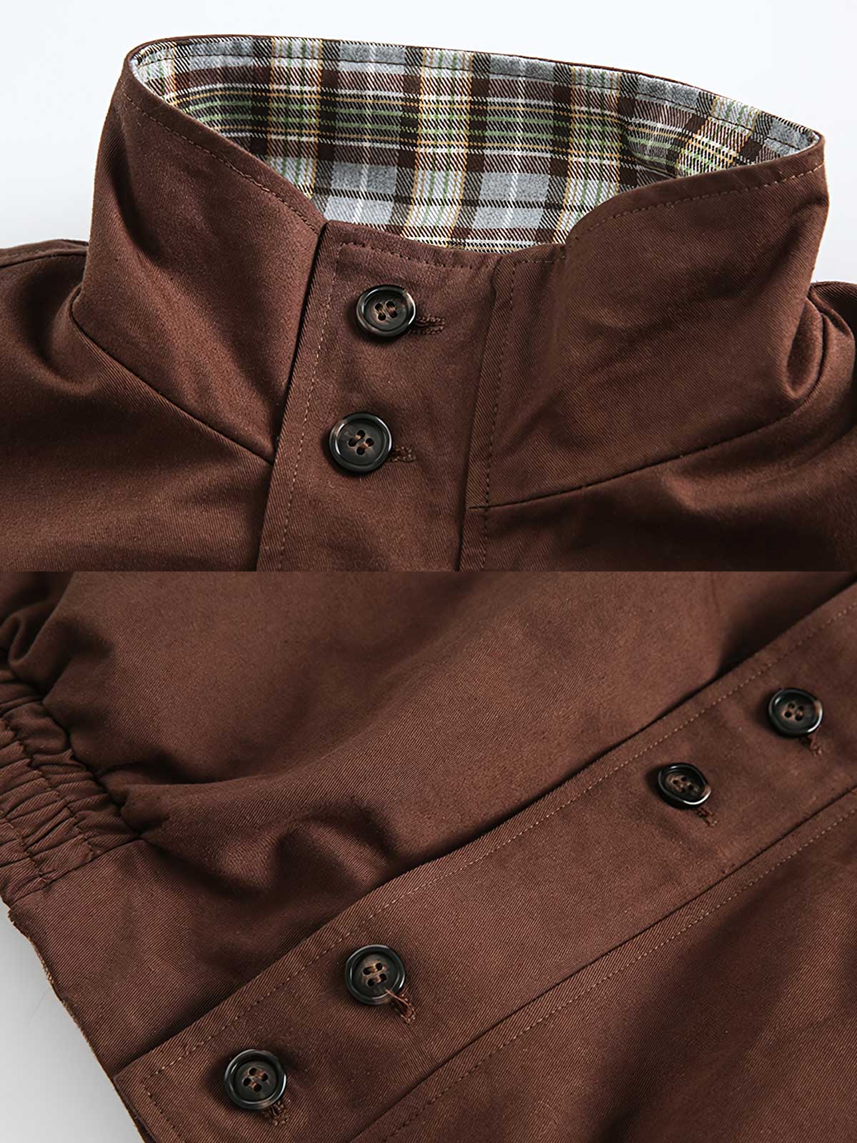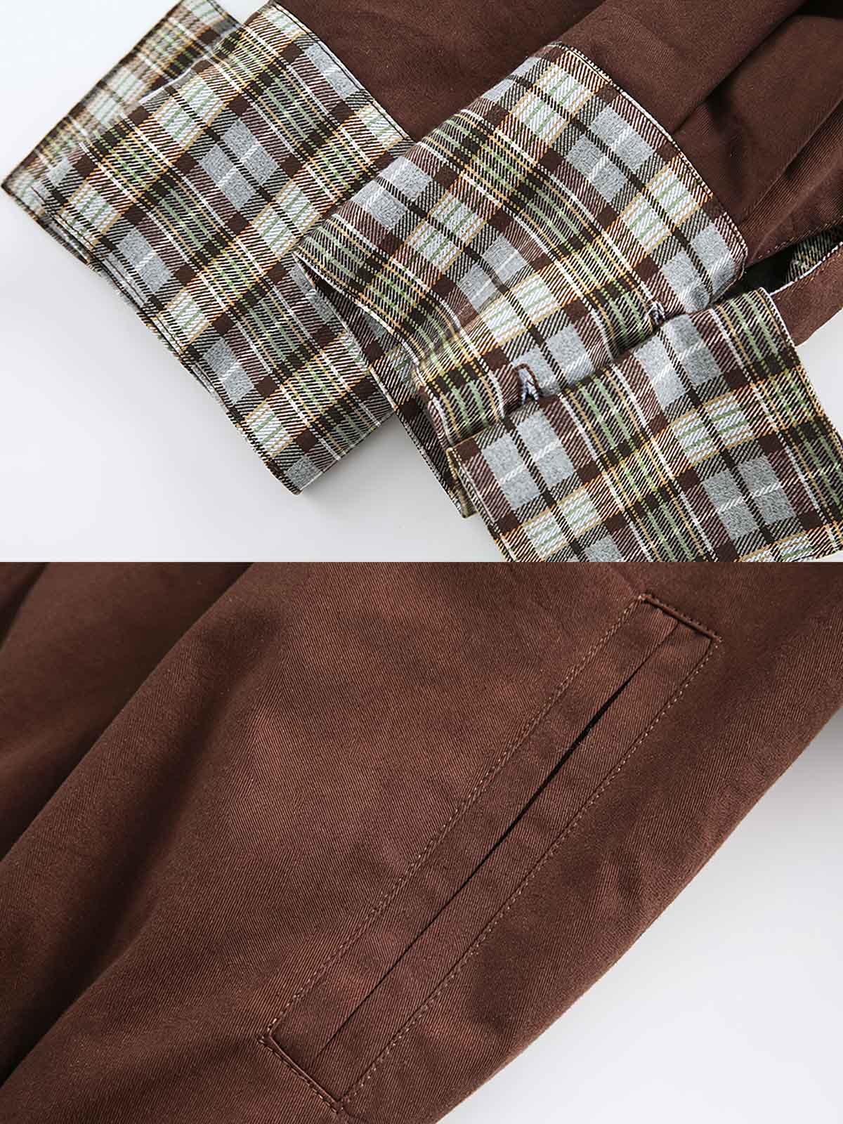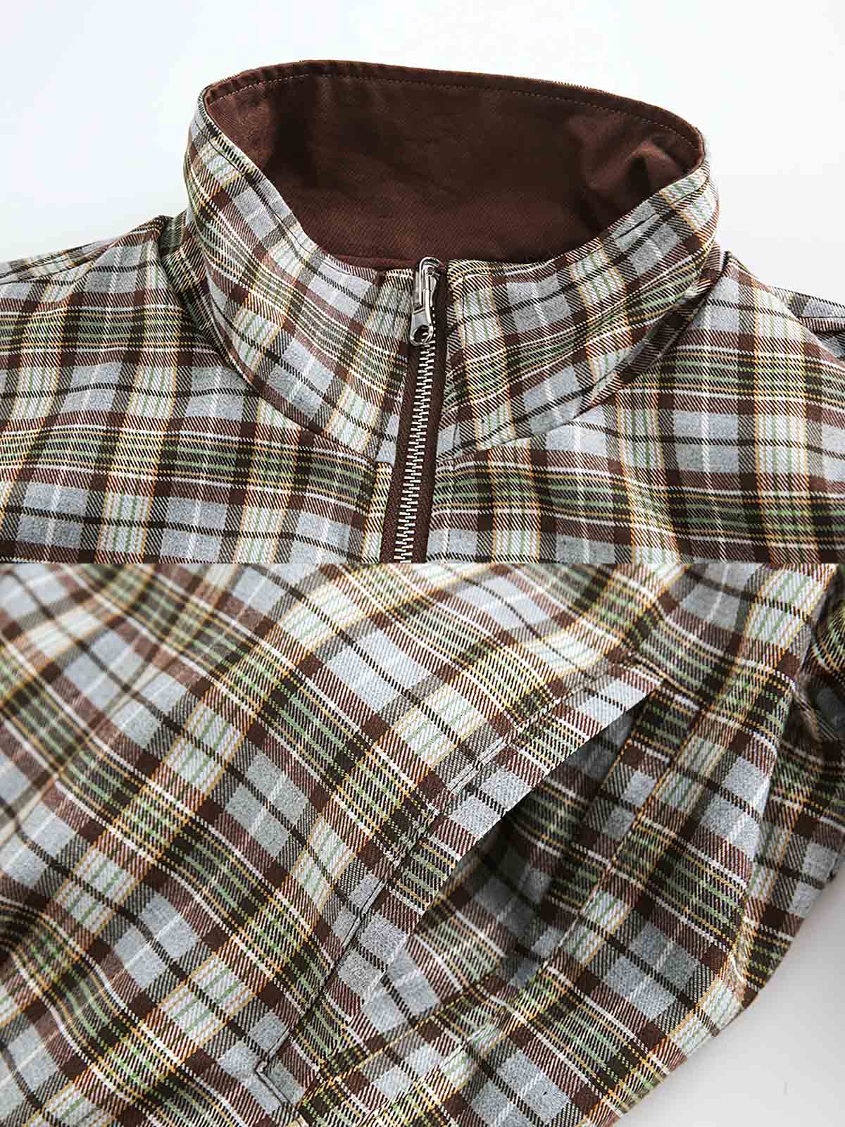 このリバーシブルジャケットは、クラシックなレトロスタイルと現代ファッションの実用性を融合させています。一方の面は伝統的なチェックストライプを展開し、もう一方はシンプルな純カフェカラーで、どちらのデザインスタイルもクラシックな英国スタイルから着想を得ており、20世紀のレトロファッションで人気がありました。