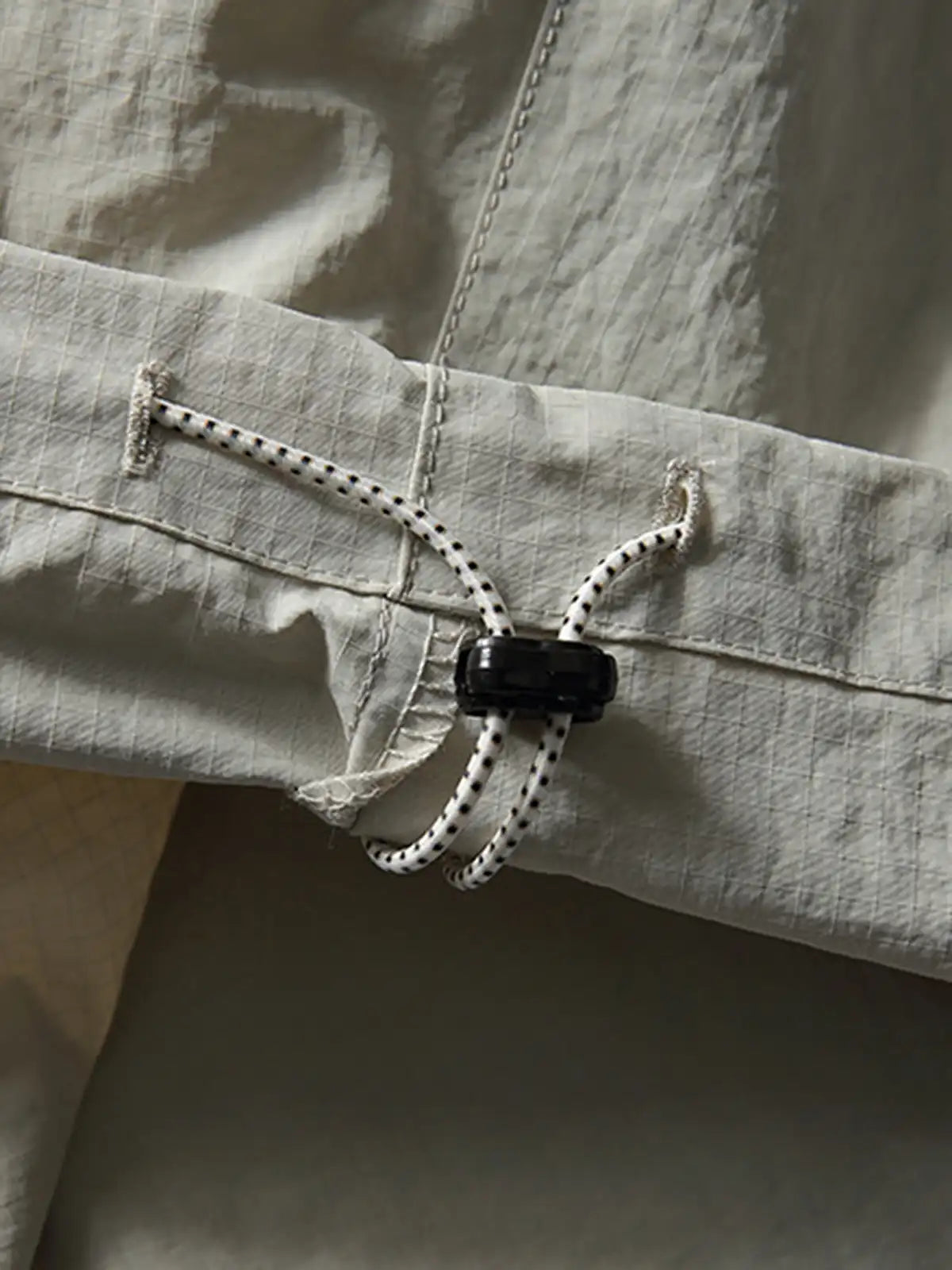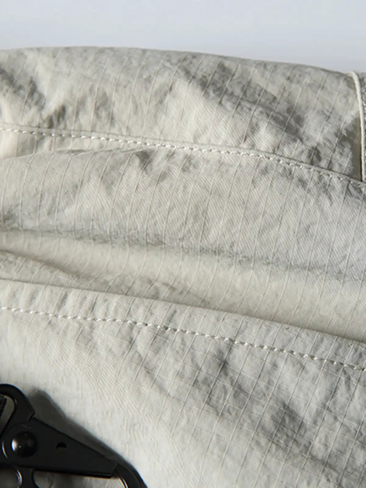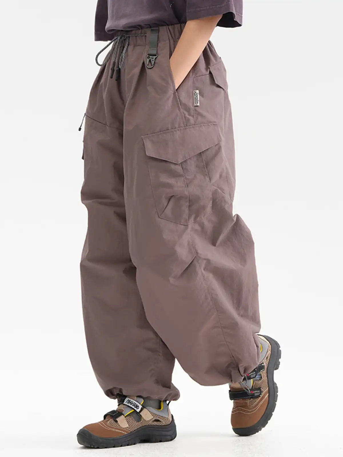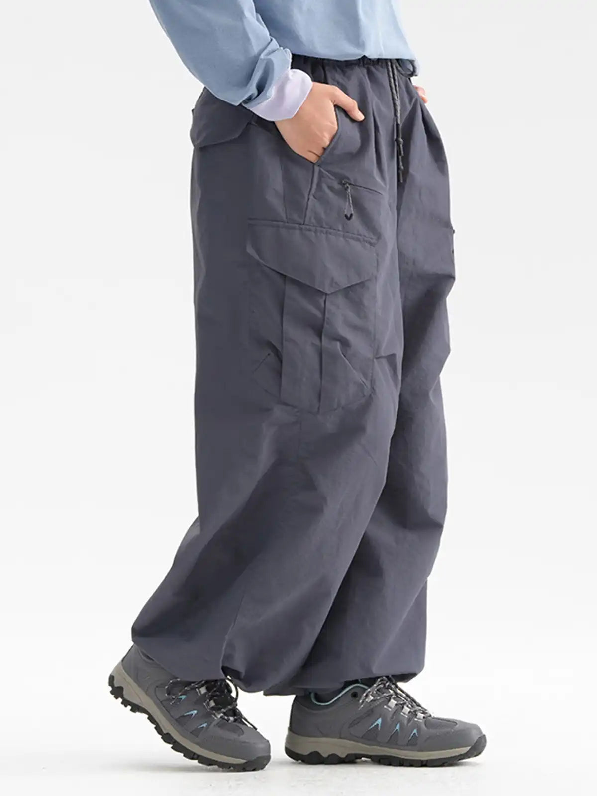 本パンツは、超ワイドシルエットと機能性を両立するために、全体をゴムとドローコードで仕上げたウエスト部と豊富なポケットディテールが特徴です。ナイロン100%の生地は、撥水・防風・速乾性に優れ、アウトドアや日常のストリートスタイルでも安心して着用できる耐久性を持ちながら、軽量で通気性も抜群です。さらに、脚口には調節可能なアジャスターが搭載され、シルエットやフィット感を自在に調整できるため、動きやすさとスタイリッシュさを同時に実現しています。以上のデザインと機能性の組み合わせにより、快適で実用的なユニセックスアイテムとして、幅広いシーンで活躍することができます。