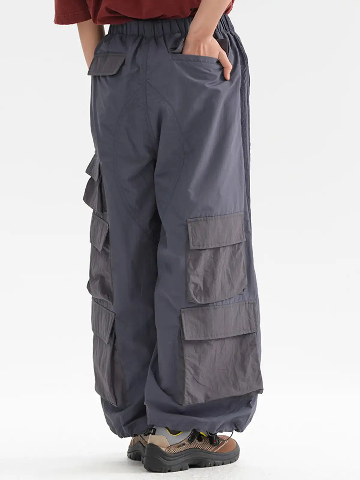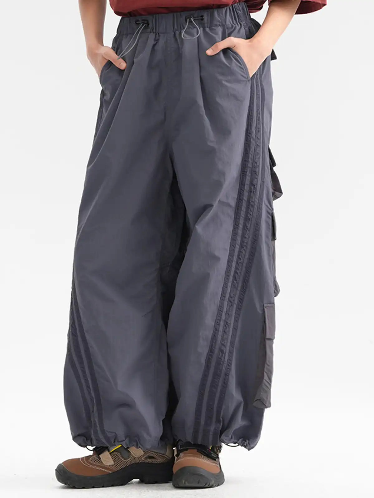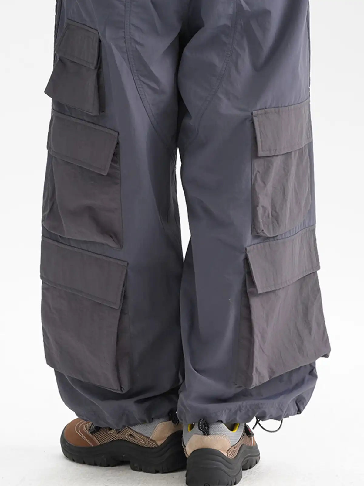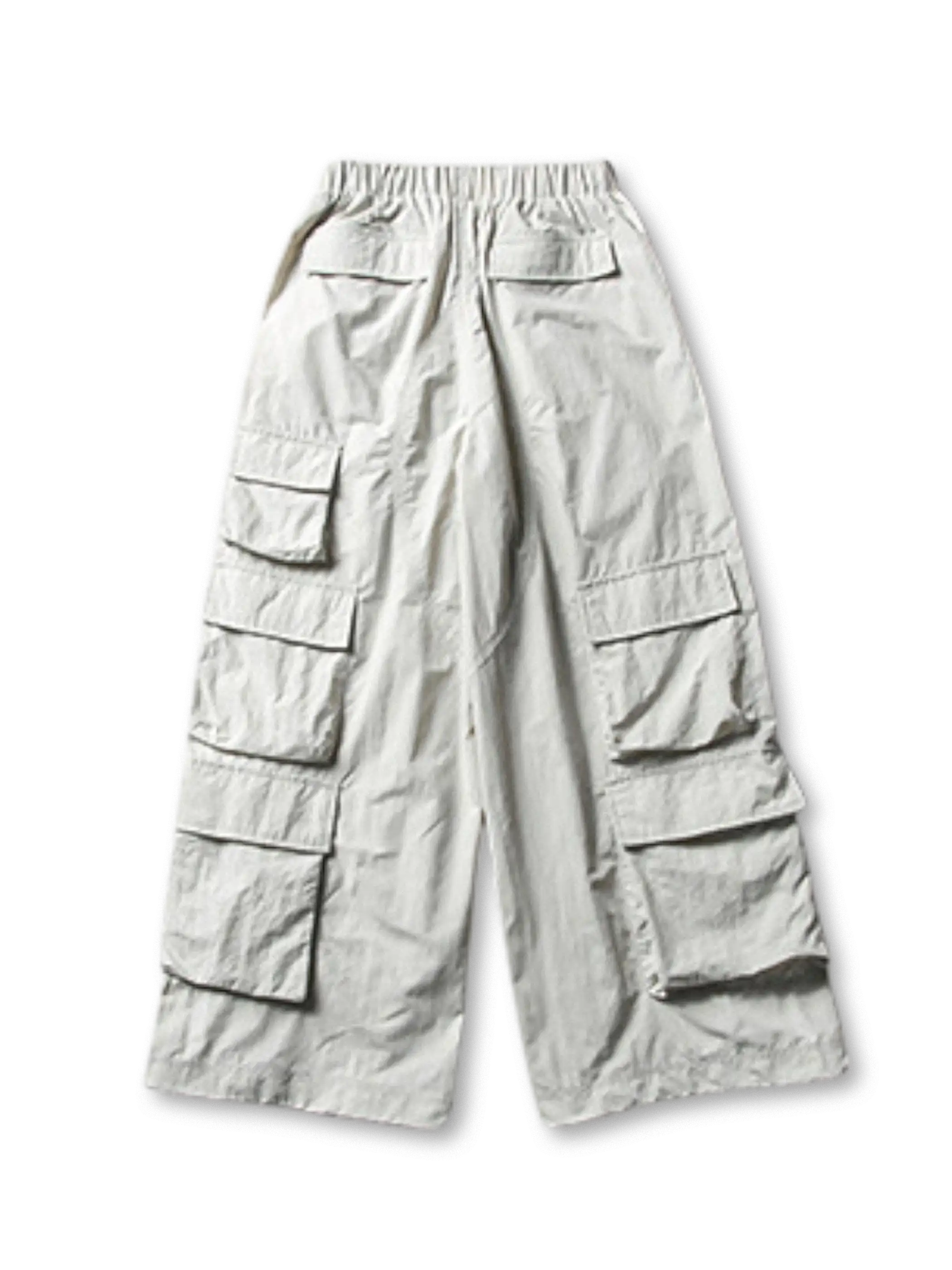 この超ワイドカーゴパンツは、パラシュート風のデザインと多機能ポケット、調整可能な裾を備え、アウトドアからタウンユースまで幅広く活躍する一着です。