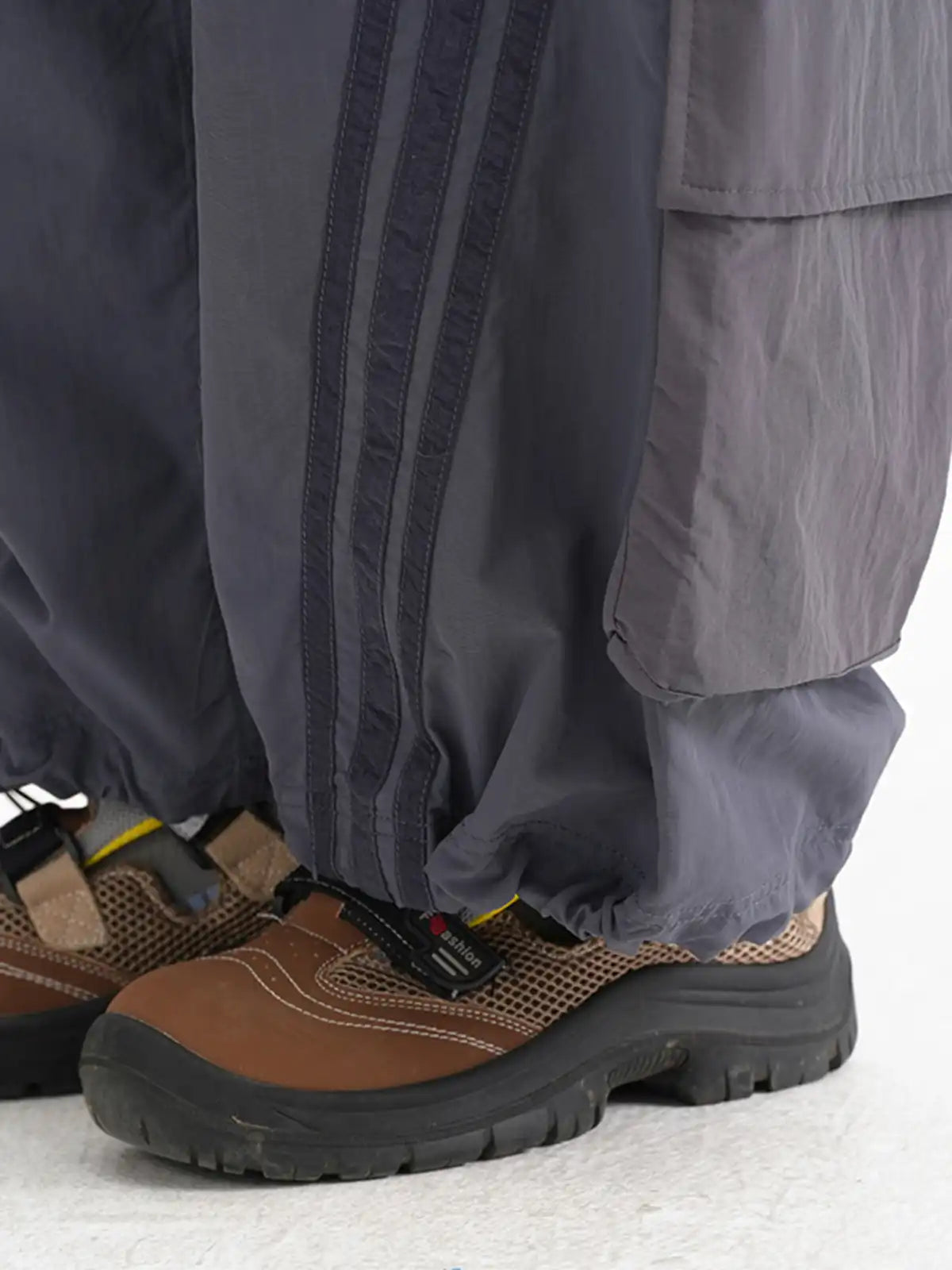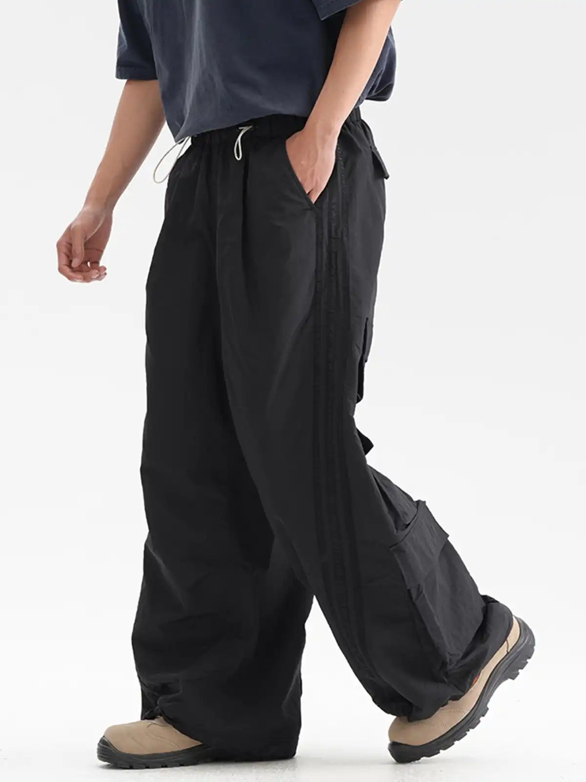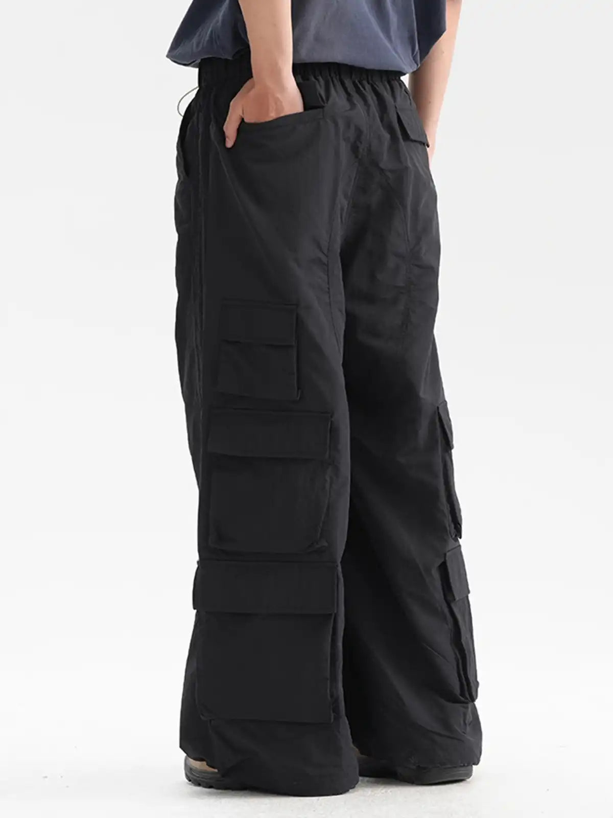 この超ワイドカーゴパンツは、パラシュート風のデザインと多機能ポケット、調整可能な裾を備え、アウトドアからタウンユースまで幅広く活躍する一着です。