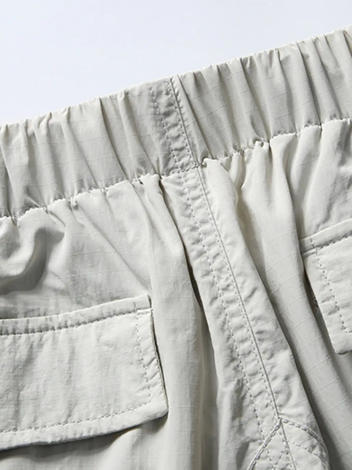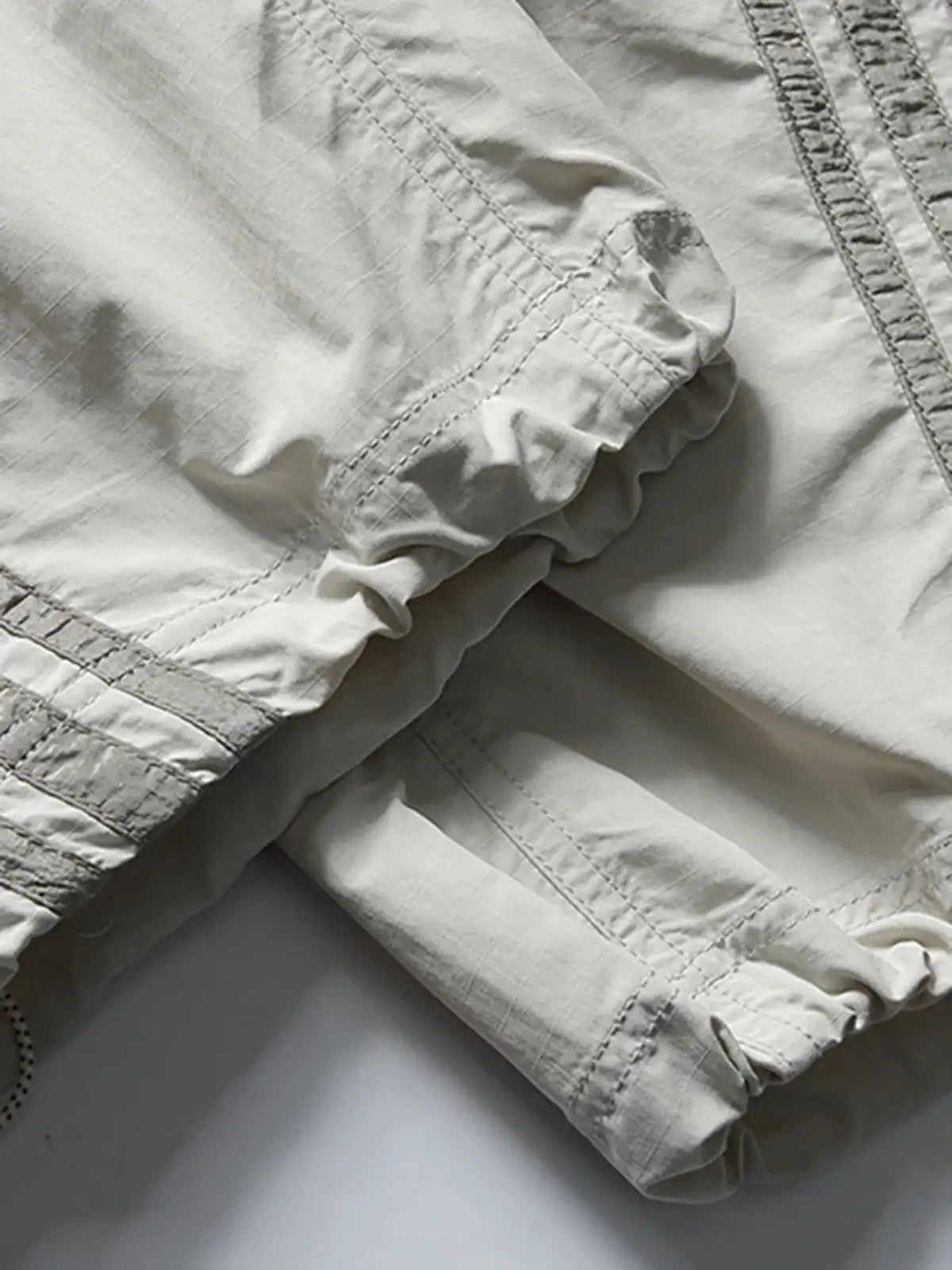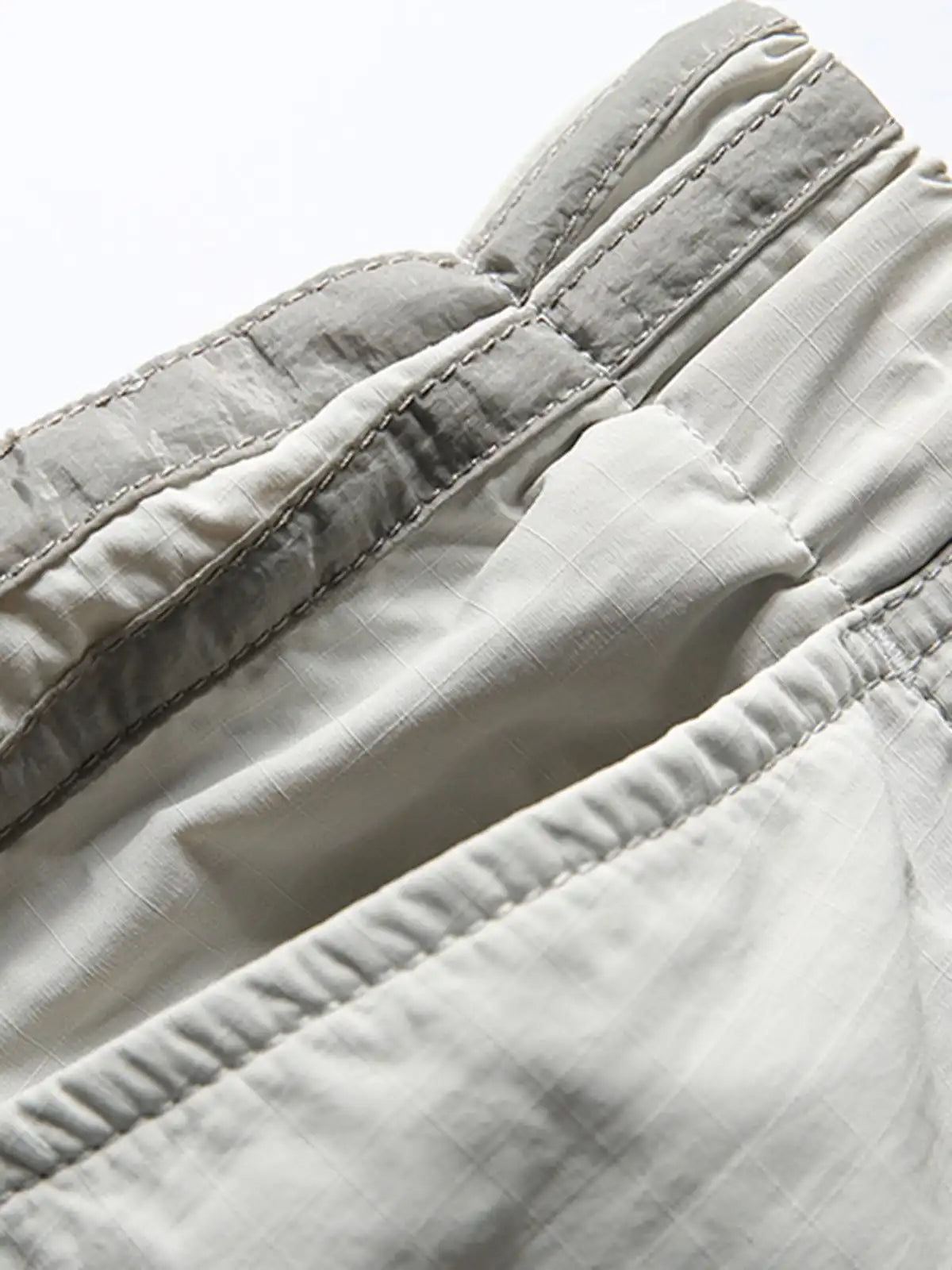 ウエストはオールゴム仕様で幅広い体型にフィットし、両サイドには斜め配置の3本ラインがアクセントとして映えます。大容量ポケットを複数備え、アクティブなシーンでも収納力を確保。裾にはカスタムのアジャスターが搭載され、シルエットを自由に変えられるため、リラックス感あるワイドパンツから絞りの効いたスタイルまでお好みで調整可能です。防水・防風・速乾・耐久撥水性を兼ね備えた高機能素材を使用し、屋外活動から日常使いまで、多彩なシーンで快適に着用できます。