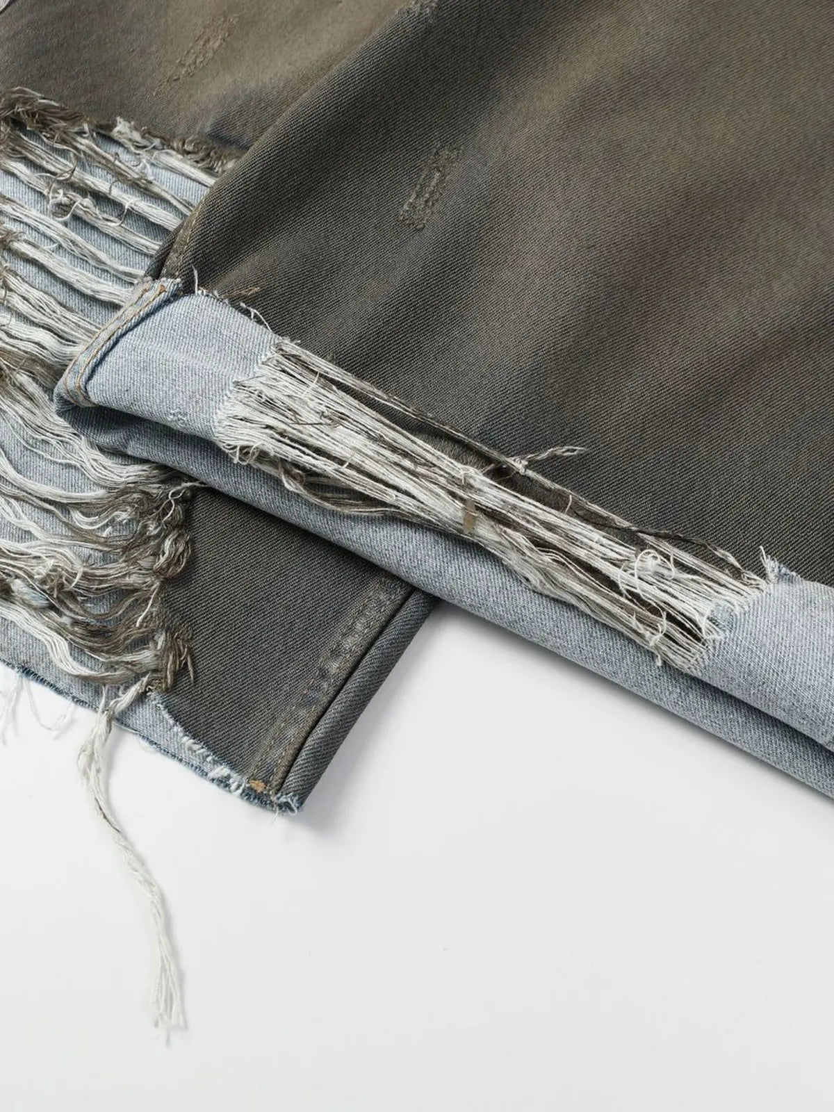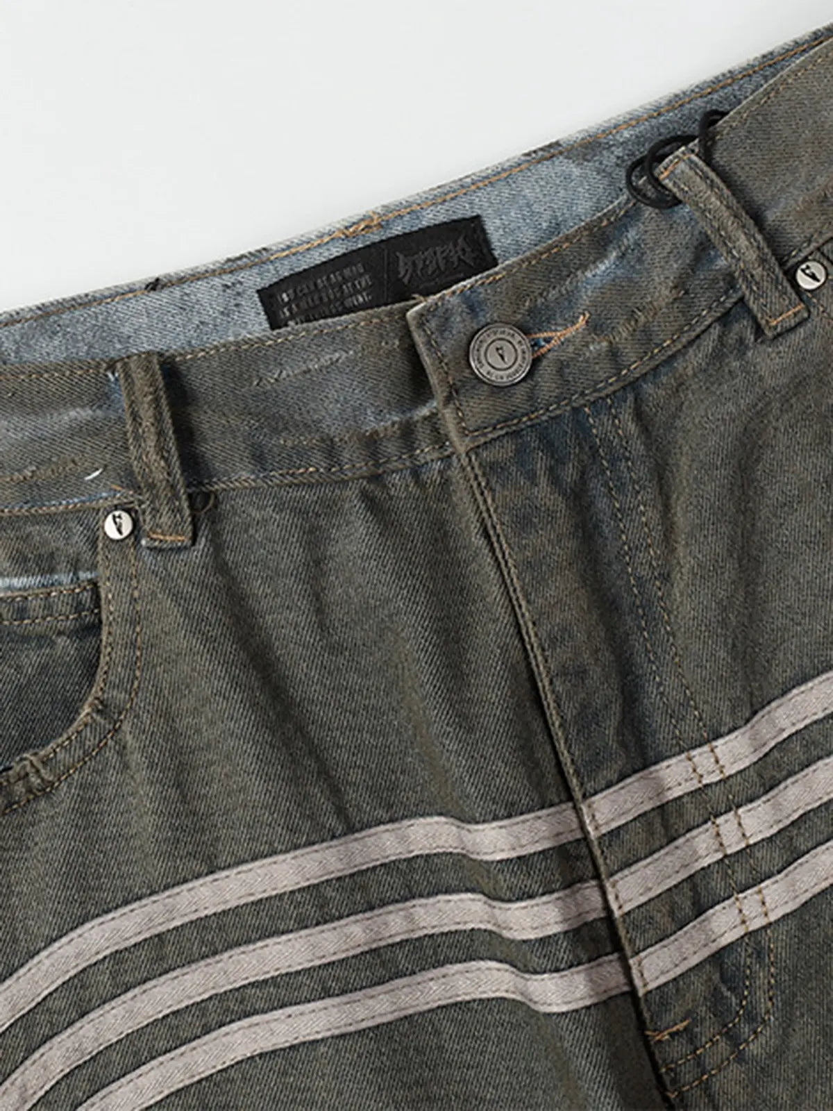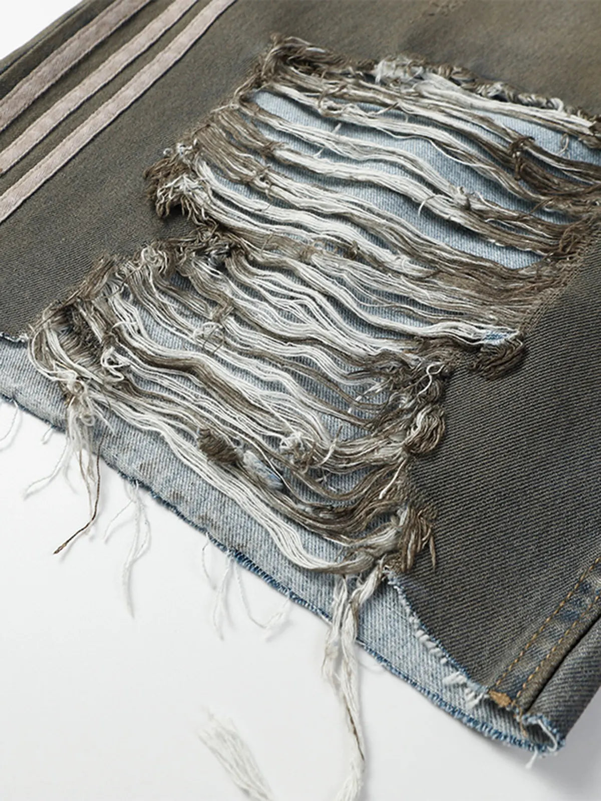 ミリタリーオリーブにウォッシュドダイ加工を施したコットンデニムに、前面にパネル風に入れたアーチ状ホワイトストライプがアクセント。両膝の大胆なダメージと切りっぱなしの裾がヴィンテージ感を高め、ウエストはベルトループ+ボタンフライ仕様でクラシックな装いをキープ。ヒップから膝まで直線的に落ちるストレートシルエットが、ゆったりしながらも野暮ったさを抑えたモダンな印象を与えます。
