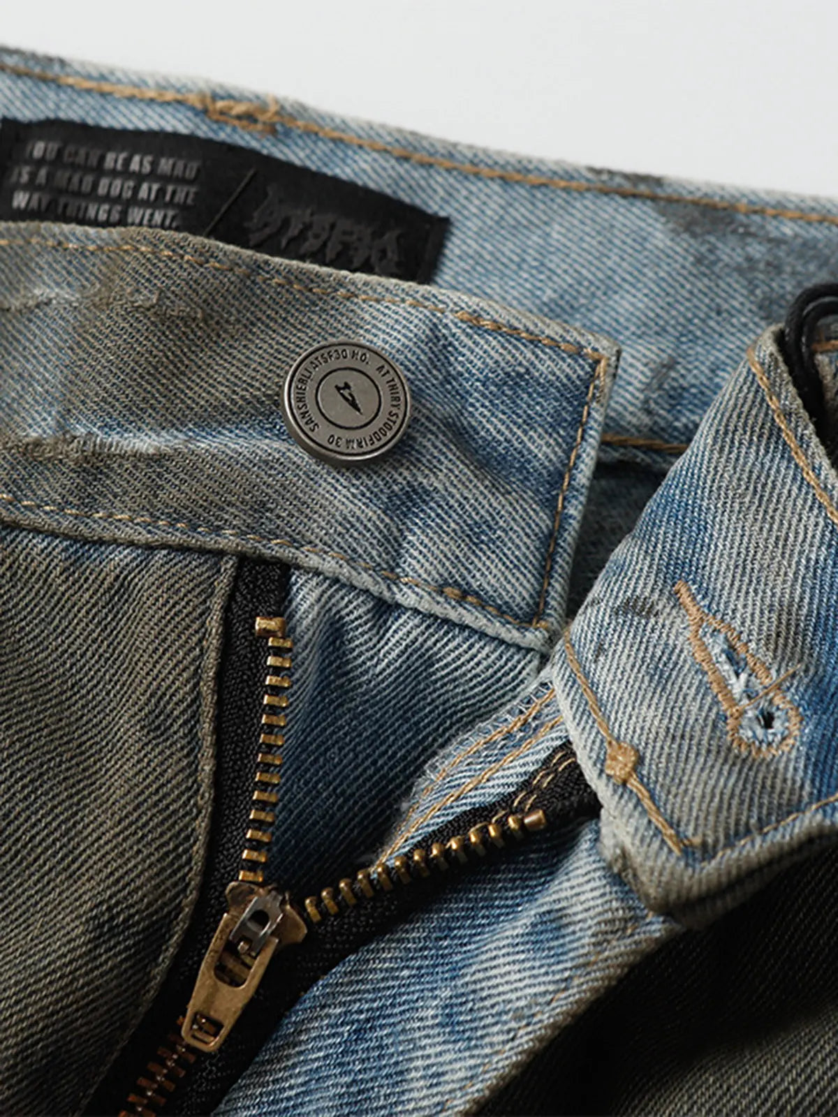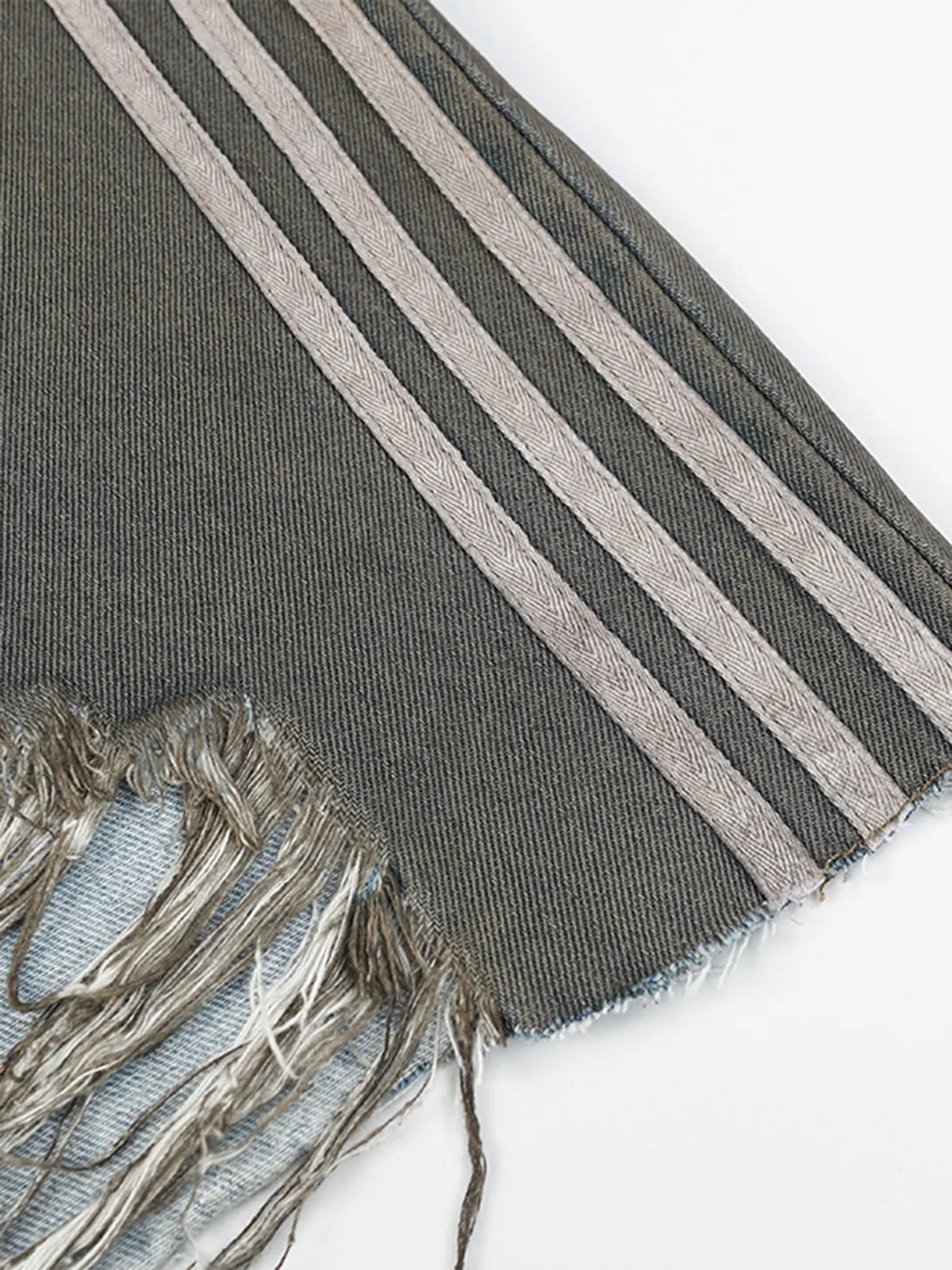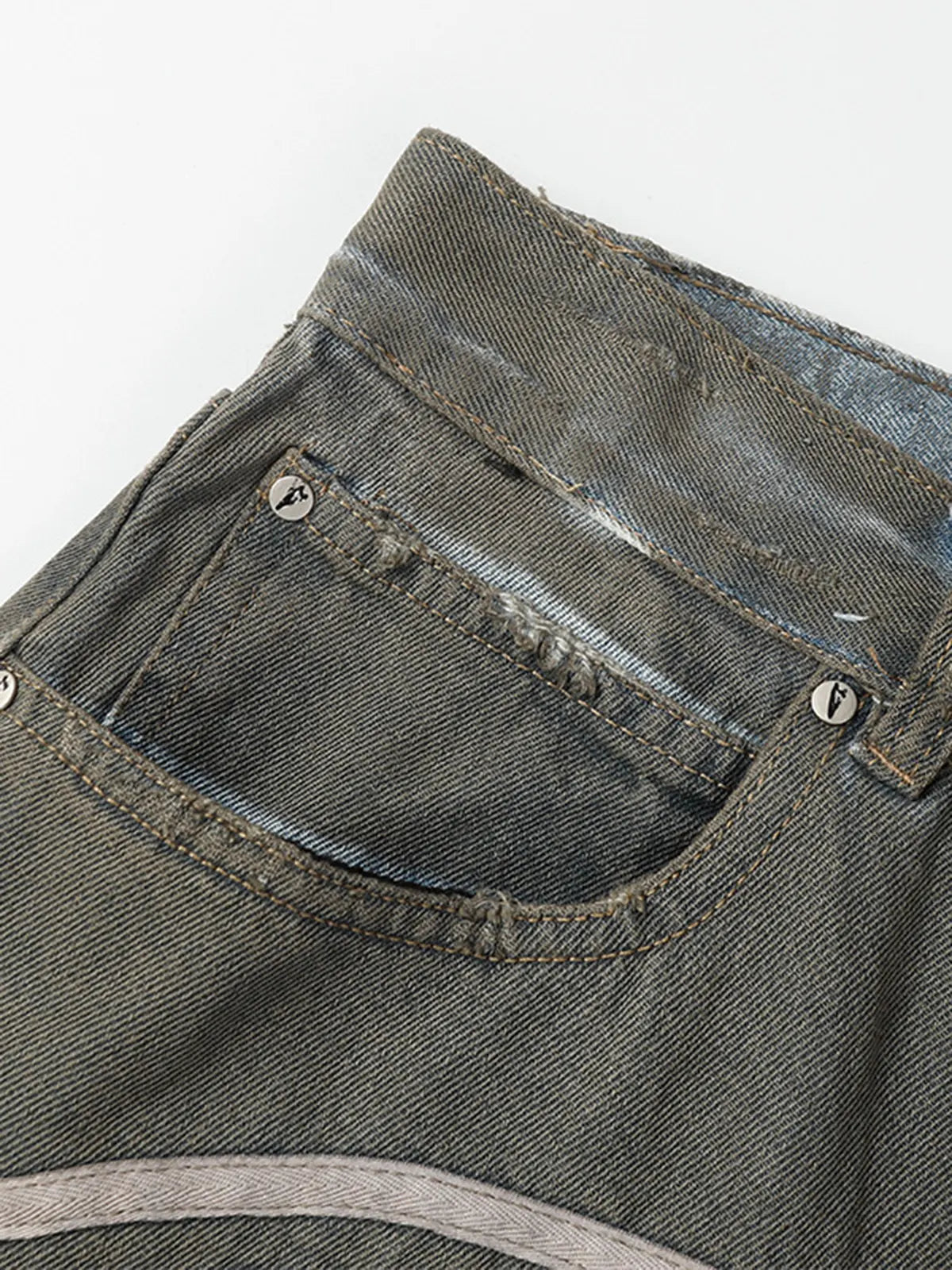 ミリタリーオリーブにウォッシュドダイ加工を施したコットンデニムに、前面にパネル風に入れたアーチ状ホワイトストライプがアクセント。両膝の大胆なダメージと切りっぱなしの裾がヴィンテージ感を高め、ウエストはベルトループ+ボタンフライ仕様でクラシックな装いをキープ。ヒップから膝まで直線的に落ちるストレートシルエットが、ゆったりしながらも野暮ったさを抑えたモダンな印象を与えます。
