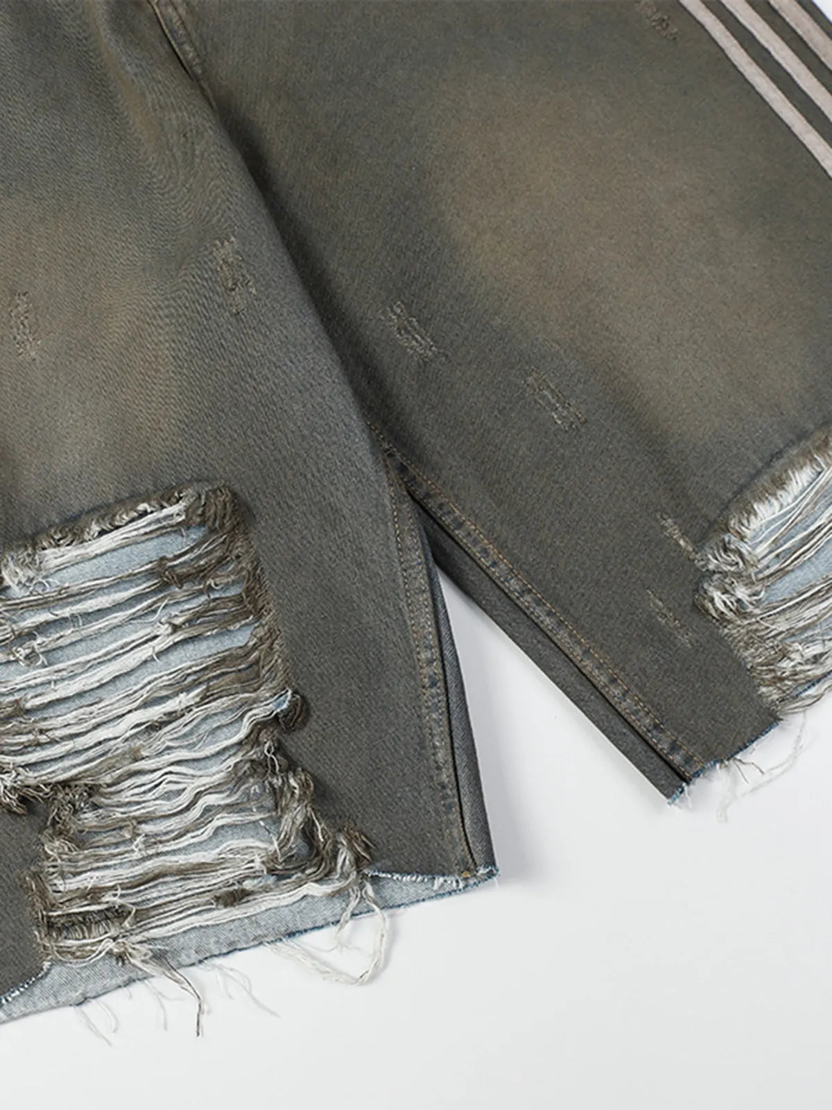 アーチ状のホワイトストライプと大胆なダメージ加工が映える、ルーズストレートシルエットの五分丈デニムショーツ。