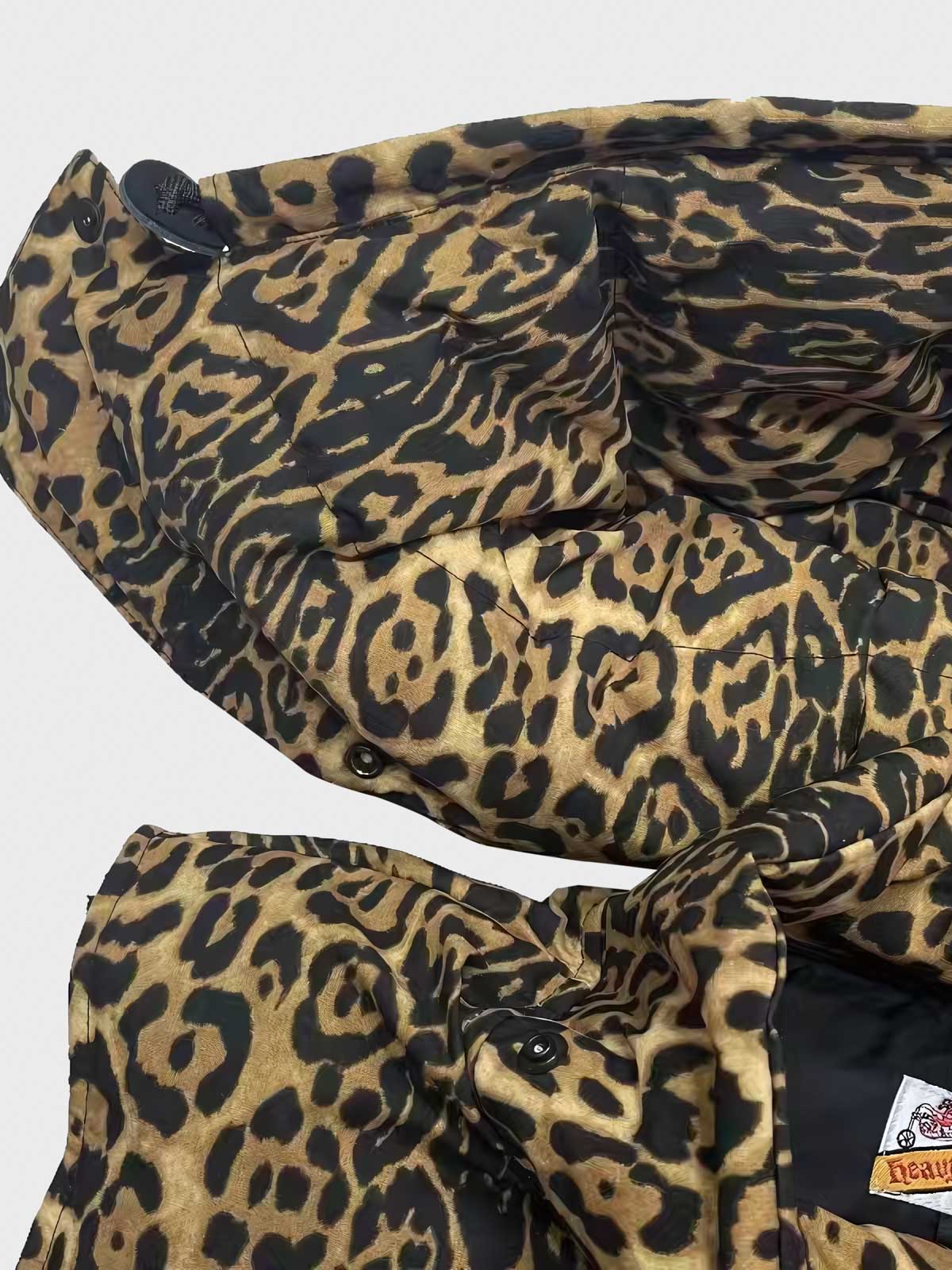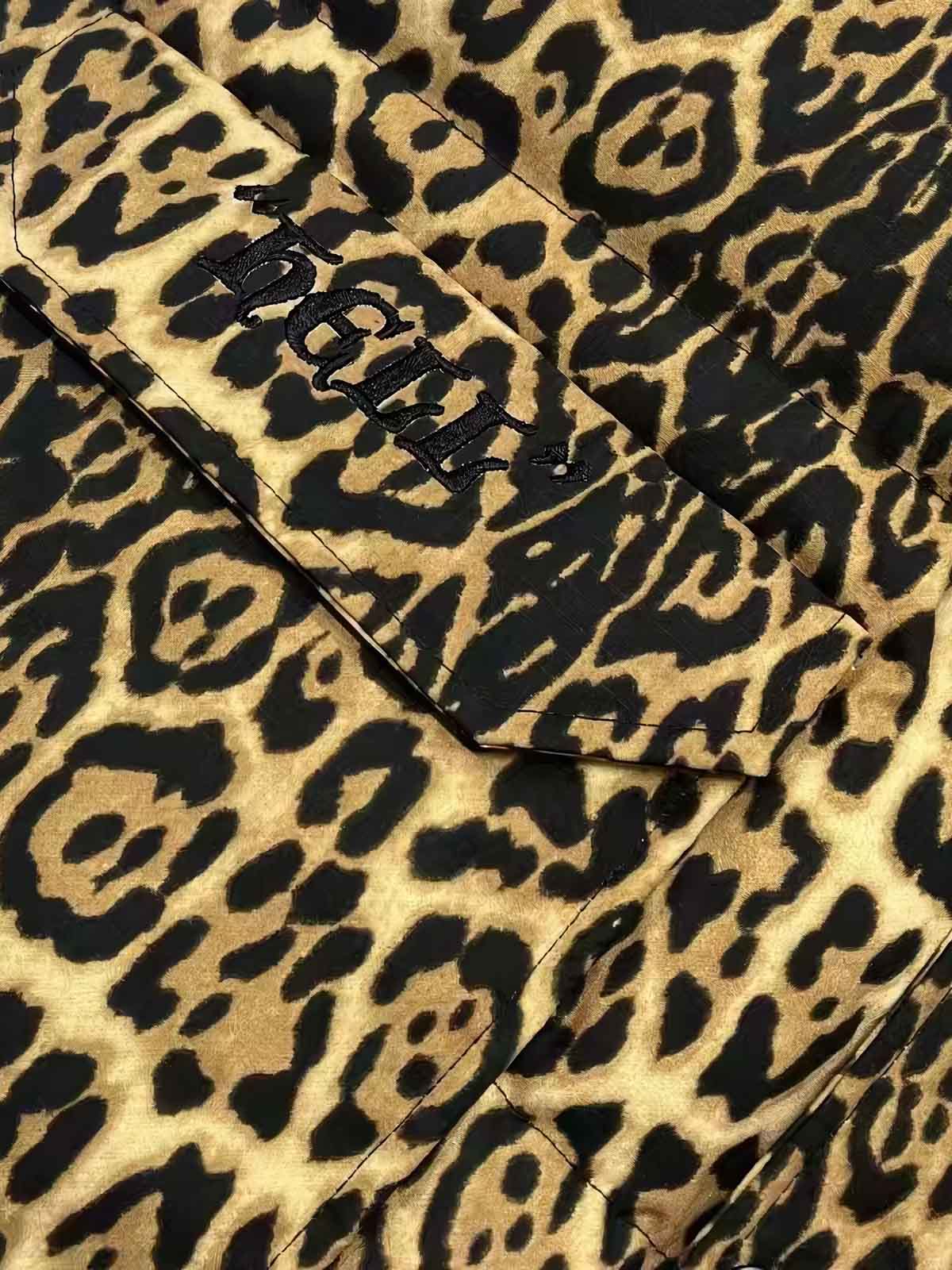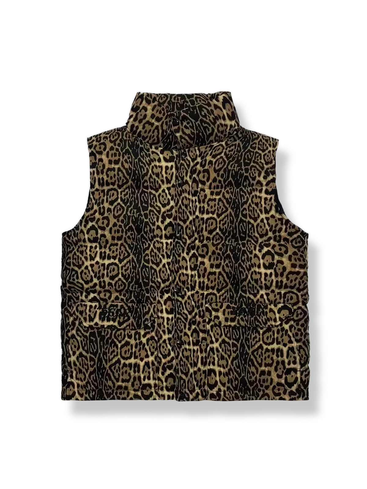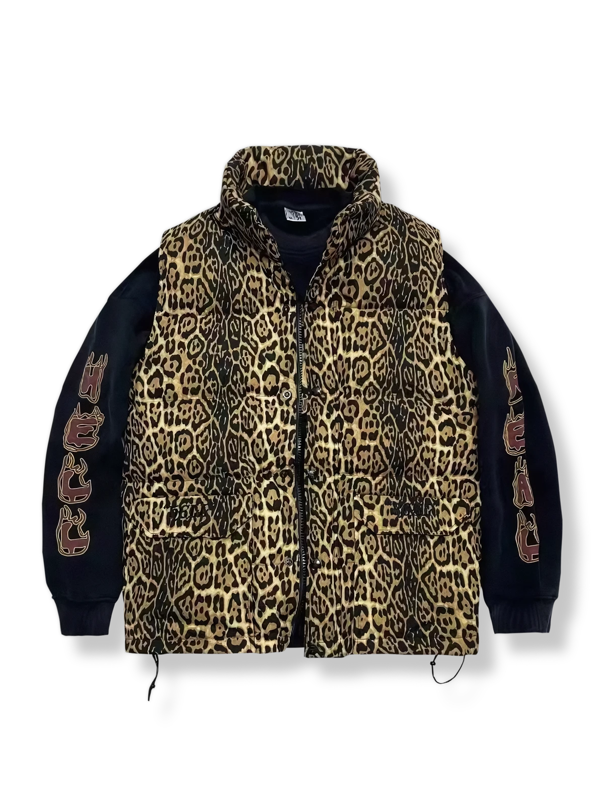 このダウンベストは、バイクウェアの精神を取り入れ、アウトドアウェアの実用性と組み合わせています。レオパード柄は、力と野性の象徴として、長い間人気のある要素です。このデザインは、クラシックなバイクウェアの堅牢なラインを取り入れつつ、現代ファッションの大胆な試みとして、耐久性と保温性を高めるための耐裂性ファブリックを使用しています。