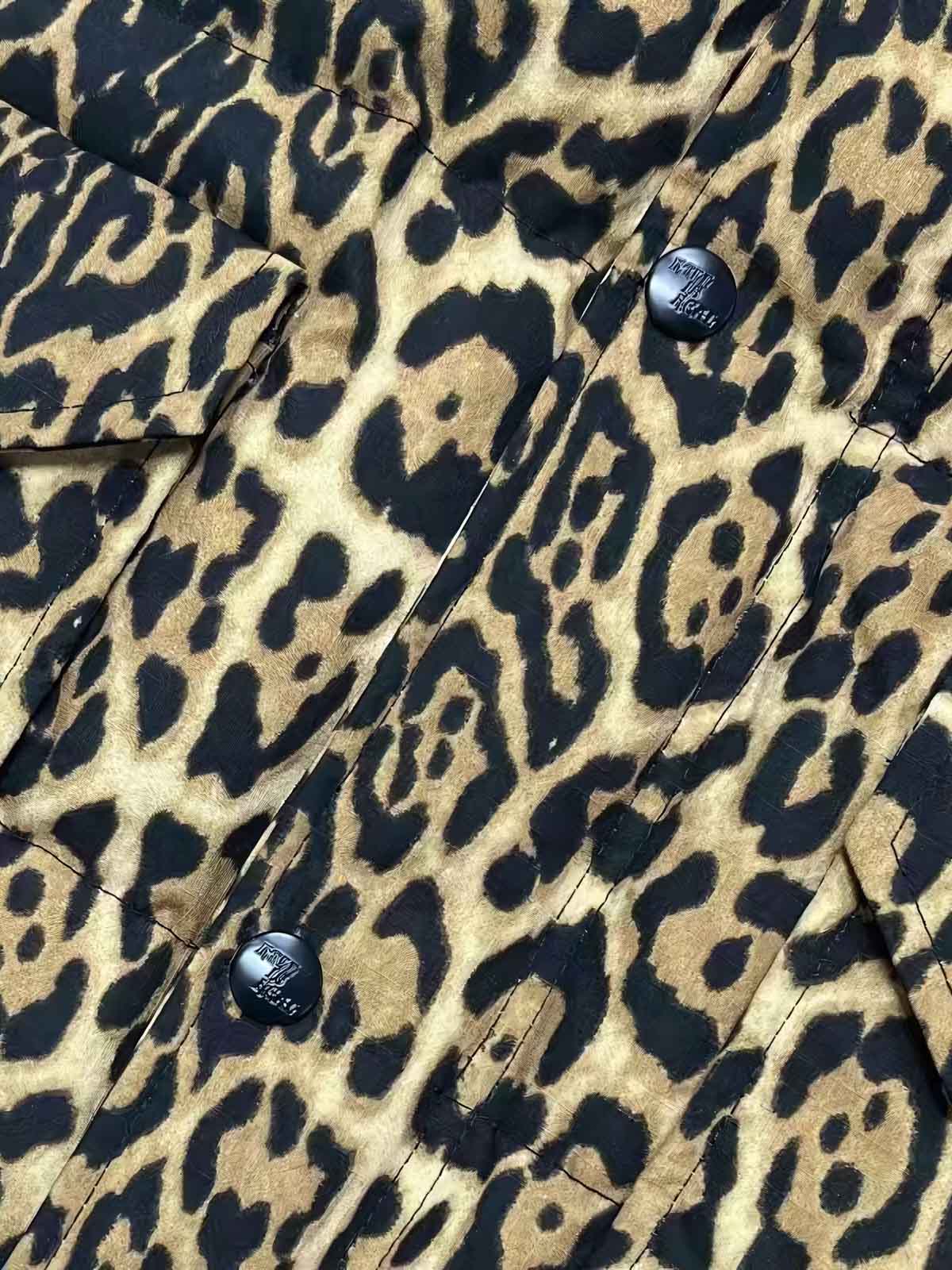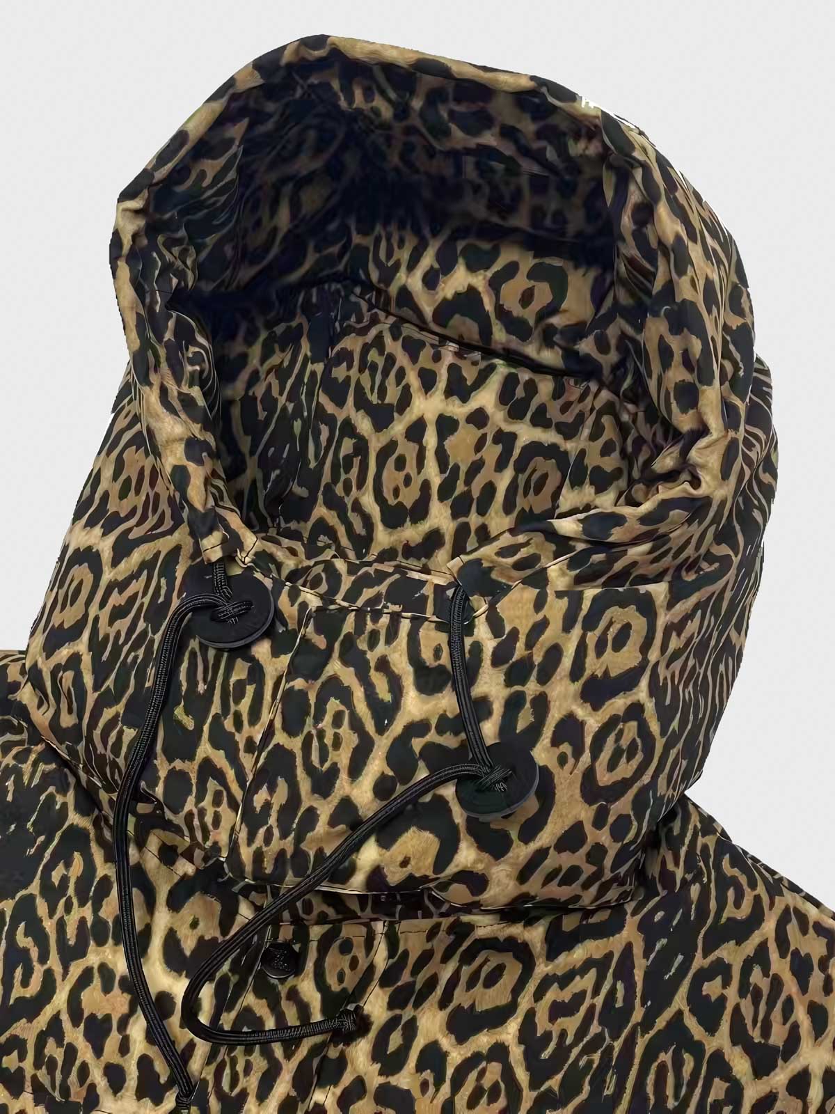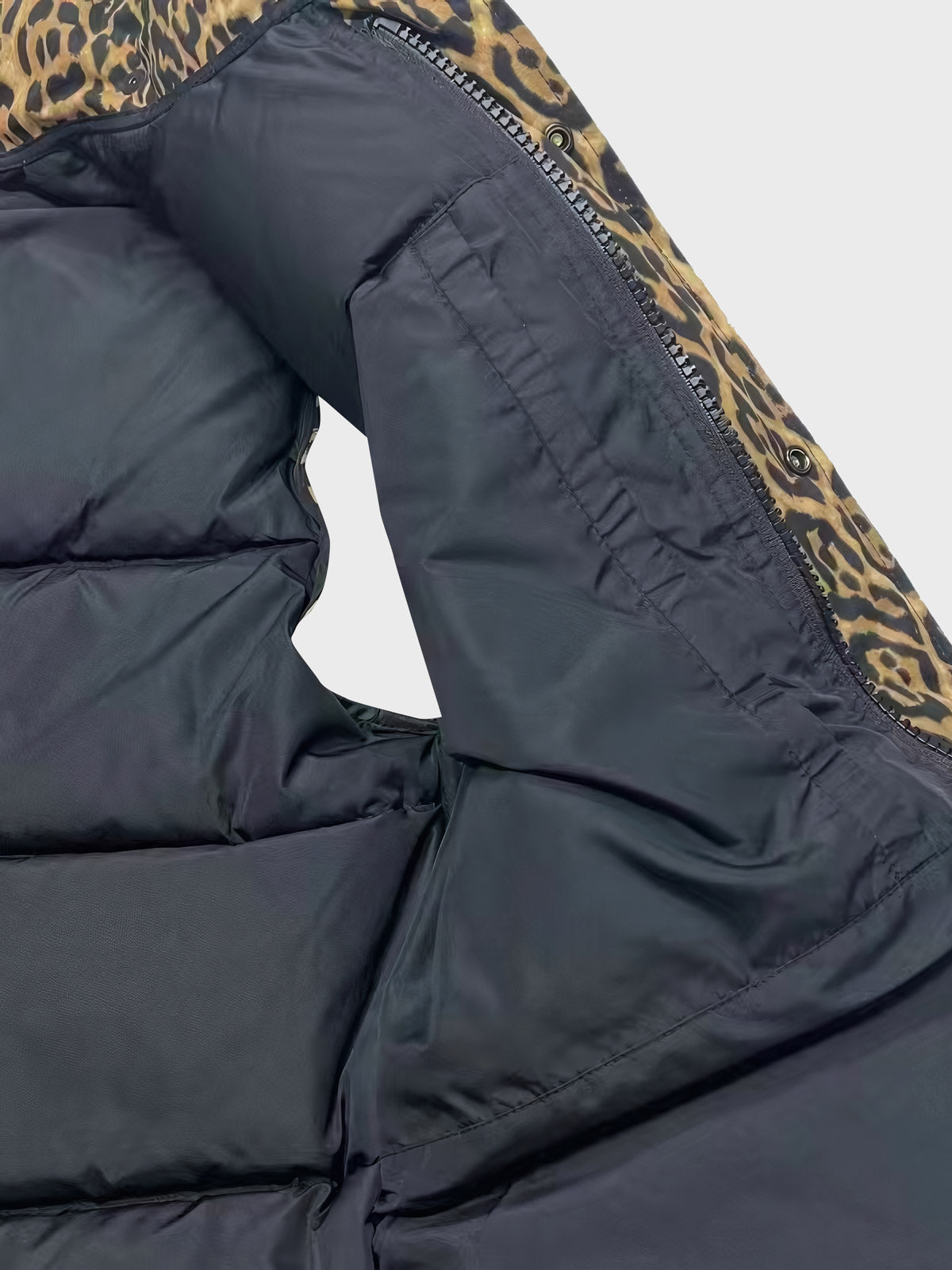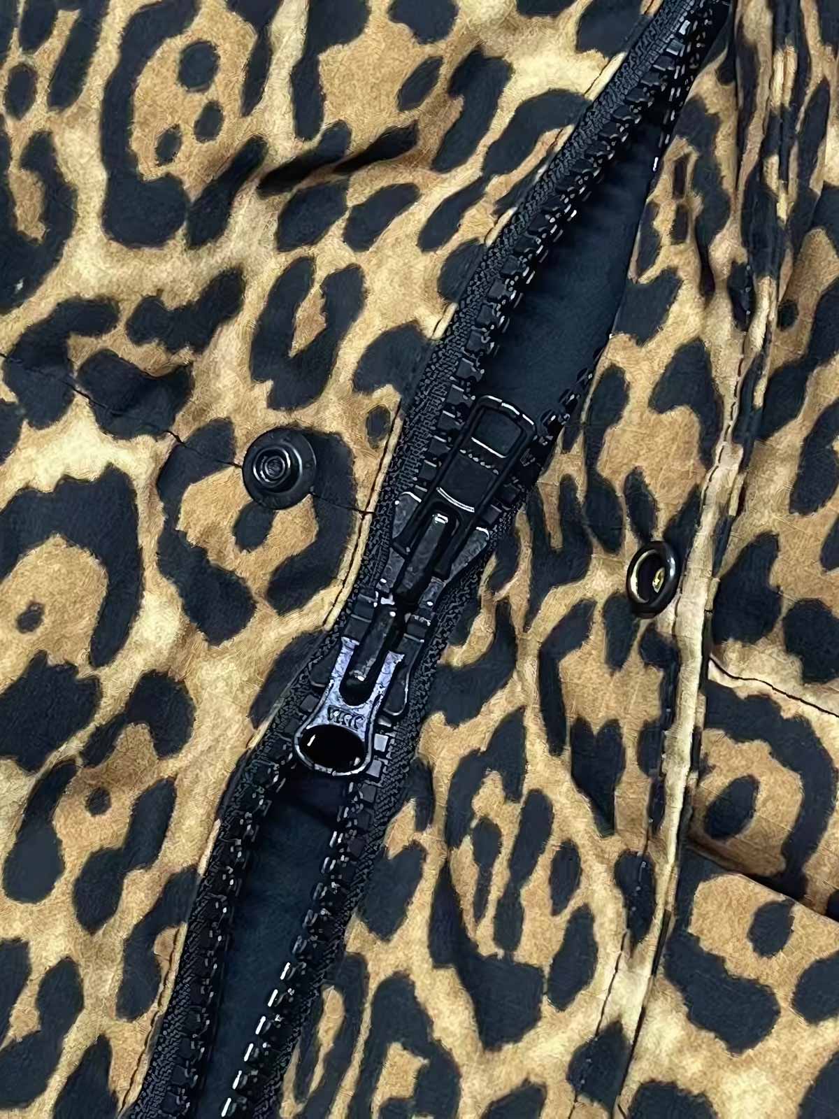 高品質のダウンで充填され、優れた保温効果を確保しています。外層の耐裂性ファブリックは、ウェアの耐久性を強化し、レオパード柄の使用は視覚的にインパクトを与えます。