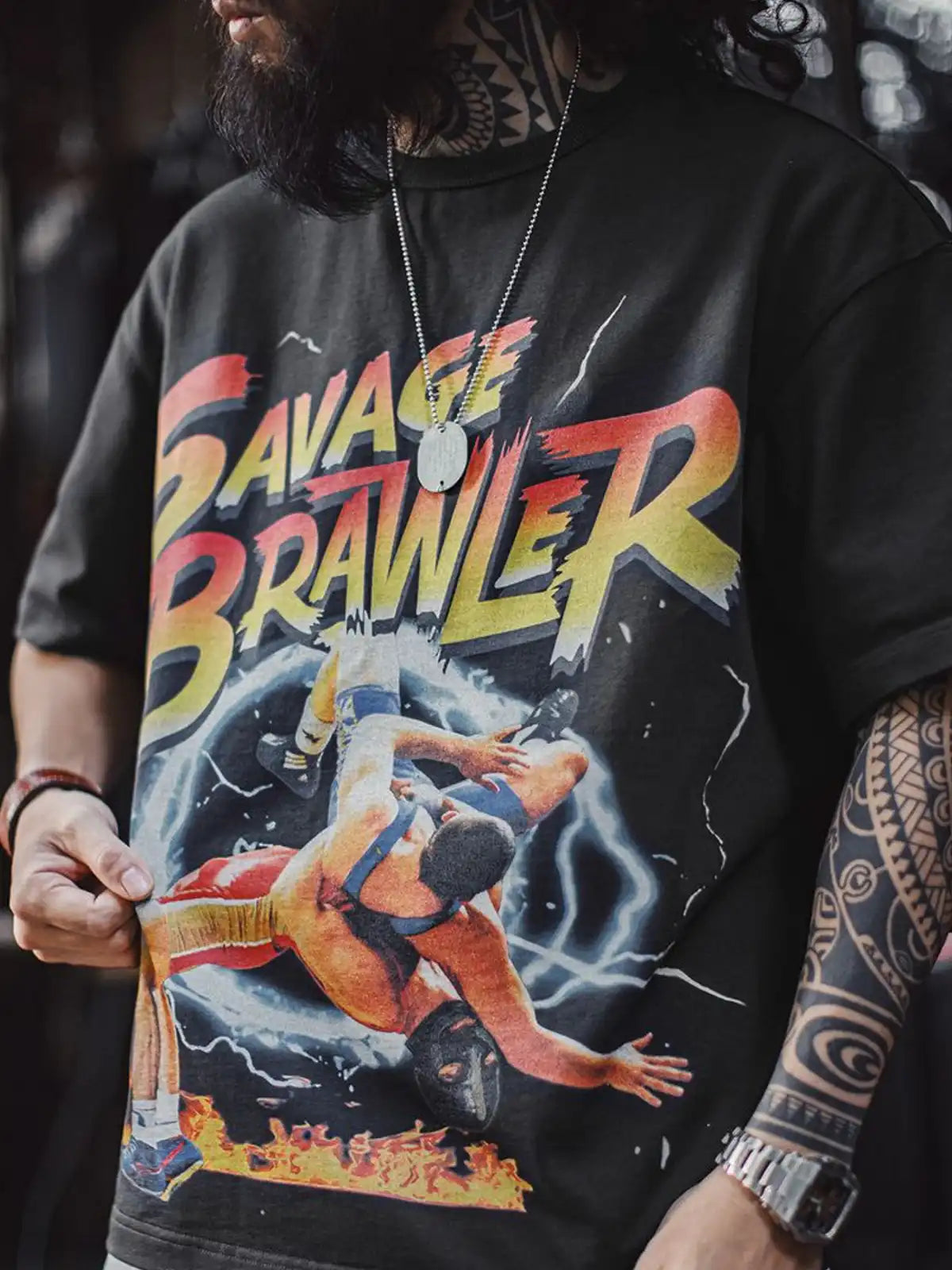 このTシャツは、メキシコレスリングの激しい投げ技にインスパイアされたデザインが魅力。胸面に大胆なグラフィックプリントが施され、視覚的なインパクトと共に、勇猛な格闘精神を表現しています。100%コットンの生地は肌触りが良く、通気性にも優れているため、夏場のカジュアルスタイルやストリートコーデに最適。ゆったりとしたシルエットと重厚な印刷が、ヴィンテージ感を強調し、単品でも重ね着としても存在感を発揮します。