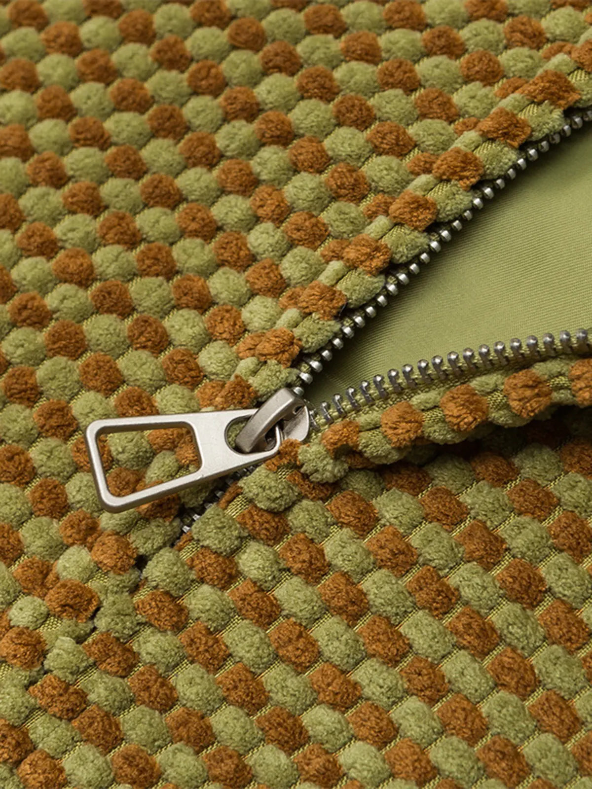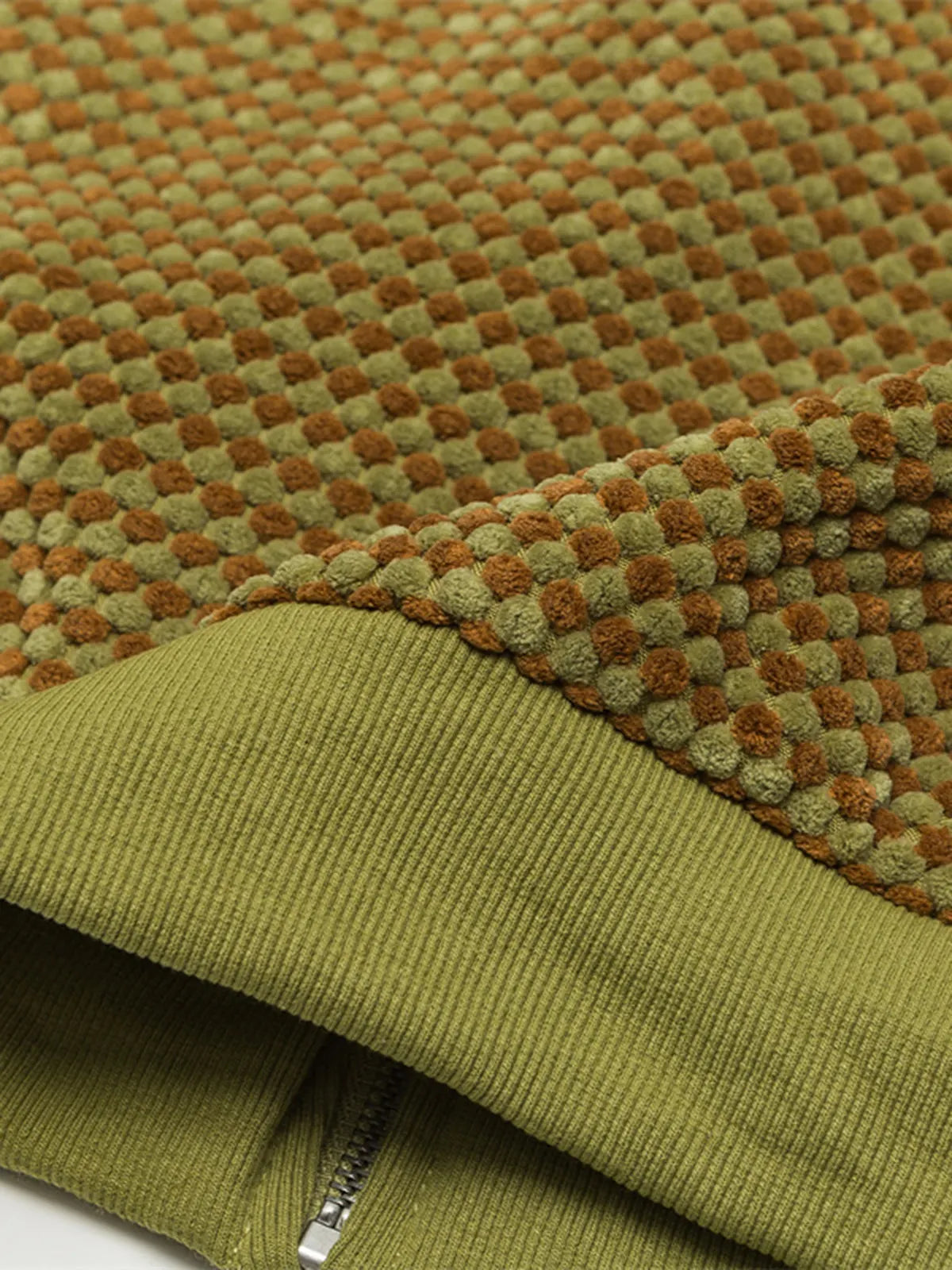 小さなグリッド柄と柔らかなスウェード素材を融合したフーディジャケットは、レトロな雰囲気と快適な着心地を兼ね備えたカジュアルウェアです。