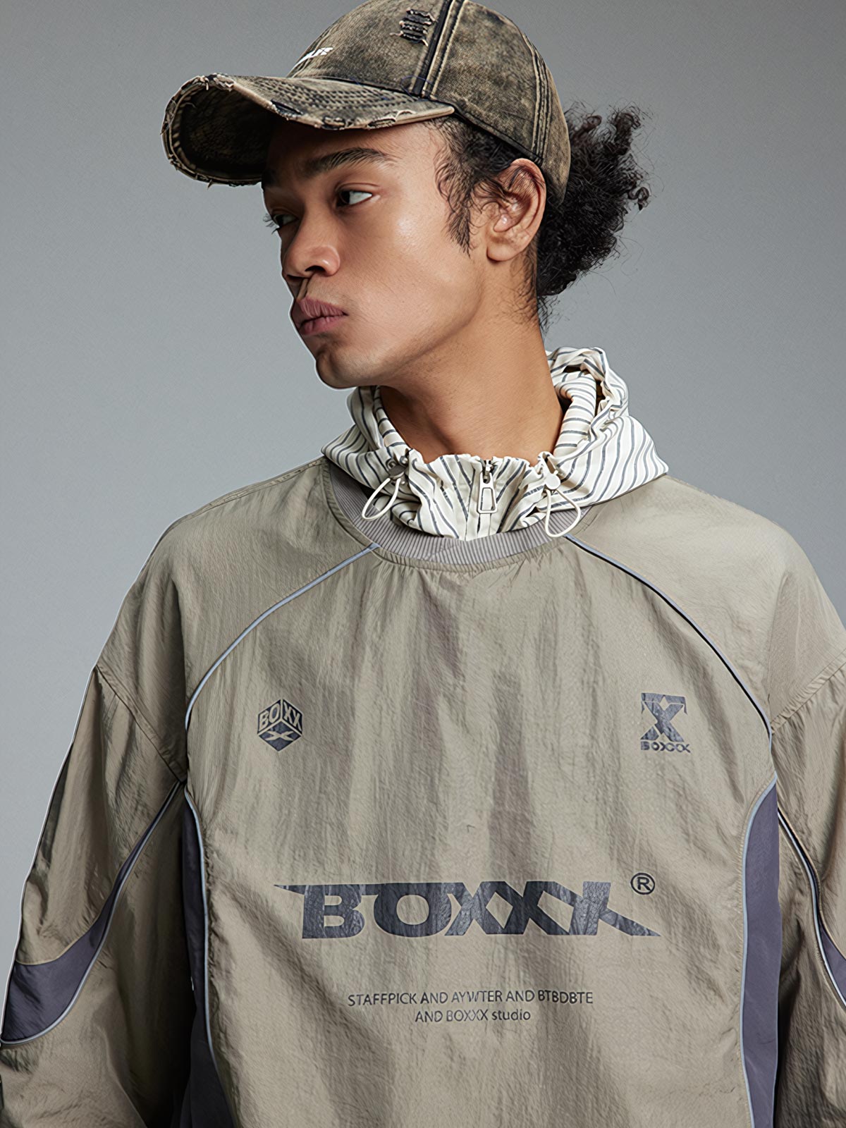 このスウェットは、スポーツカジュアルと現代都市の要素を組み合わせたデザインで、特に袖と肩に追加されたリフレクティブストライプが機能性とファッション性を高めています。また、フーディ上のプリントデザインと色の組み合わせも都市的なファッションスタイルを演出しています。