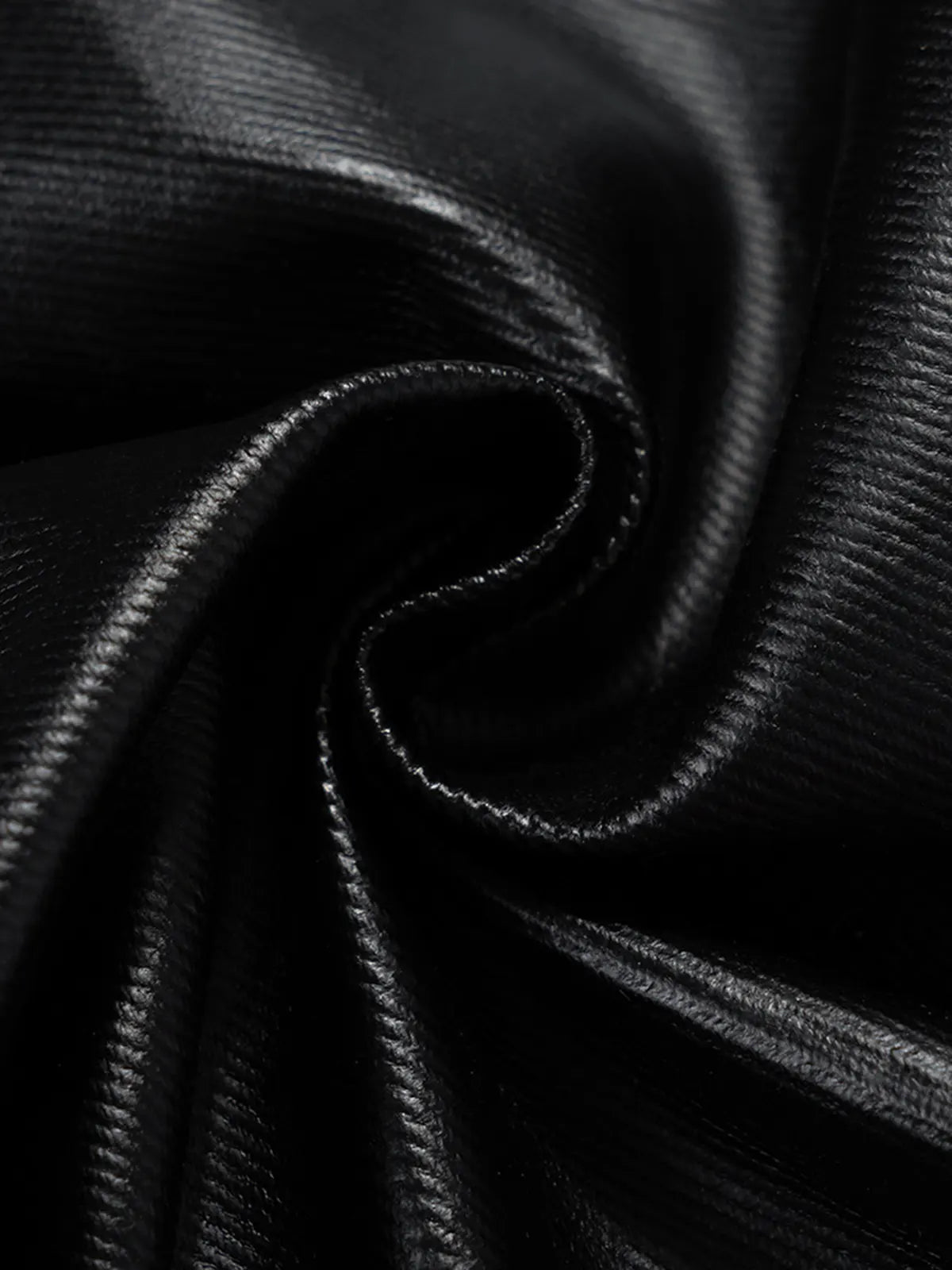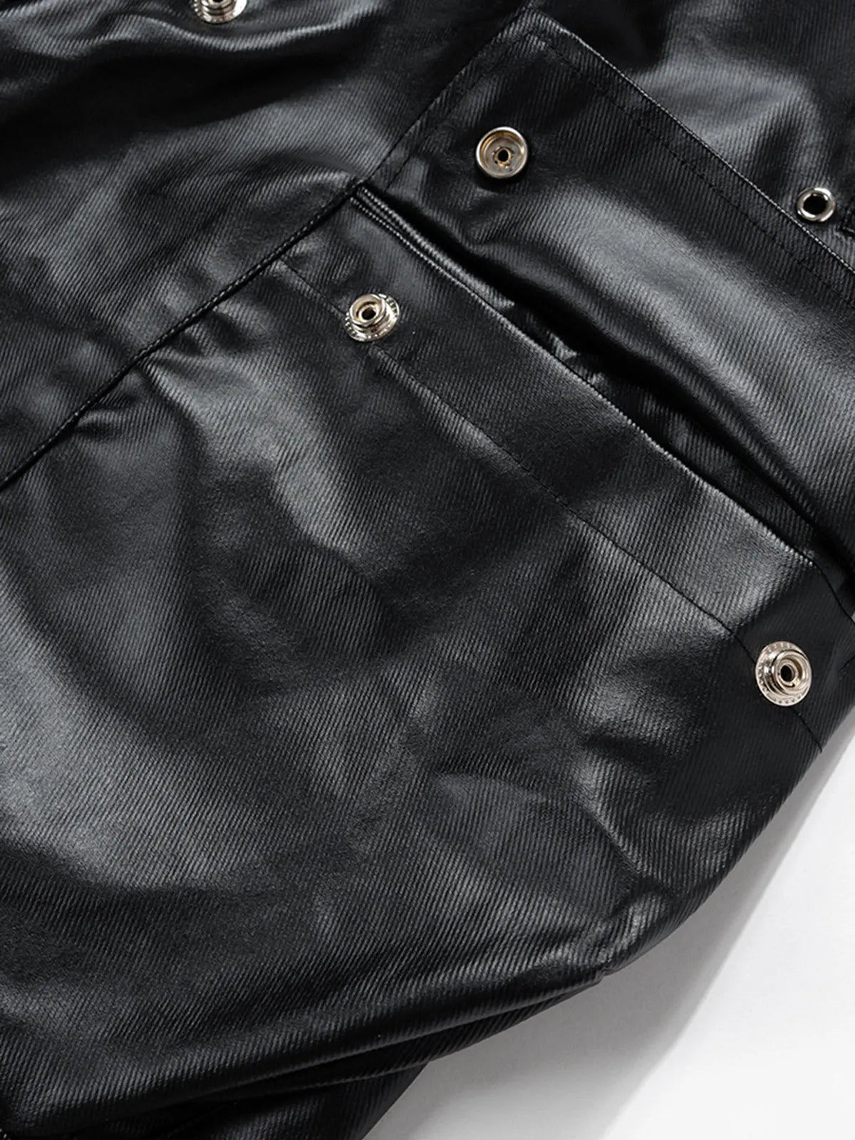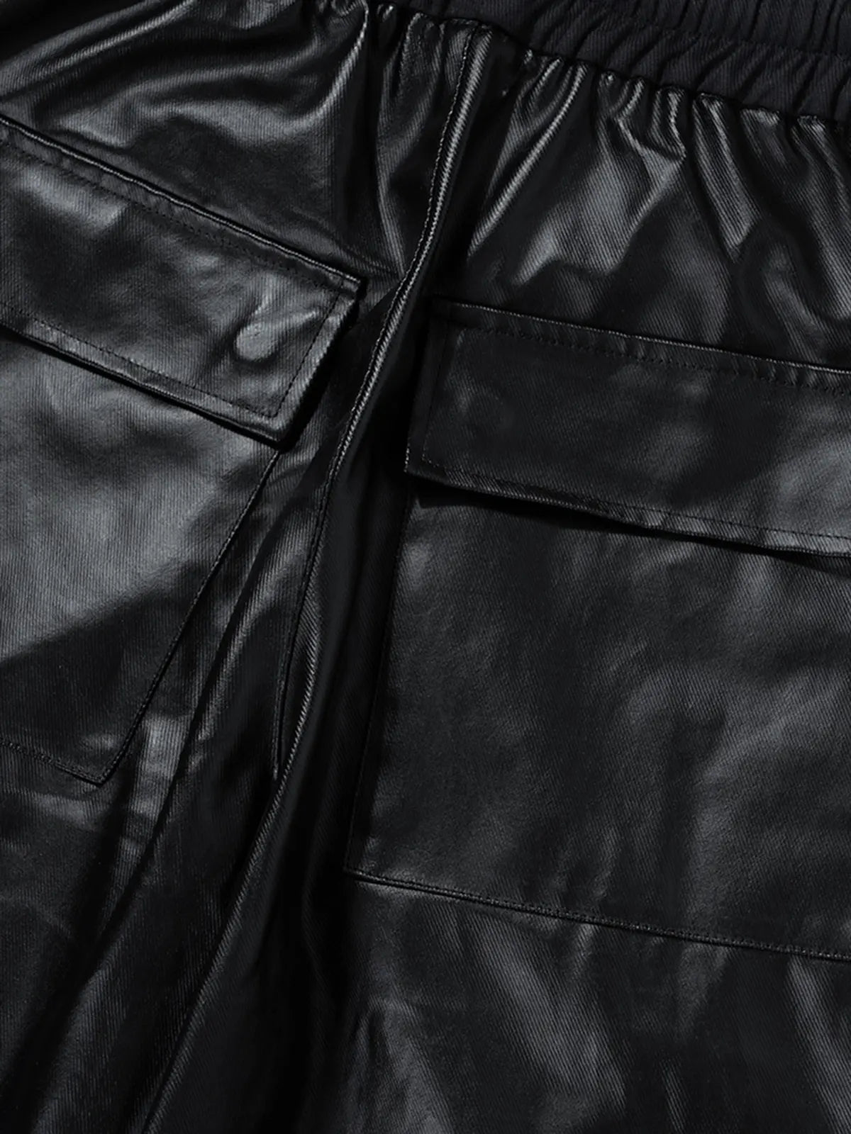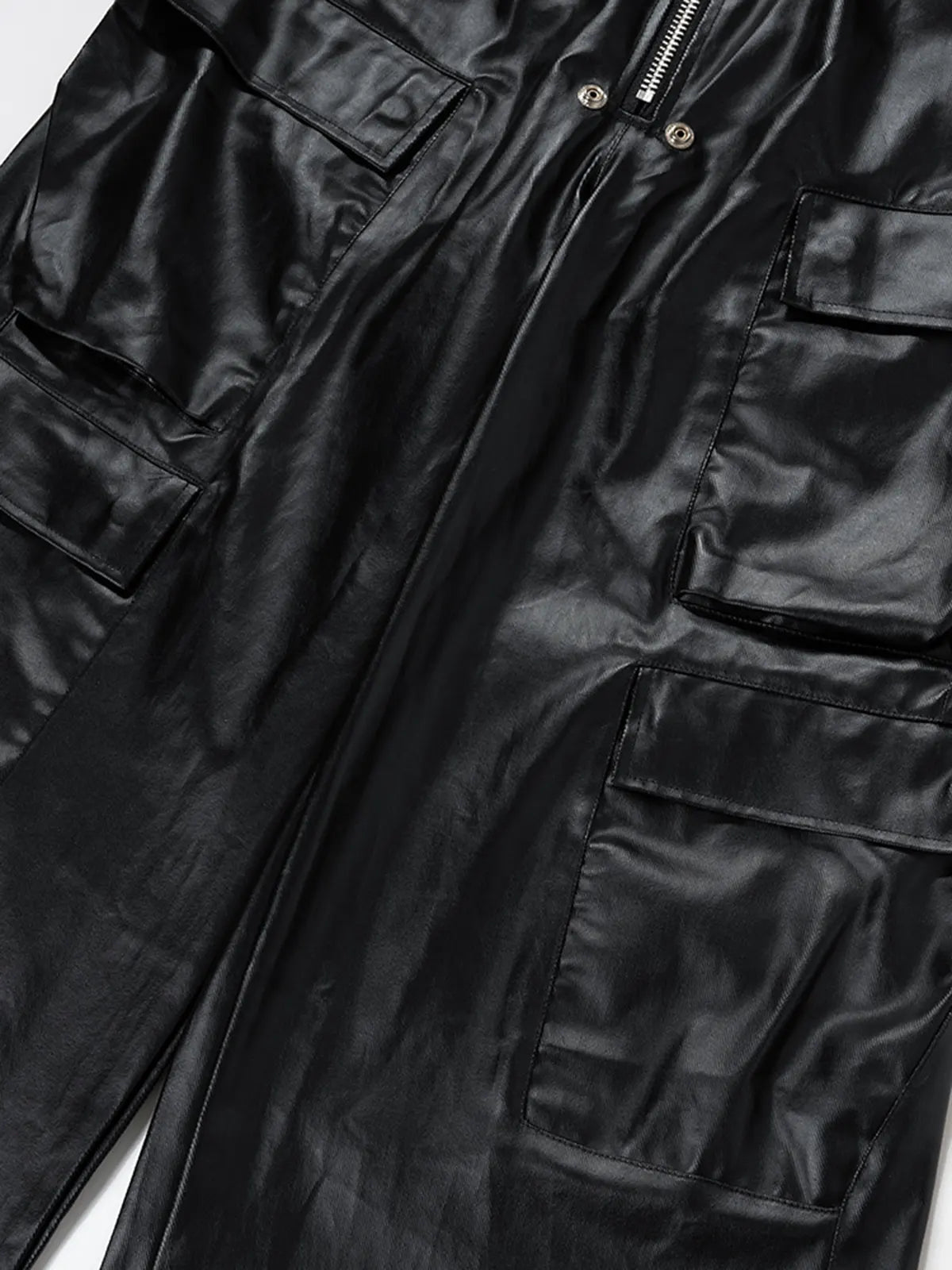 フェイクレザーパネルと立体ポケットが際立つ、ベルボトムシルエットのミリタリーワイドパンツ。