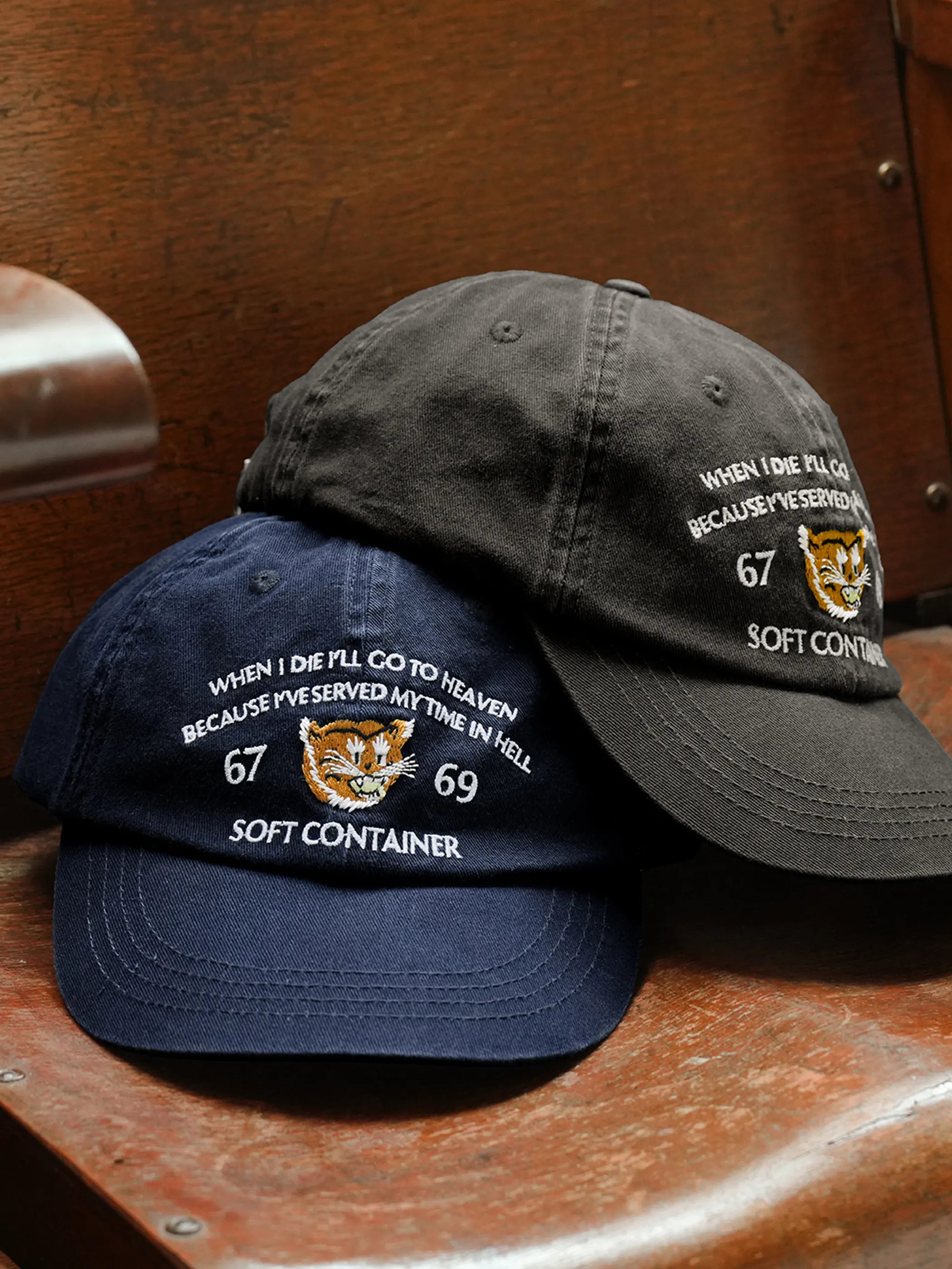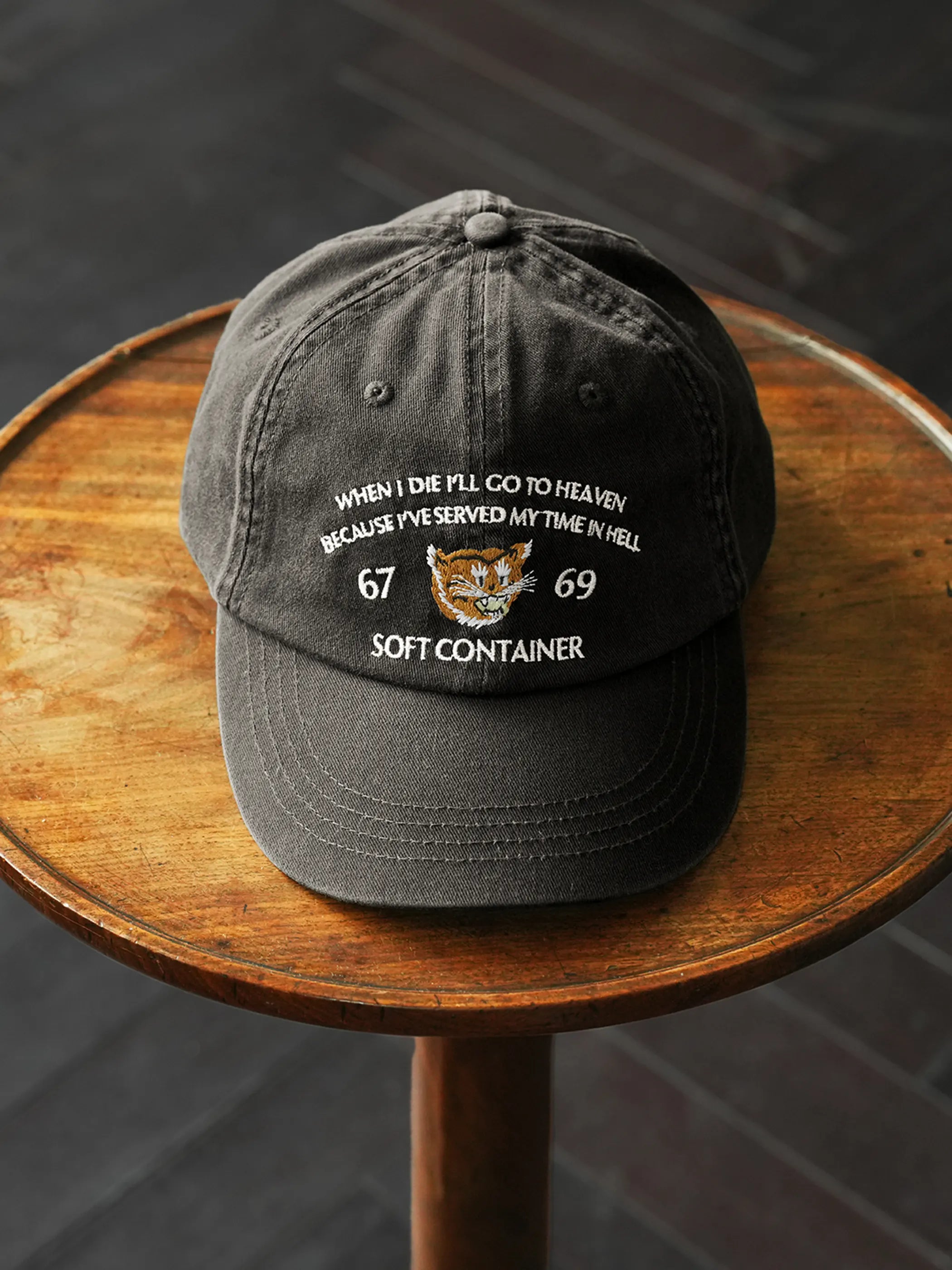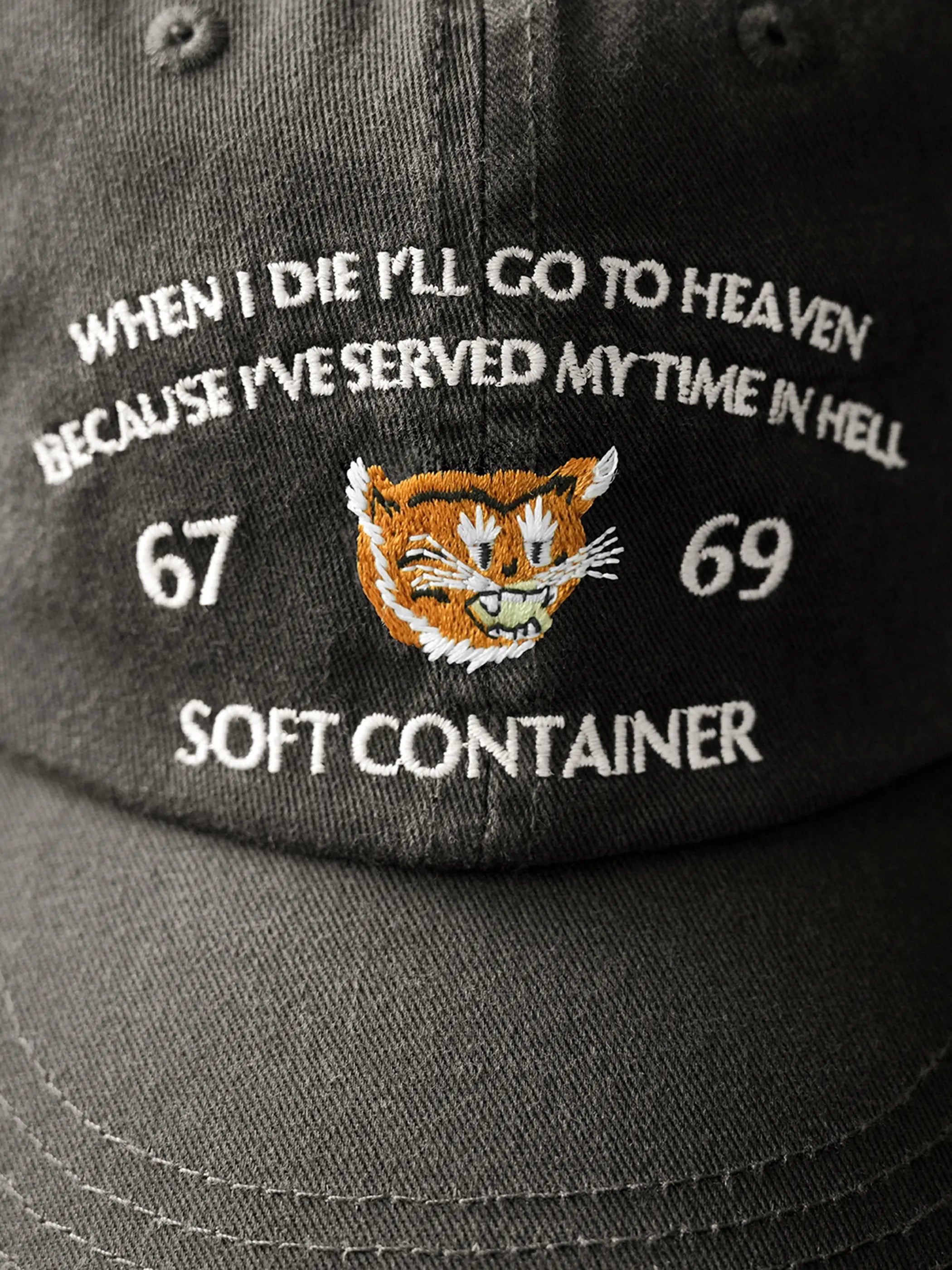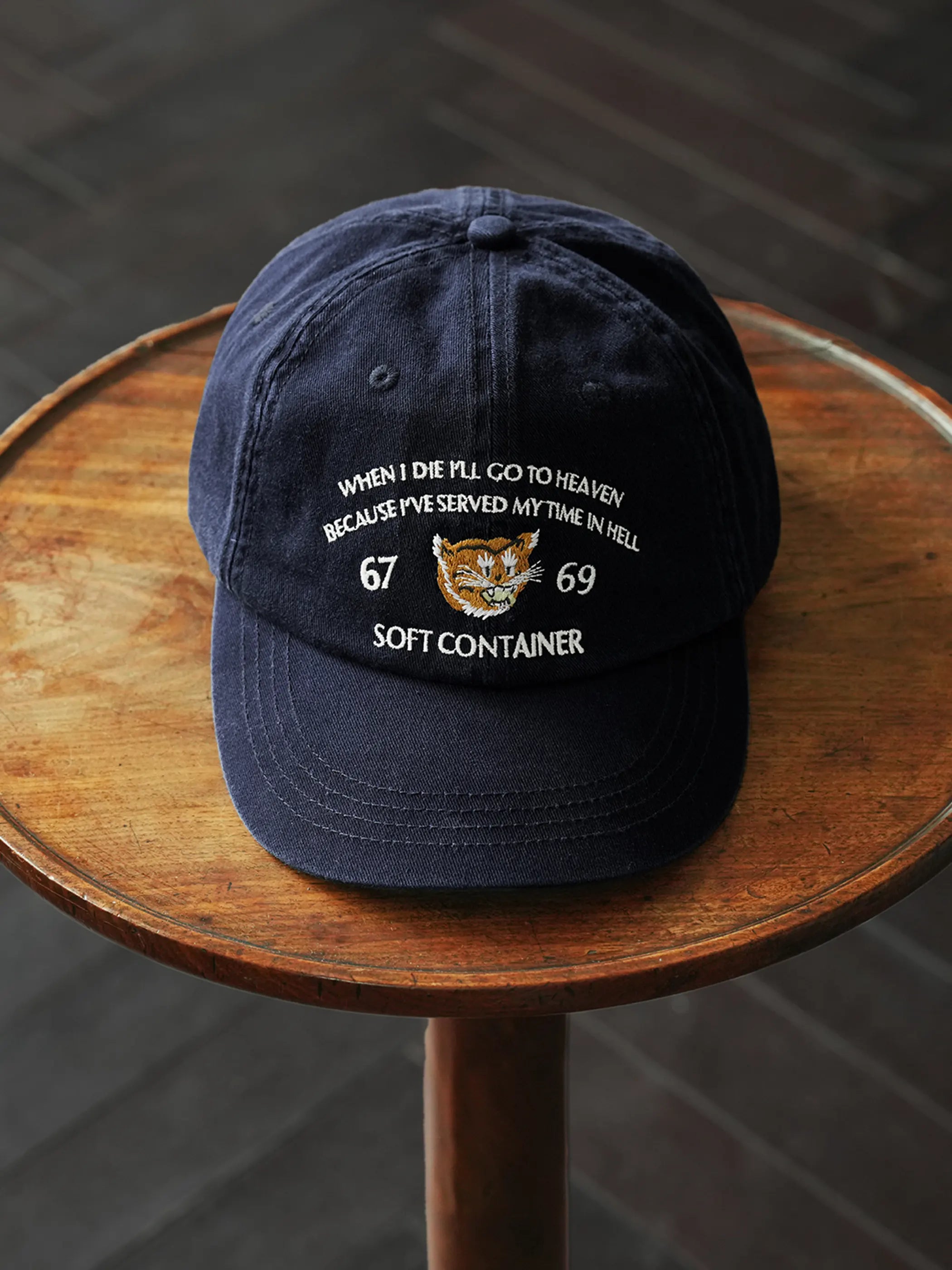 60年代米軍の戦地ジャケットに見られる洗い加工とツイル素材の組み合わせは、適度なエイジング感をもたらしながらも日常使いに耐える堅牢さを備えています。前面に配した「WHEN I DIE I’LL GO TO HEAVEN…」のメッセージと虎刺繍が重厚なストーリー性を演出し、バックル調整式メタルバックルは幅広い頭囲に対応。クラシックなフォルムに加え、細部の刺繍糸色を抑えたことで、どのようなスタイリングにもすっとなじむ汎用性が魅力です。短めのつばはクラシカルな印象ながら視界を広く確保し、ミリタリーテイストのウェアやデニムジャケットと合わせれば、より男らしい表情を引き立てます。