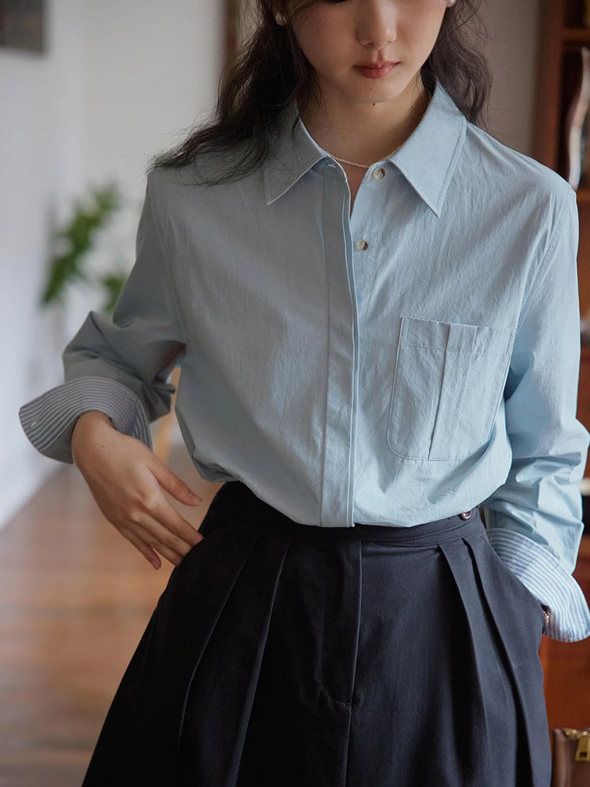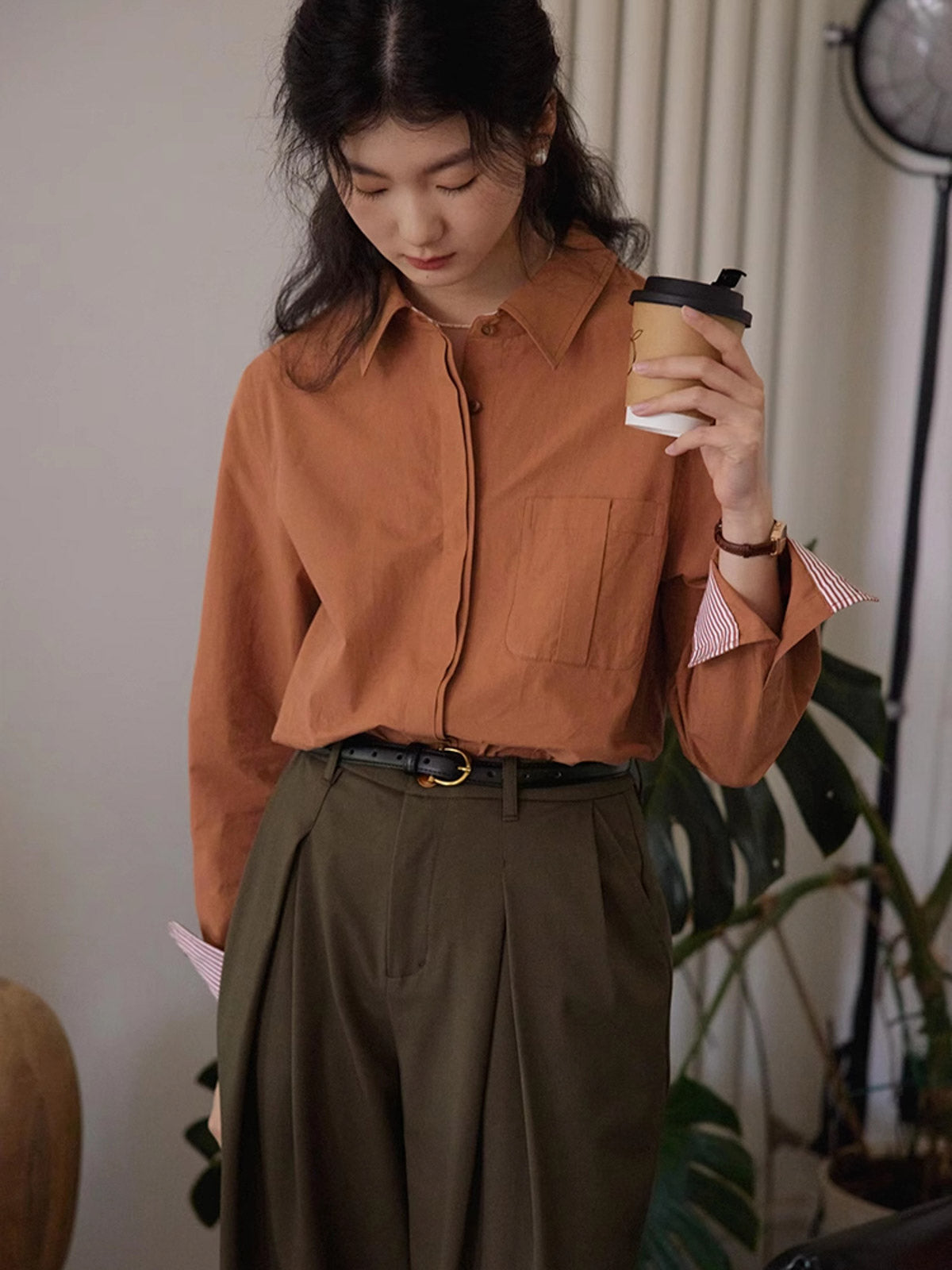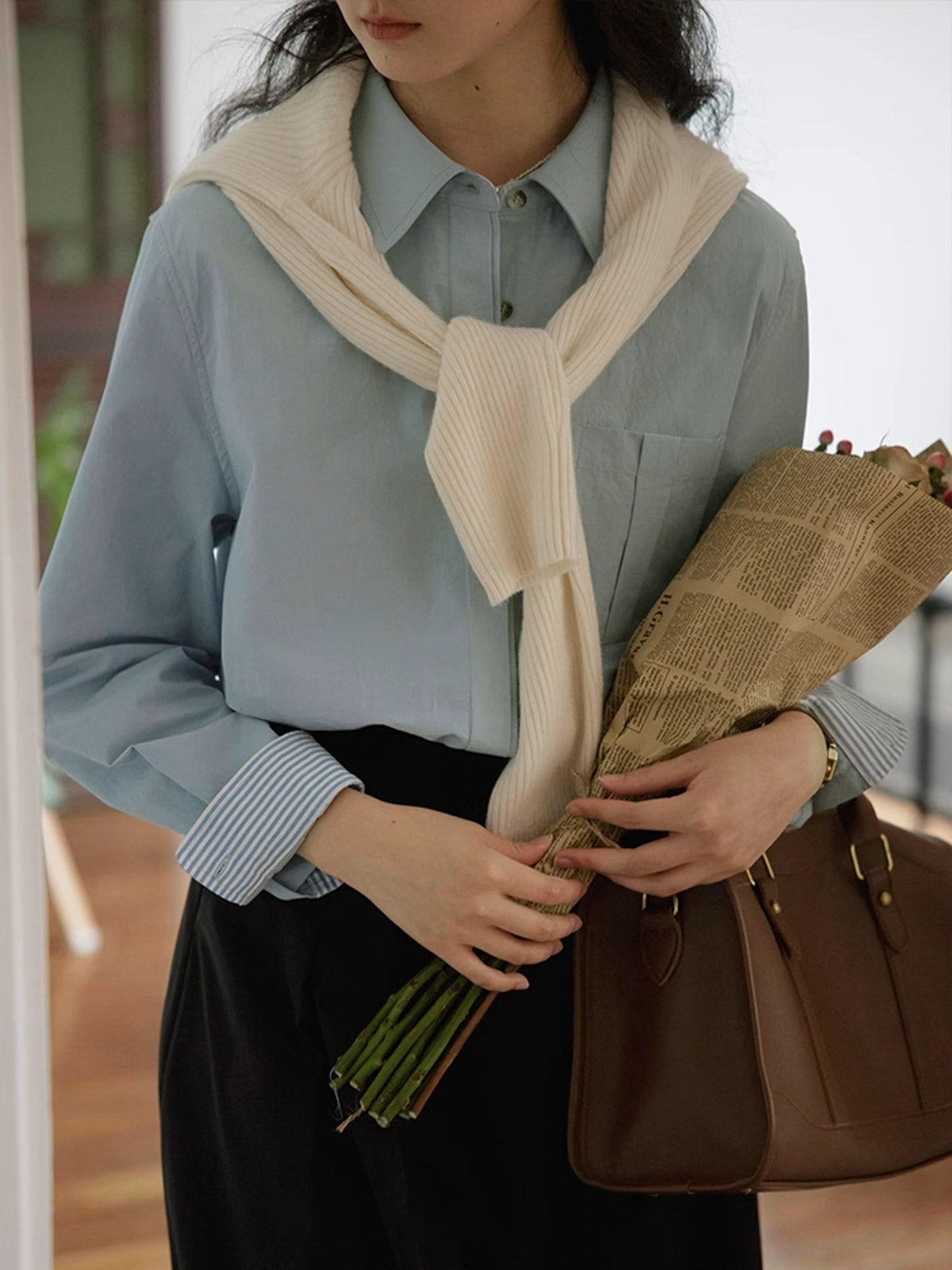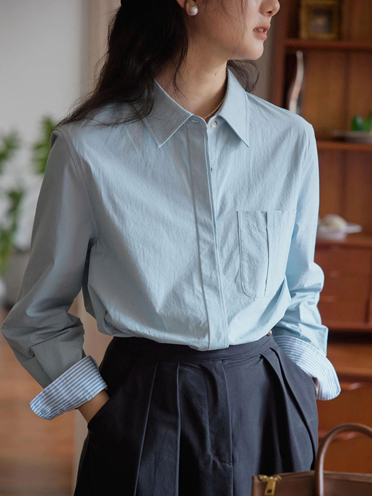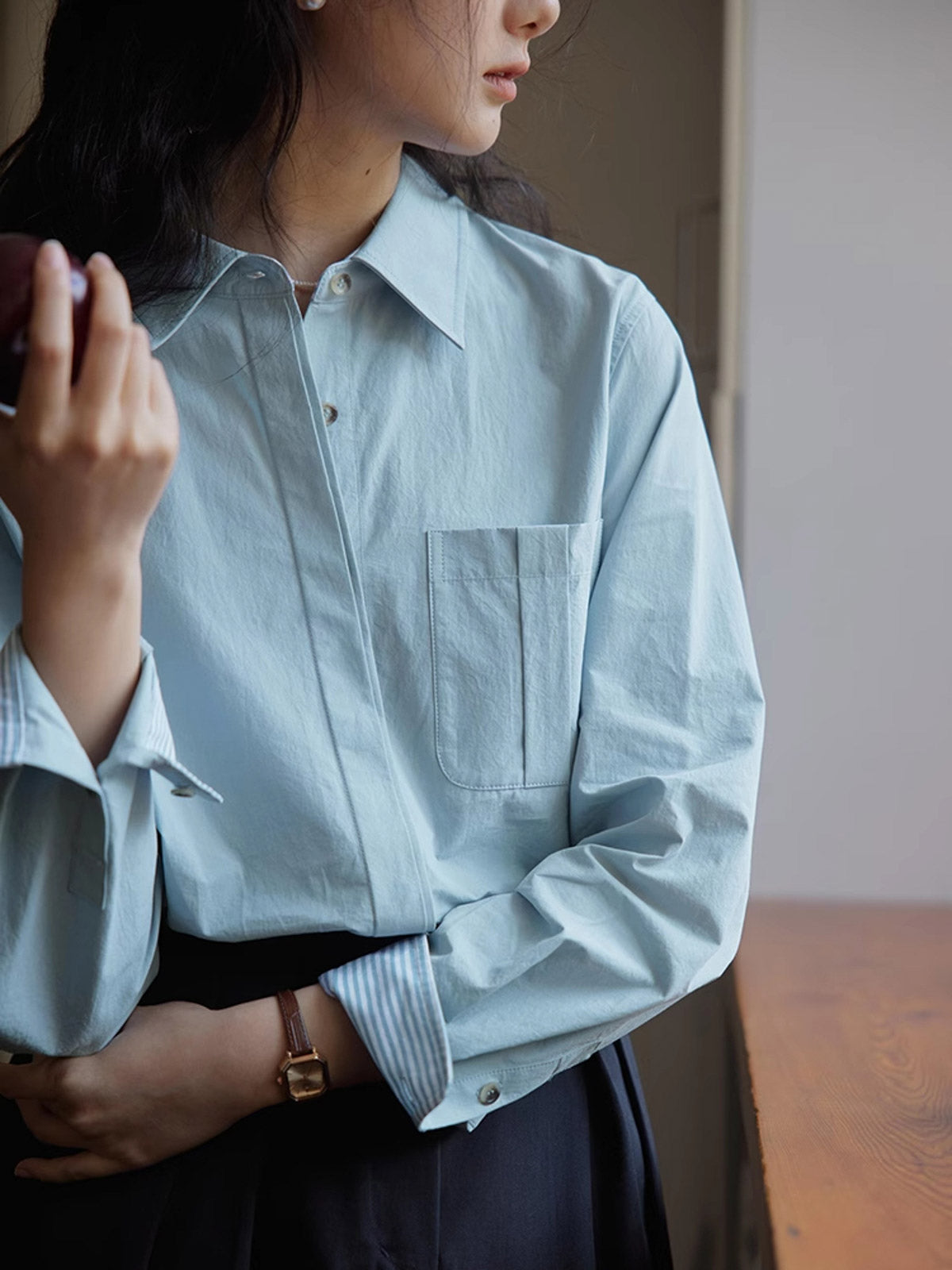 このシャツは100%コットン素材を採用し、柔らかく通気性に優れた快適な着用感を提供します。ゆったりとしたフィット感であらゆる体型に適応し、クラシックなシャツカラーが洗練された印象を与えます。胸元には特徴的な丸みを帯びたスクエアポケットがあり、デザインのアクセントとなっています。肩部分は広めに設計されており、肩のラインを美しく見せます。隠しボタンプラケットはシャツの洗練されたルックをさらに強調し、内襟と内背中のストライプデザインが独特の魅力をプラスします。