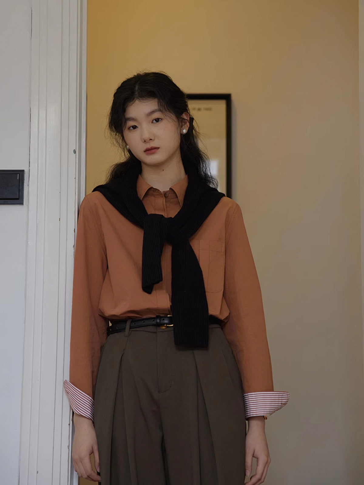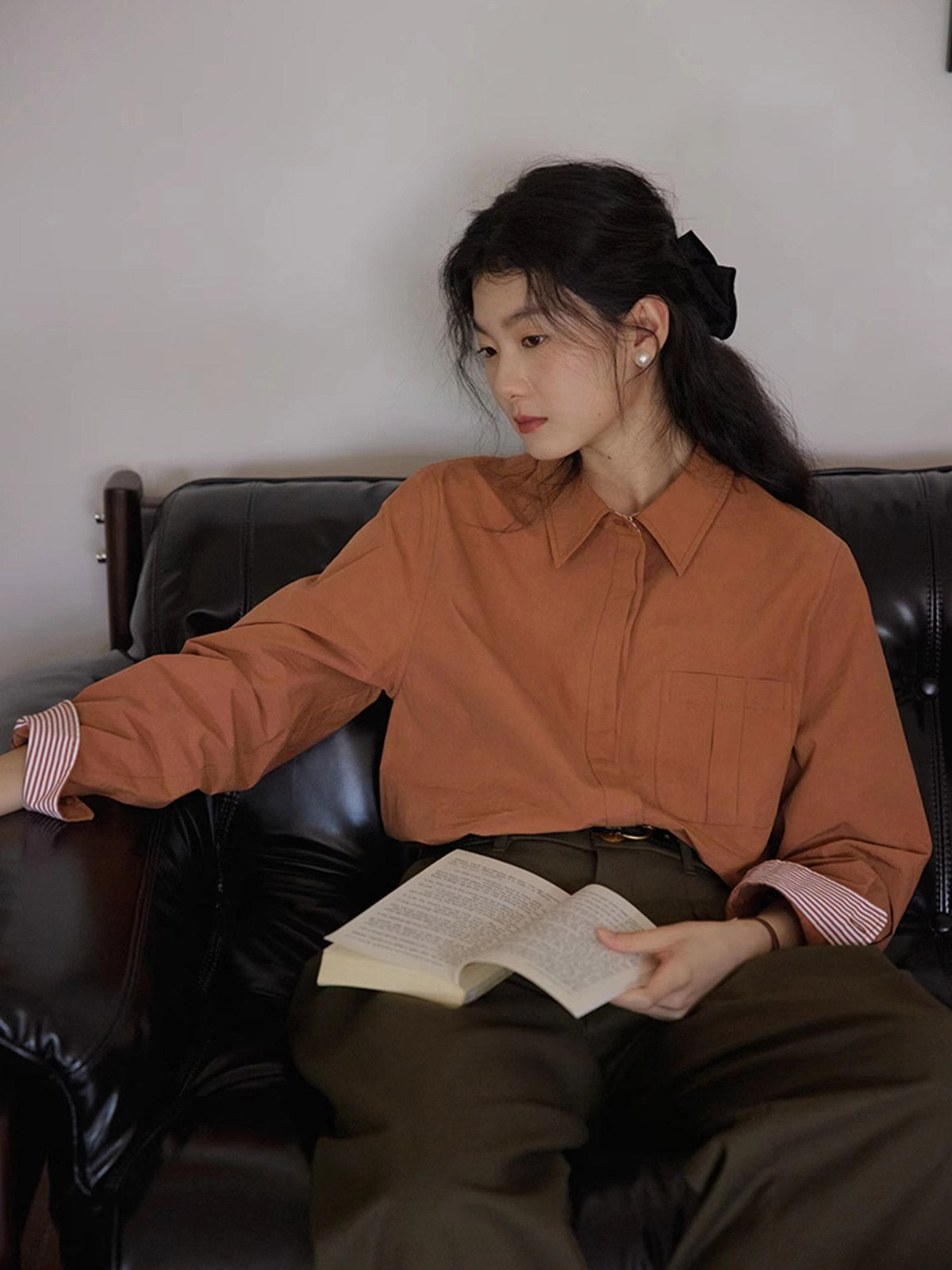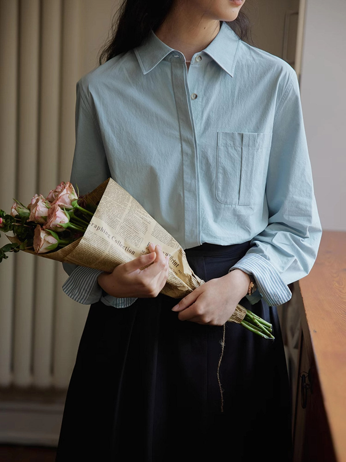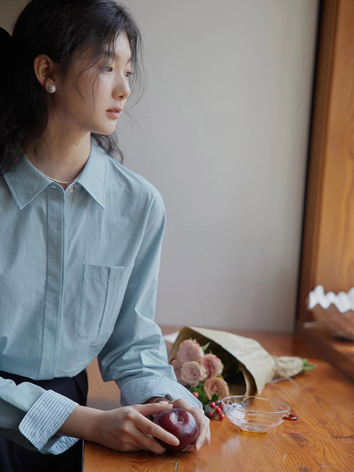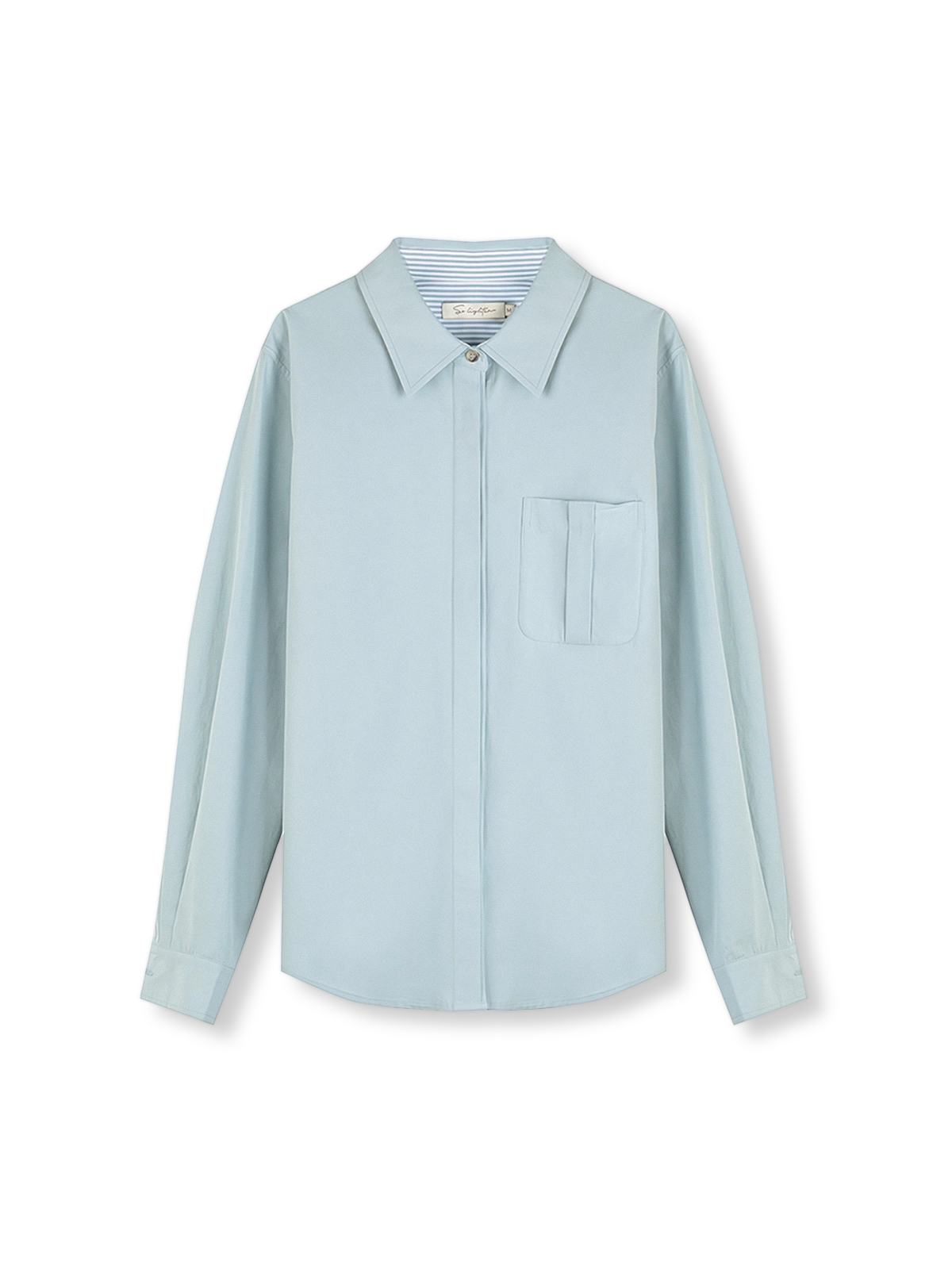 このシャツは100%コットン素材を採用し、柔らかく通気性に優れた快適な着用感を提供します。ゆったりとしたフィット感であらゆる体型に適応し、クラシックなシャツカラーが洗練された印象を与えます。胸元には特徴的な丸みを帯びたスクエアポケットがあり、デザインのアクセントとなっています。肩部分は広めに設計されており、肩のラインを美しく見せます。隠しボタンプラケットはシャツの洗練されたルックをさらに強調し、内襟と内背中のストライプデザインが独特の魅力をプラスします。