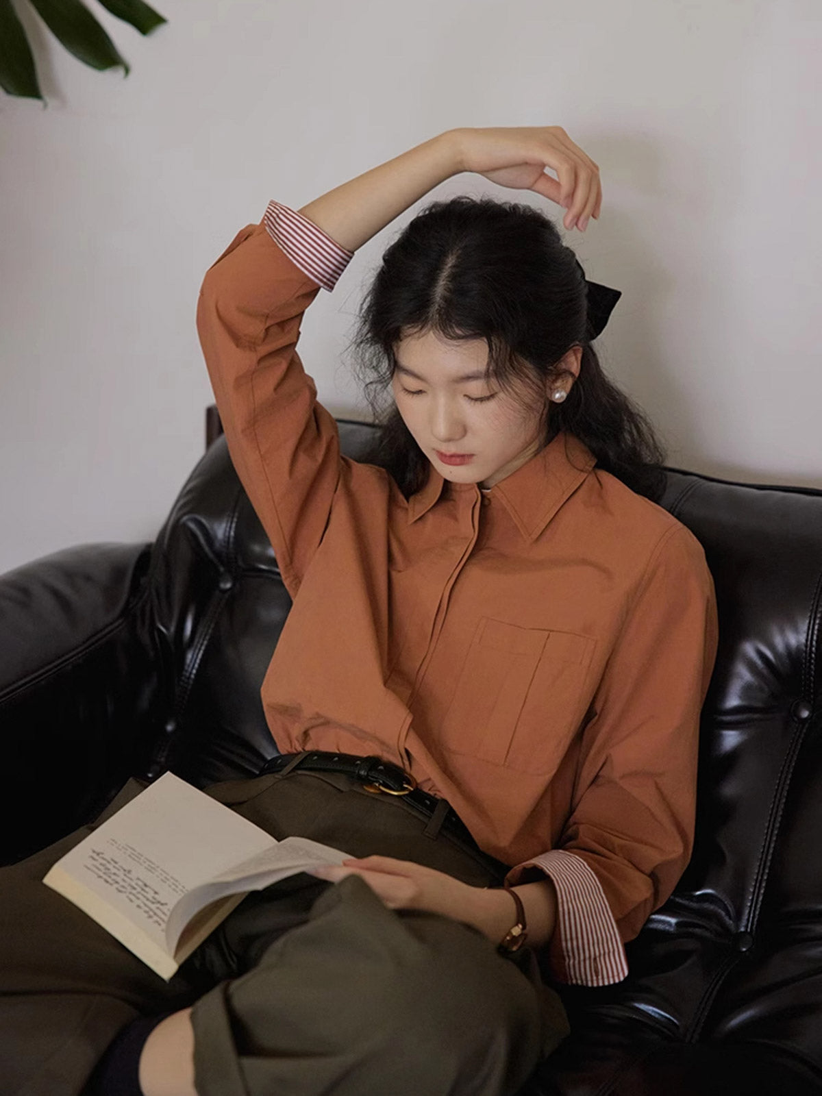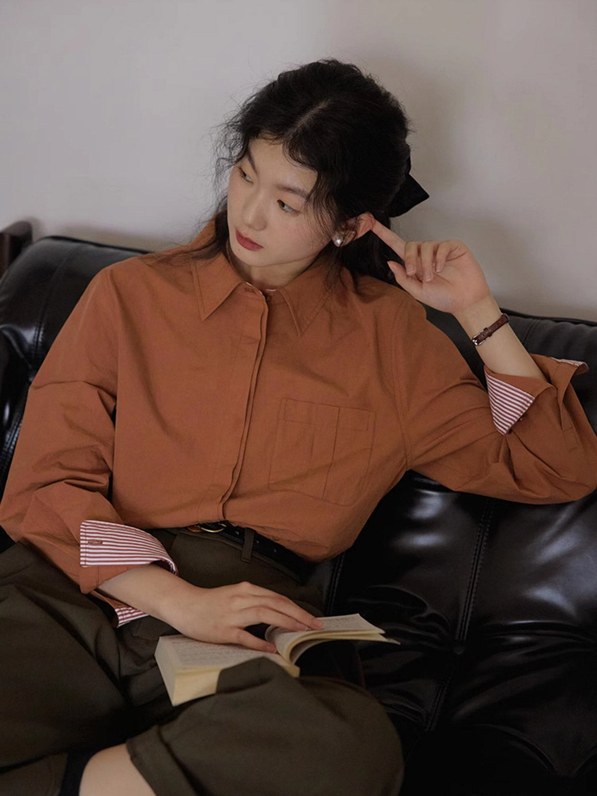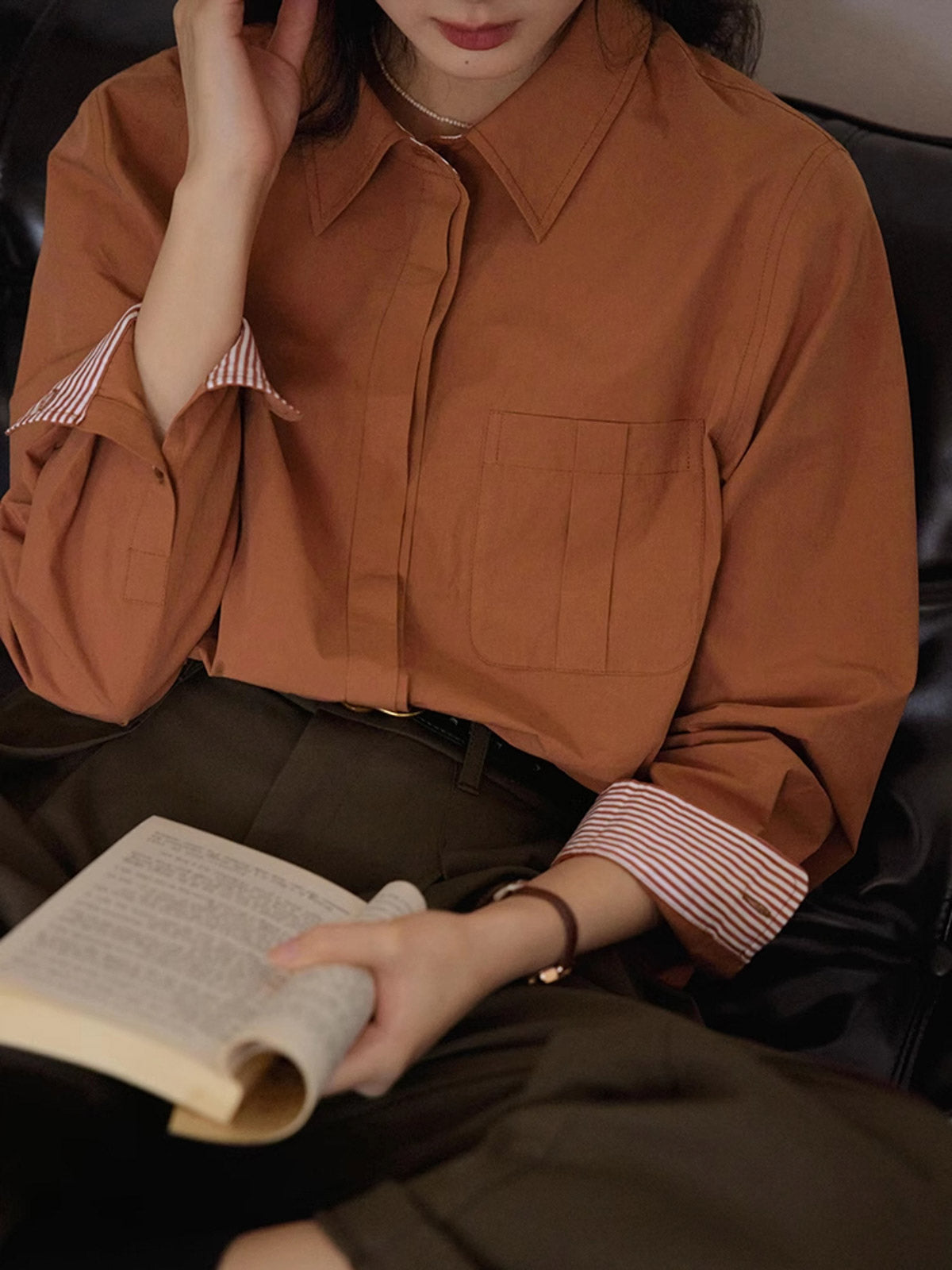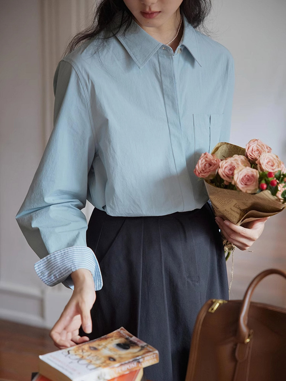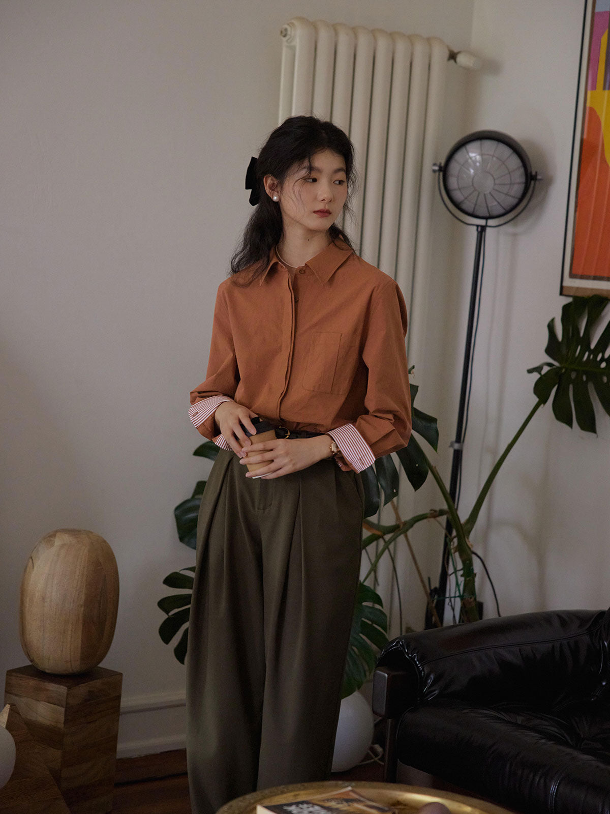 このシャツは100%コットン素材を採用し、柔らかく通気性に優れた快適な着用感を提供します。ゆったりとしたフィット感であらゆる体型に適応し、クラシックなシャツカラーが洗練された印象を与えます。胸元には特徴的な丸みを帯びたスクエアポケットがあり、デザインのアクセントとなっています。肩部分は広めに設計されており、肩のラインを美しく見せます。隠しボタンプラケットはシャツの洗練されたルックをさらに強調し、内襟と内背中のストライプデザインが独特の魅力をプラスします。
