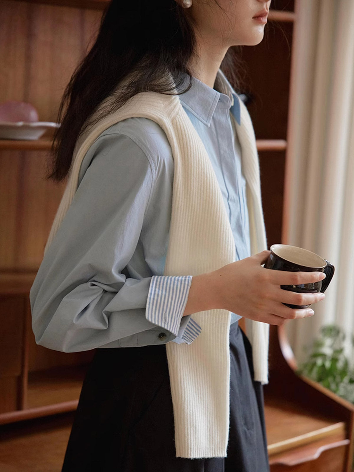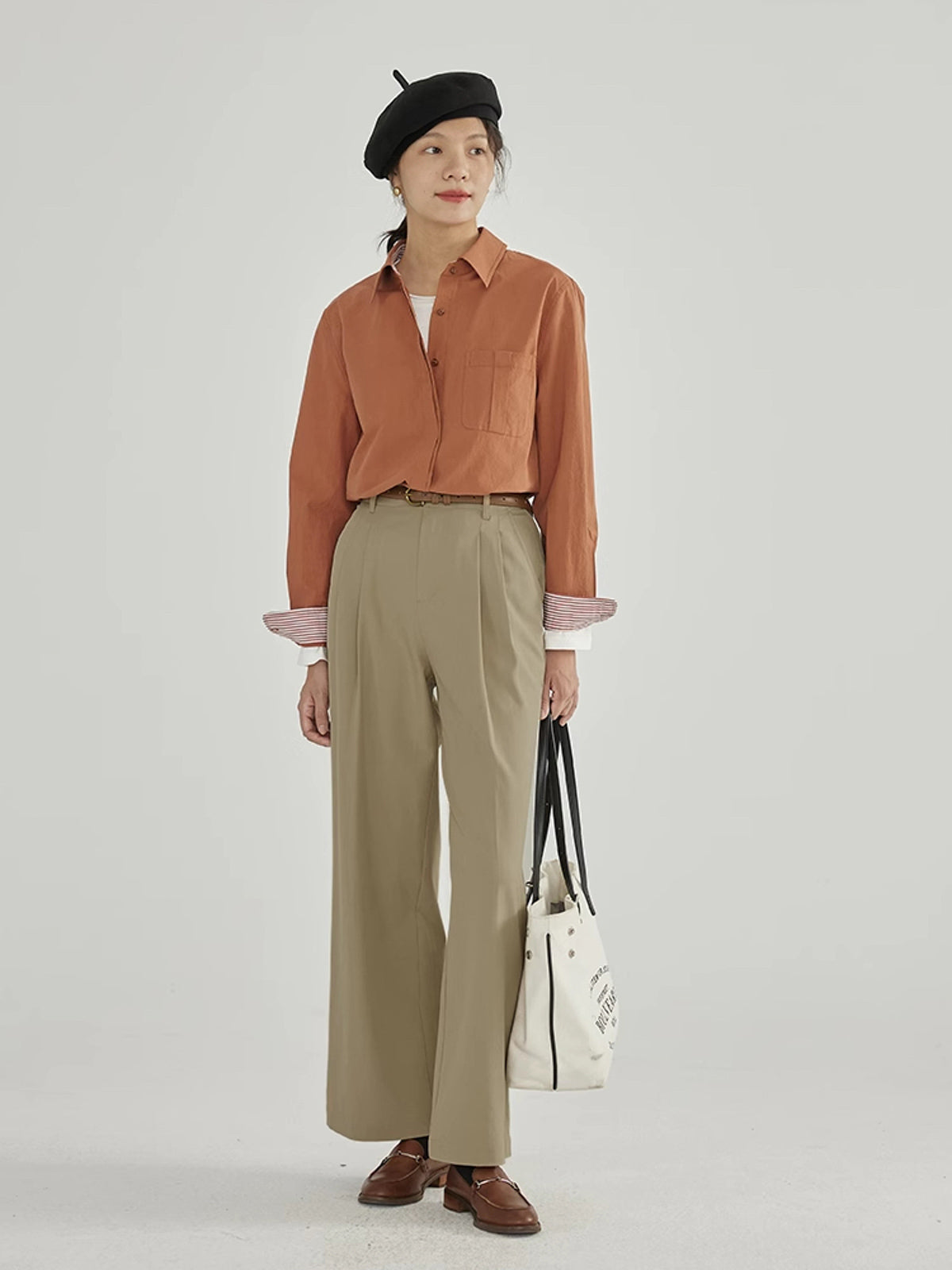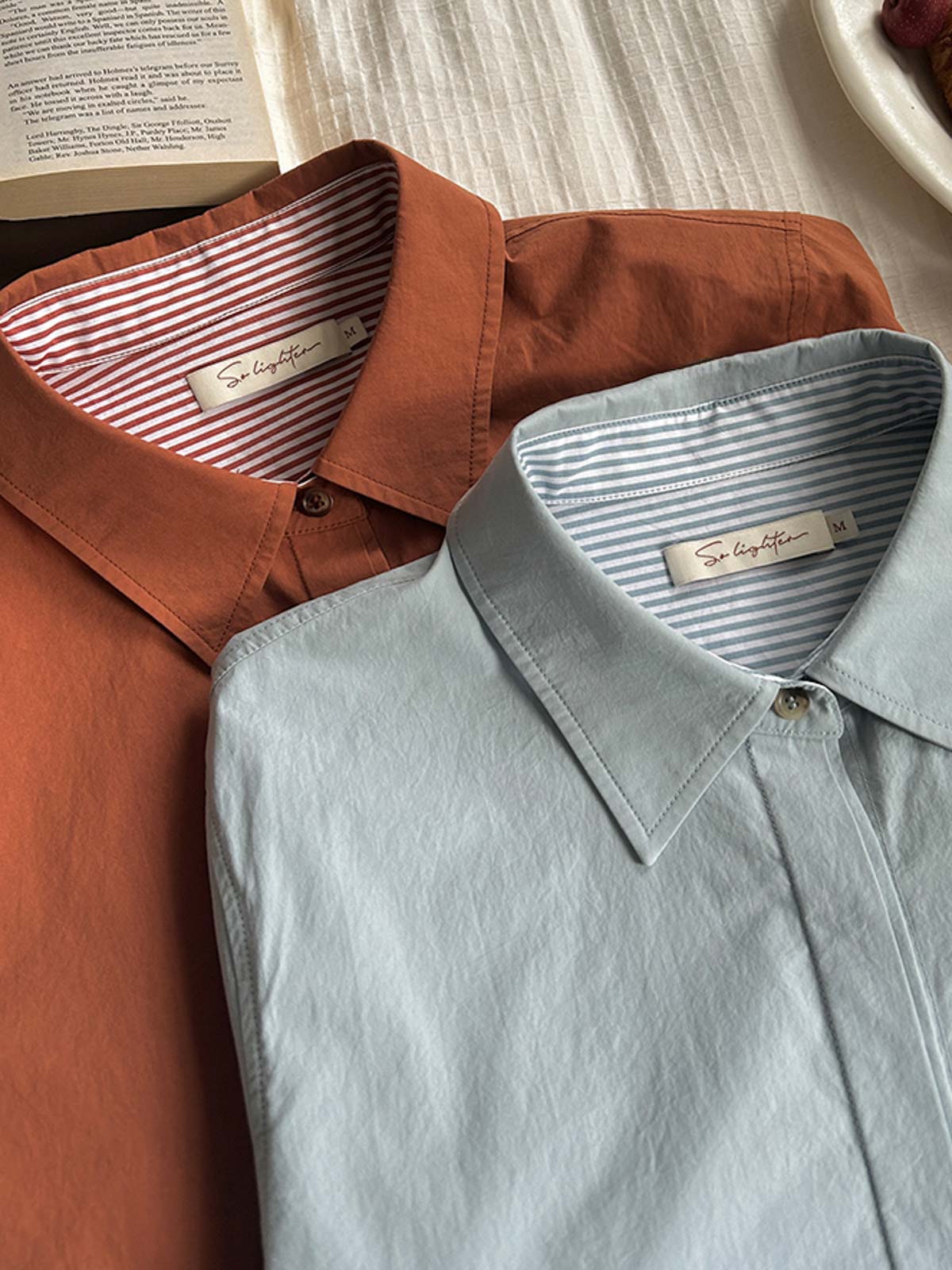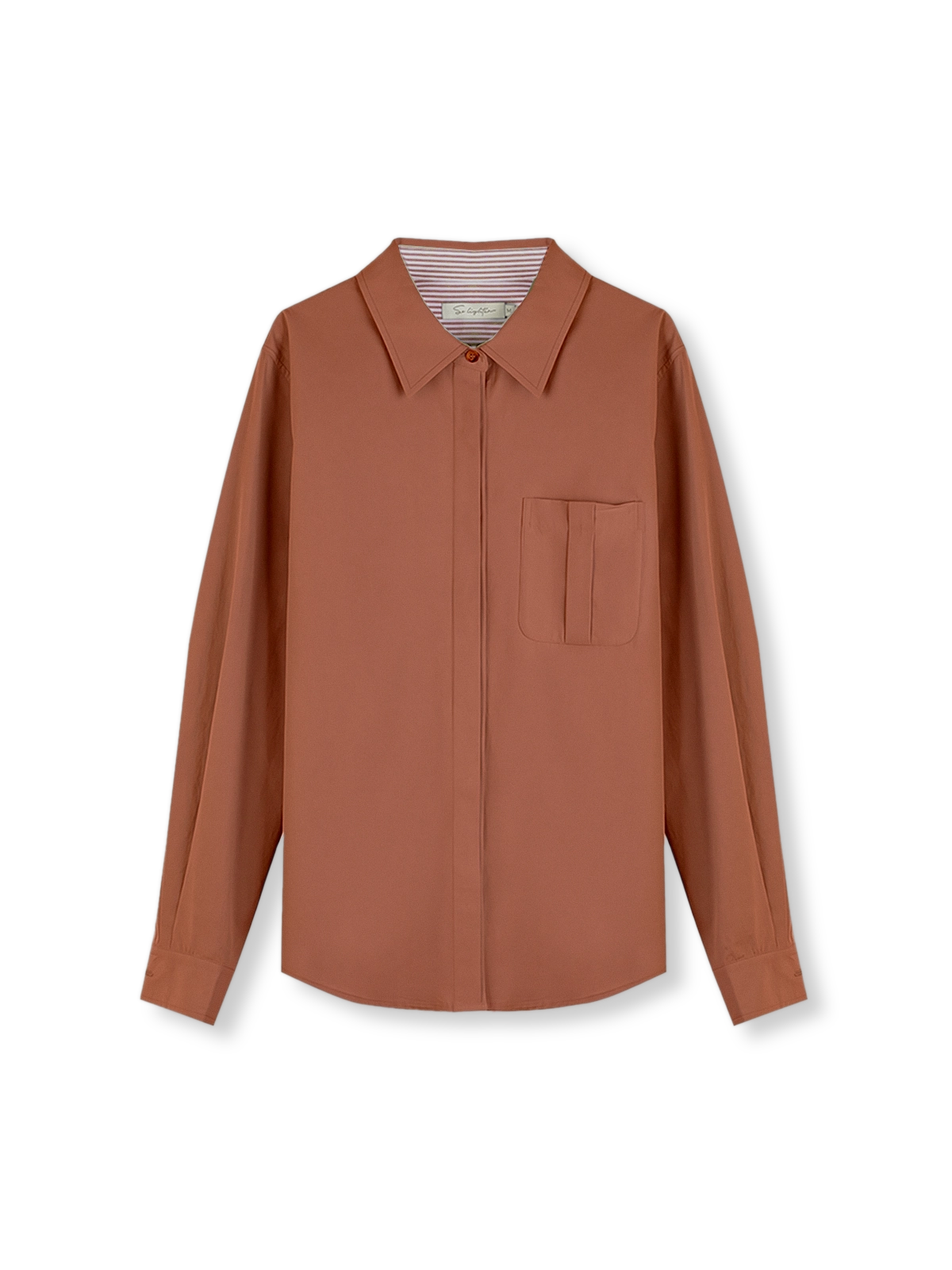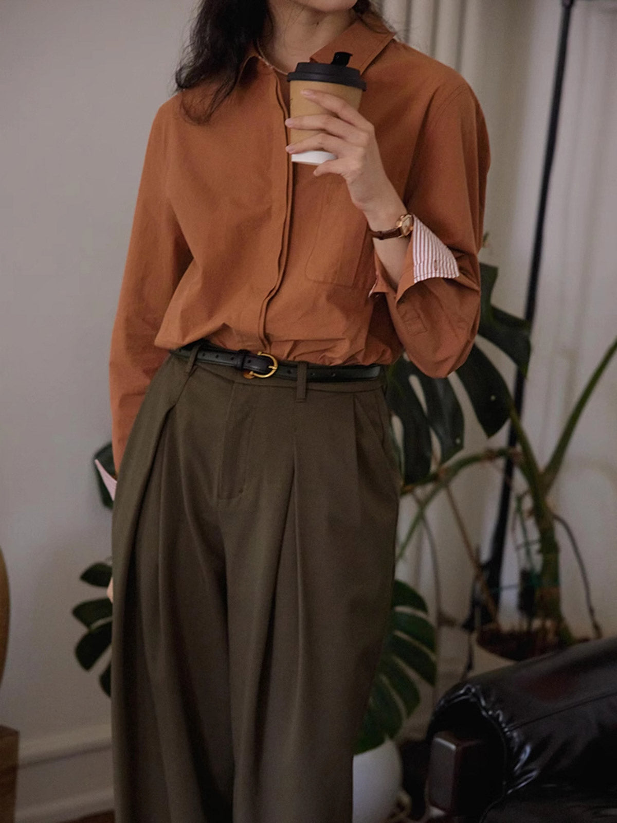 このシャツは100%コットン素材を採用し、柔らかく通気性に優れた快適な着用感を提供します。ゆったりとしたフィット感であらゆる体型に適応し、クラシックなシャツカラーが洗練された印象を与えます。胸元には特徴的な丸みを帯びたスクエアポケットがあり、デザインのアクセントとなっています。肩部分は広めに設計されており、肩のラインを美しく見せます。隠しボタンプラケットはシャツの洗練されたルックをさらに強調し、内襟と内背中のストライプデザインが独特の魅力をプラスします。