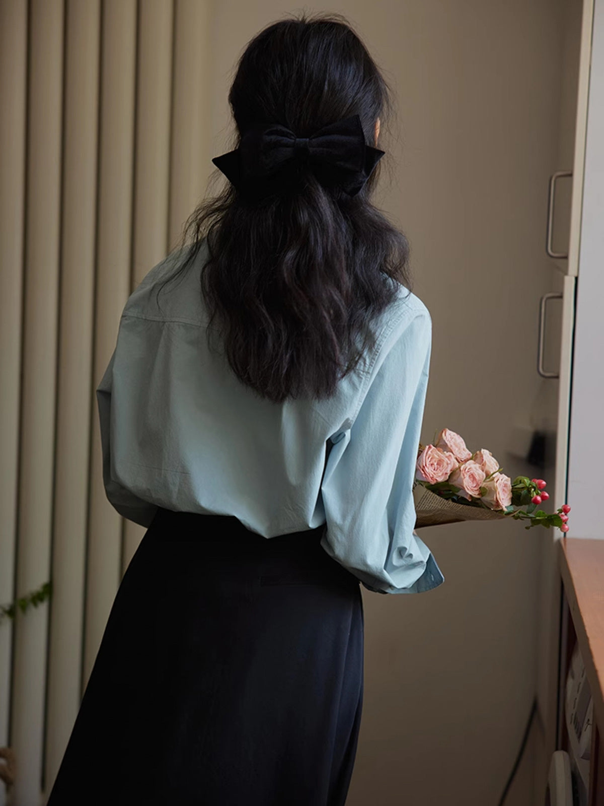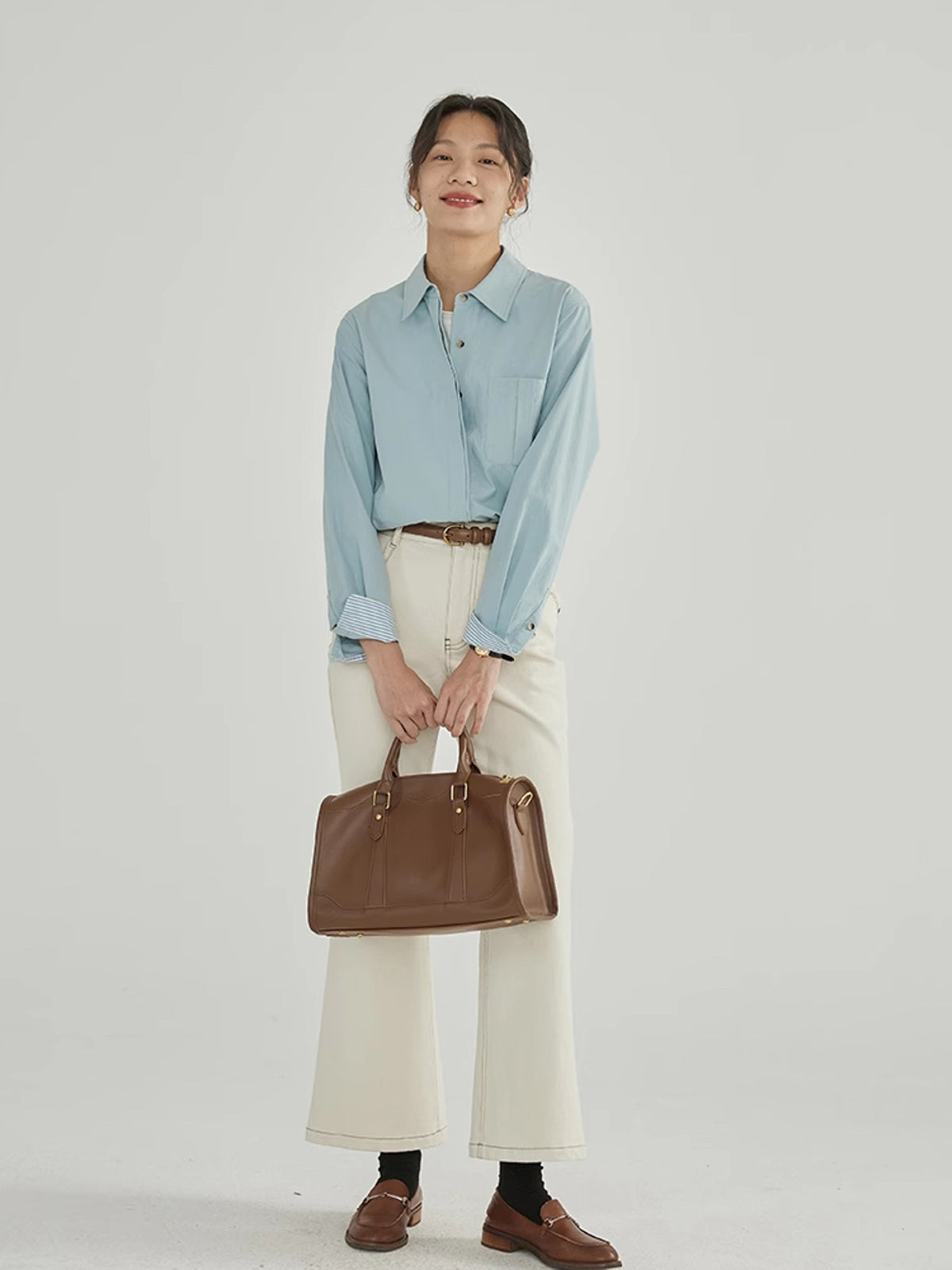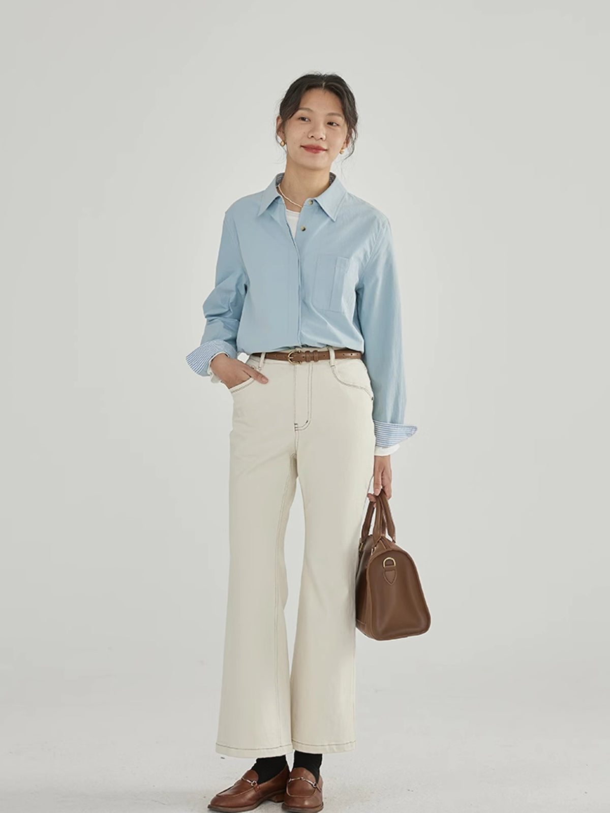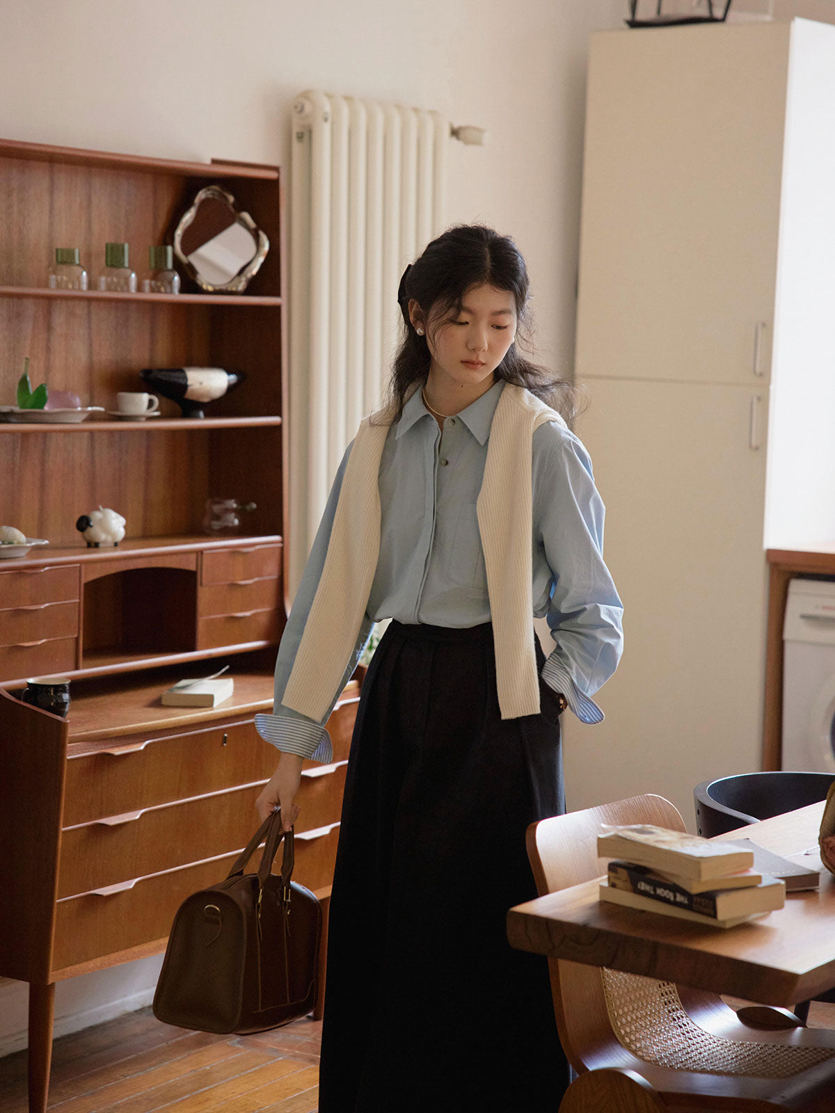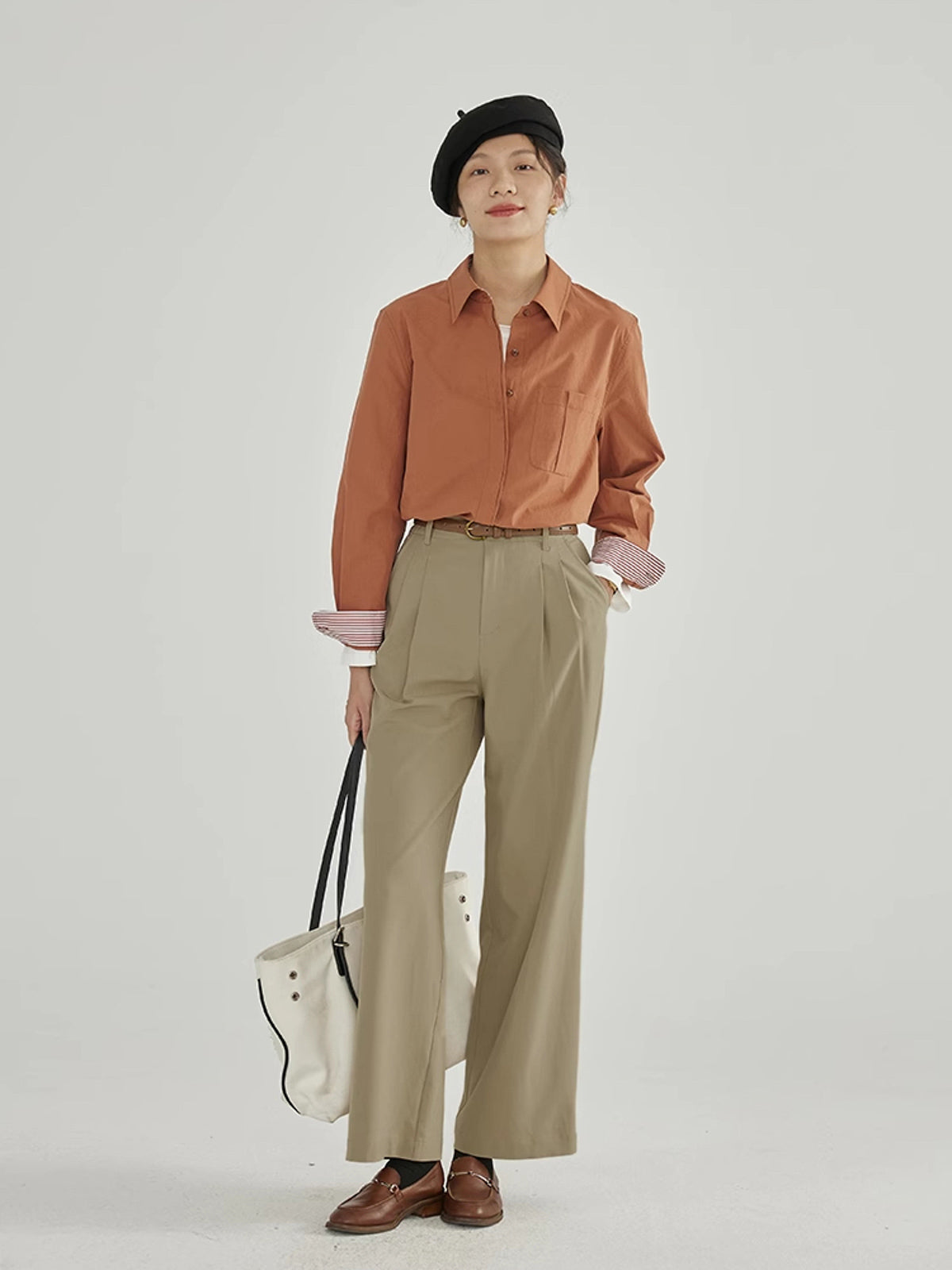 このシャツは100%コットン素材を採用し、柔らかく通気性に優れた快適な着用感を提供します。ゆったりとしたフィット感であらゆる体型に適応し、クラシックなシャツカラーが洗練された印象を与えます。胸元には特徴的な丸みを帯びたスクエアポケットがあり、デザインのアクセントとなっています。肩部分は広めに設計されており、肩のラインを美しく見せます。隠しボタンプラケットはシャツの洗練されたルックをさらに強調し、内襟と内背中のストライプデザインが独特の魅力をプラスします。