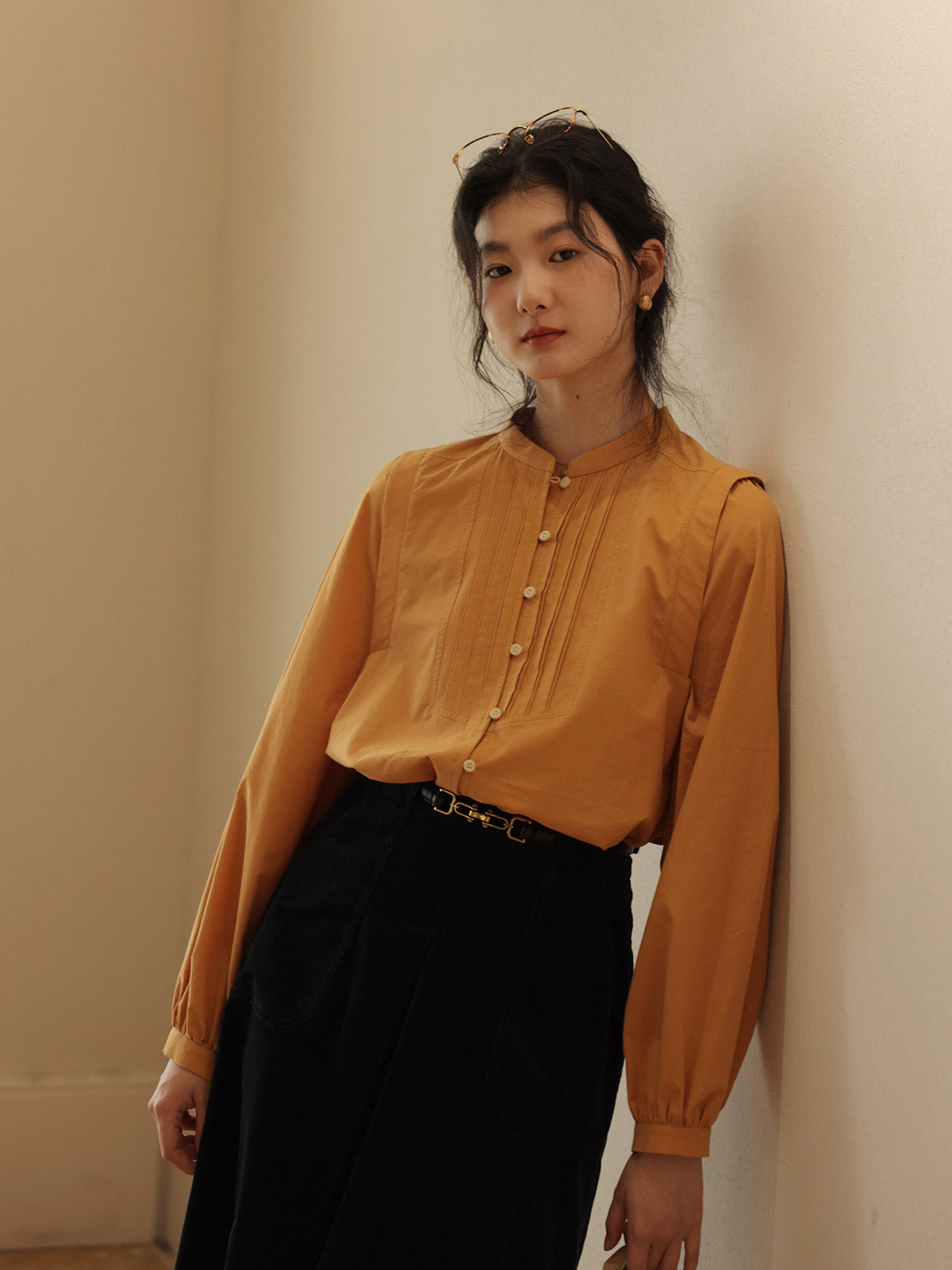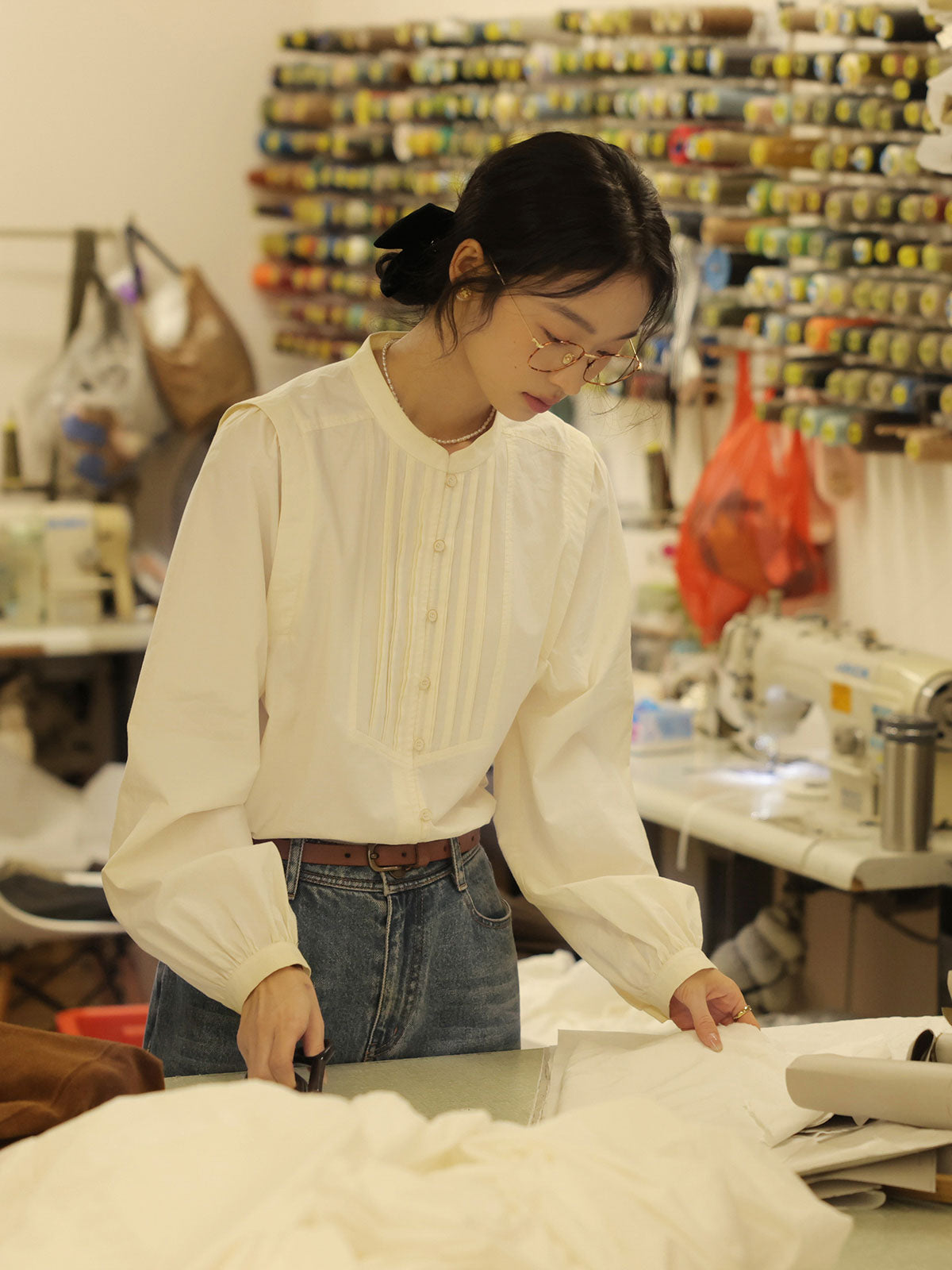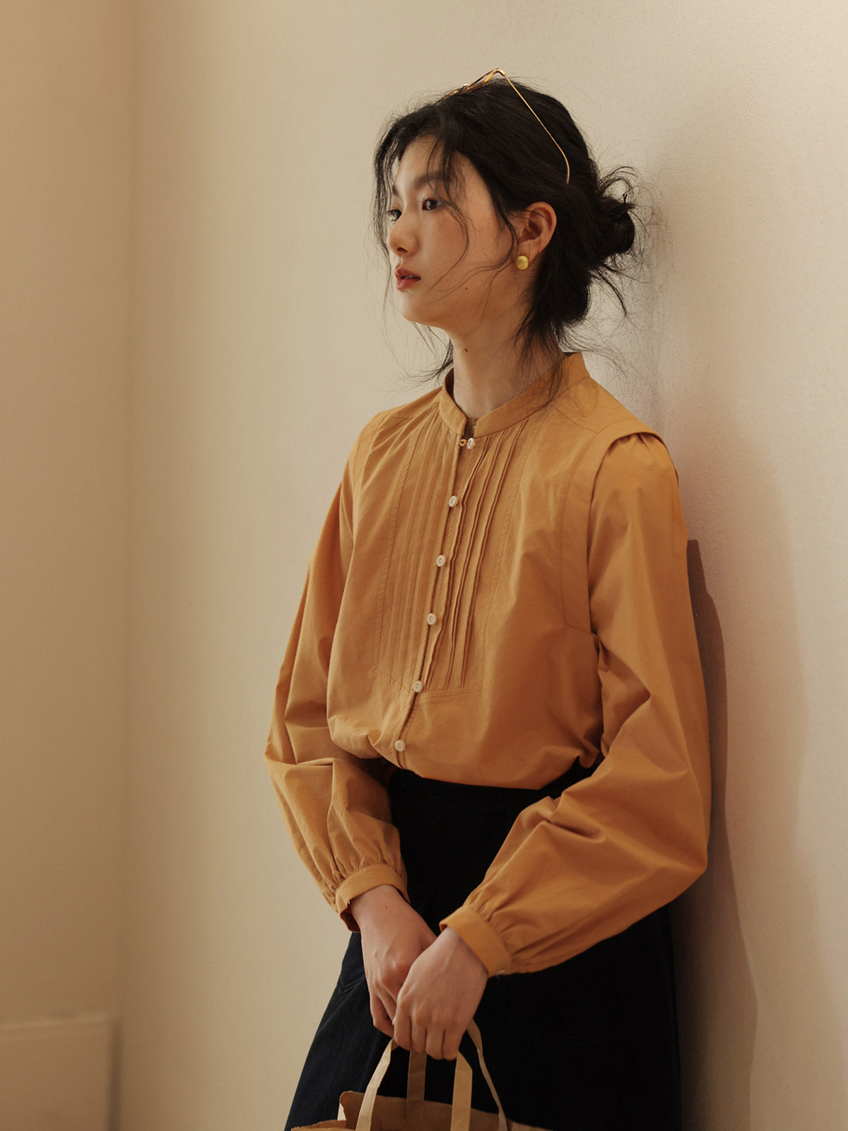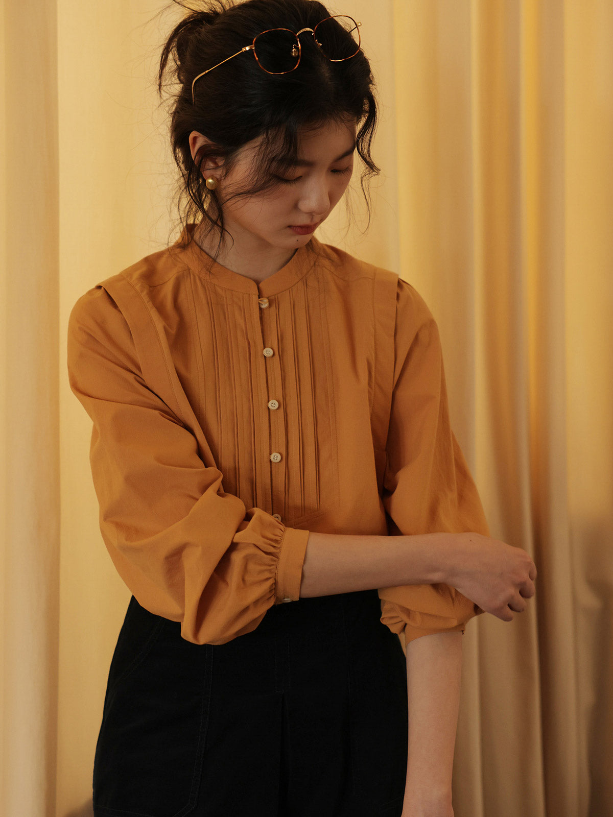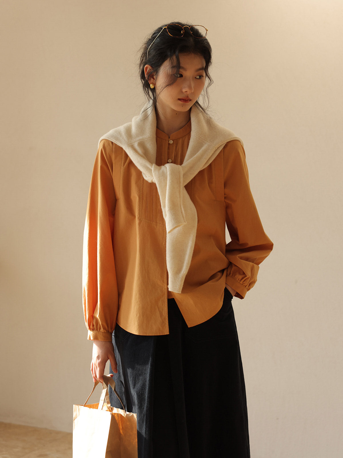 このフレンチヴィンテージスタイルのスタンドカラーランタンスリーブシャツは、100%コットン素材を使用し、柔らかく通気性が良いため、一年中快適に着用できます。ストレートカットのワイドフィットデザインは、さまざまな体型にフィットします。上品なスタンドカラーとフロントのタックプリーツが立体的で動きのあるラインを作り出し、エレガントさを演出します。シングルブレストの前立てには、耳付きと木の実ボタンが施され、ディテールにこだわった仕上がりです。肩のタックデザインが肩のラインを整え、全体のスタイルを引き立てます。