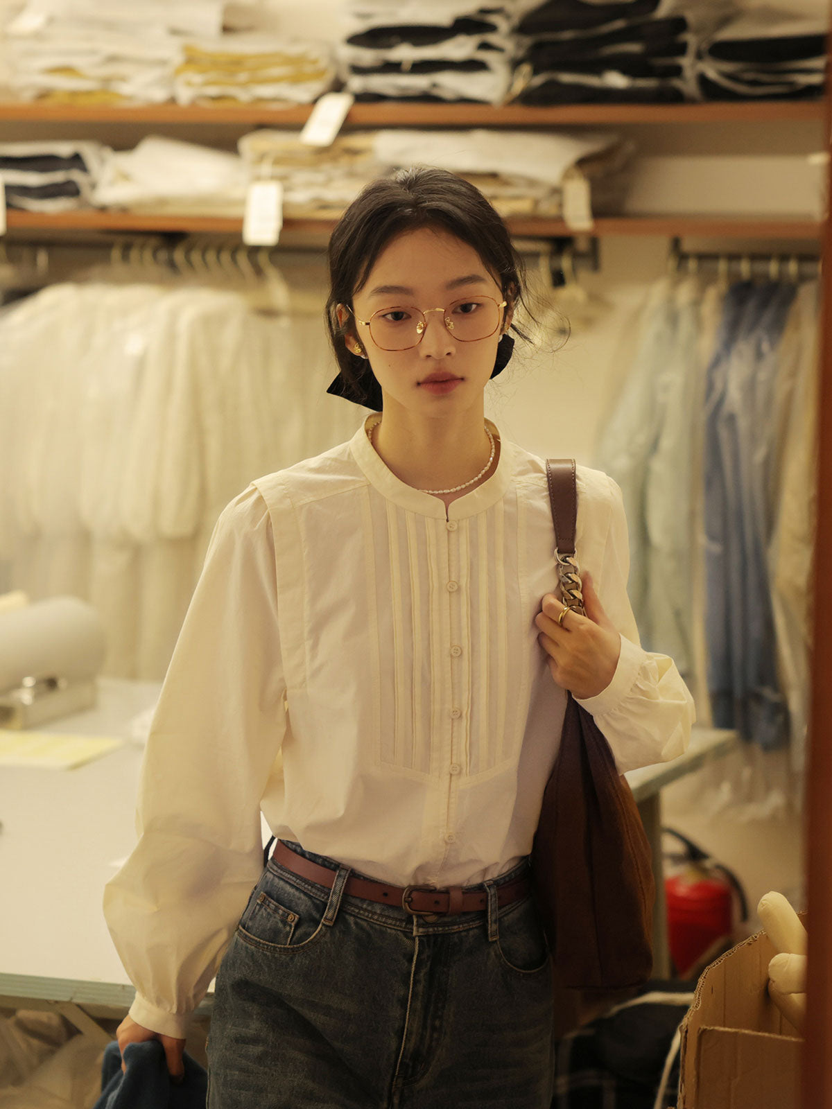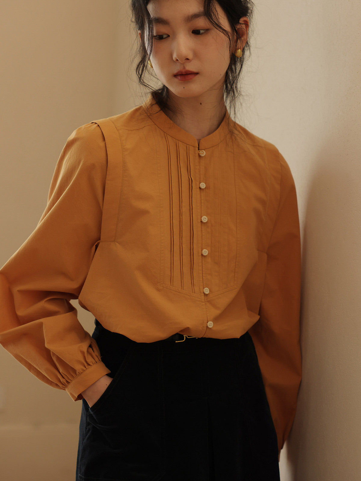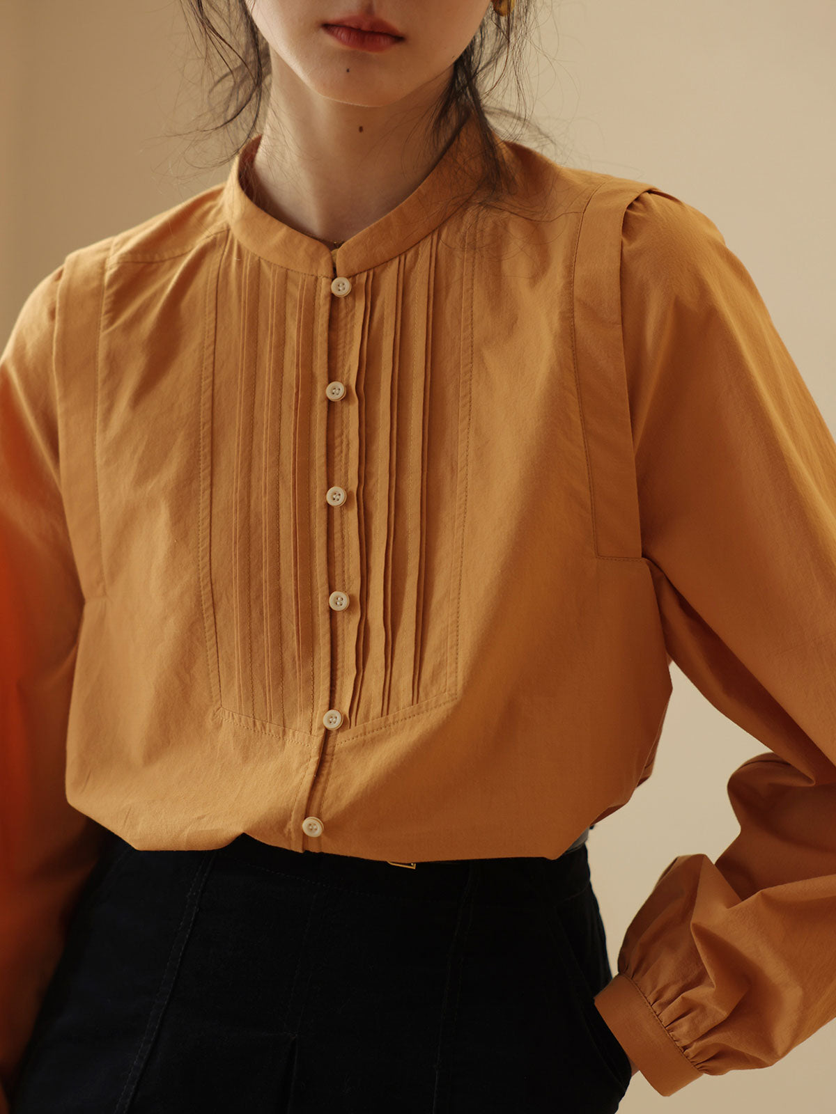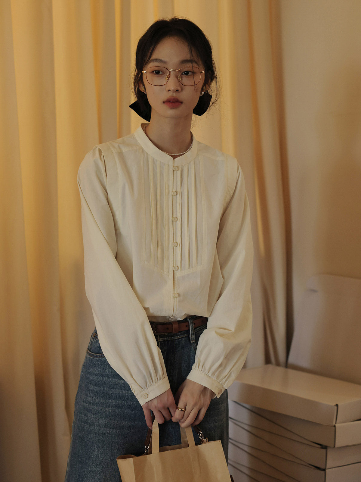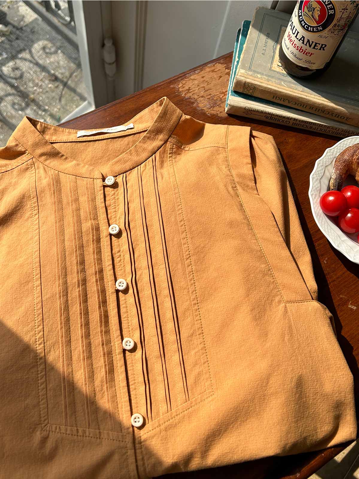 このフレンチヴィンテージスタイルのスタンドカラーランタンスリーブシャツは、100%コットン素材を使用し、柔らかく通気性が良いため、一年中快適に着用できます。ストレートカットのワイドフィットデザインは、さまざまな体型にフィットします。上品なスタンドカラーとフロントのタックプリーツが立体的で動きのあるラインを作り出し、エレガントさを演出します。シングルブレストの前立てには、耳付きと木の実ボタンが施され、ディテールにこだわった仕上がりです。肩のタックデザインが肩のラインを整え、全体のスタイルを引き立てます。