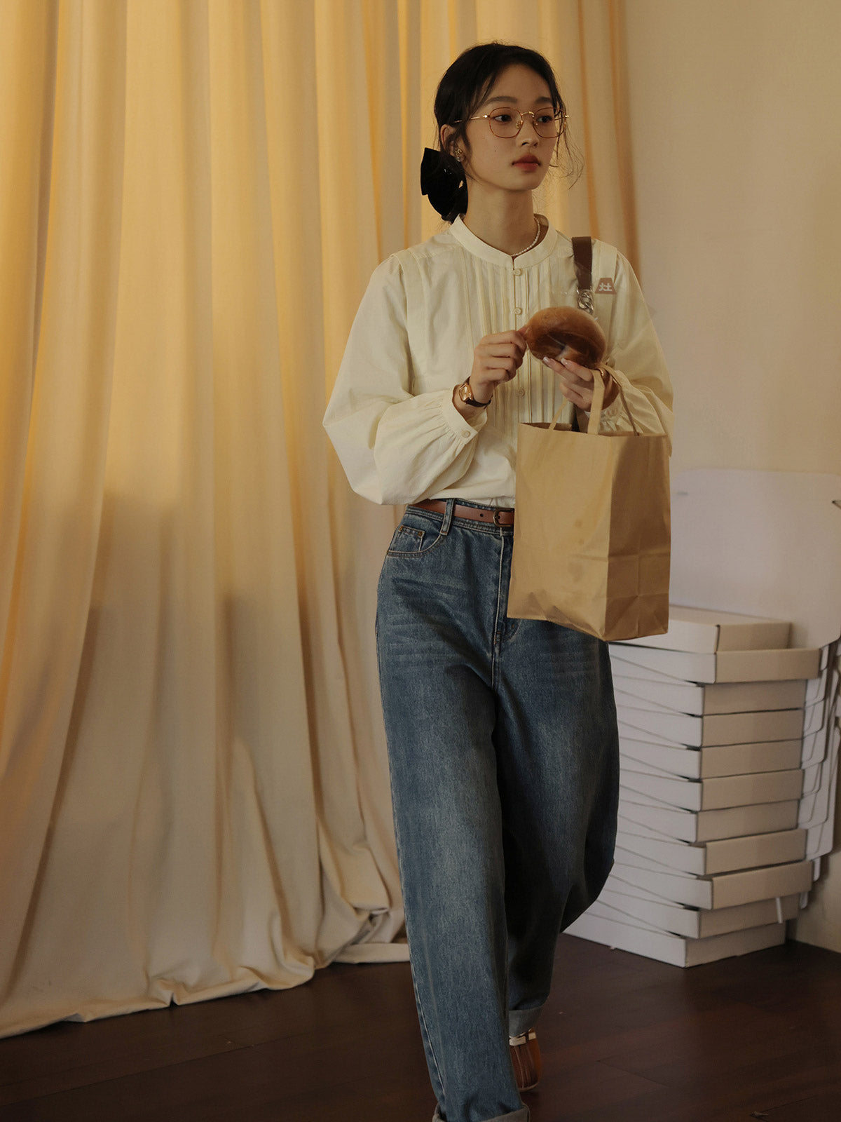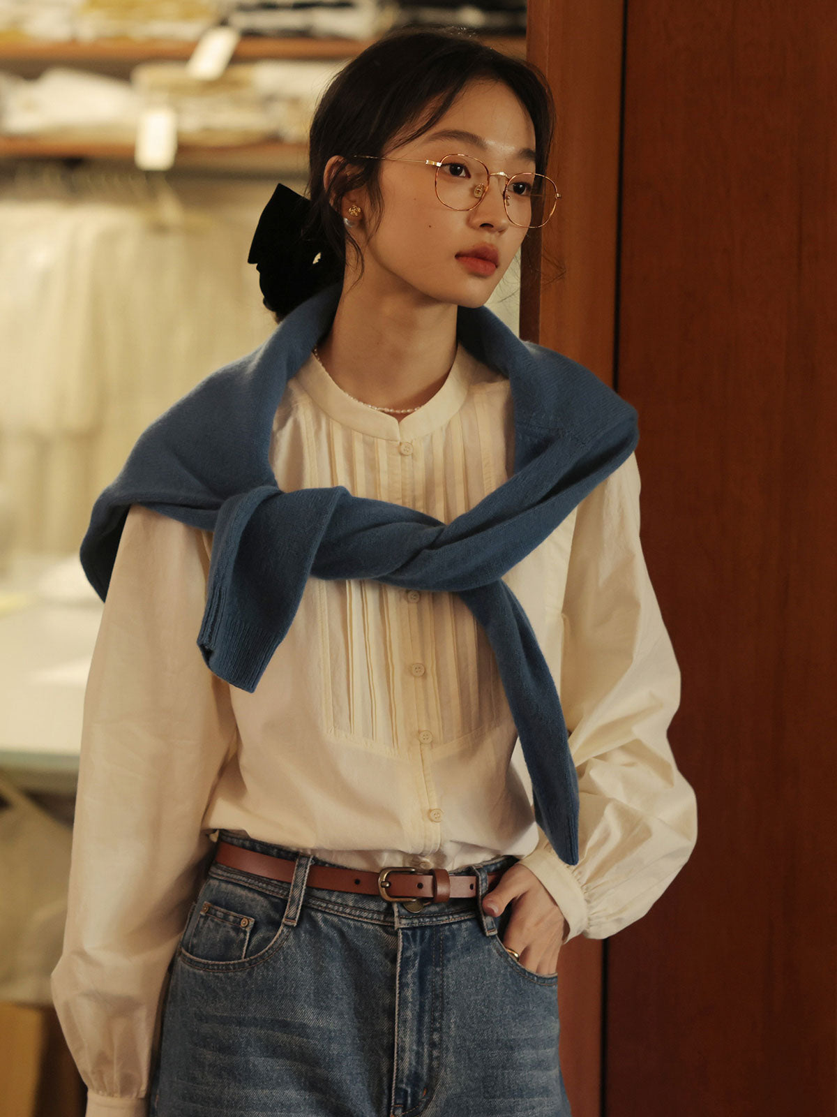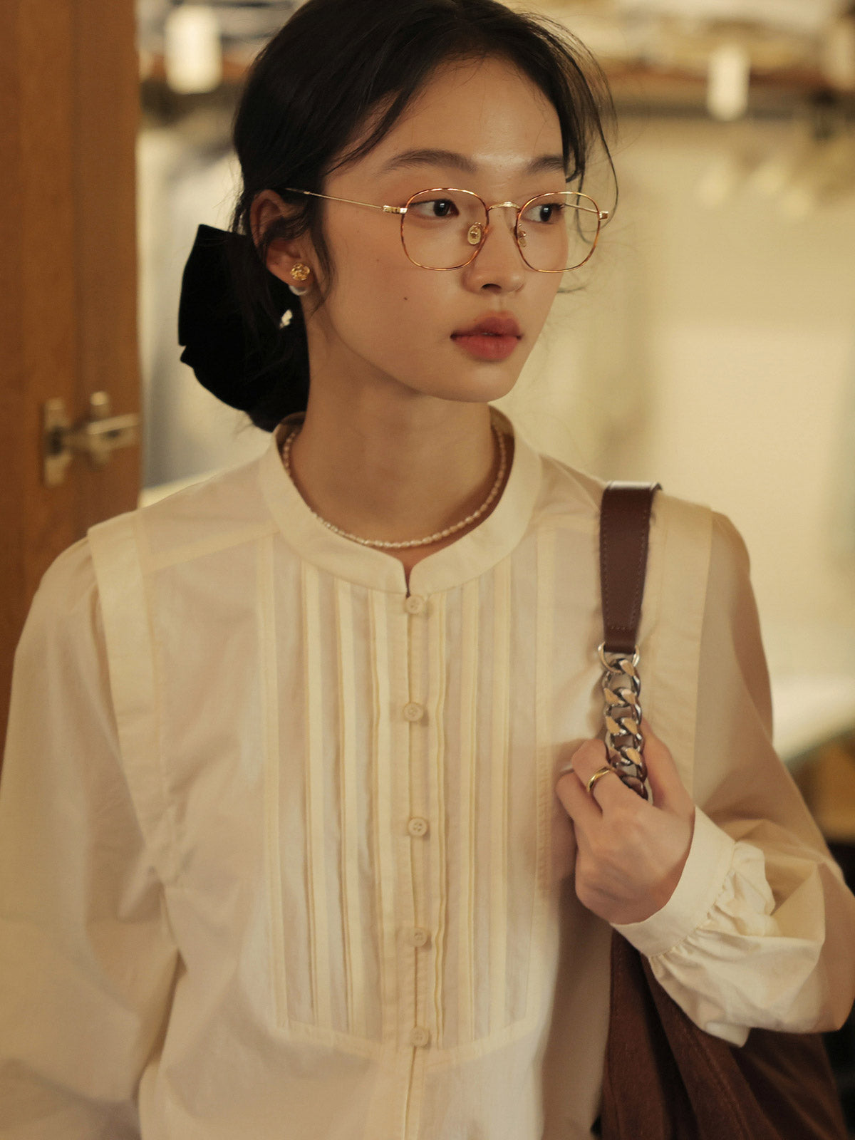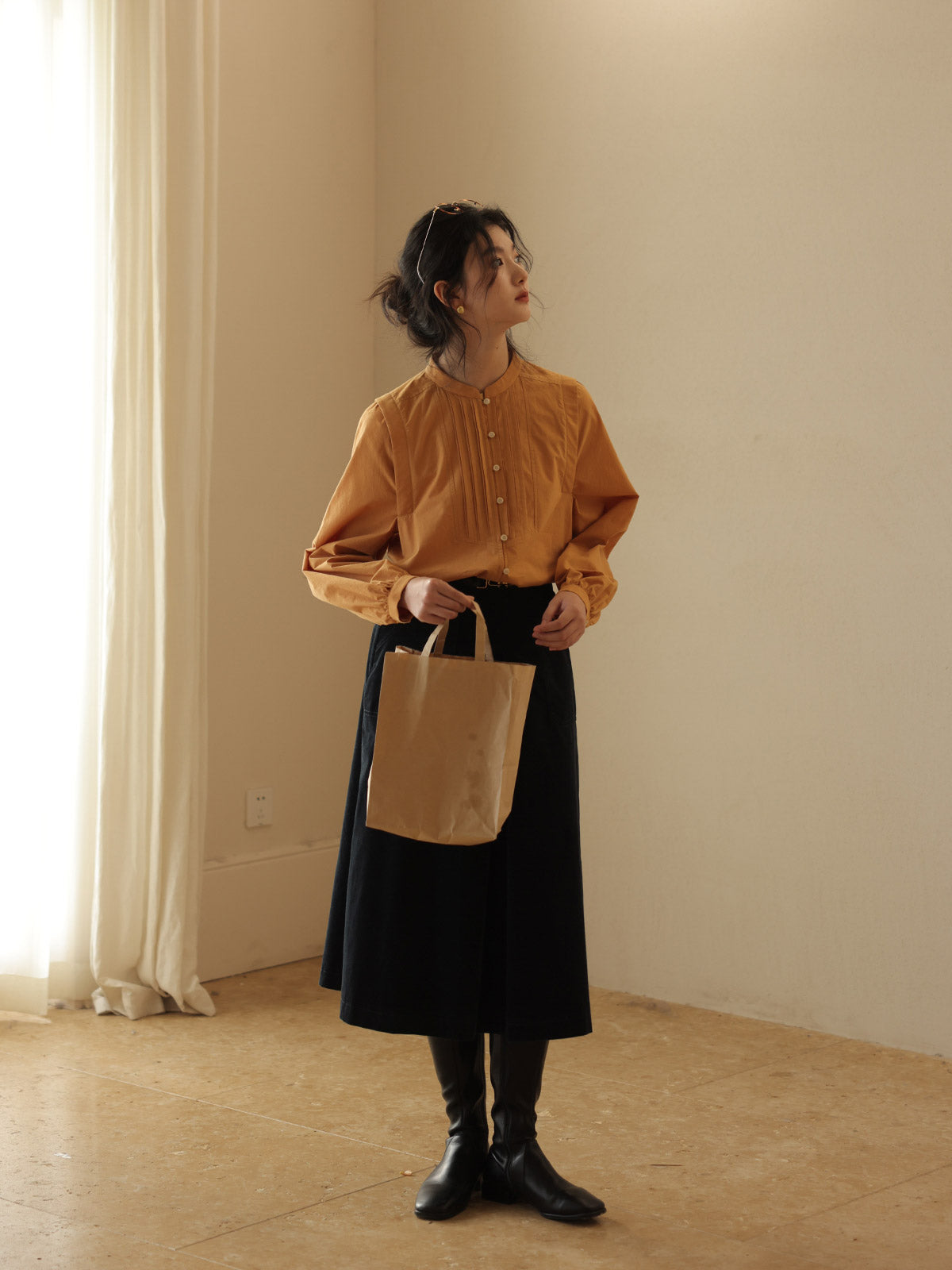 このフレンチヴィンテージスタイルのスタンドカラーランタンスリーブシャツは、100%コットン素材を使用し、柔らかく通気性が良いため、一年中快適に着用できます。ストレートカットのワイドフィットデザインは、さまざまな体型にフィットします。上品なスタンドカラーとフロントのタックプリーツが立体的で動きのあるラインを作り出し、エレガントさを演出します。シングルブレストの前立てには、耳付きと木の実ボタンが施され、ディテールにこだわった仕上がりです。肩のタックデザインが肩のラインを整え、全体のスタイルを引き立てます。