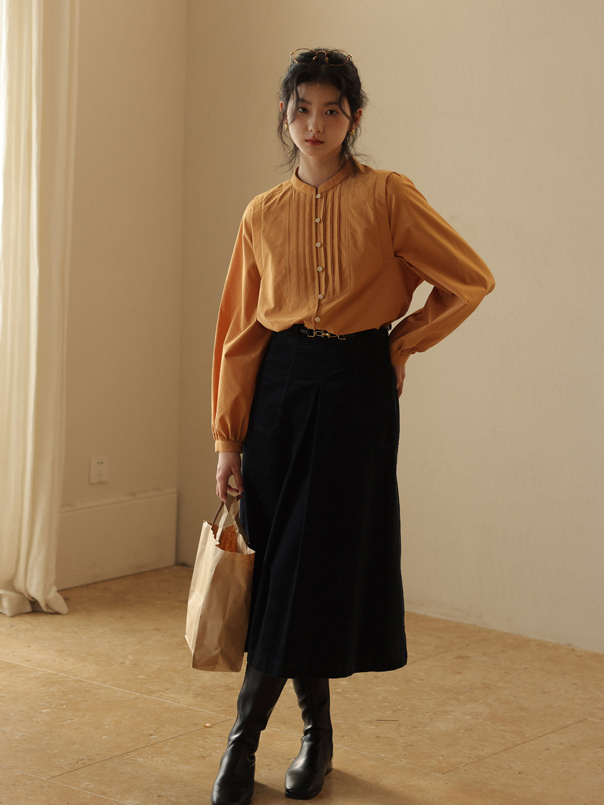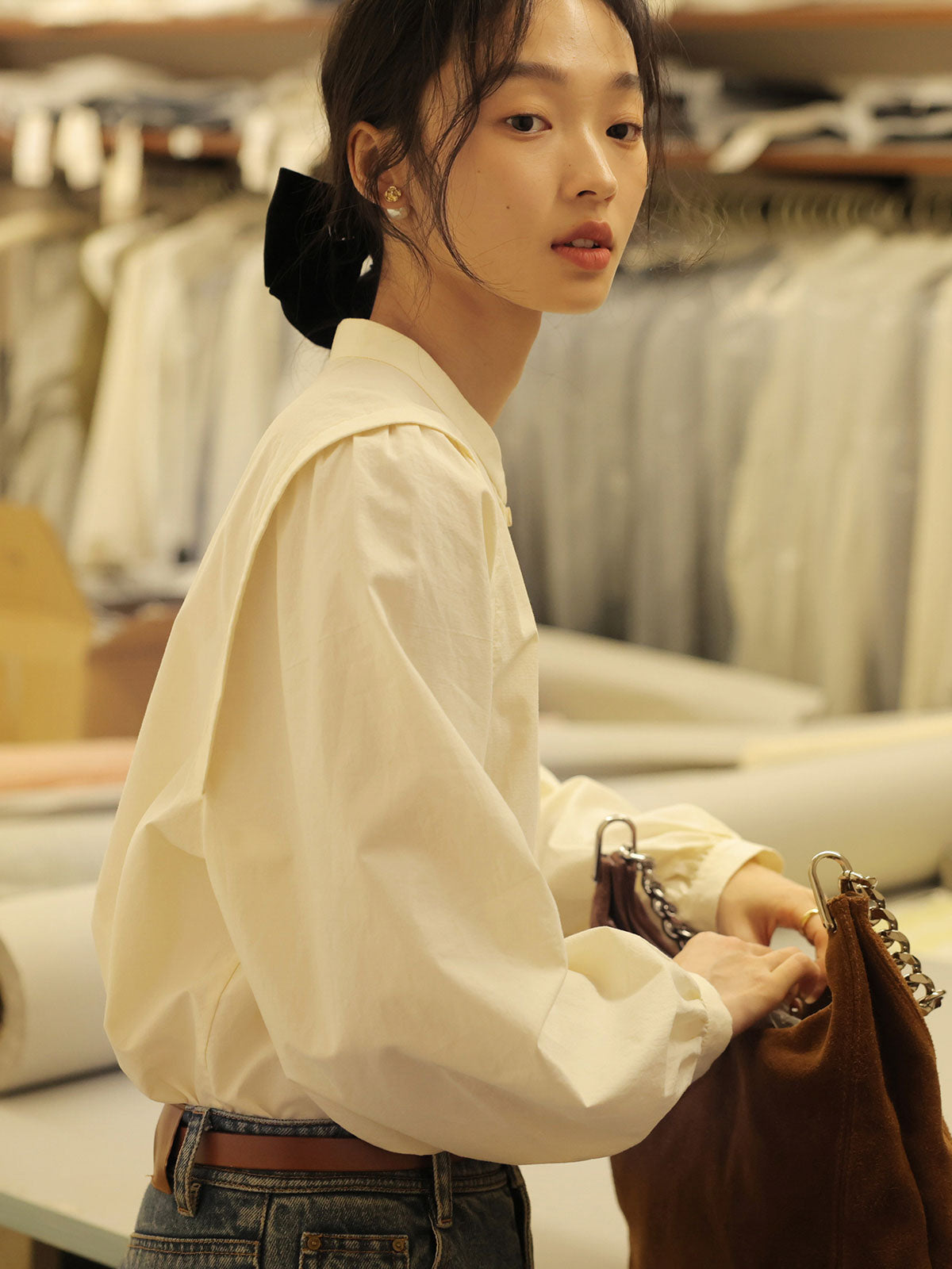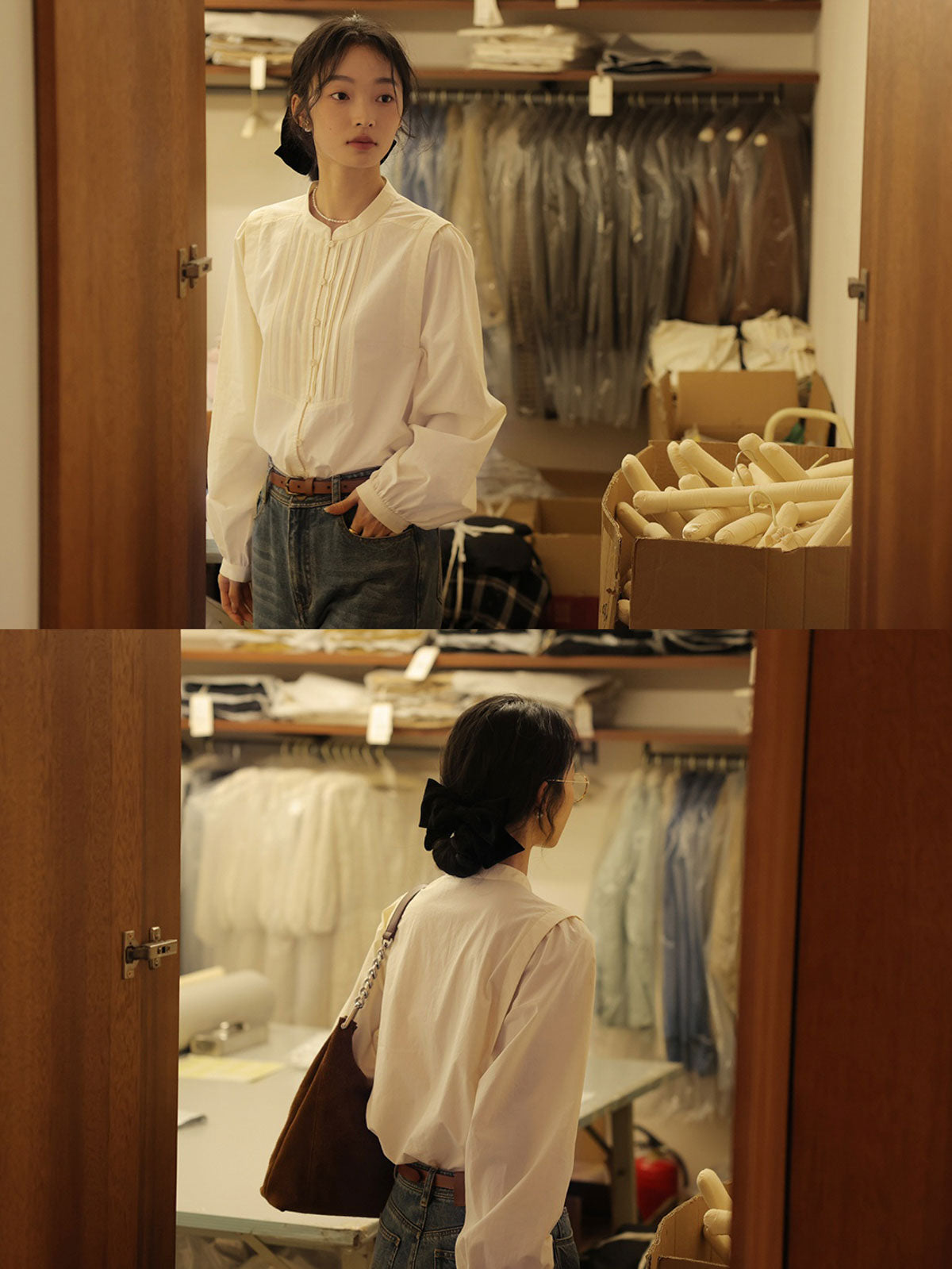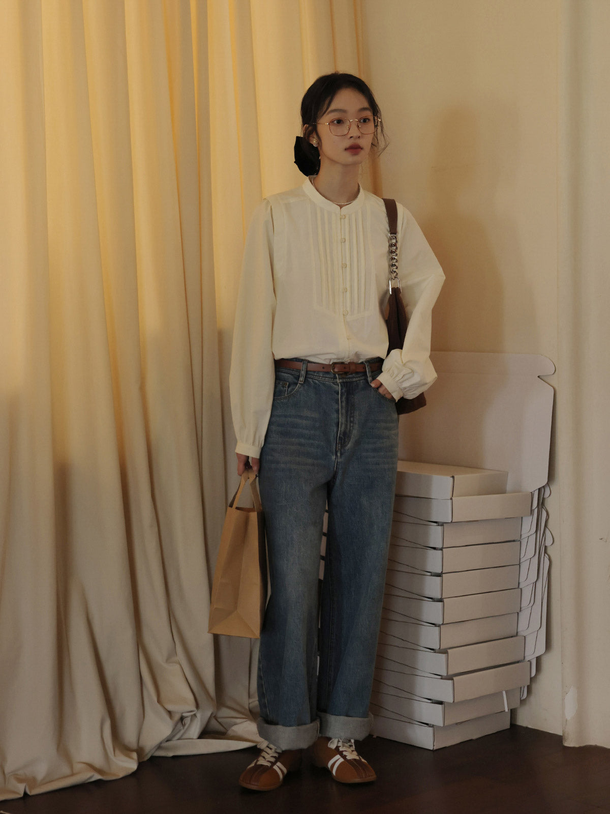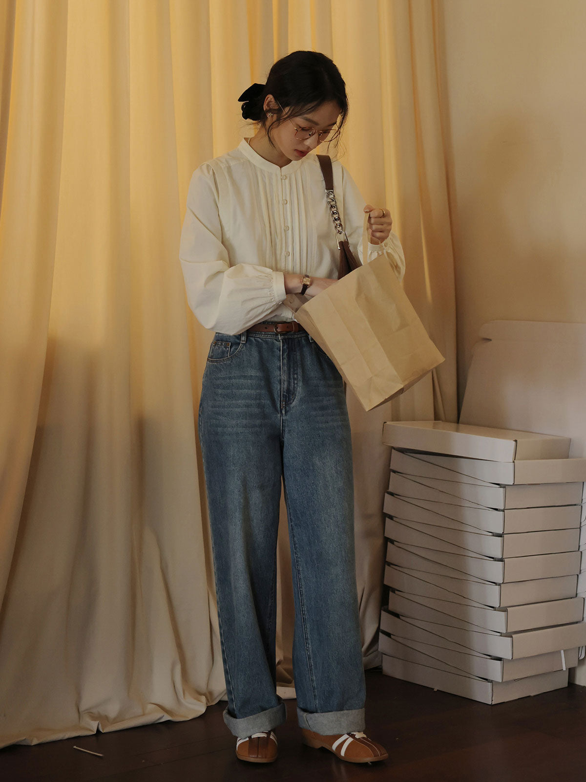 このフレンチヴィンテージスタイルのスタンドカラーランタンスリーブシャツは、100%コットン素材を使用し、柔らかく通気性が良いため、一年中快適に着用できます。ストレートカットのワイドフィットデザインは、さまざまな体型にフィットします。上品なスタンドカラーとフロントのタックプリーツが立体的で動きのあるラインを作り出し、エレガントさを演出します。シングルブレストの前立てには、耳付きと木の実ボタンが施され、ディテールにこだわった仕上がりです。肩のタックデザインが肩のラインを整え、全体のスタイルを引き立てます。