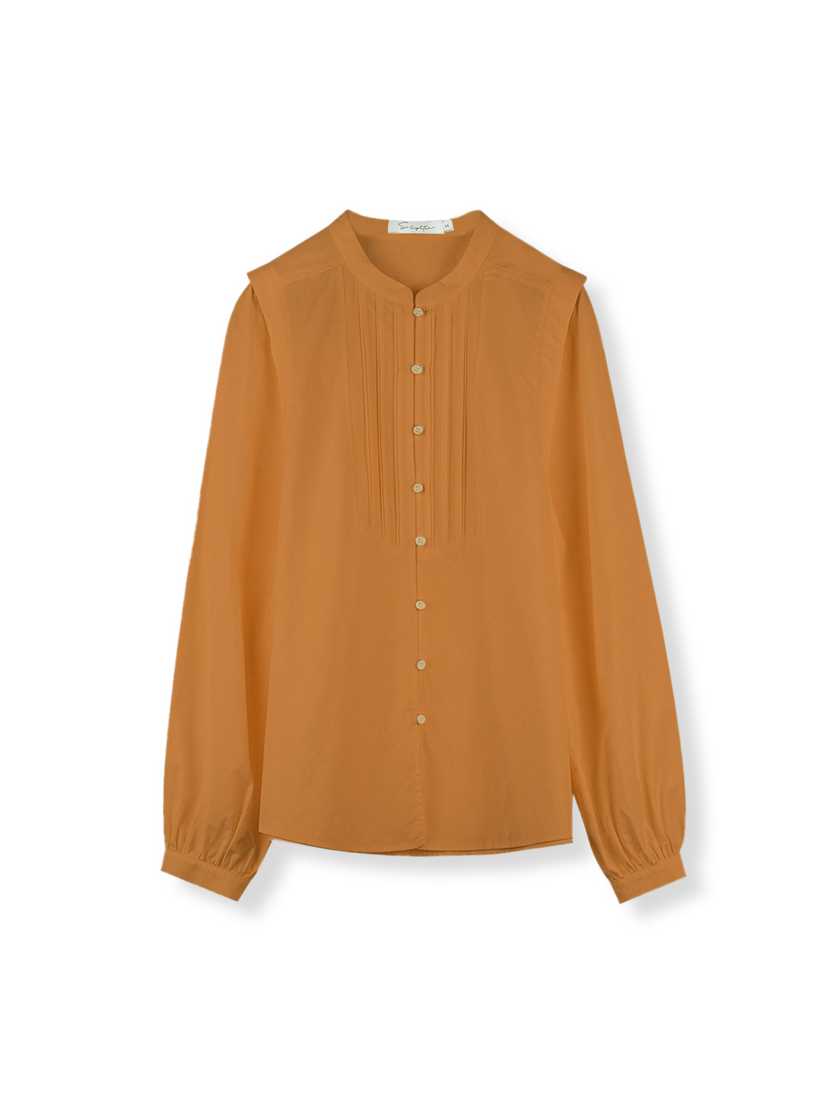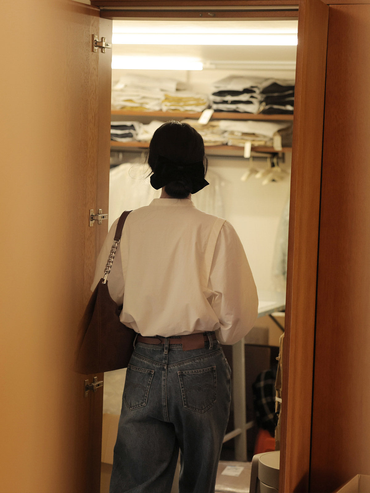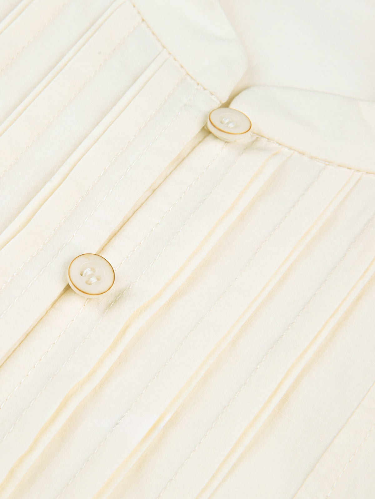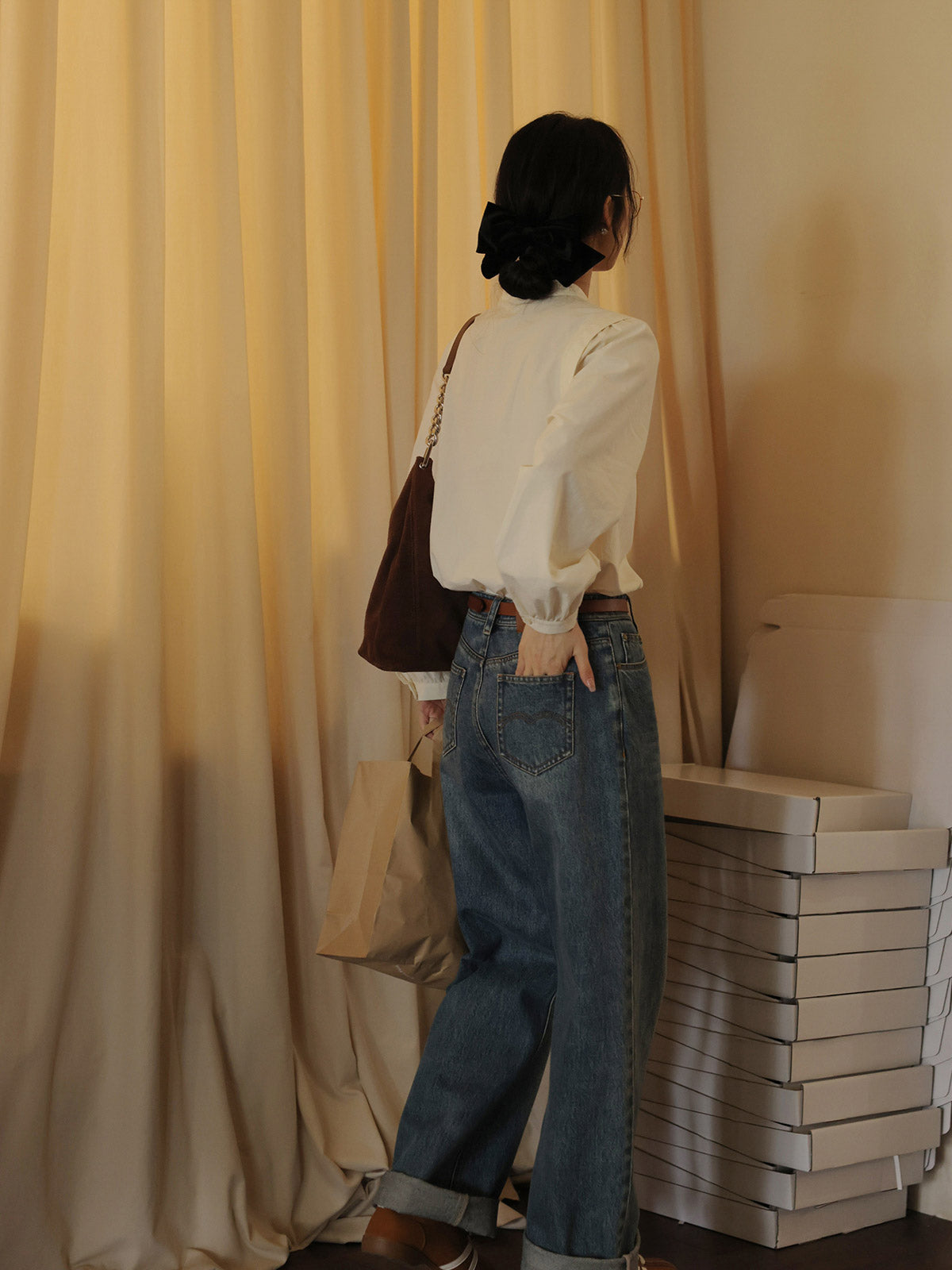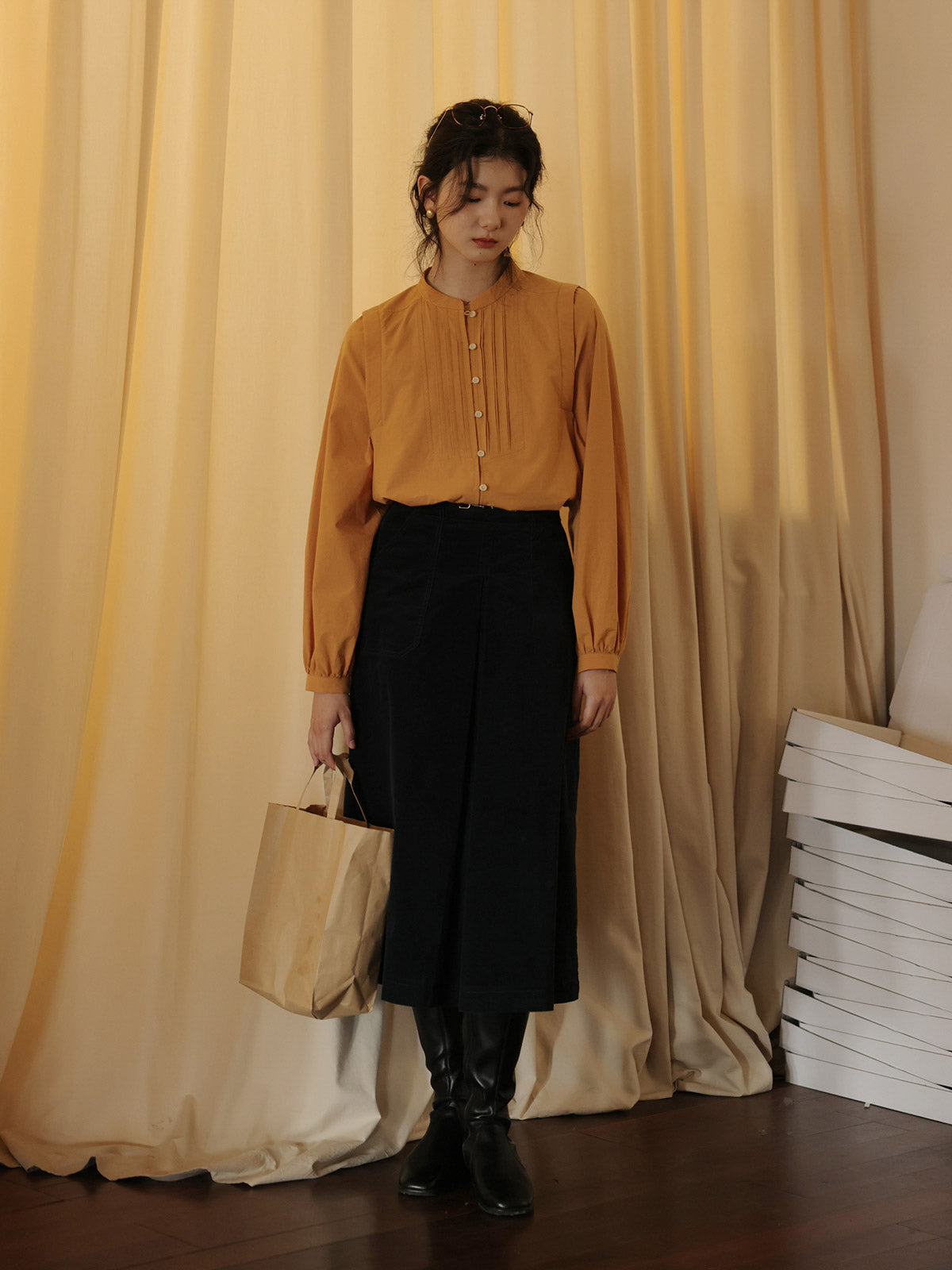 このフレンチヴィンテージスタイルのスタンドカラーランタンスリーブシャツは、100%コットン素材を使用し、柔らかく通気性が良いため、一年中快適に着用できます。ストレートカットのワイドフィットデザインは、さまざまな体型にフィットします。上品なスタンドカラーとフロントのタックプリーツが立体的で動きのあるラインを作り出し、エレガントさを演出します。シングルブレストの前立てには、耳付きと木の実ボタンが施され、ディテールにこだわった仕上がりです。肩のタックデザインが肩のラインを整え、全体のスタイルを引き立てます。
