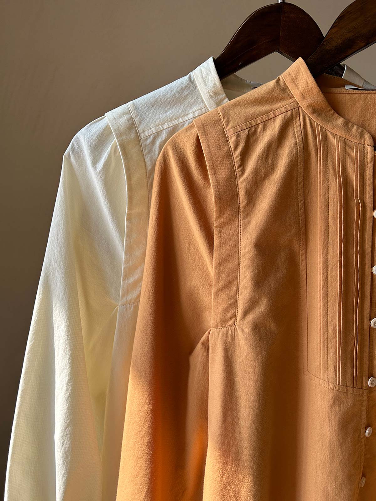 エレガントなスタンドカラー、ワイドフィットで快適なコットンシャツ。