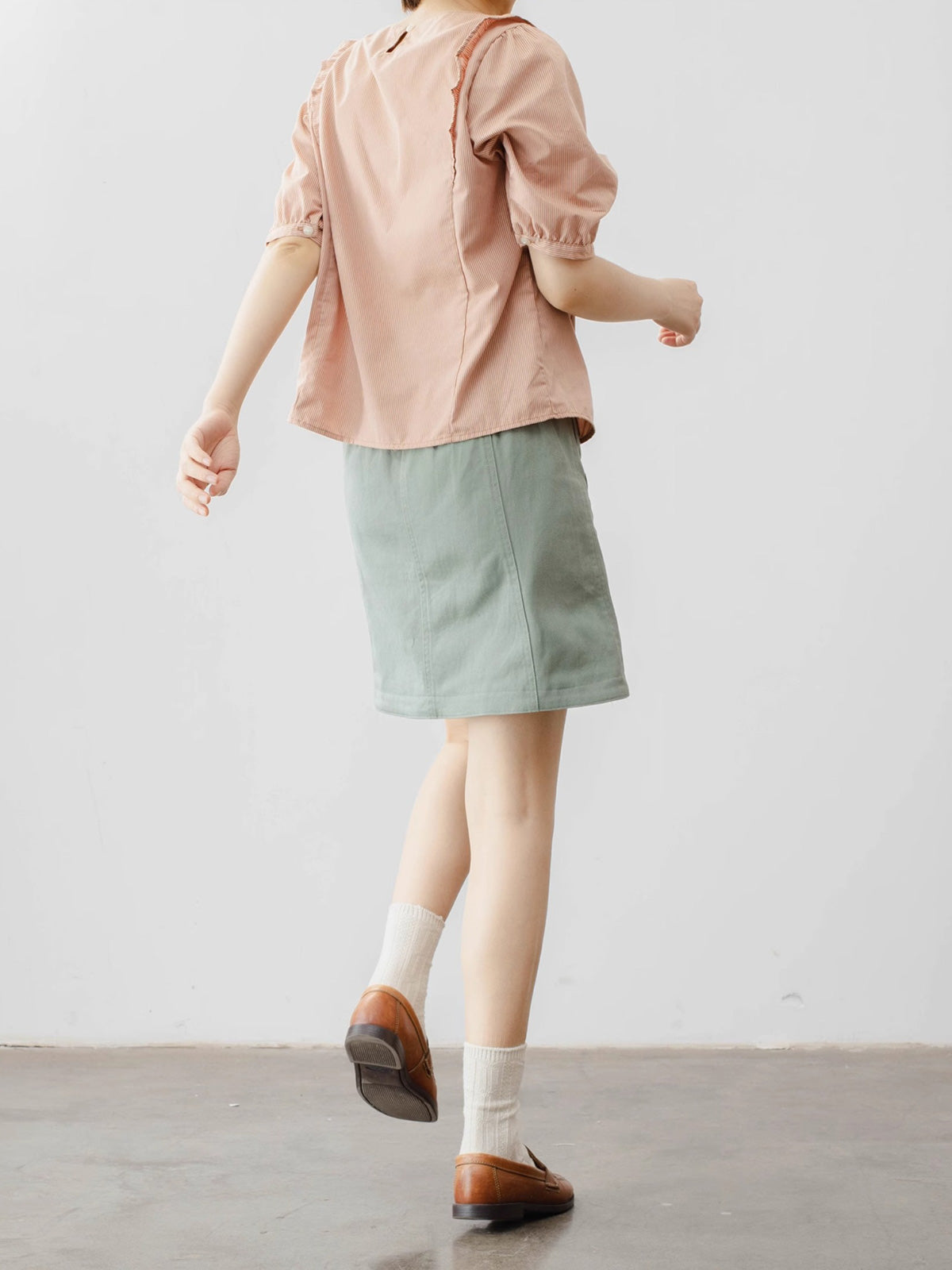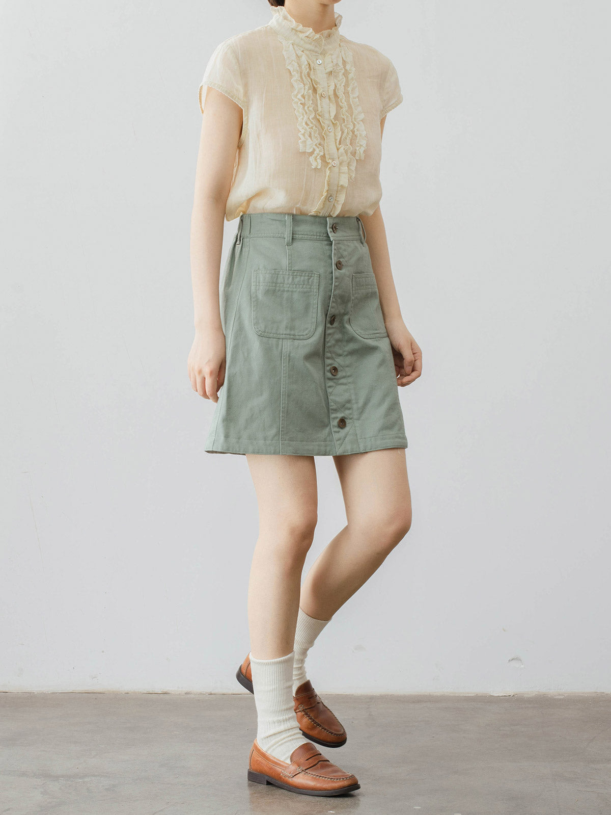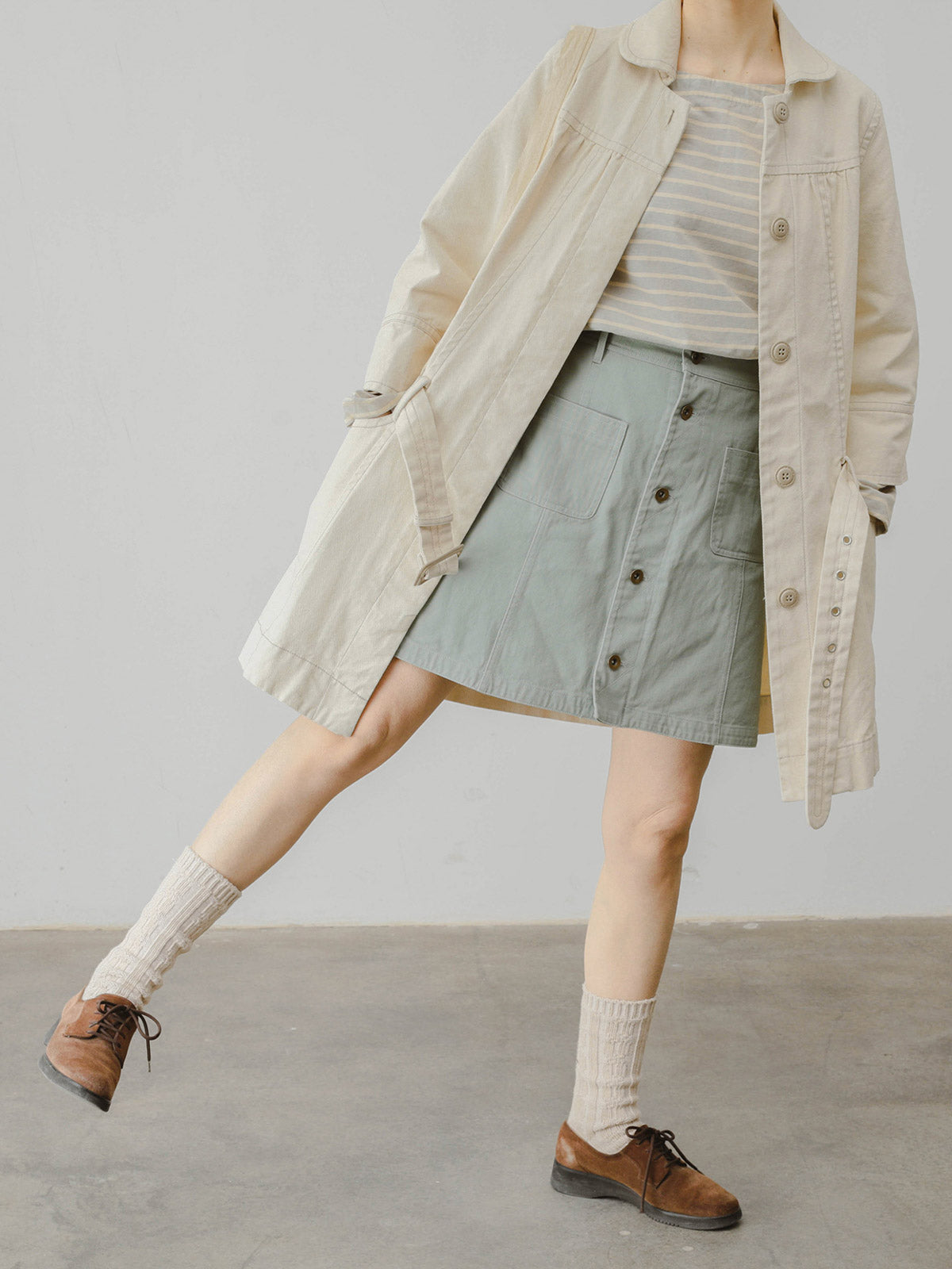 このスカートはフレンチレトロデザインを取り入れ、清新なミントグリーンの色調がアーティスティックな雰囲気を加えます。ハイウエストデザインとゴムウエストバンドにより、快適な着用感を保証し、ウエストラインを強調して脚のラインを長く見せます。前面にはボタンの装飾と大きなポケットがあり、実用的でありながらスタイリッシュです。スカートは100%純コットン素材を使用し、通気性が良く快適で、春夏の季節にぴったりです。Tシャツやシャツと合わせることで、エレガントなレトロスタイルを簡単に演出でき、日常のコーディネートに欠かせないアイテムです。