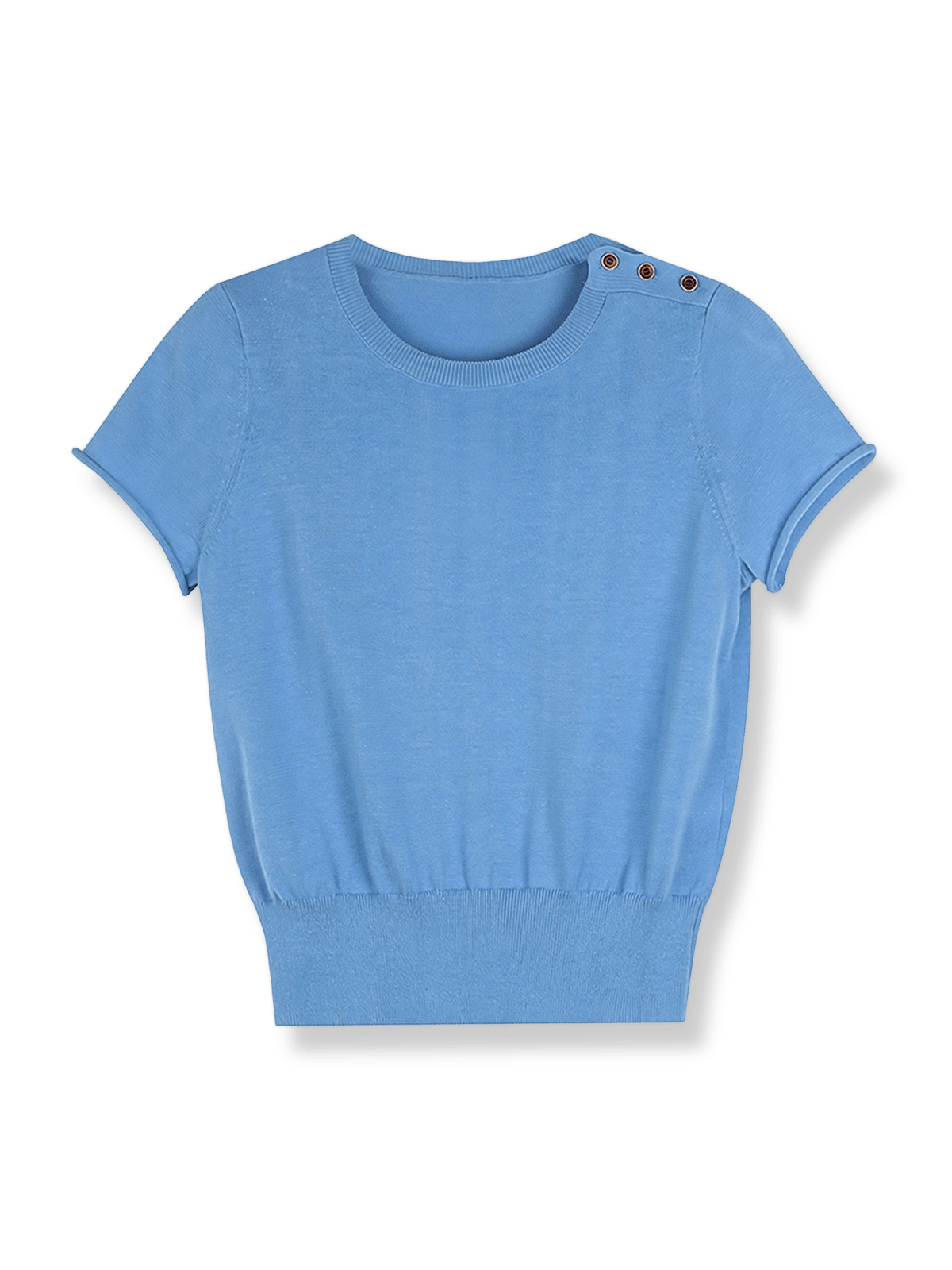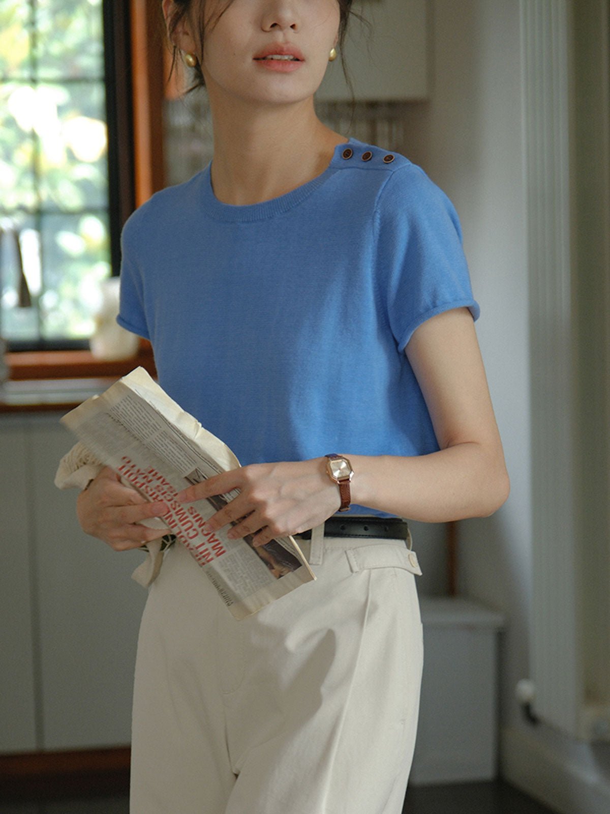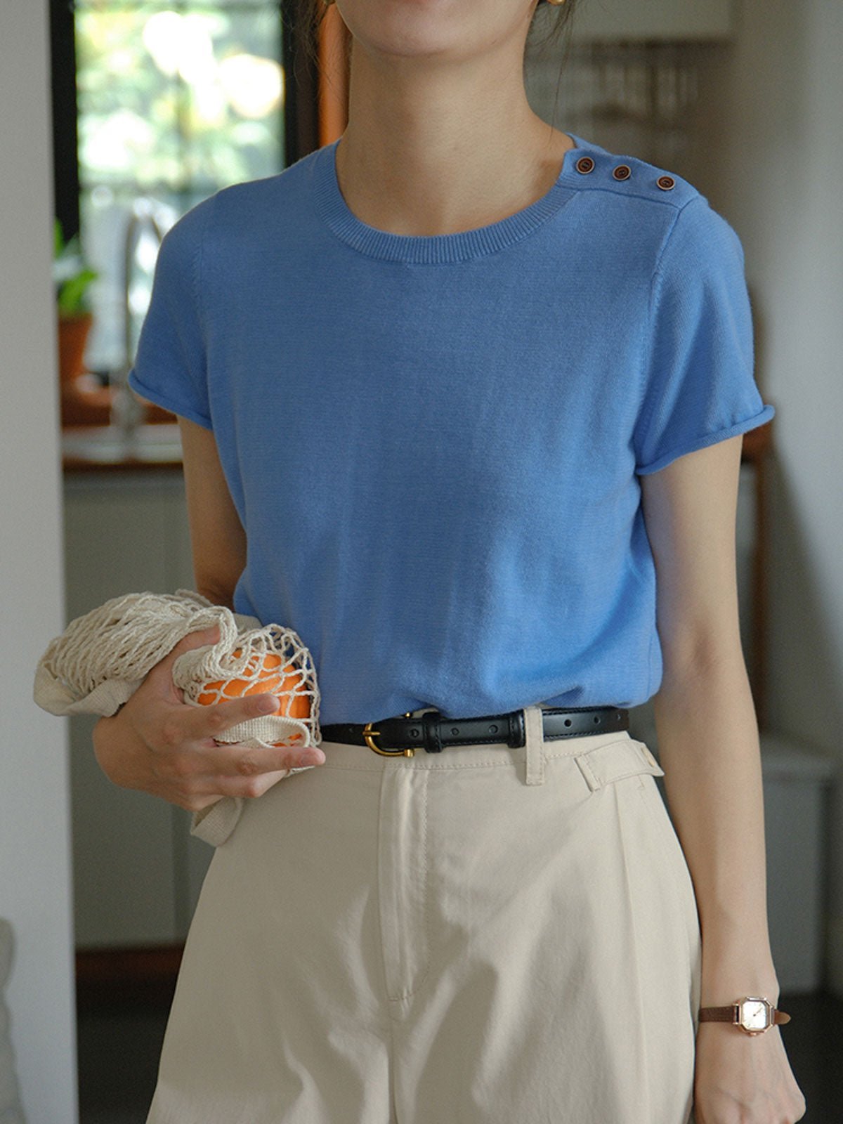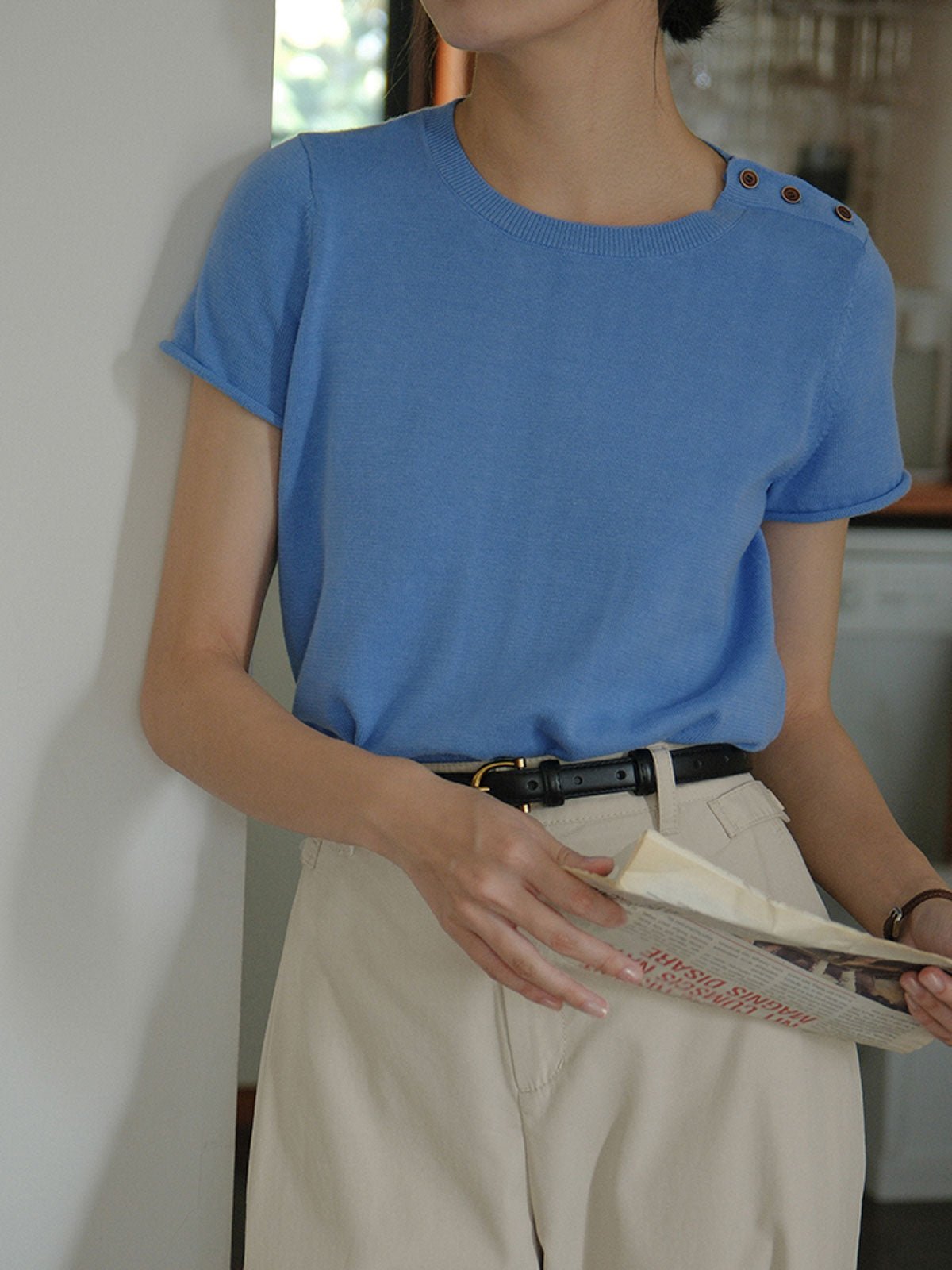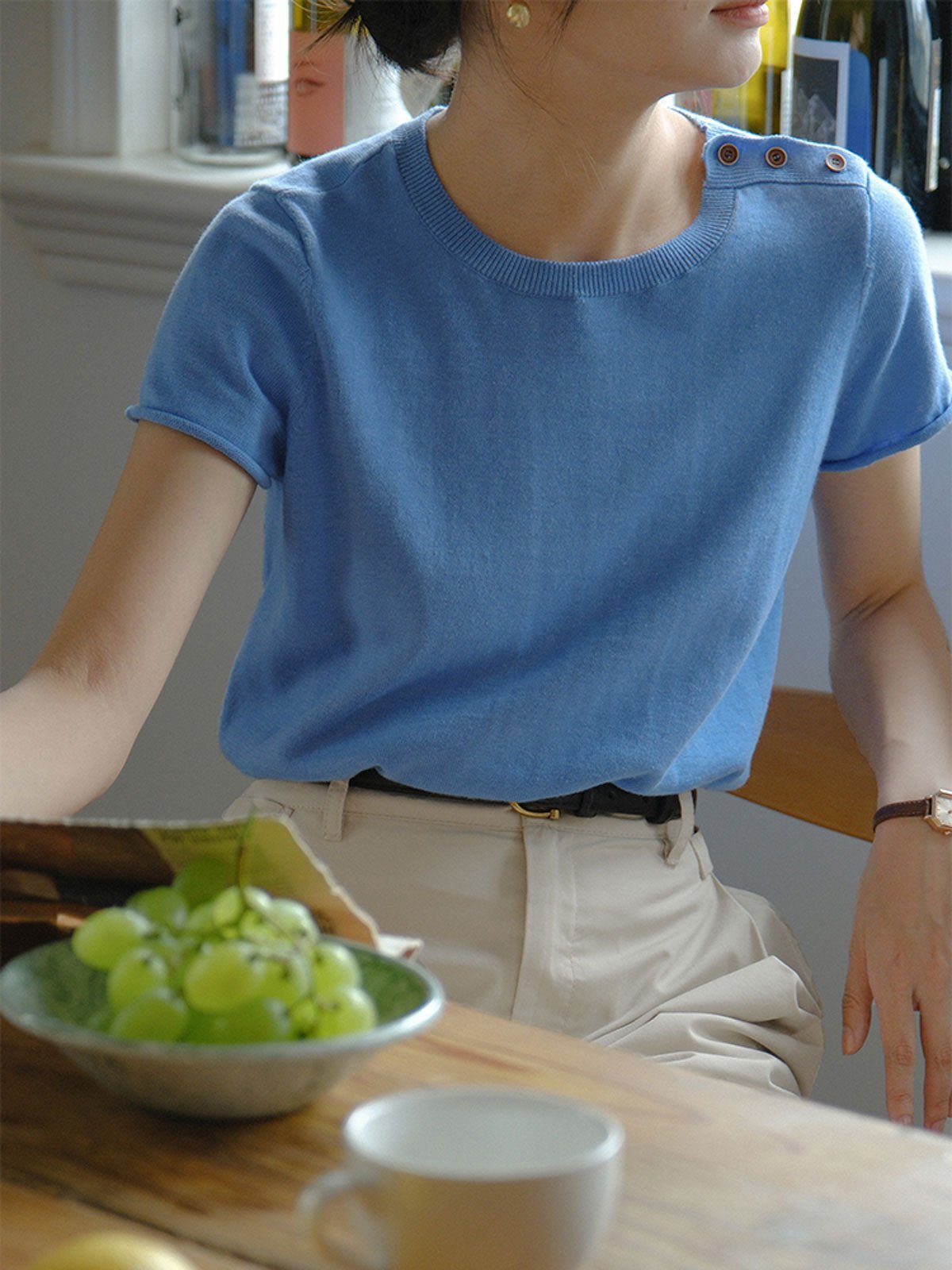 このフレンチスタイルのブルーラウンドネック半袖ニットは、コットン45%とリネン55%の混紡素材を採用し、非常に通気性が良く夏の暑い日でも涼しく快適です。軽量で透け感のあるニット素材は、どんなシーンにも適しており、ラウンドネックデザインがシンプルで洗練された雰囲気を演出します。裾は繊細にデザインされ、少し短めの丈がスタイリッシュなウエストラインを強調します。リラックスフィットのカットで様々な体型にマッチし、左肩にはボタンを配した開閉可能なデザインが施されています。これにより、デザインに新鮮さとユニークなアクセントが加わります。リブ編みの裾が自然なギャザーを作り出し、さらに快適な着心地を提供します。