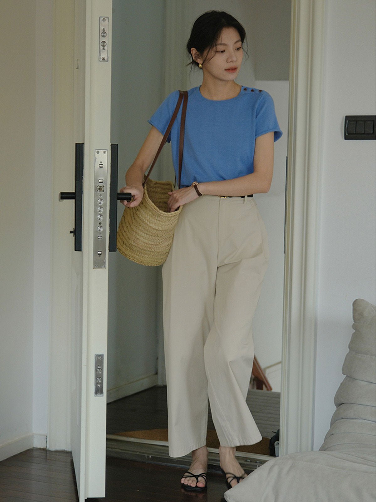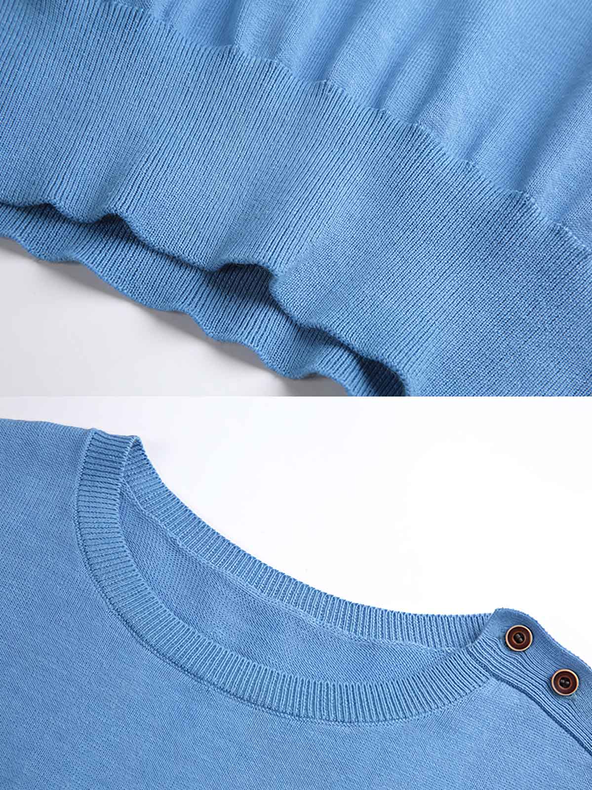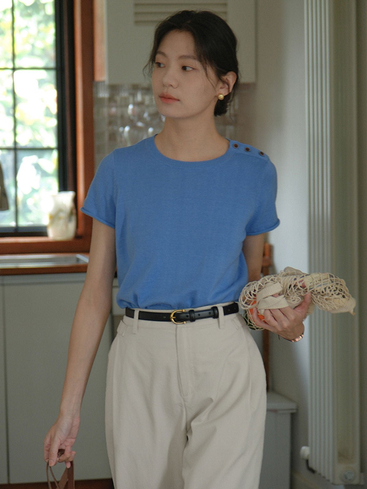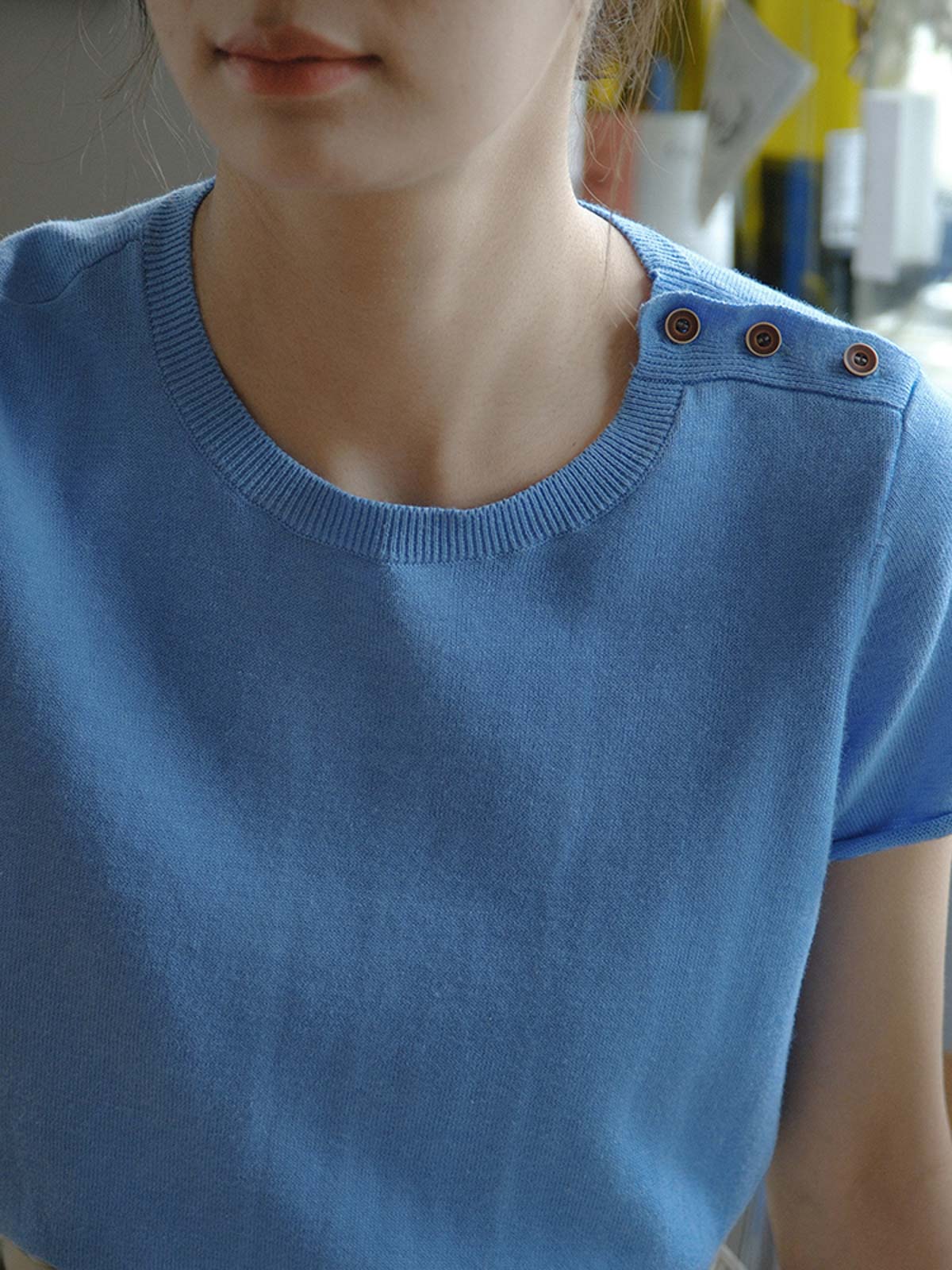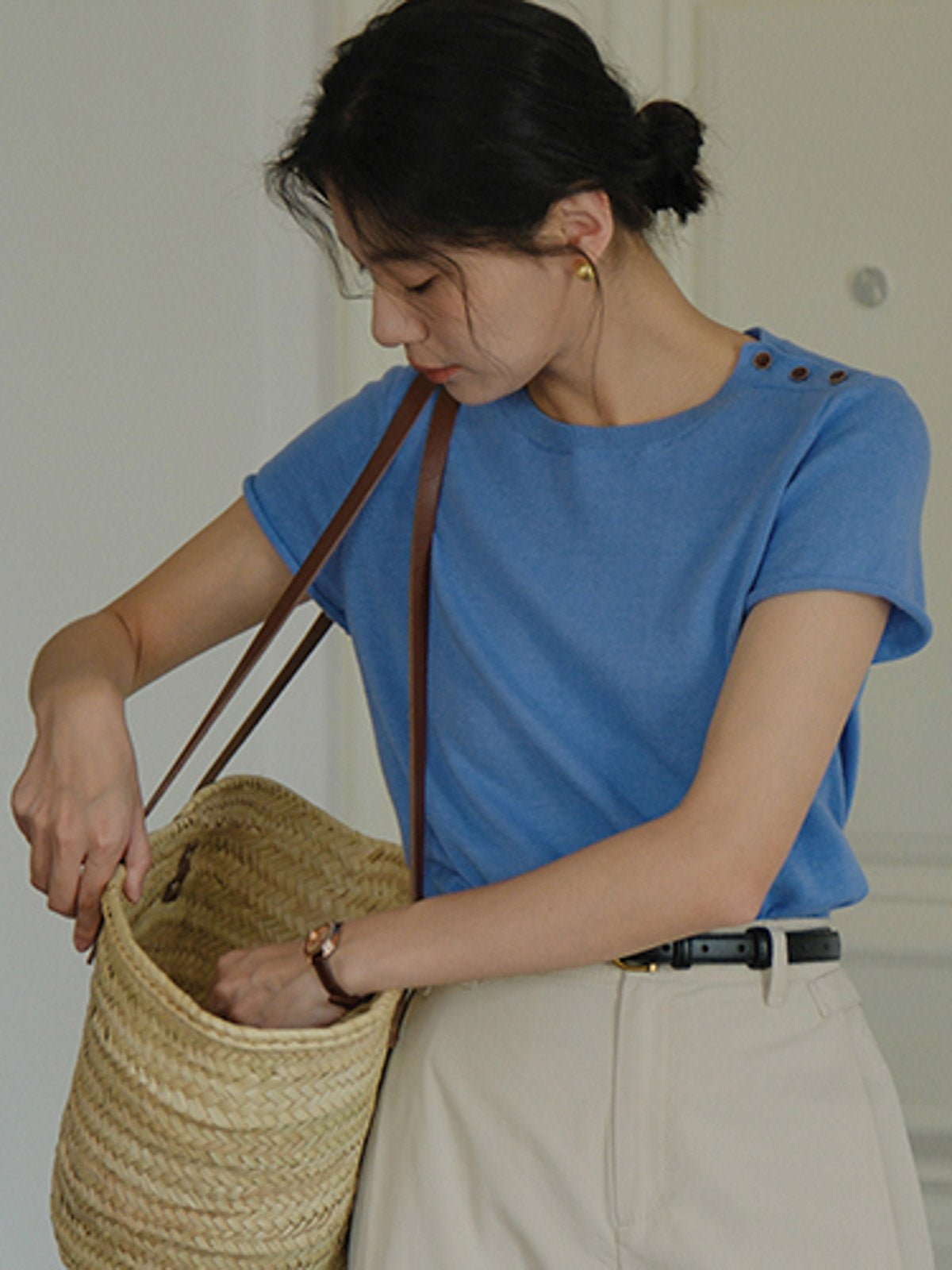このフレンチスタイルのブルーラウンドネック半袖ニットは、コットン45%とリネン55%の混紡素材を採用し、非常に通気性が良く夏の暑い日でも涼しく快適です。軽量で透け感のあるニット素材は、どんなシーンにも適しており、ラウンドネックデザインがシンプルで洗練された雰囲気を演出します。裾は繊細にデザインされ、少し短めの丈がスタイリッシュなウエストラインを強調します。リラックスフィットのカットで様々な体型にマッチし、左肩にはボタンを配した開閉可能なデザインが施されています。これにより、デザインに新鮮さとユニークなアクセントが加わります。リブ編みの裾が自然なギャザーを作り出し、さらに快適な着心地を提供します。