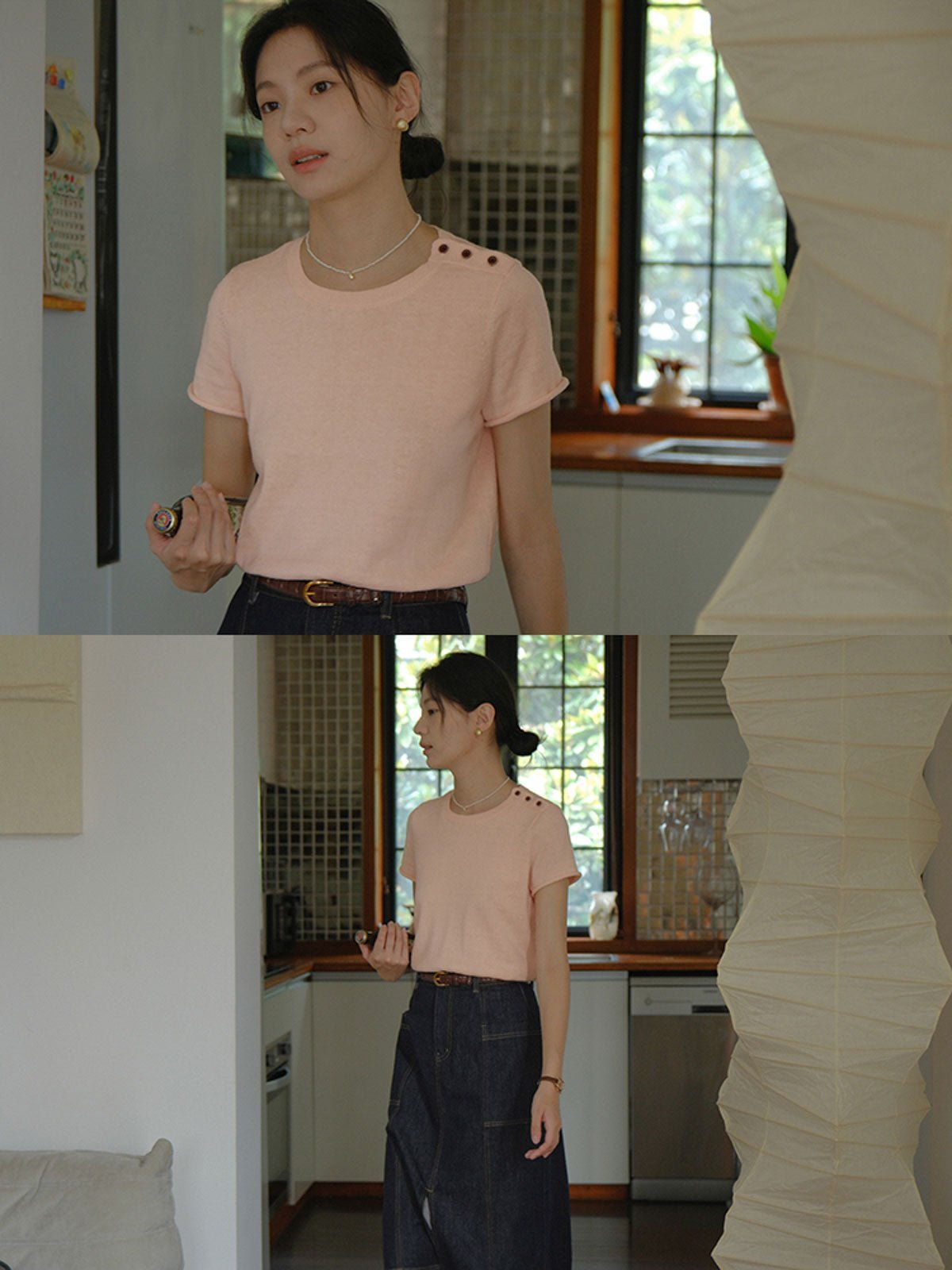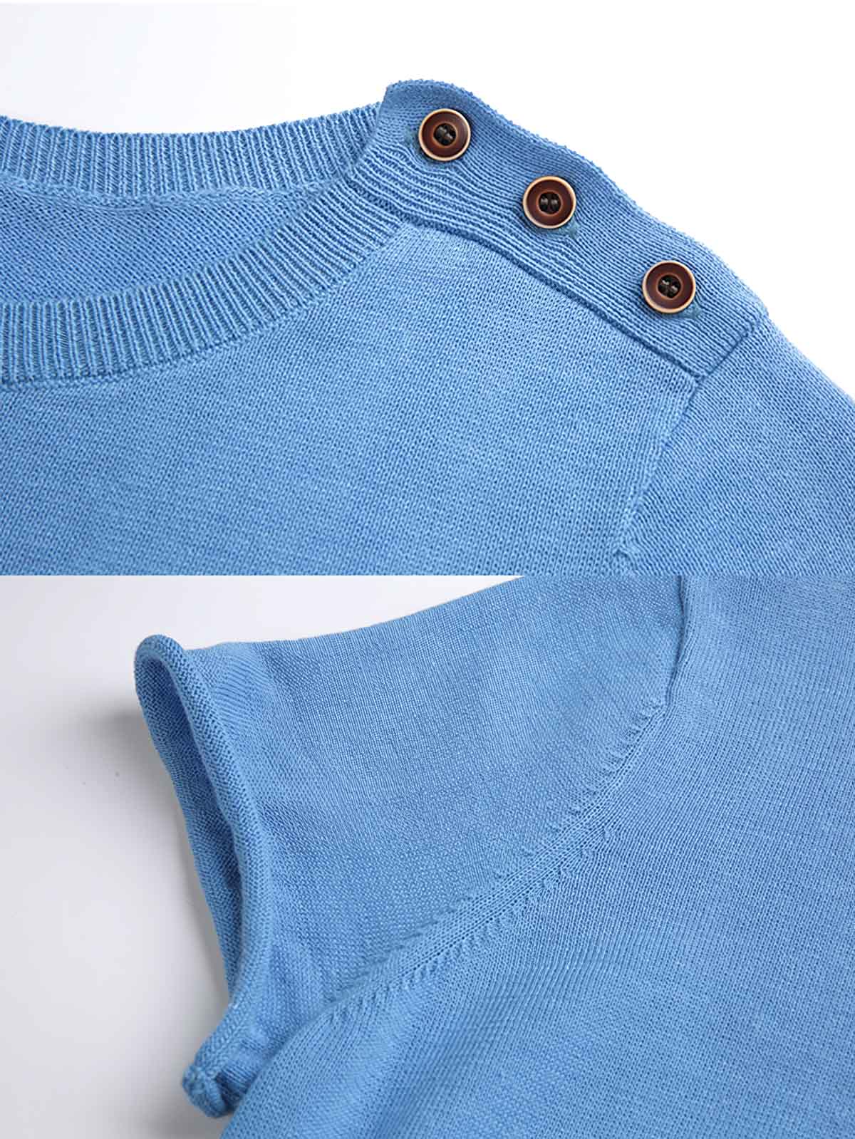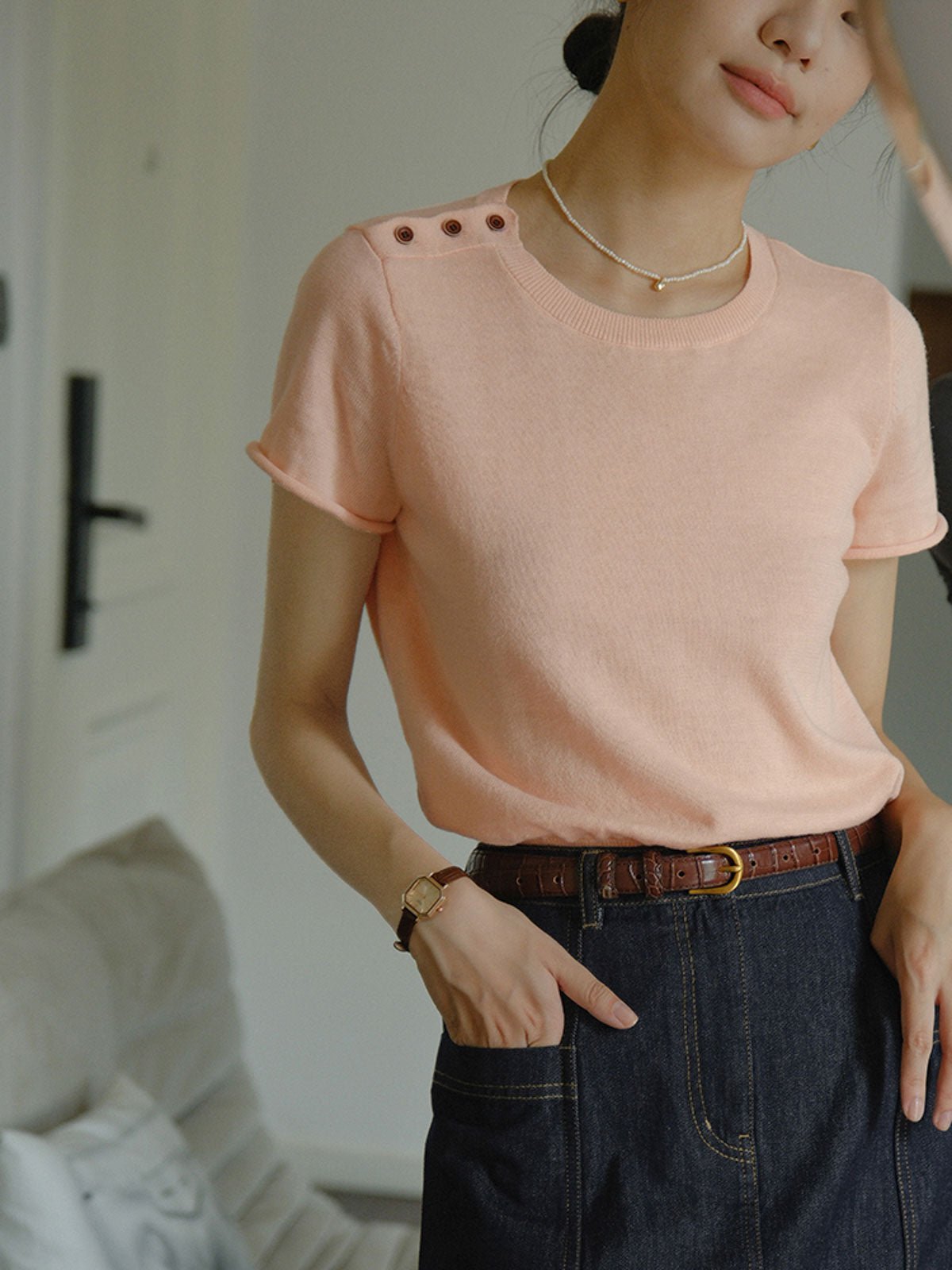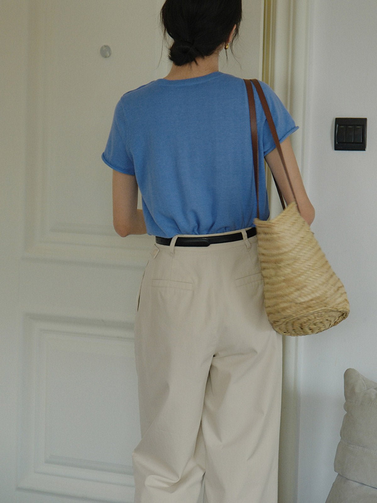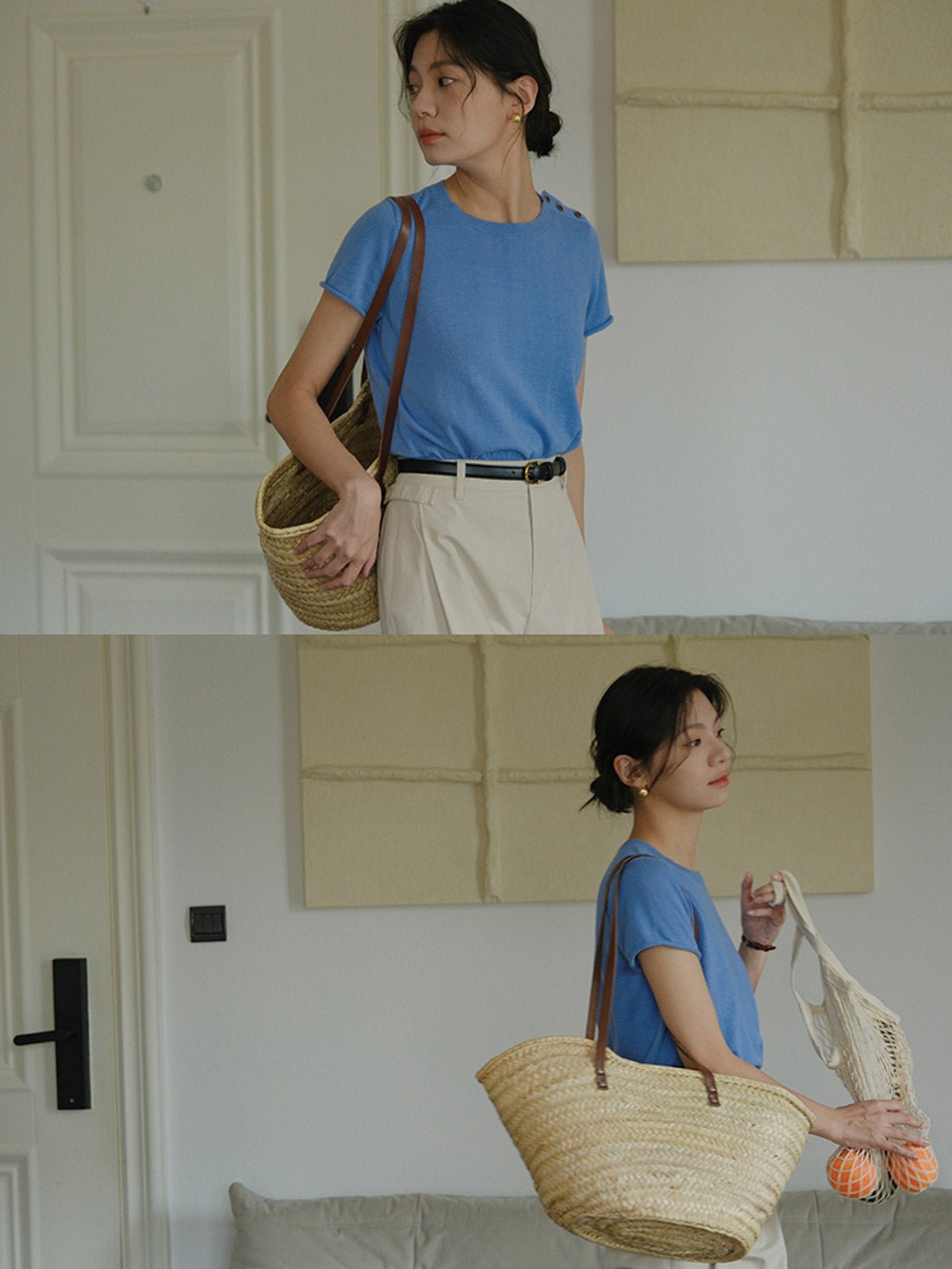 このフレンチスタイルのブルーラウンドネック半袖ニットは、コットン45%とリネン55%の混紡素材を採用し、非常に通気性が良く夏の暑い日でも涼しく快適です。軽量で透け感のあるニット素材は、どんなシーンにも適しており、ラウンドネックデザインがシンプルで洗練された雰囲気を演出します。裾は繊細にデザインされ、少し短めの丈がスタイリッシュなウエストラインを強調します。リラックスフィットのカットで様々な体型にマッチし、左肩にはボタンを配した開閉可能なデザインが施されています。これにより、デザインに新鮮さとユニークなアクセントが加わります。リブ編みの裾が自然なギャザーを作り出し、さらに快適な着心地を提供します。