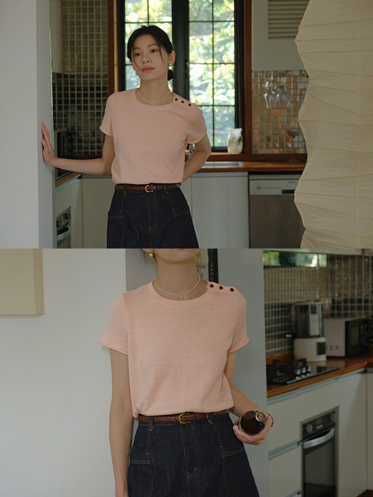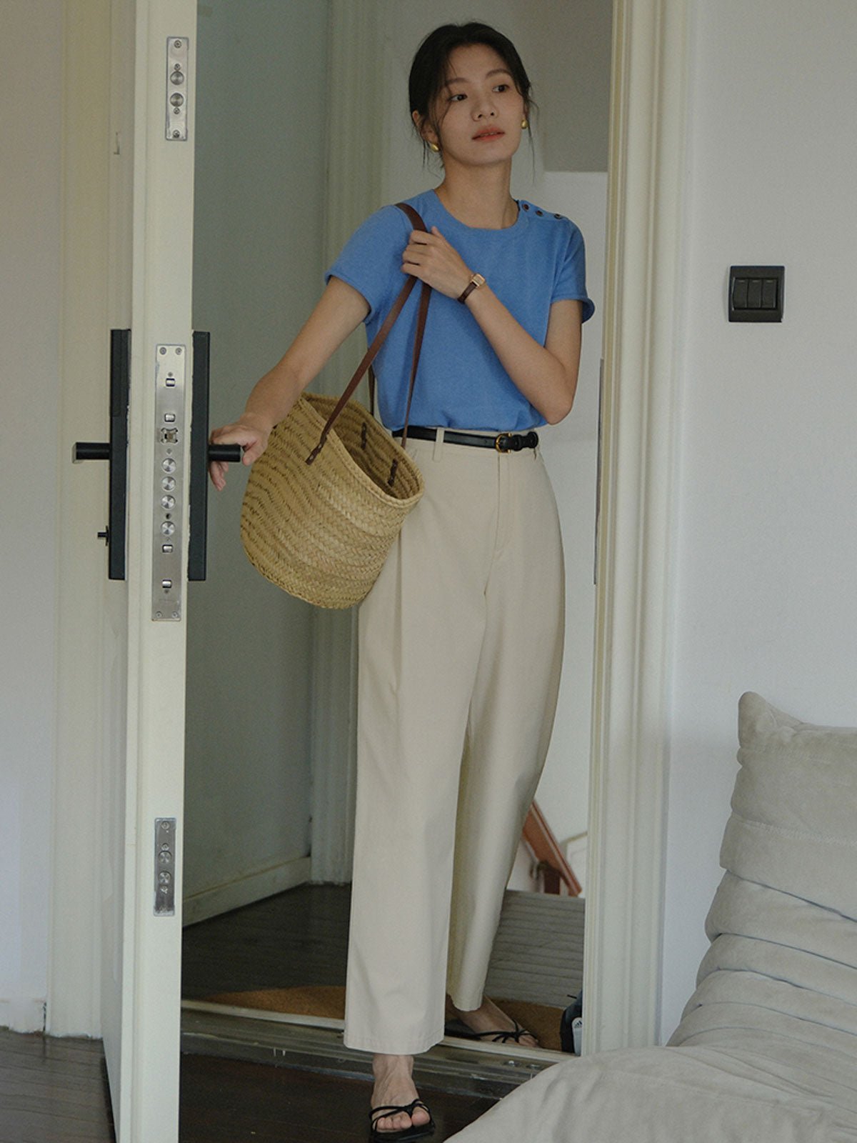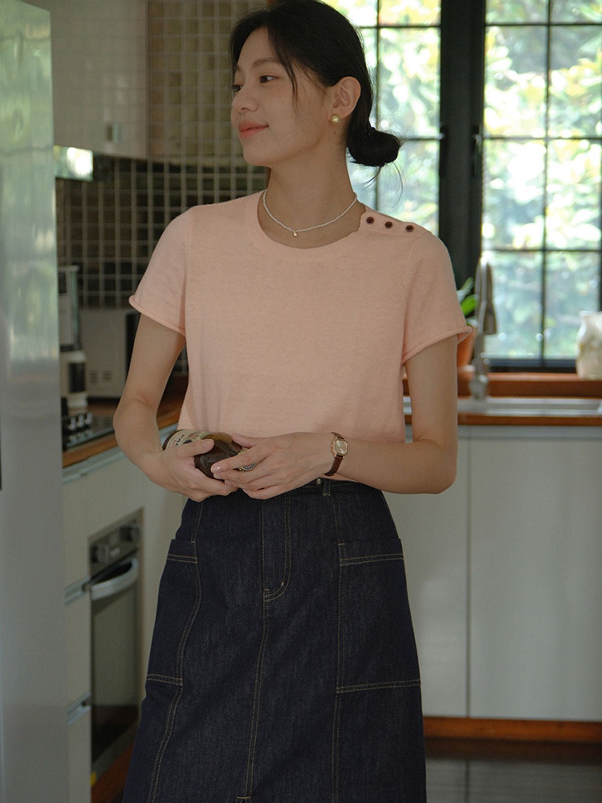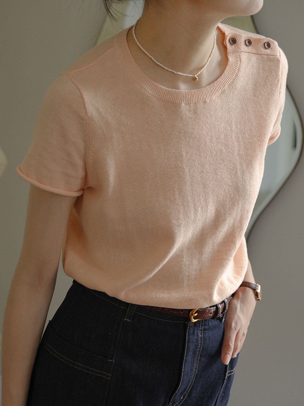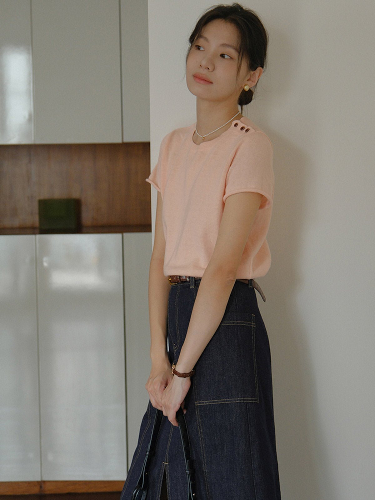 このフレンチスタイルのブルーラウンドネック半袖ニットは、コットン45%とリネン55%の混紡素材を採用し、非常に通気性が良く夏の暑い日でも涼しく快適です。軽量で透け感のあるニット素材は、どんなシーンにも適しており、ラウンドネックデザインがシンプルで洗練された雰囲気を演出します。裾は繊細にデザインされ、少し短めの丈がスタイリッシュなウエストラインを強調します。リラックスフィットのカットで様々な体型にマッチし、左肩にはボタンを配した開閉可能なデザインが施されています。これにより、デザインに新鮮さとユニークなアクセントが加わります。リブ編みの裾が自然なギャザーを作り出し、さらに快適な着心地を提供します。