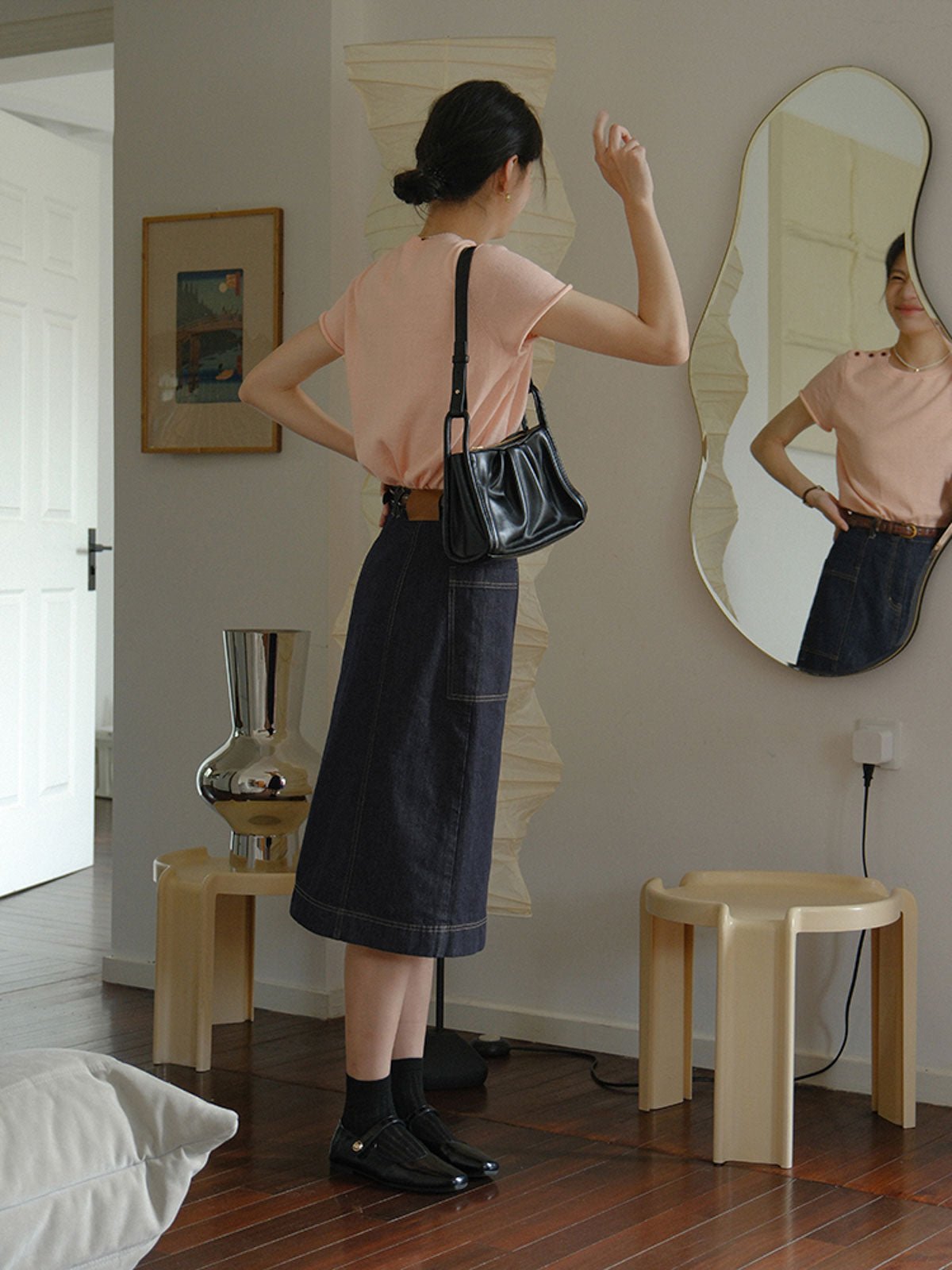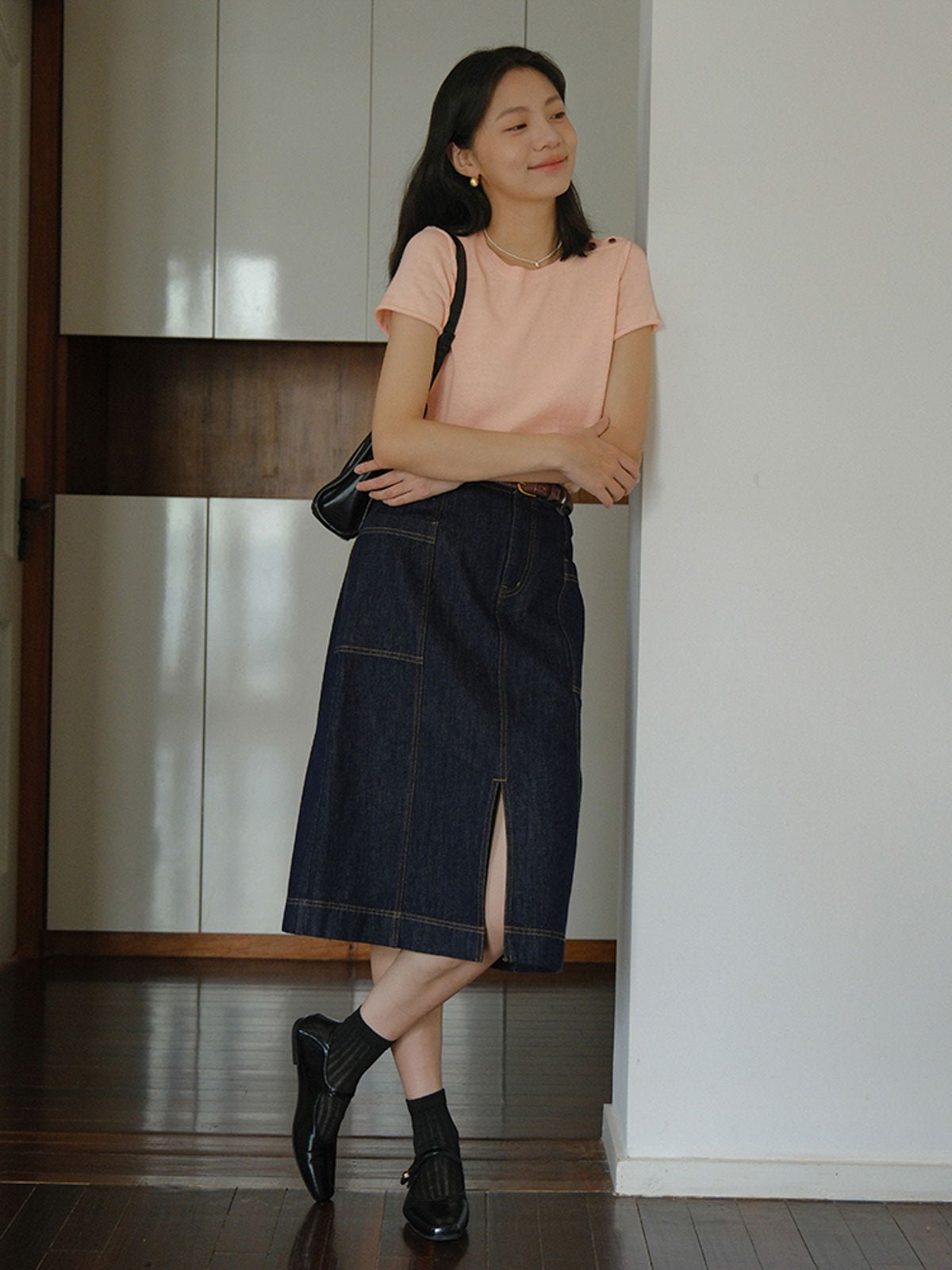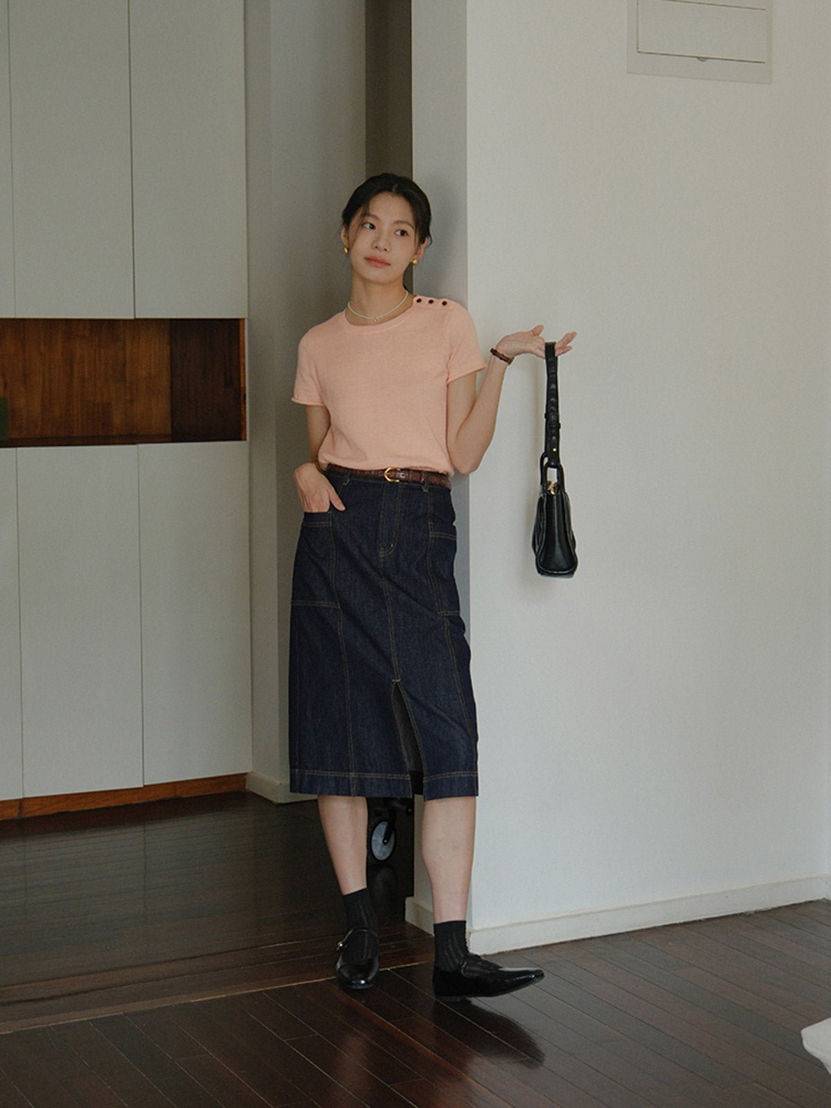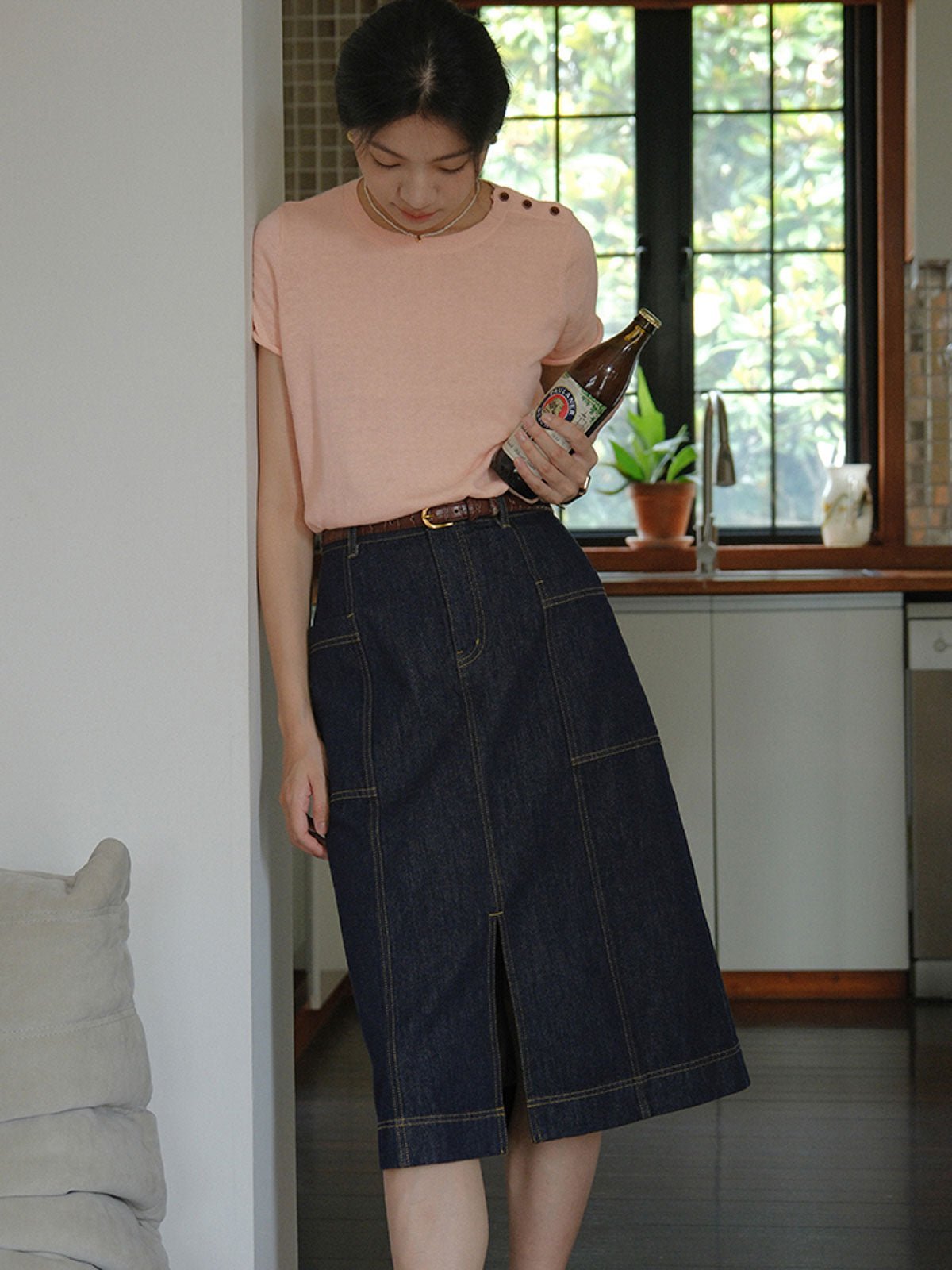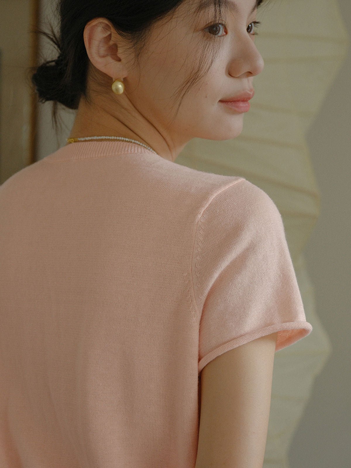 このフレンチスタイルのブルーラウンドネック半袖ニットは、コットン45%とリネン55%の混紡素材を採用し、非常に通気性が良く夏の暑い日でも涼しく快適です。軽量で透け感のあるニット素材は、どんなシーンにも適しており、ラウンドネックデザインがシンプルで洗練された雰囲気を演出します。裾は繊細にデザインされ、少し短めの丈がスタイリッシュなウエストラインを強調します。リラックスフィットのカットで様々な体型にマッチし、左肩にはボタンを配した開閉可能なデザインが施されています。これにより、デザインに新鮮さとユニークなアクセントが加わります。リブ編みの裾が自然なギャザーを作り出し、さらに快適な着心地を提供します。