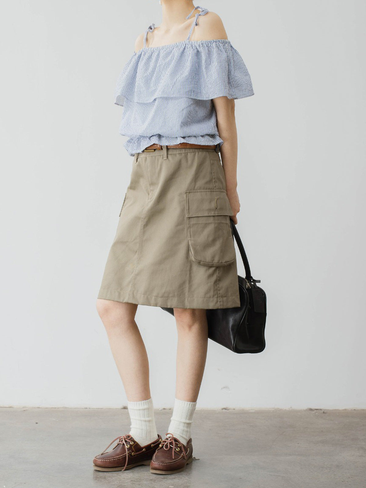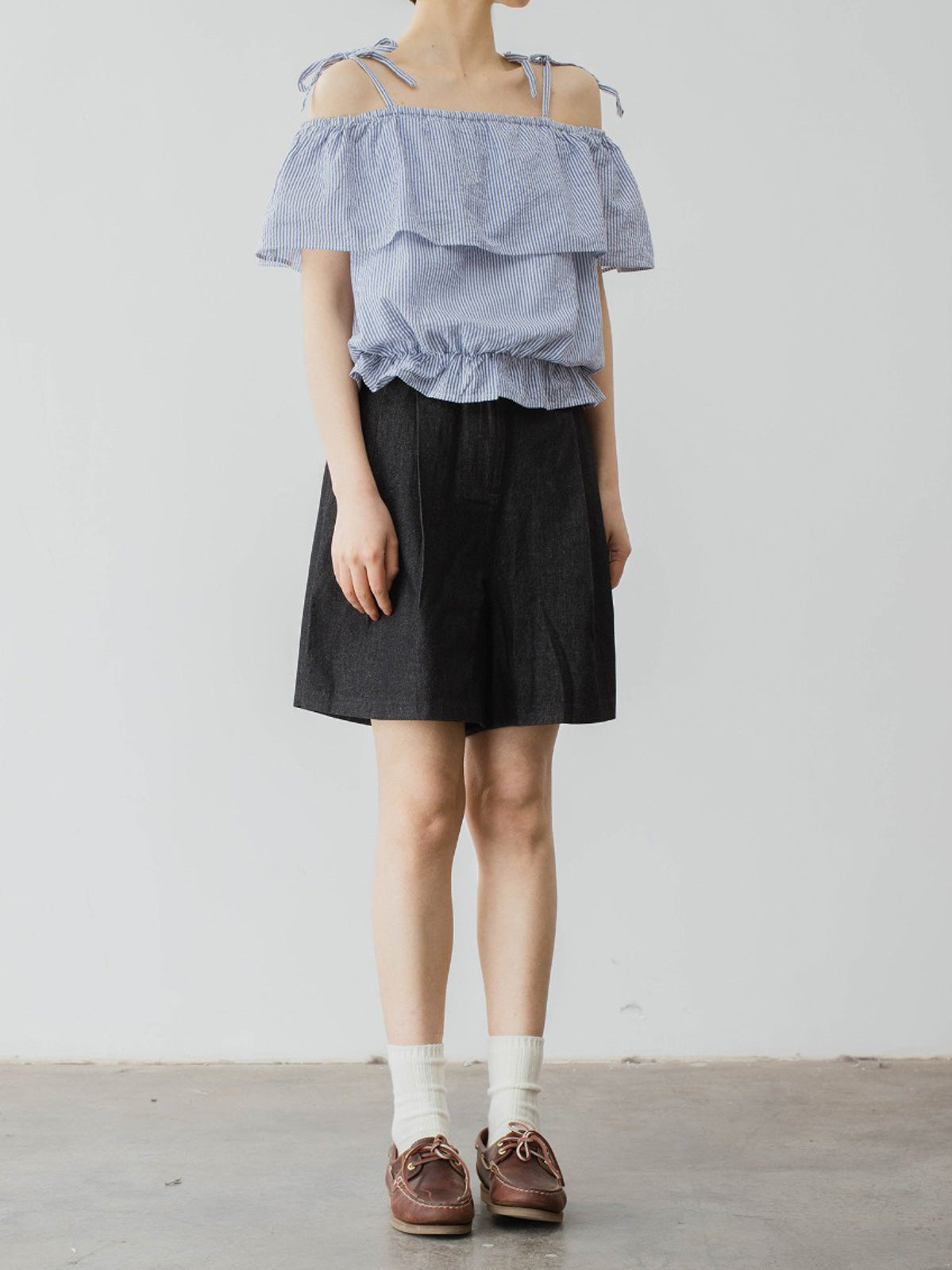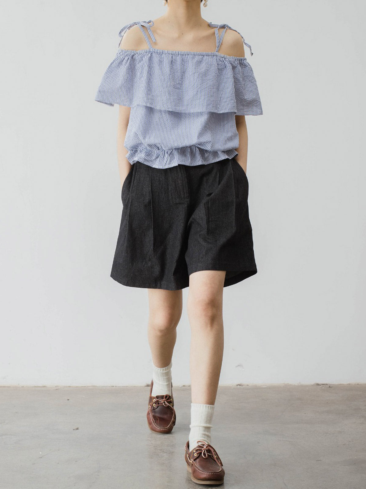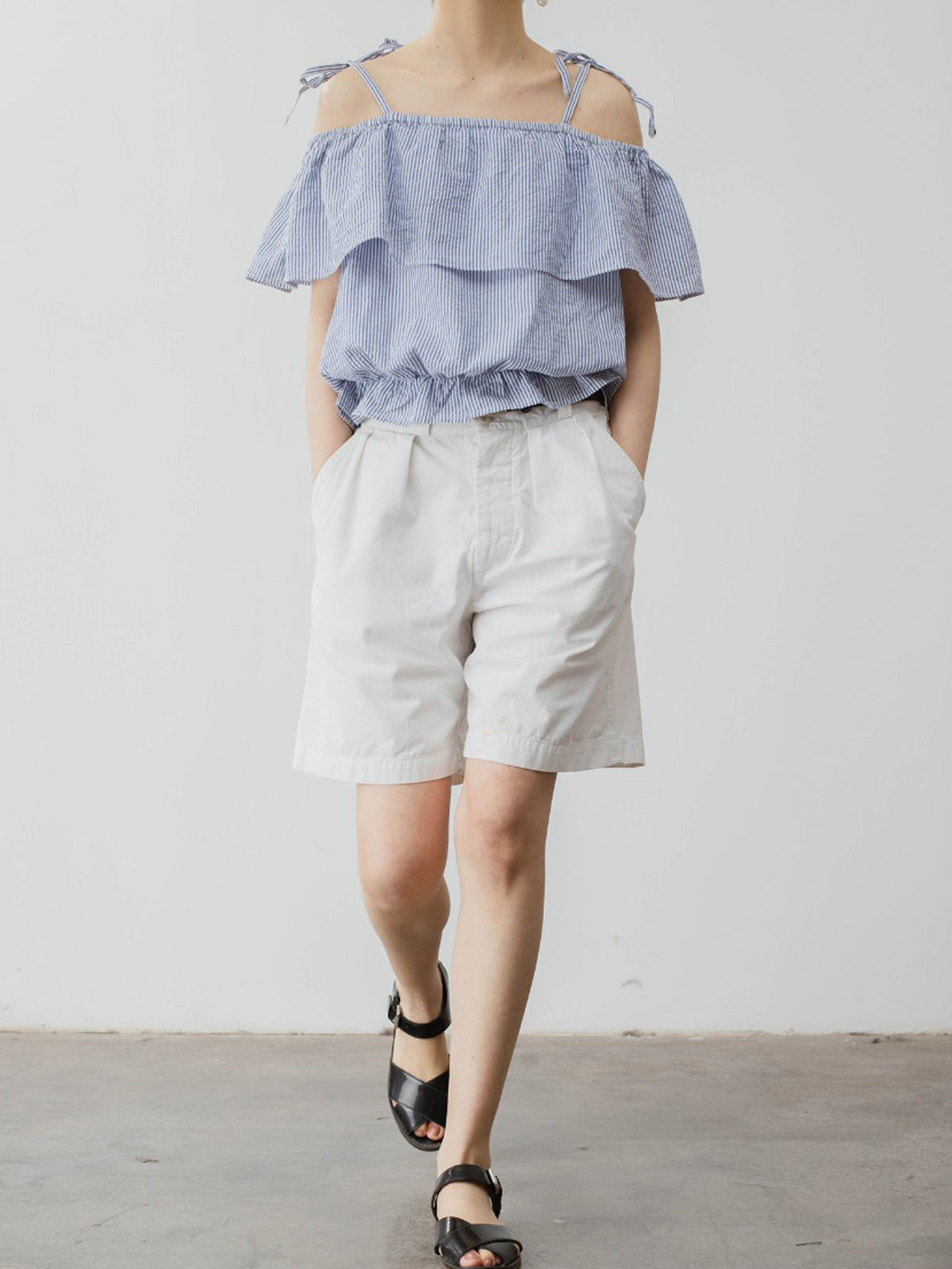 このオフショルダー キャミソールはブルーとホワイトのストライプデザインで、涼しく快適で夏らしい雰囲気を漂わせます。